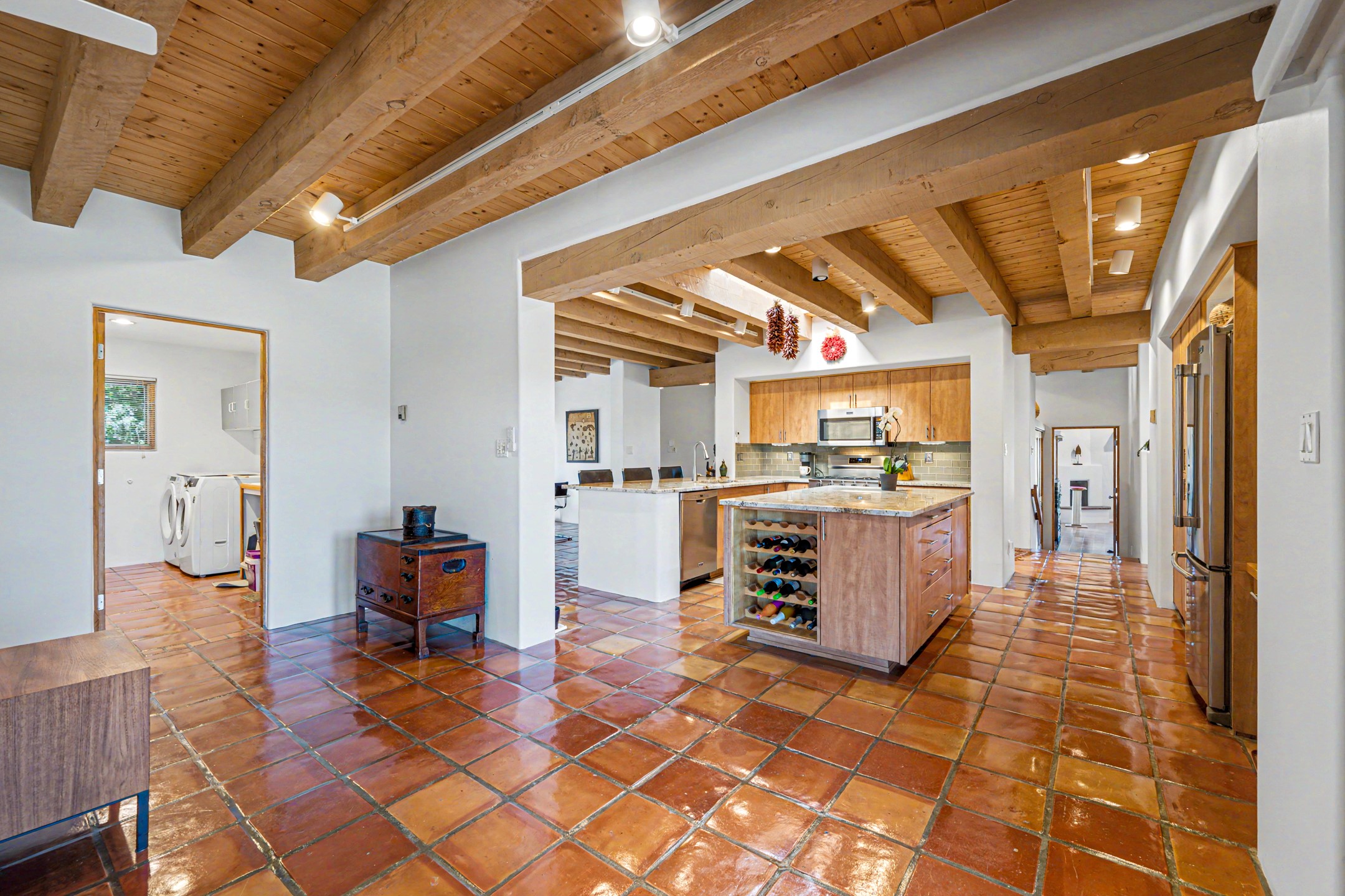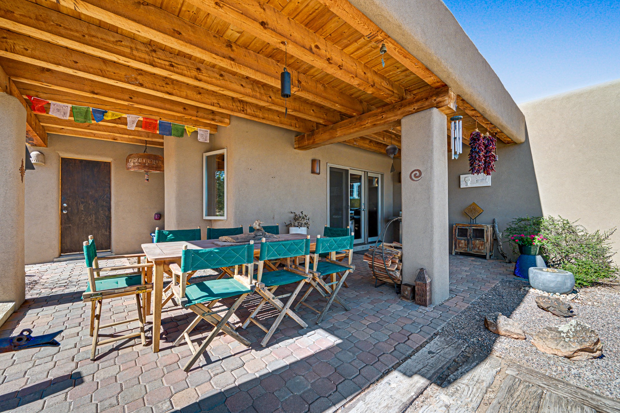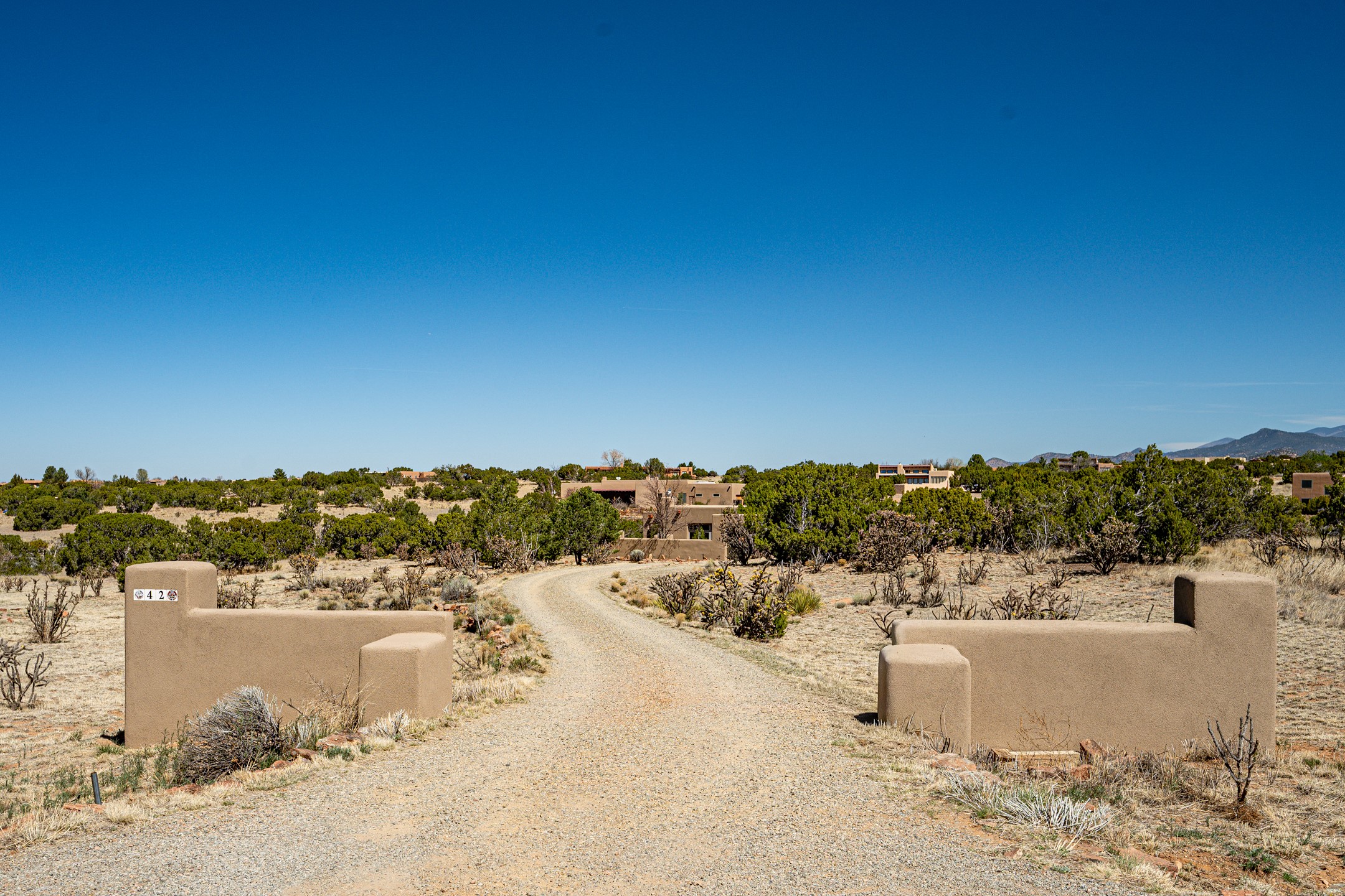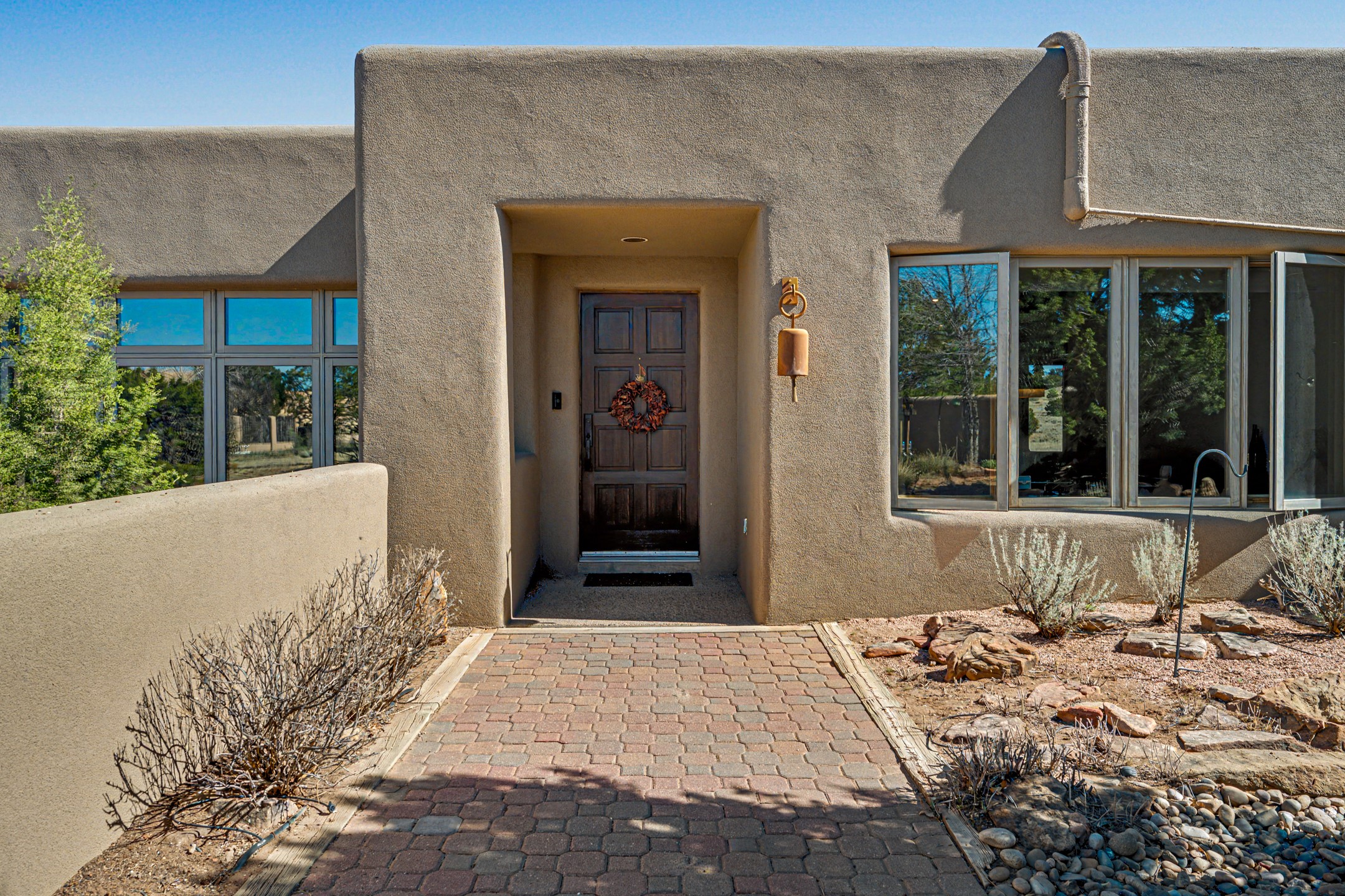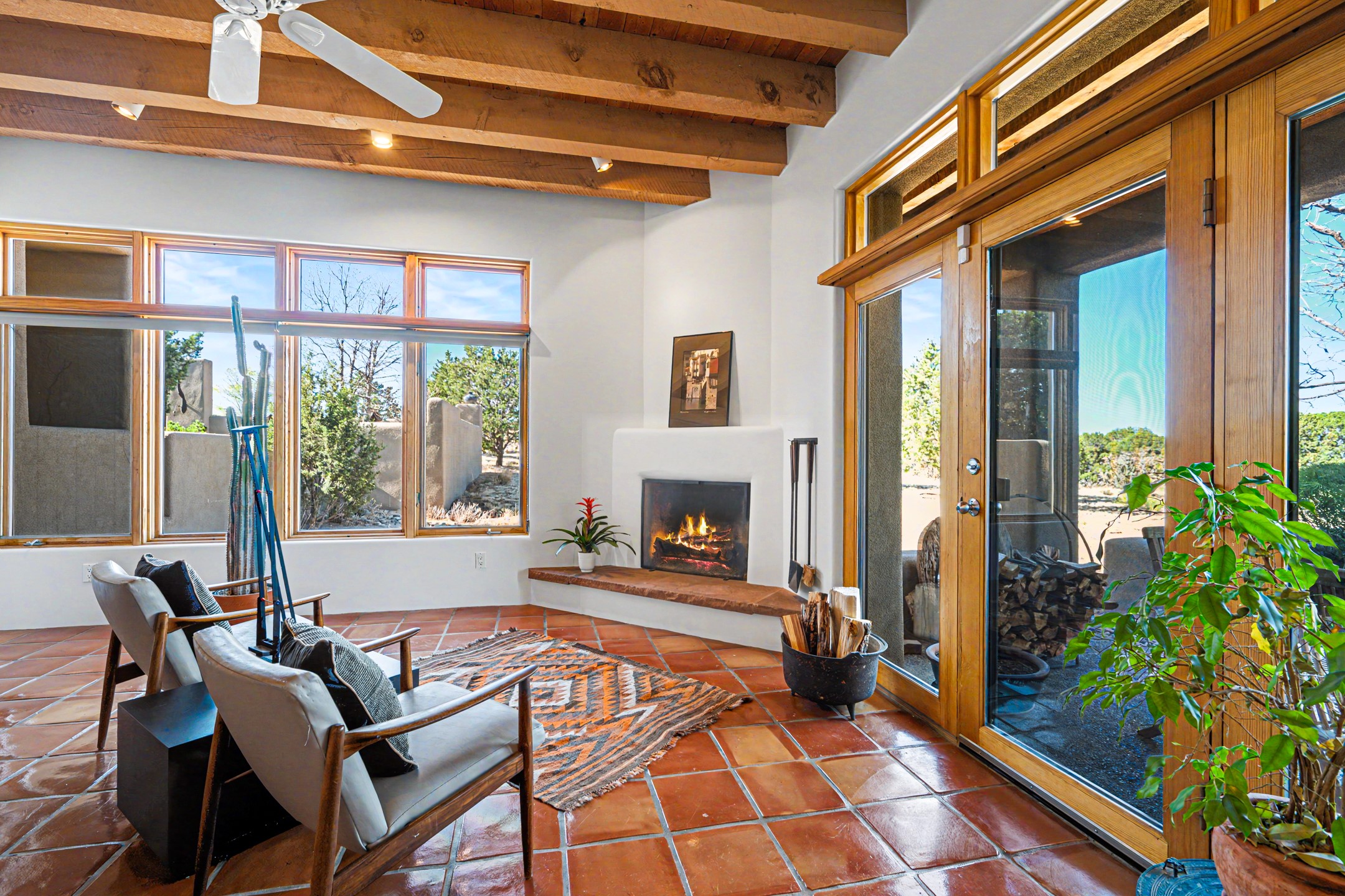 Stunning custom designed and built contemporary pueblo home privately located bordering a large Eldorado greenbelt. Gleaming saltillo tile floors, Kiva fireplaces and beam ceilings create that Santa Fe excitement while high ceilings and multiple long windows create a spacious sunny uplift throughout. There is an entertainers kitchen elegantly remodeled in 2017 with a large central island which flows to a formal dining area and a family room/den overlooking the north mountain foothills across the greenbelt. The sunken living room features a dramatic corner kiva fireplace and wonderful views to the west. There is excellent separation of primary suite from the guest bedrooms, all having Swedish engineered hardwood floors and the bathrooms have been totally refreshed in 2018. Two mini splits were added in 2018 for additional summer comfort. The boiler was replaced in 2019 and the home was re stuccoed in 2024. An oversized finished garage with plenty of storage and work area plus extra parking. This home shows pride of ownership inside and out. All this on 1.76 acres within easy reach of Eldorado amenities, local shopping, library, trails and parks, and only minutes into Santa Fe.
