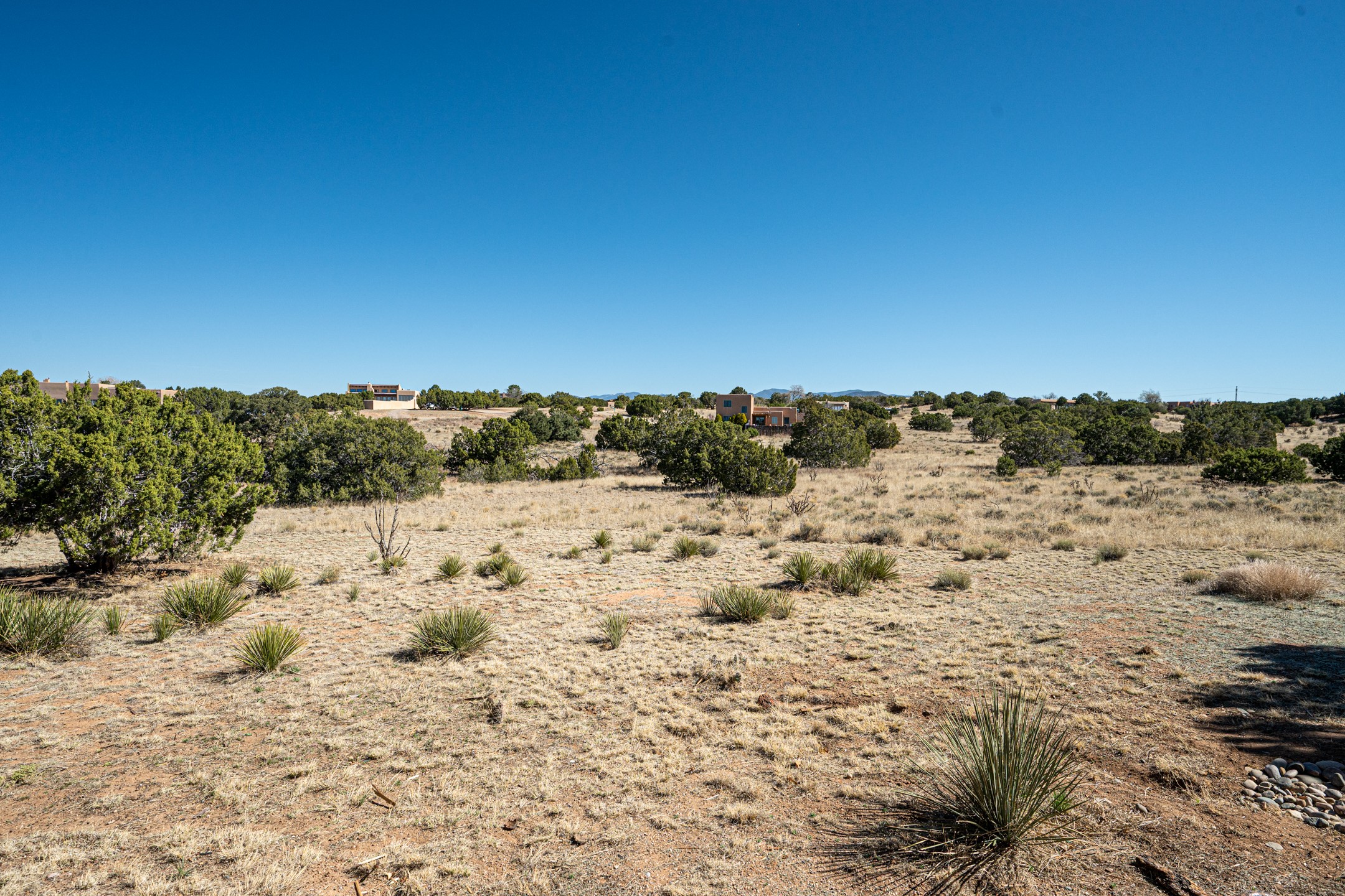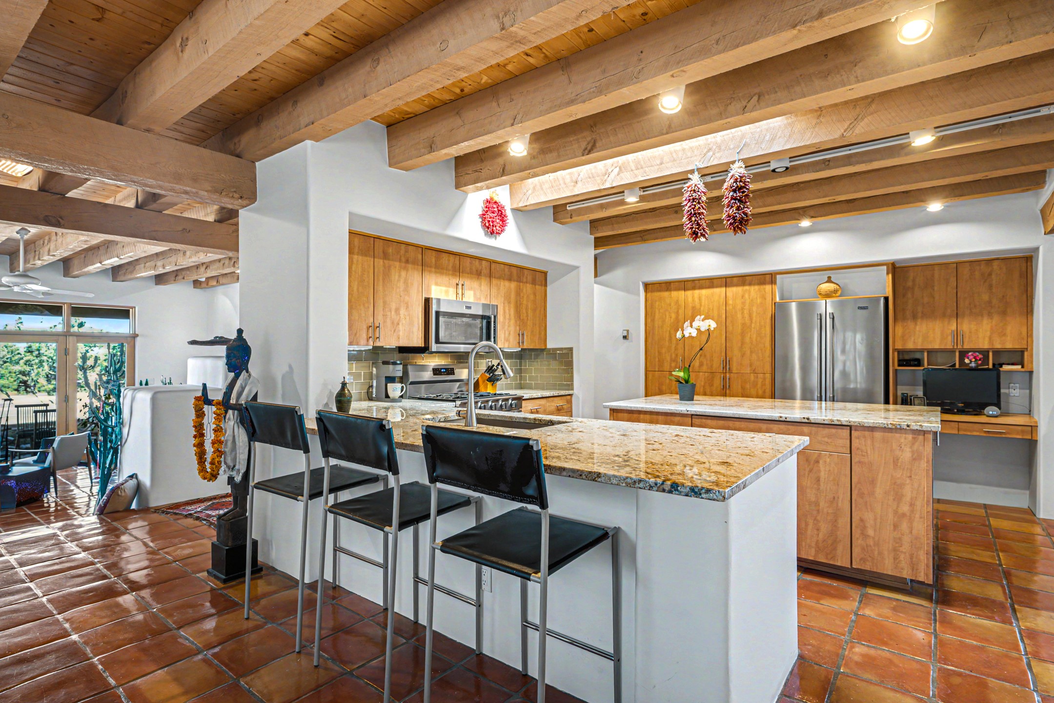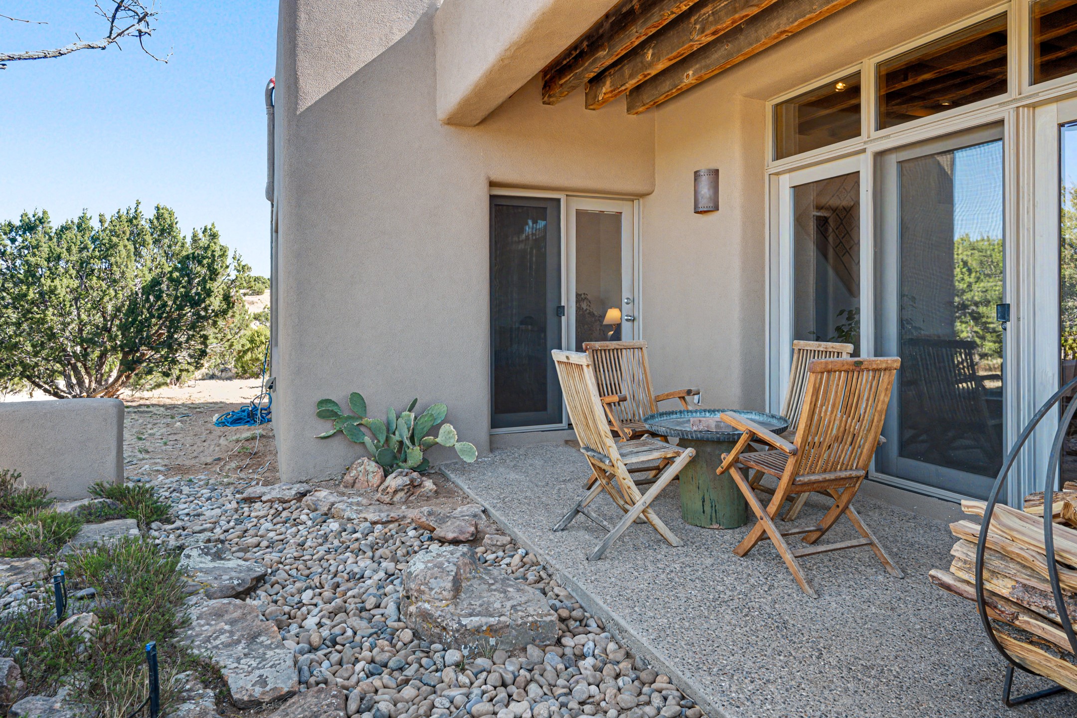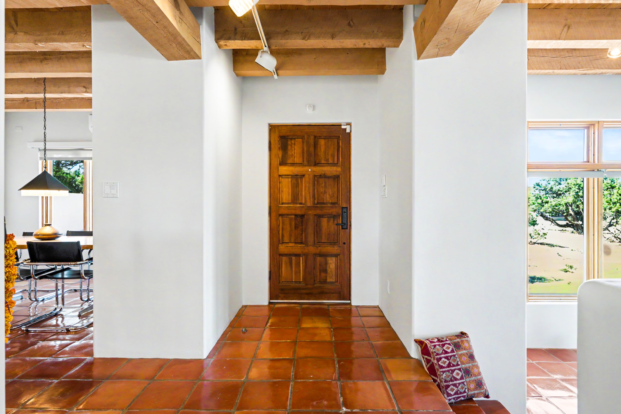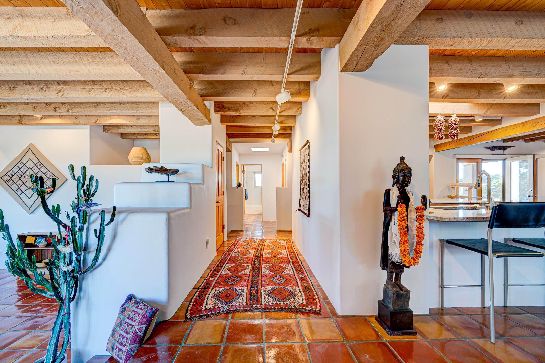 Stunning custom designed and built contemporary pueblo home privately located bordering a large Eldorado greenbelt. Gleaming saltillo tile floors, Kiva fireplaces and beam ceilings create that Santa Fe excitement while high ceilings and multiple long windows create a spacious sunny uplift throughout. There is an entertainers kitchen elegantly remodeled in 2017 with a large central island which flows to a formal dining area and a family room/den overlooking the north mountain foothills across the greenbelt. The sunken living room features a dramatic corner kiva fireplace and wonderful views to the west. There is excellent separation of primary suite from the guest bedrooms, all having Swedish engineered hardwood floors and the bathrooms have been totally refreshed in 2018. Two mini splits were added in 2018 for additional summer comfort. The boiler was replaced in 2019 and the home was re stuccoed in 2024. An oversized finished garage with plenty of storage and work area plus extra parking. This home shows pride of ownership inside and out. All this on 1.76 acres within easy reach of Eldorado amenities, local shopping, library, trails and parks, and only minutes into Santa Fe.