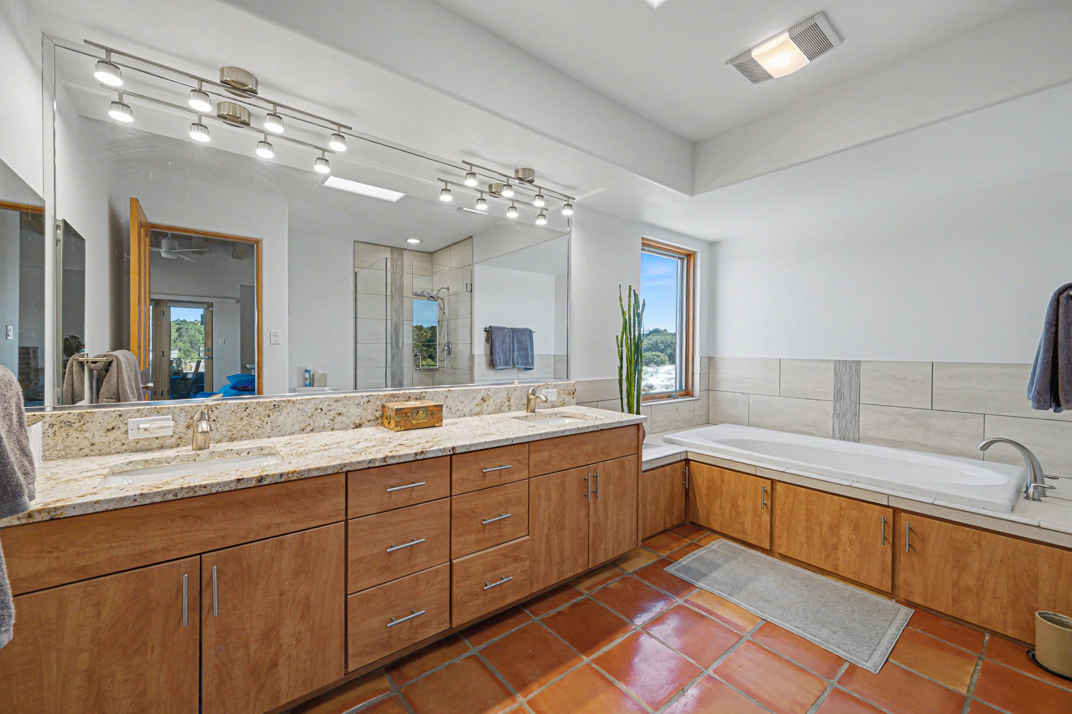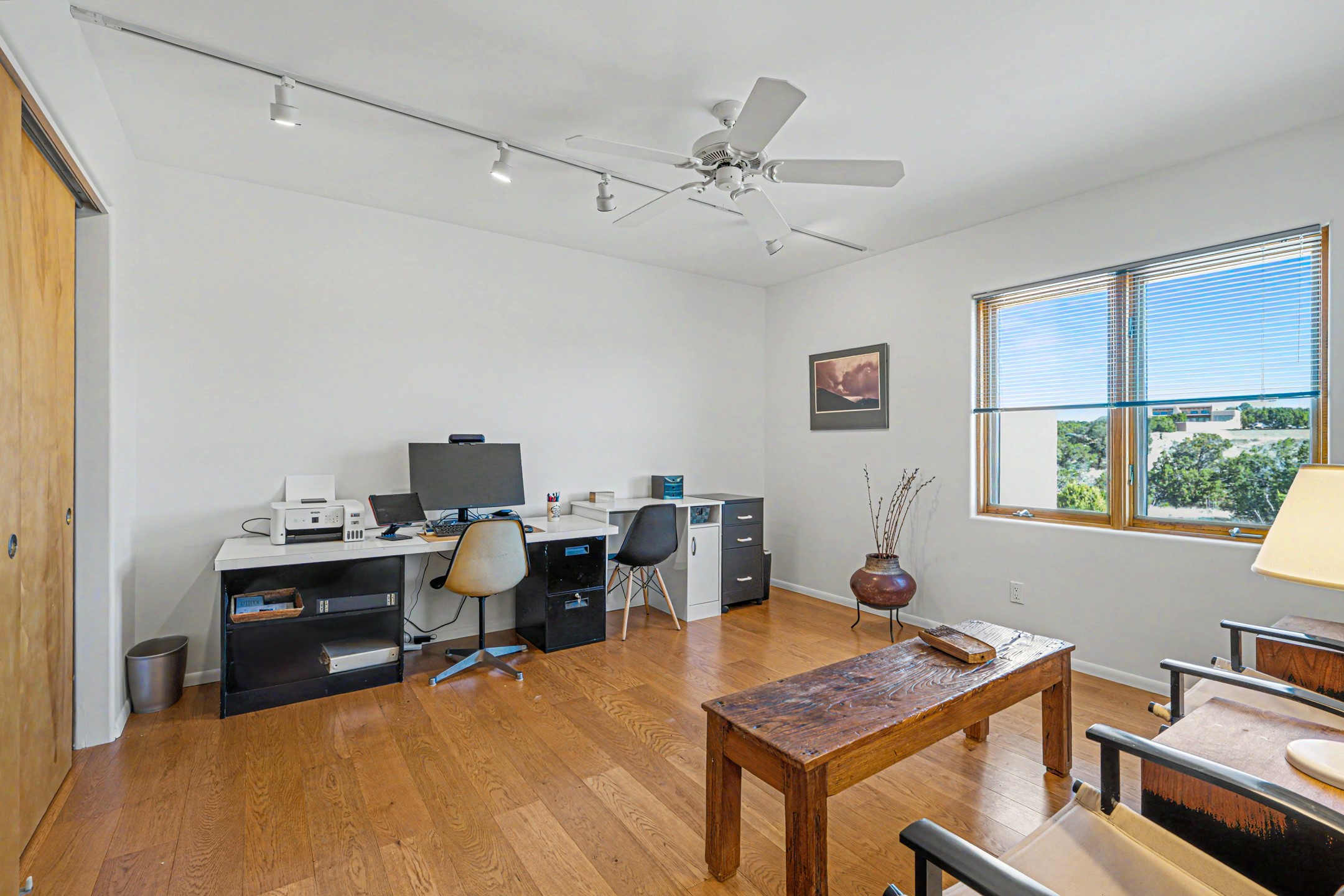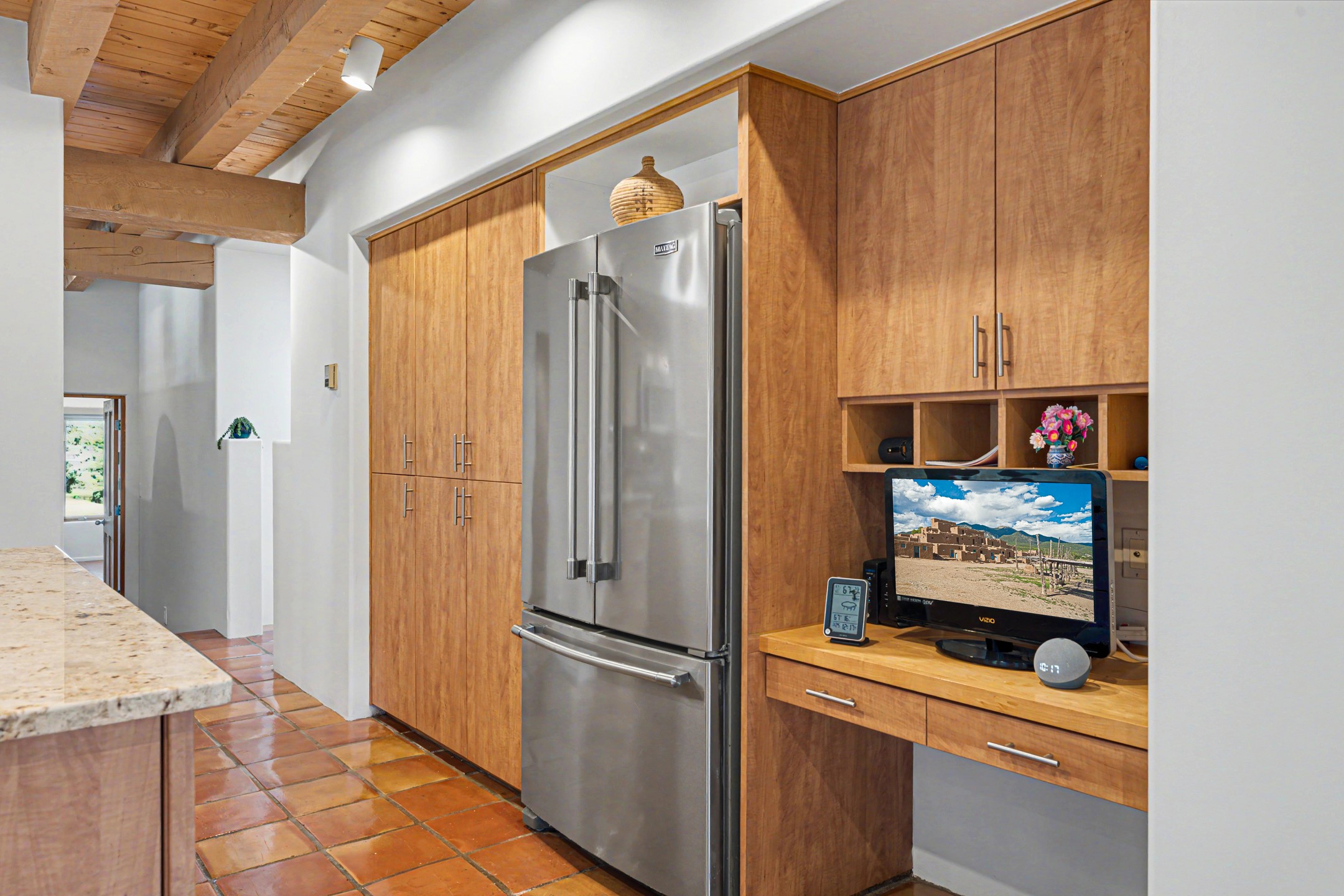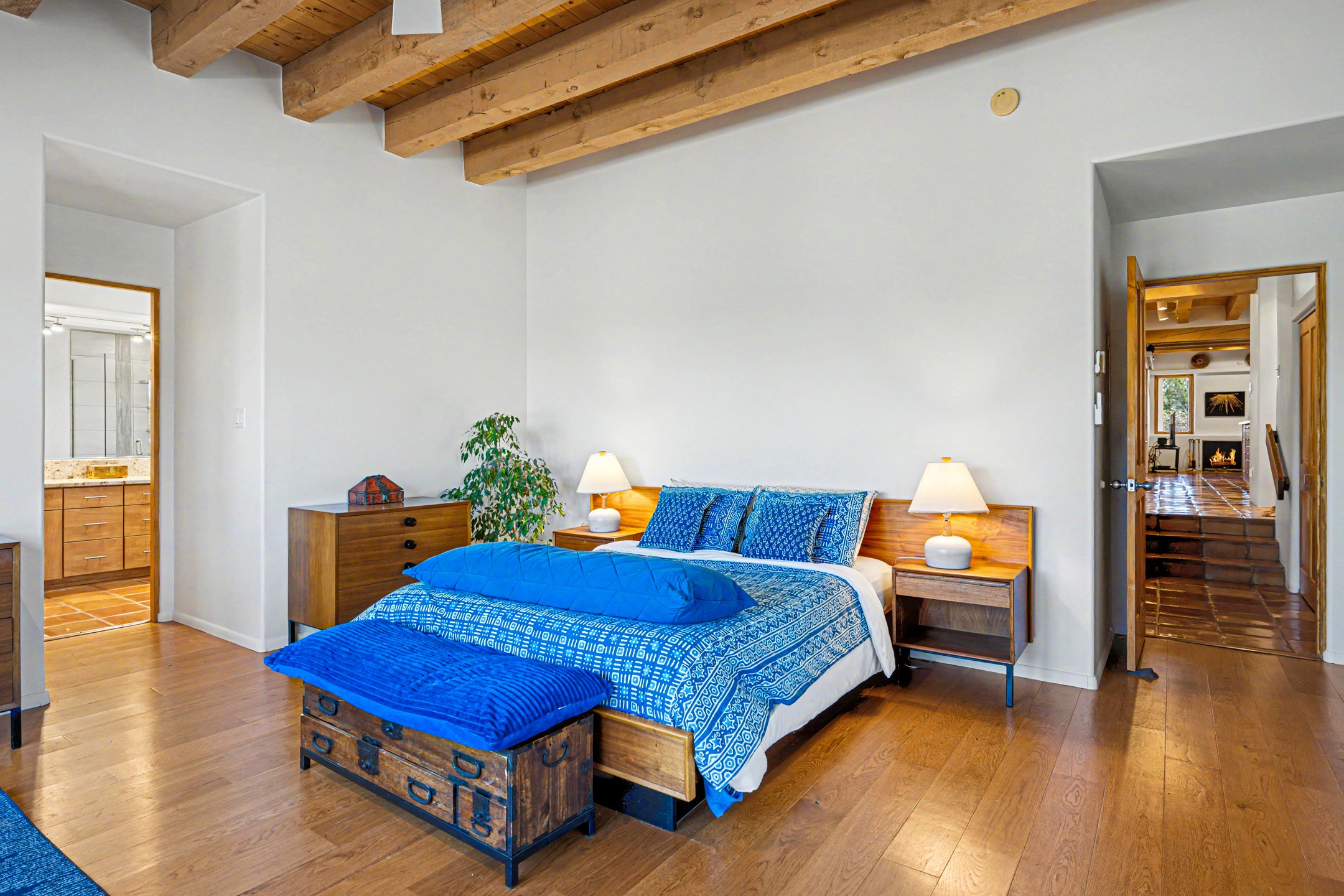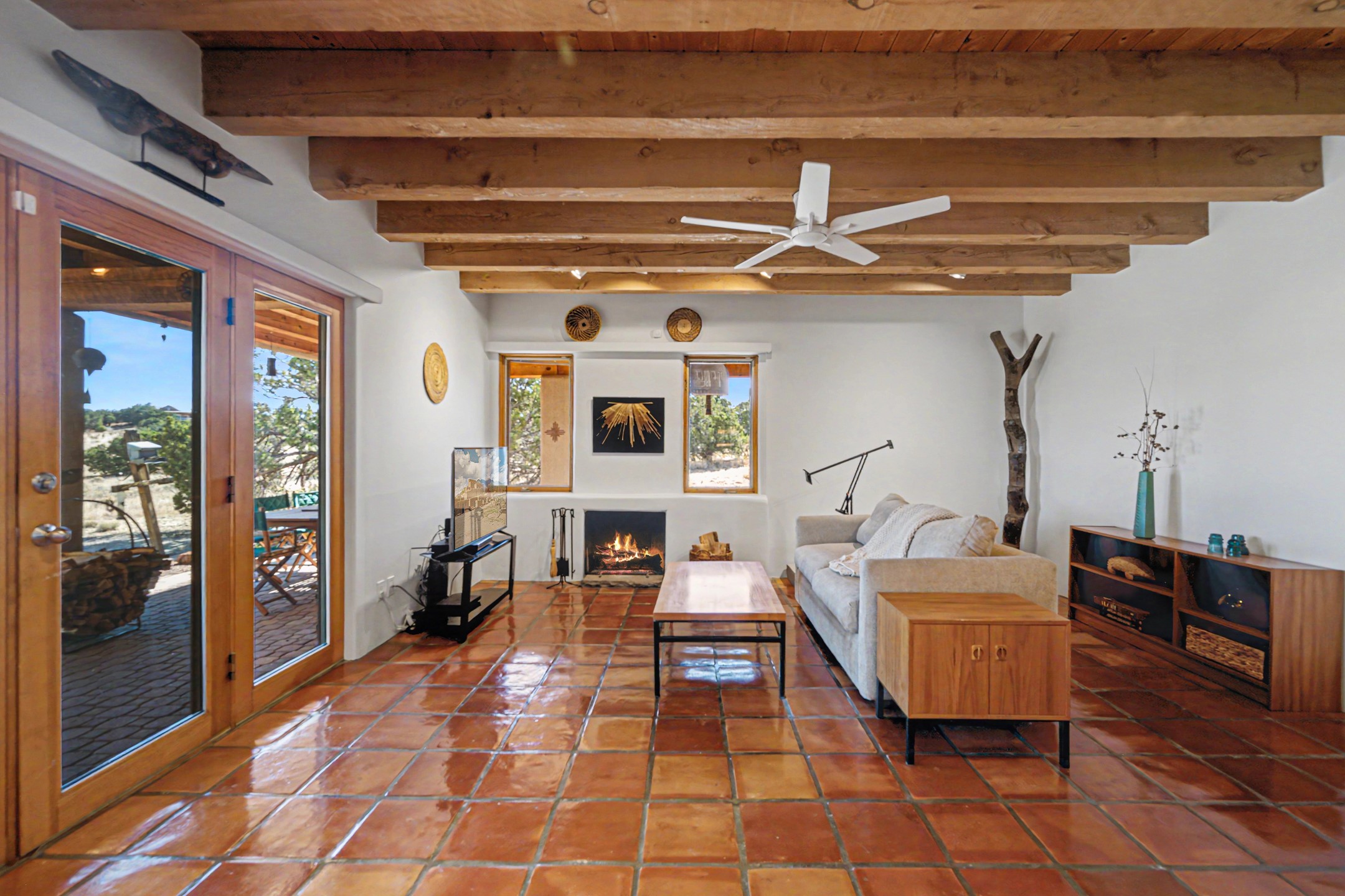 Stunning custom designed and built contemporary pueblo home privately located bordering a large Eldorado greenbelt. Gleaming saltillo tile floors, Kiva fireplaces and beam ceilings create that Santa Fe excitement while high ceilings and multiple long windows create a spacious sunny uplift throughout. There is an entertainers kitchen elegantly remodeled in 2017 with a large central island which flows to a formal dining area and a family room/den overlooking the north mountain foothills across the greenbelt. The sunken living room features a dramatic corner kiva fireplace and wonderful views to the west. There is excellent separation of primary suite from the guest bedrooms, all having Swedish engineered hardwood floors and the bathrooms have been totally refreshed in 2018. Two mini splits were added in 2018 for additional summer comfort. The boiler was replaced in 2019 and the home was re stuccoed in 2024. An oversized finished garage with plenty of storage and work area plus extra parking. This home shows pride of ownership inside and out. All this on 1.76 acres within easy reach of Eldorado amenities, local shopping, library, trails and parks, and only minutes into Santa Fe.