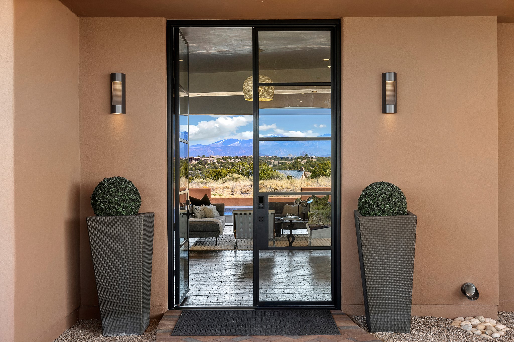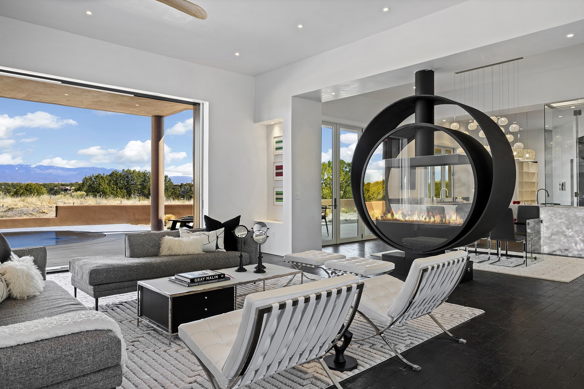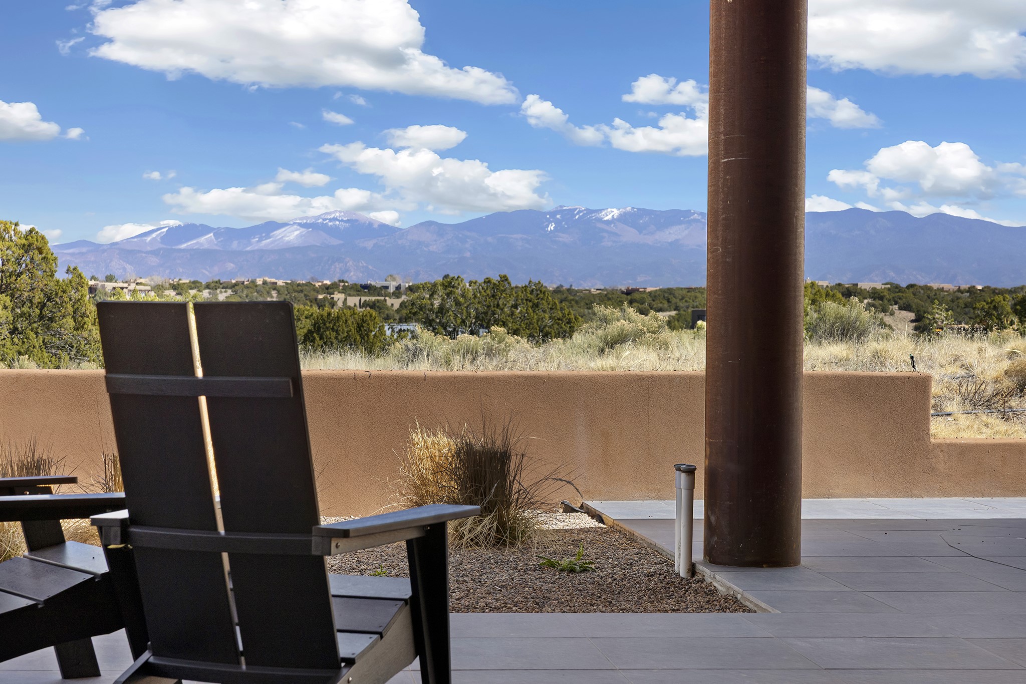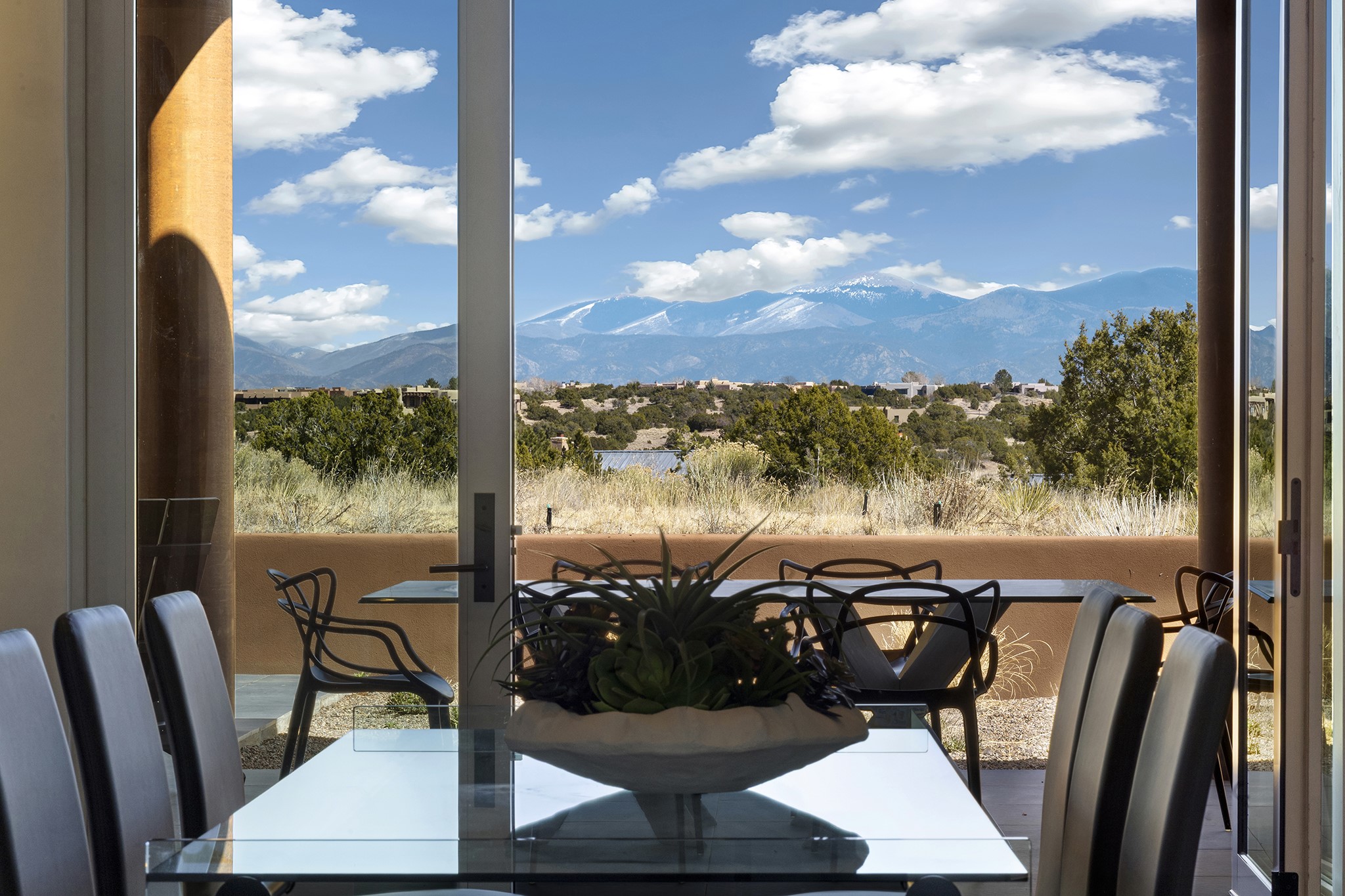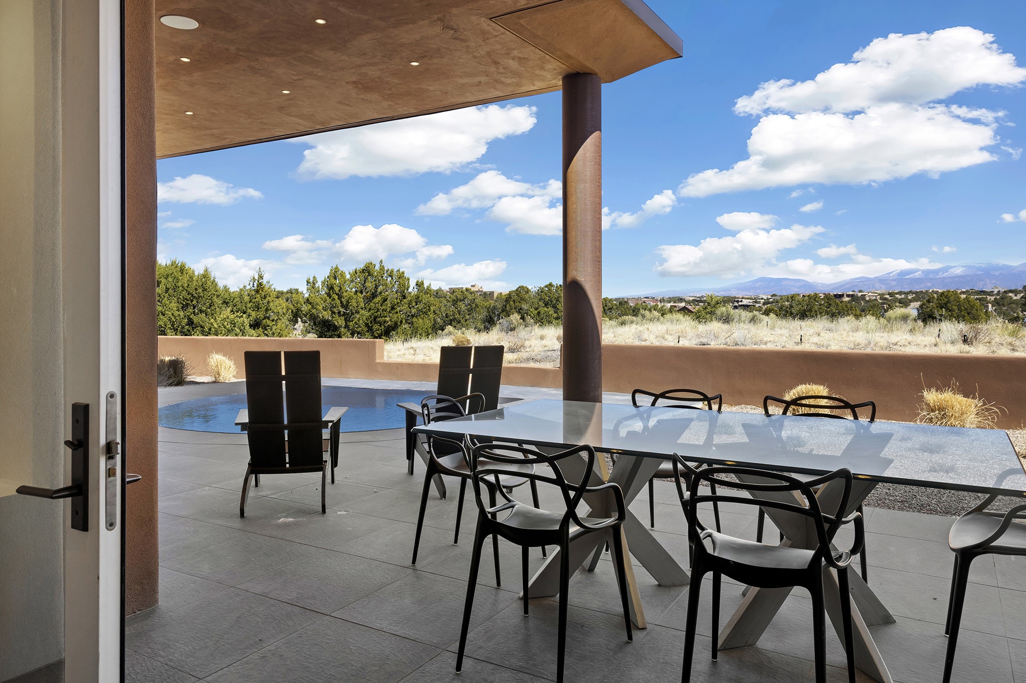An experience with no parallel - relaxed but elegant living at its best. Unstoppable sunrise and sunset views stretch across the Sangre de Cristo and Jemez Mountains, uninterrupted and ever-changing, with no distractions to take away from privacy, the exclusivity, and the quality of this property. 17 Hacienda Vaquero is a Contemporary Pueblo by Native Son Builders, set within the Estancias of Las Campanas. More than 4,200 square feet of refined interior space pairs with over 1,600 square feet of outdoor living, where covered portals, a kiva fireplace, and an inground spa with waterfall--and infinity edge--create a seamless connection to the landscape. The great room centers on a custom gas fireplace and opens effortlessly through motorized sliding walls to brick floors that continue outdoors, blurring the line between inside and out. The kitchen is appointed with Wolf appliances, a Sub-Zero refrigerator and freezer, two Asko dishwashers, a walk-in pantry, and a refrigerated wine display. A mudroom and laundry area sit just off the three-car garage, while a porte-cochere offers covered arrival. A private attached casita includes a kitchenette, living area, and its own portal, ideal for guests or extended stays.Just minutes from downtown Santa Fe this home is set in the exclusive Estancias area of Las Campanas, a private club offering two Jack Nicklaus golf courses, a world-class equestrian center, fitness center, and spa. Optional membership provides access to dining, pools, racquet sports, and more, along with 24-hour security and on-site paramedics and EMTs.