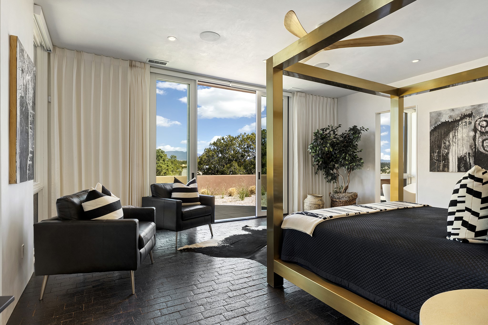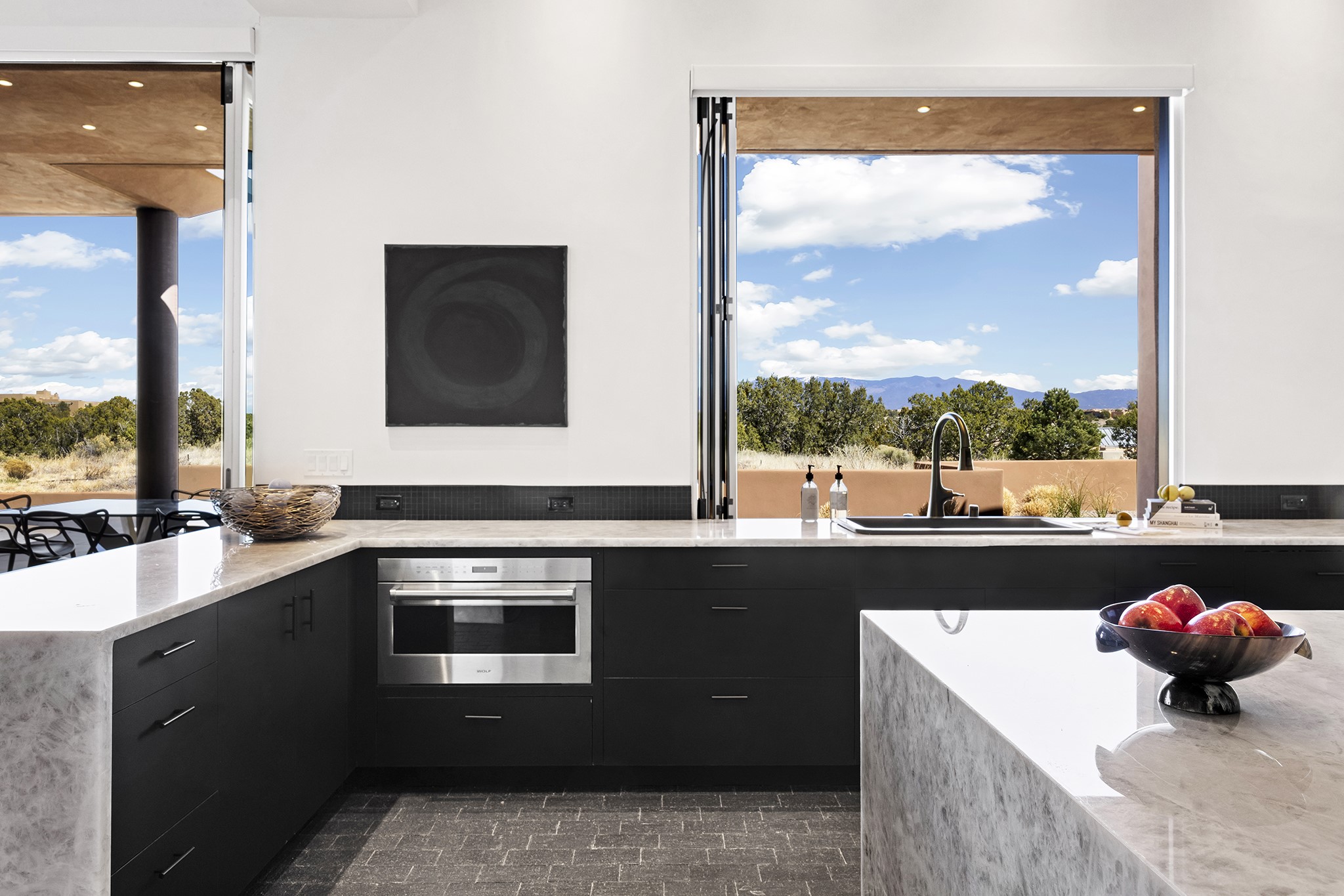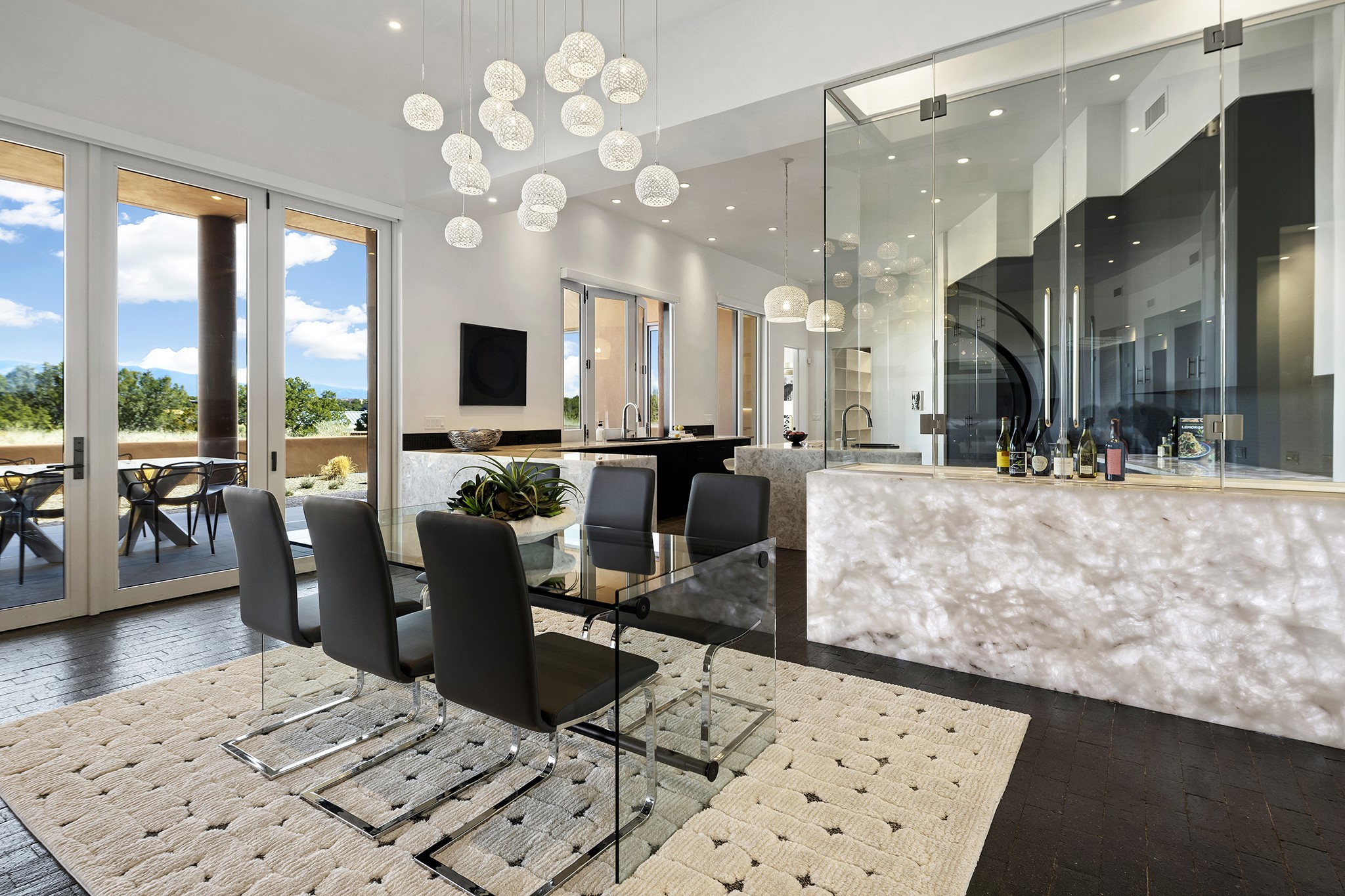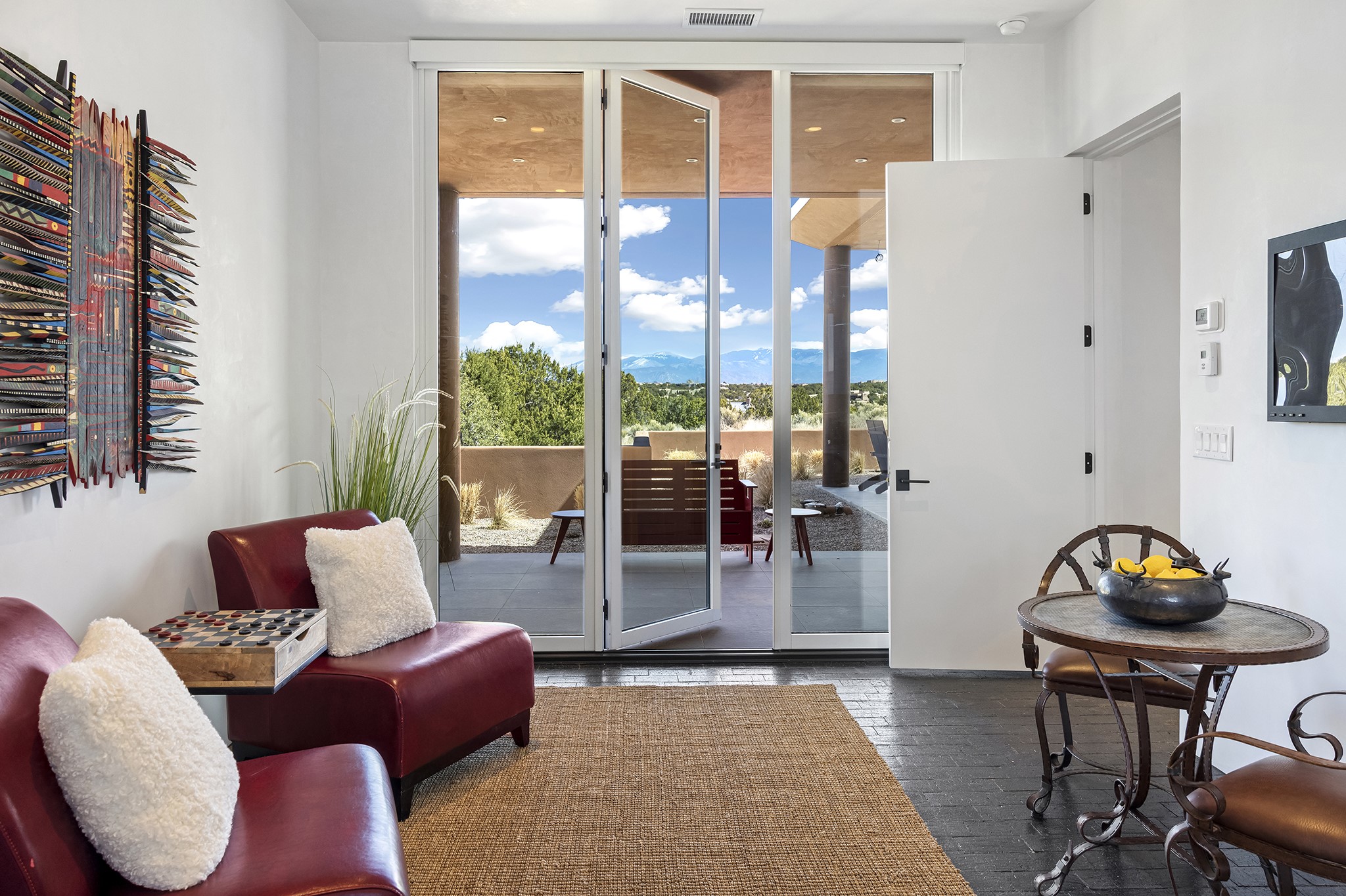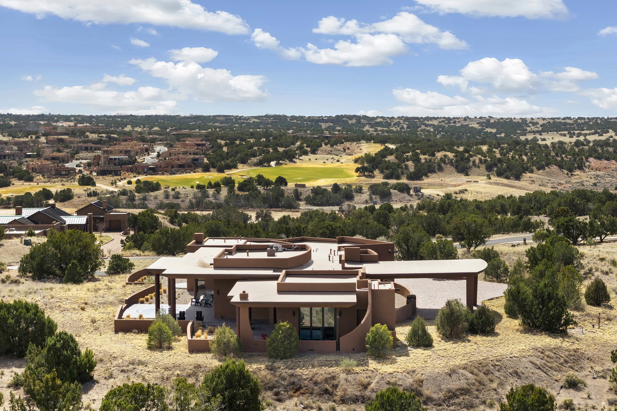 An experience with no parallel - relaxed but elegant living at its best. Unstoppable sunrise and sunset views stretch across the Sangre de Cristo and Jemez Mountains, uninterrupted and ever-changing, with no distractions to take away from privacy, the exclusivity, and the quality of this property. 17 Hacienda Vaquero is a Contemporary Pueblo by Native Son Builders, set within the Estancias of Las Campanas. More than 4,200 square feet of refined interior space pairs with over 1,600 square feet of outdoor living, where covered portals, a kiva fireplace, and an inground spa with waterfall--and infinity edge--create a seamless connection to the landscape. The great room centers on a custom gas fireplace and opens effortlessly through motorized sliding walls to brick floors that continue outdoors, blurring the line between inside and out. The kitchen is appointed with Wolf appliances, a Sub-Zero refrigerator and freezer, two Asko dishwashers, a walk-in pantry, and a refrigerated wine display. A mudroom and laundry area sit just off the three-car garage, while a porte-cochere offers covered arrival. A private attached casita includes a kitchenette, living area, and its own portal, ideal for guests or extended stays.Just minutes from downtown Santa Fe this home is set in the exclusive Estancias area of Las Campanas, a private club offering two Jack Nicklaus golf courses, a world-class equestrian center, fitness center, and spa. Optional membership provides access to dining, pools, racquet sports, and more, along with 24-hour security and on-site paramedics and EMTs.
