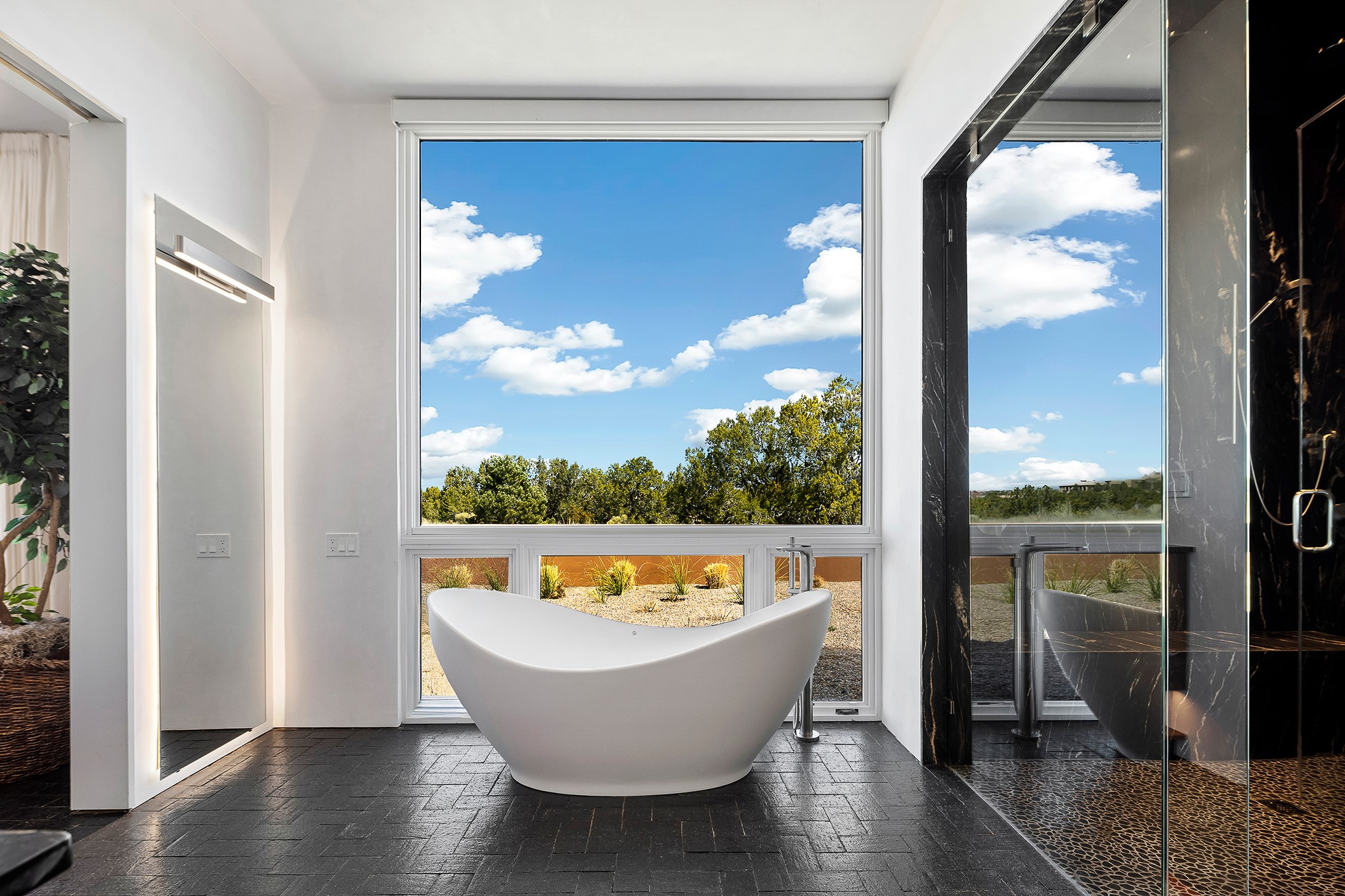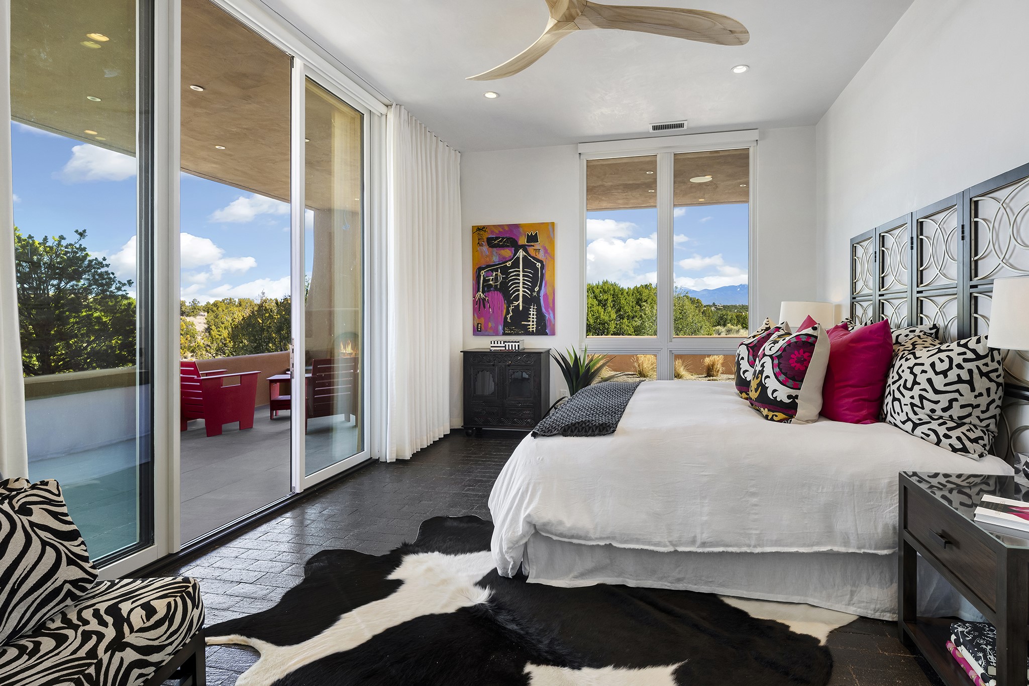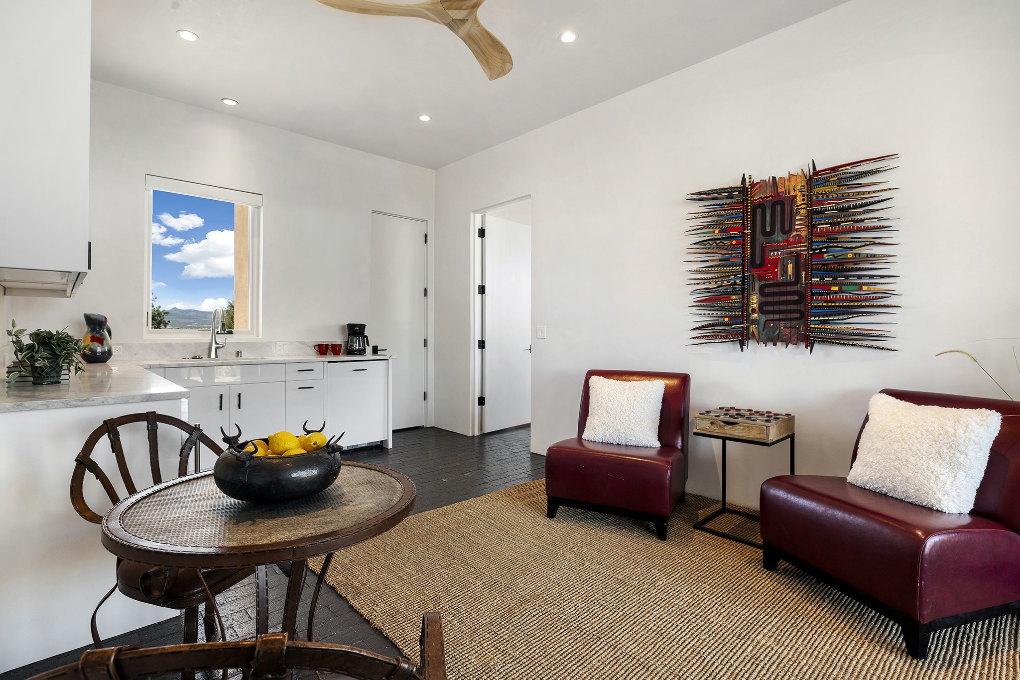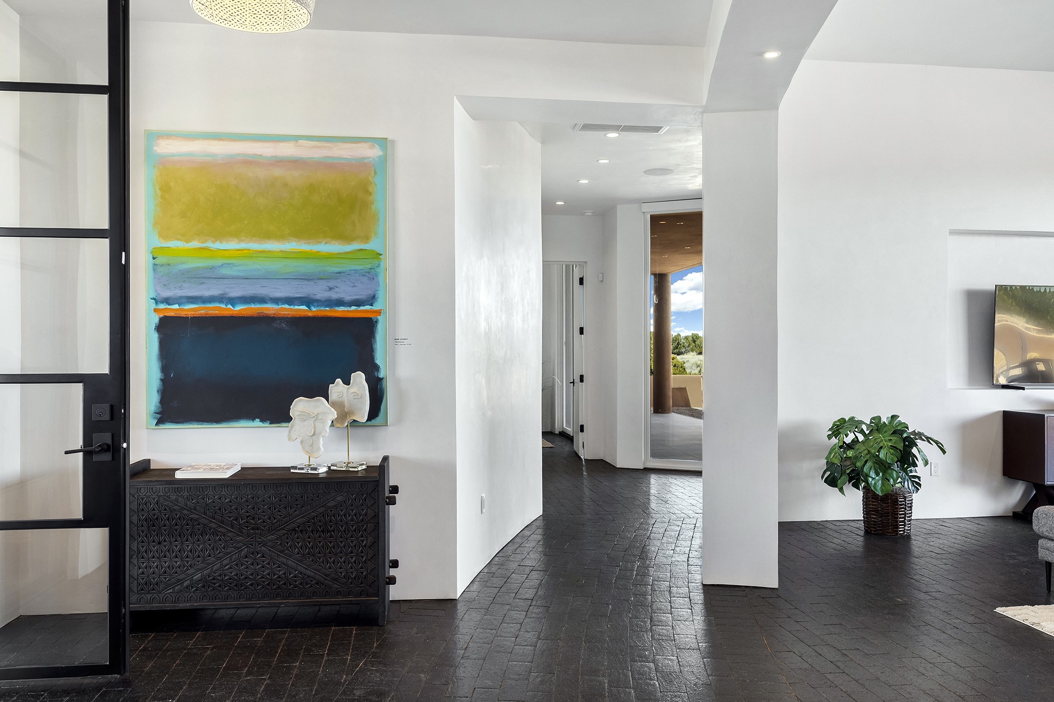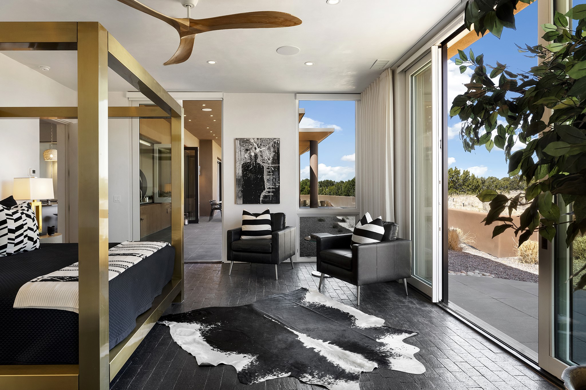 An experience with no parallel - relaxed but elegant living at its best. Unstoppable sunrise and sunset views stretch across the Sangre de Cristo and Jemez Mountains, uninterrupted and ever-changing, with no distractions to take away from privacy, the exclusivity, and the quality of this property. 17 Hacienda Vaquero is a Contemporary Pueblo by Native Son Builders, set within the Estancias of Las Campanas. More than 4,200 square feet of refined interior space pairs with over 1,600 square feet of outdoor living, where covered portals, a kiva fireplace, and an inground spa with waterfall--and infinity edge--create a seamless connection to the landscape. The great room centers on a custom gas fireplace and opens effortlessly through motorized sliding walls to brick floors that continue outdoors, blurring the line between inside and out. The kitchen is appointed with Wolf appliances, a Sub-Zero refrigerator and freezer, two Asko dishwashers, a walk-in pantry, and a refrigerated wine display. A mudroom and laundry area sit just off the three-car garage, while a porte-cochere offers covered arrival. A private attached casita includes a kitchenette, living area, and its own portal, ideal for guests or extended stays.Just minutes from downtown Santa Fe this home is set in the exclusive Estancias area of Las Campanas, a private club offering two Jack Nicklaus golf courses, a world-class equestrian center, fitness center, and spa. Optional membership provides access to dining, pools, racquet sports, and more, along with 24-hour security and on-site paramedics and EMTs.