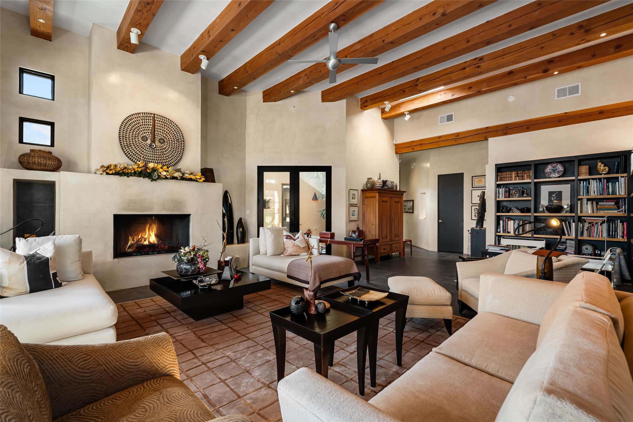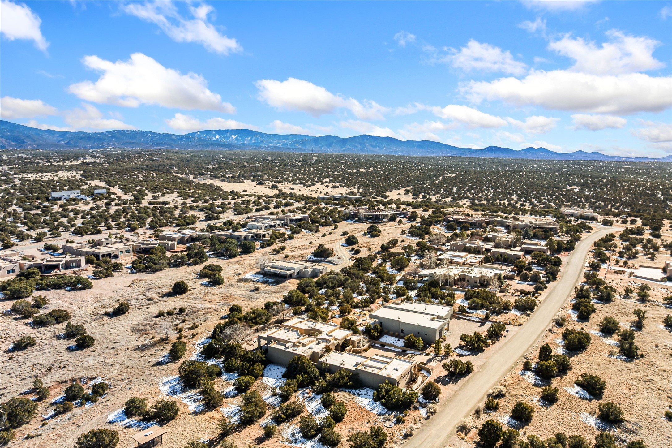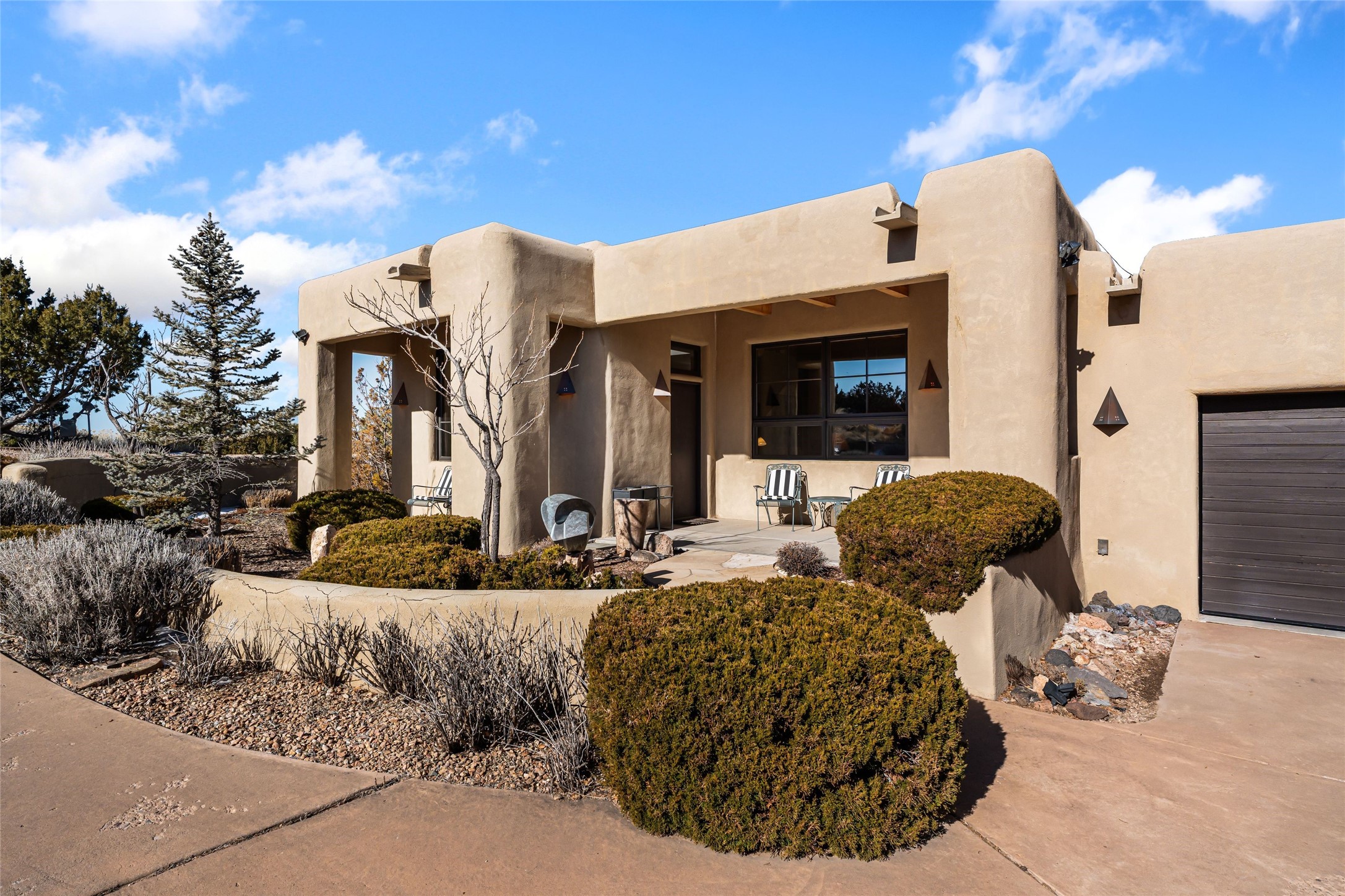 Located in the desirable Heartstone community, only a ten-minute drive to the center of Santa Fe, this Santa Fean Magazine award-winning, charming and unique 3-bedroom, 3.5-bath soft contemporary home and guesthouse offers breathtaking mountain views. Single level; no interior stairs. High end architectural design with warm wood beams, plentiful built-ins and Venetian plaster. Spacious living room and library/study with 14 ft. ceilings, stately fireplace and access to outdoor portals for expanded entertaining. Chef's kitchen is appointed with double oven, 6-burner gas range, wine cooler, double sink and center island with prep sink and eating counter. Off the kitchen is a separate dining area with a wood-burning fireplace and secondary living/media room with a built-in desk area and wood burning stove--an ideal place to huddle on wintry nights. Public and private spaces radiate from the entry hall and are separated by a an Asian-inspired atrium and waterfall pond. The 898 sq. ft. guesthouse features a living/dining area, kitchen, bedroom, full bath, an office and a sizable flex space now being used as an art studio. Oversized 2-car heated garage. Newer furnace, hot water heater and roof. A spectacular, low maintenance, designer landscaped backyard includes a water feature. Heartstone is characterized by half-acre lots, thoughtfully arranged around a shared meadow and many acres of permanently dedicated open space, fostering a connection to nature and tranquility. For those who enjoy an active lifestyle, the community is surrounded by a network of trails, granting access to the La Tierra Trails--a multi-use system featuring 25 miles of paths designed for hikers, cyclists, and equestrians alike. The community house serves as a venue for social gatherings and activities, complemented by an exercise room, guest bedroom/bathroom, large dining room and media room. Located in the desirable Tano Road area, this residence provides easy access to the vibrant Santa Fe Plaza, the artistic charm of Canyon Road, the Santa Fe's Farmer's Market, and the renowned Santa Fe Opera.