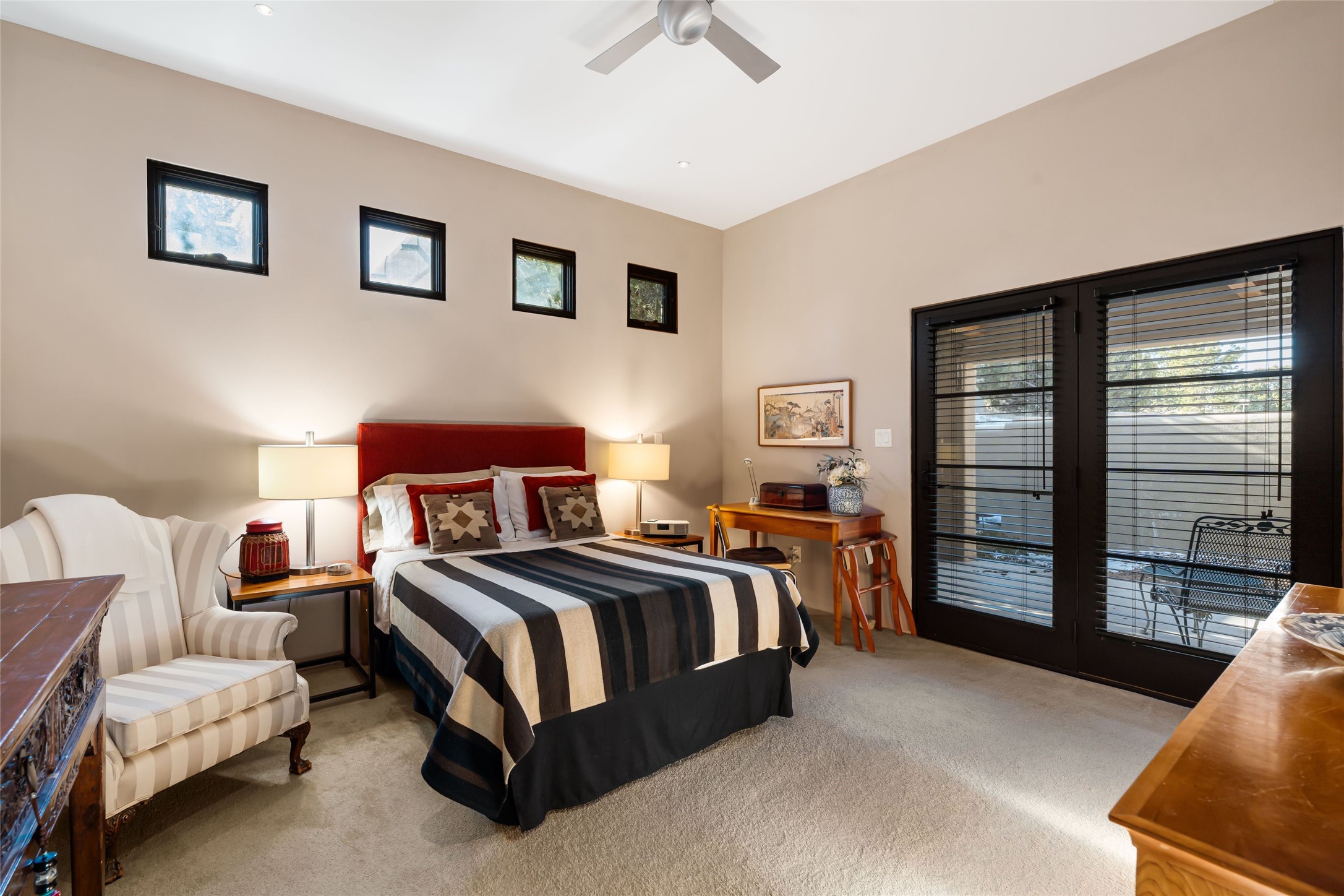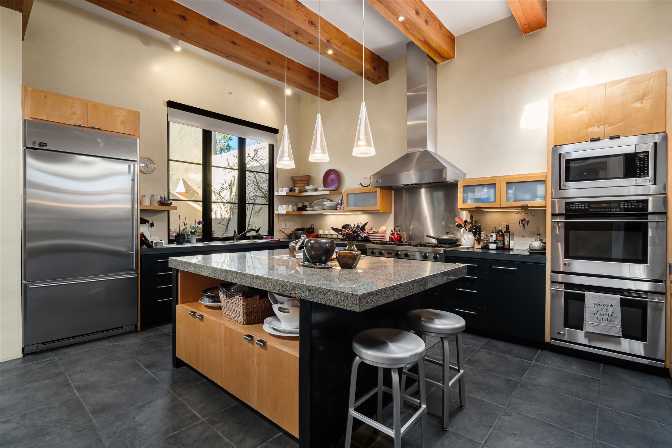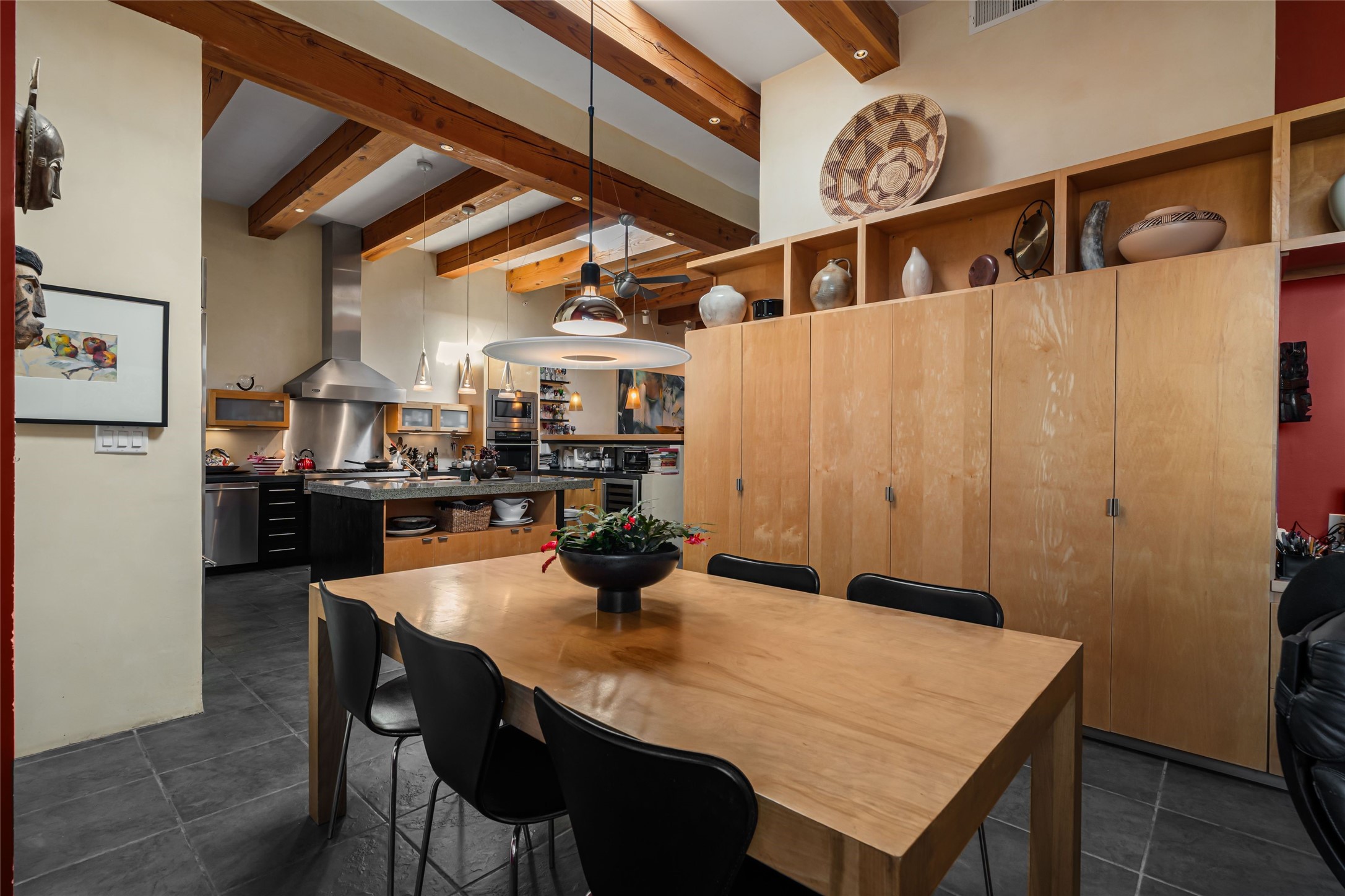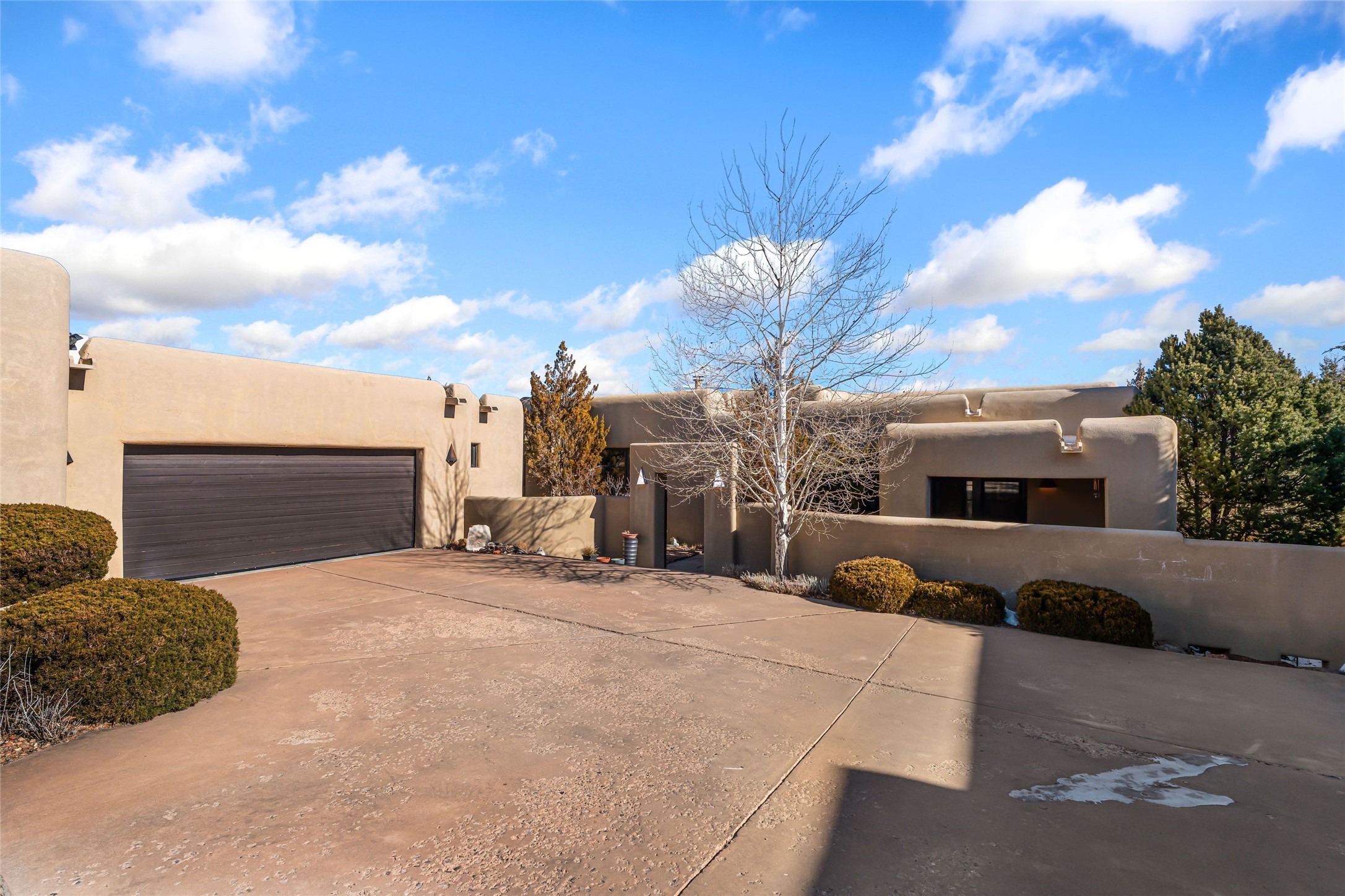 Located in the desirable Heartstone community, only a ten-minute drive to the center of Santa Fe, this Santa Fean Magazine award-winning, charming and unique 3-bedroom, 3.5-bath soft contemporary home and guesthouse offers breathtaking mountain views. Single level; no interior stairs. High end architectural design with warm wood beams, plentiful built-ins and Venetian plaster. Spacious living room and library/study with 14 ft. ceilings, stately fireplace and access to outdoor portals for expanded entertaining. Chef's kitchen is appointed with double oven, 6-burner gas range, wine cooler, double sink and center island with prep sink and eating counter. Off the kitchen is a separate dining area with a wood-burning fireplace and secondary living/media room with a built-in desk area and wood burning stove--an ideal place to huddle on wintry nights. Public and private spaces radiate from the entry hall and are separated by a an Asian-inspired atrium and waterfall pond. The 898 sq. ft. guesthouse features a living/dining area, kitchen, bedroom, full bath, an office and a sizable flex space now being used as an art studio. Oversized 2-car heated garage. Newer furnace, hot water heater and roof. A spectacular, low maintenance, designer landscaped backyard includes a water feature. Heartstone is characterized by half-acre lots, thoughtfully arranged around a shared meadow and many acres of permanently dedicated open space, fostering a connection to nature and tranquility. For those who enjoy an active lifestyle, the community is surrounded by a network of trails, granting access to the La Tierra Trails--a multi-use system featuring 25 miles of paths designed for hikers, cyclists, and equestrians alike. The community house serves as a venue for social gatherings and activities, complemented by an exercise room, guest bedroom/bathroom, large dining room and media room. Located in the desirable Tano Road area, this residence provides easy access to the vibrant Santa Fe Plaza, the artistic charm of Canyon Road, the Santa Fe's Farmer's Market, and the renowned Santa Fe Opera.