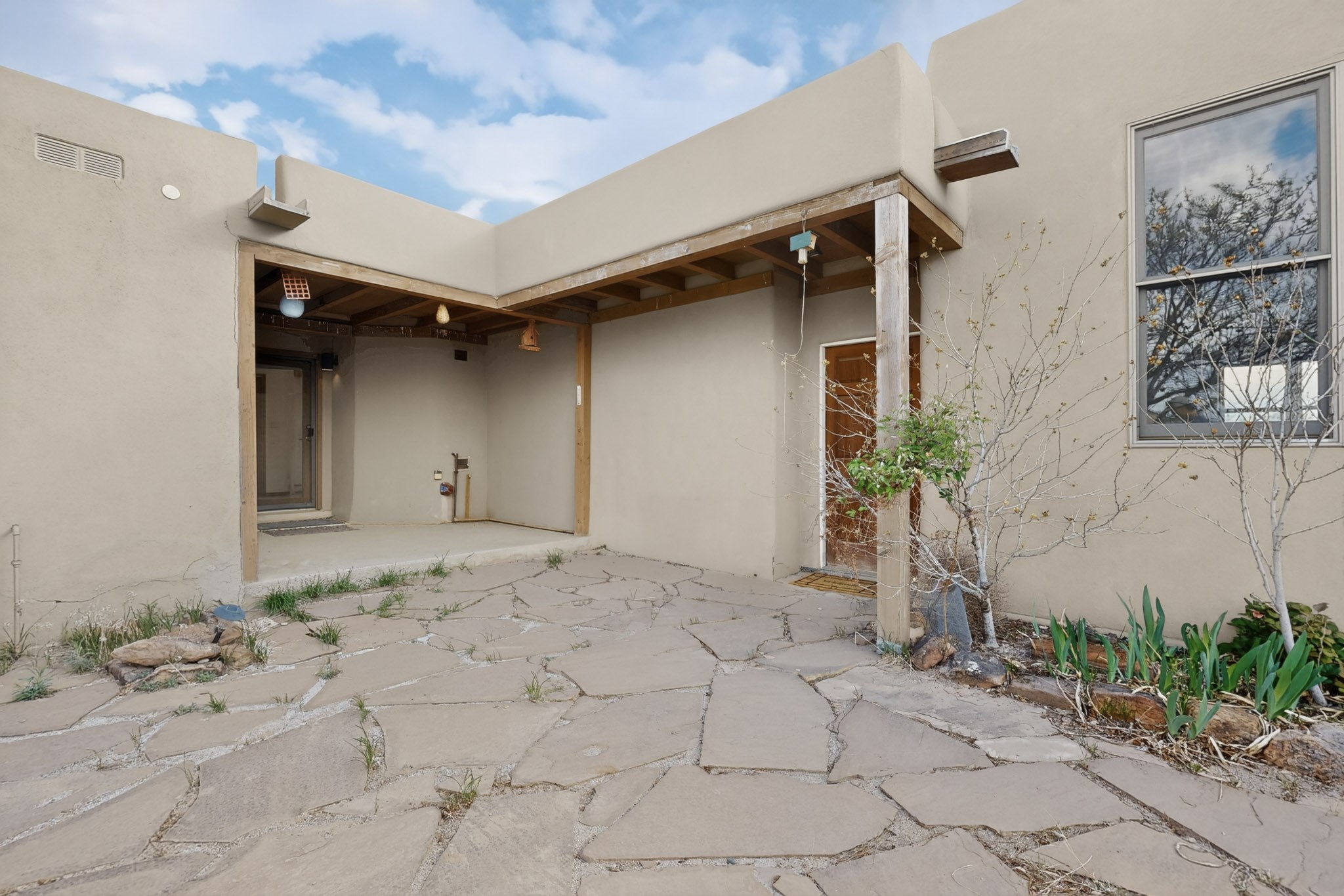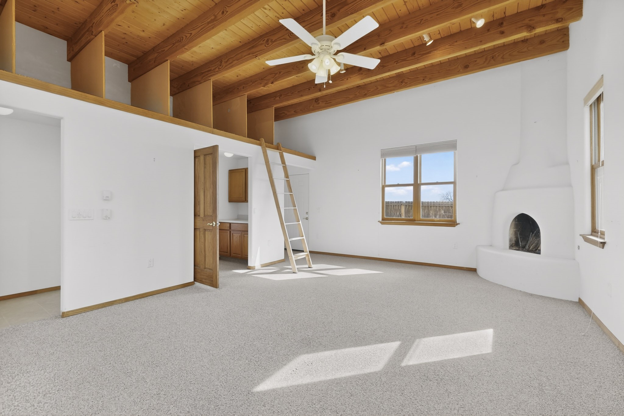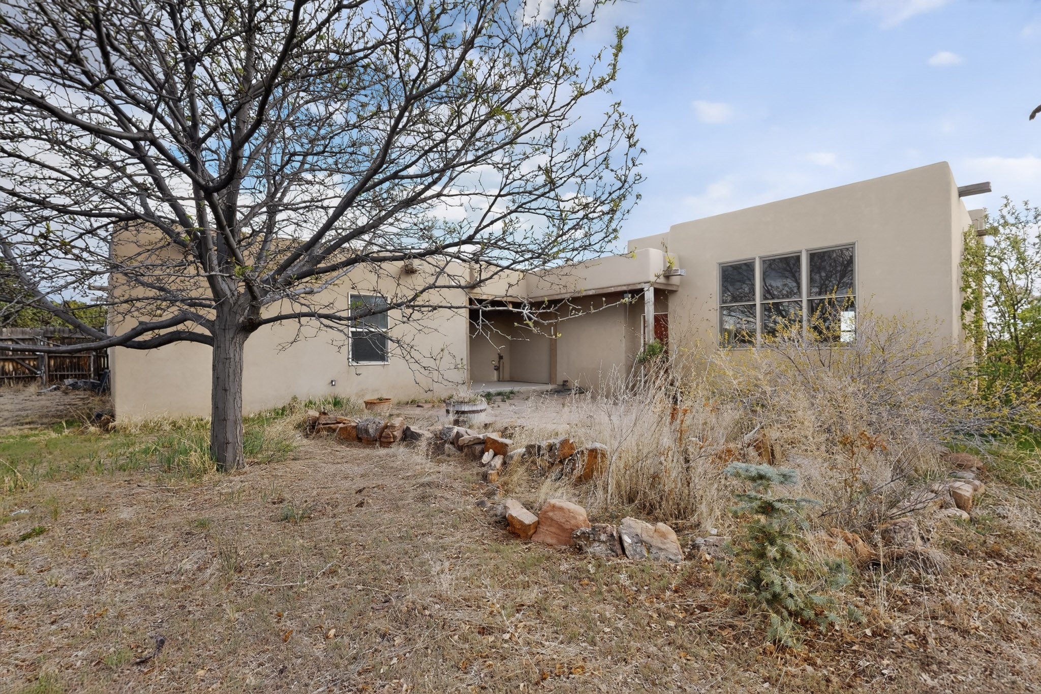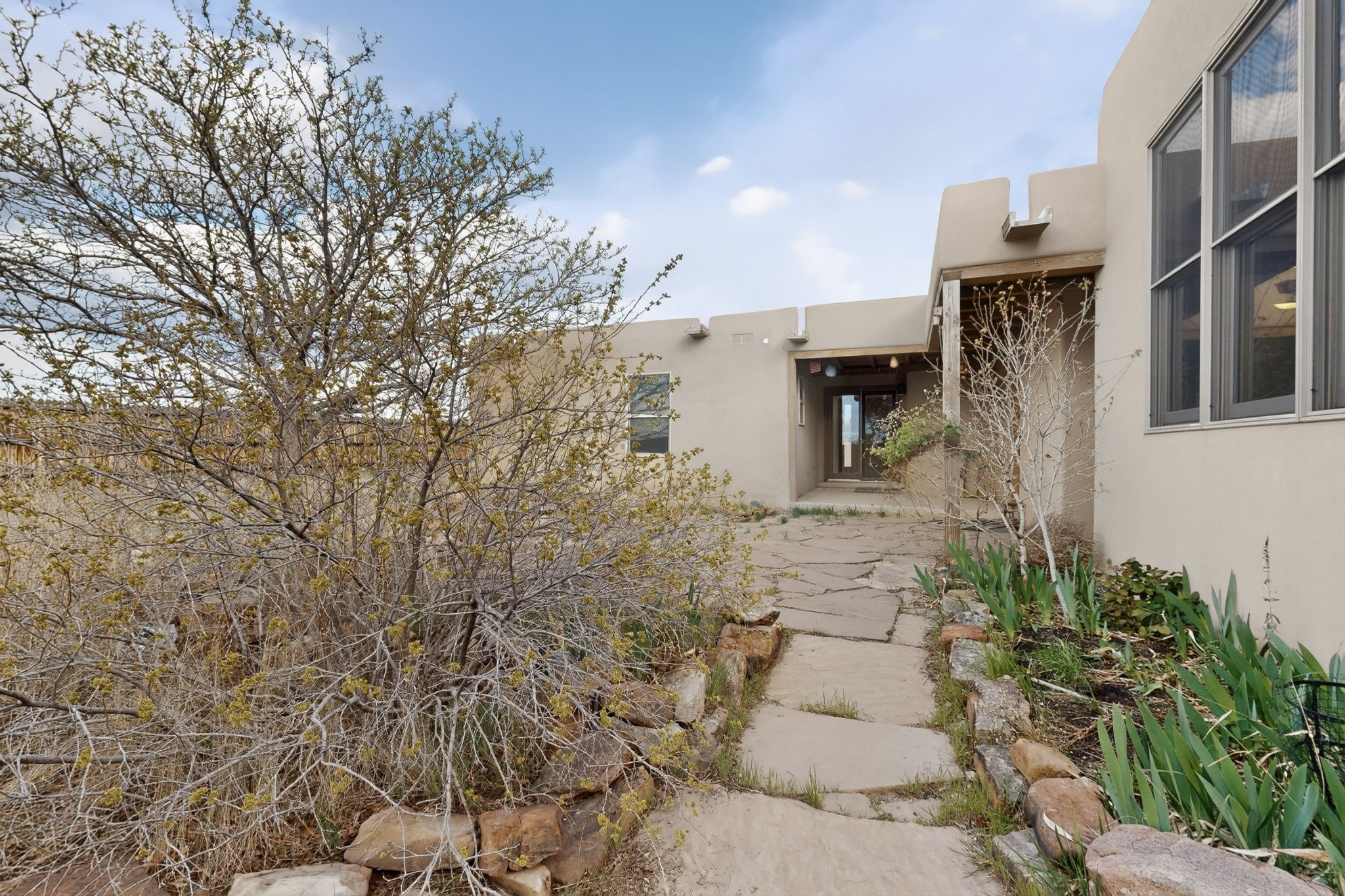 A Painter's Studio custom built for a painter including high ceiling, tons of light and special art storage area. Originally custom built by Hi Point for an artist couple, this 3 bedroom, 2 bath passive solar designed home is filled with light. The kitchen includes an east facing breakfast nook ideal for your morning beverage, a central island, and a dining area which also makes a lovely office. Steps lead down to the livingroom featuring high beam ceilings and kiva fireplace, plus long southern exposure to sunset mountain views. The main bedroom is nicely separated from the guest suite, and can also access the studio for night time inspired moments! There are two portals and a large privately fenced yard, plus a 2 car garage with circular driveway. This home needs TLC which over time will bring it back to its former glory. Conveniently located just off paved access to Eldorado Amenities and local shopping, hike/bike trails, greenbelt, and minutes into Santa Fe.