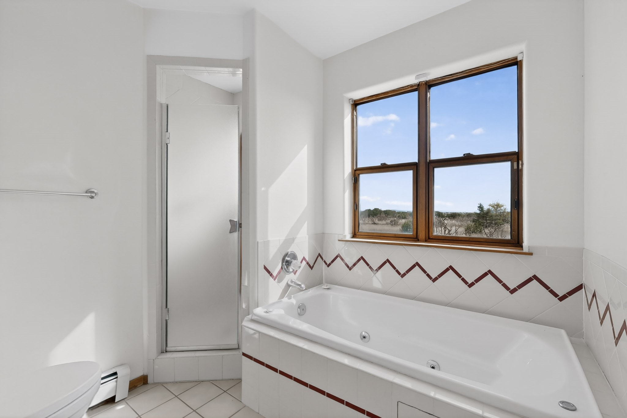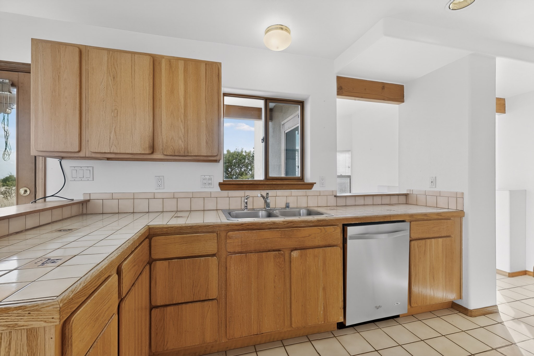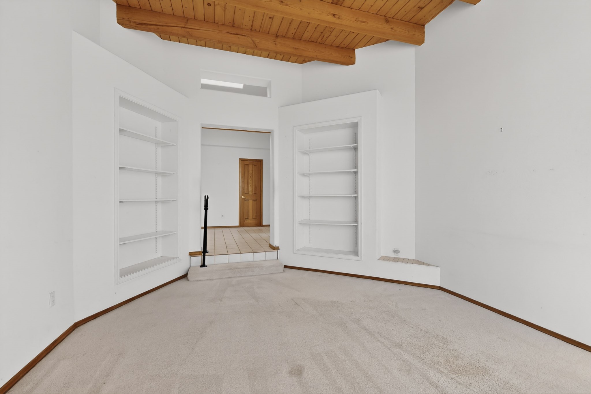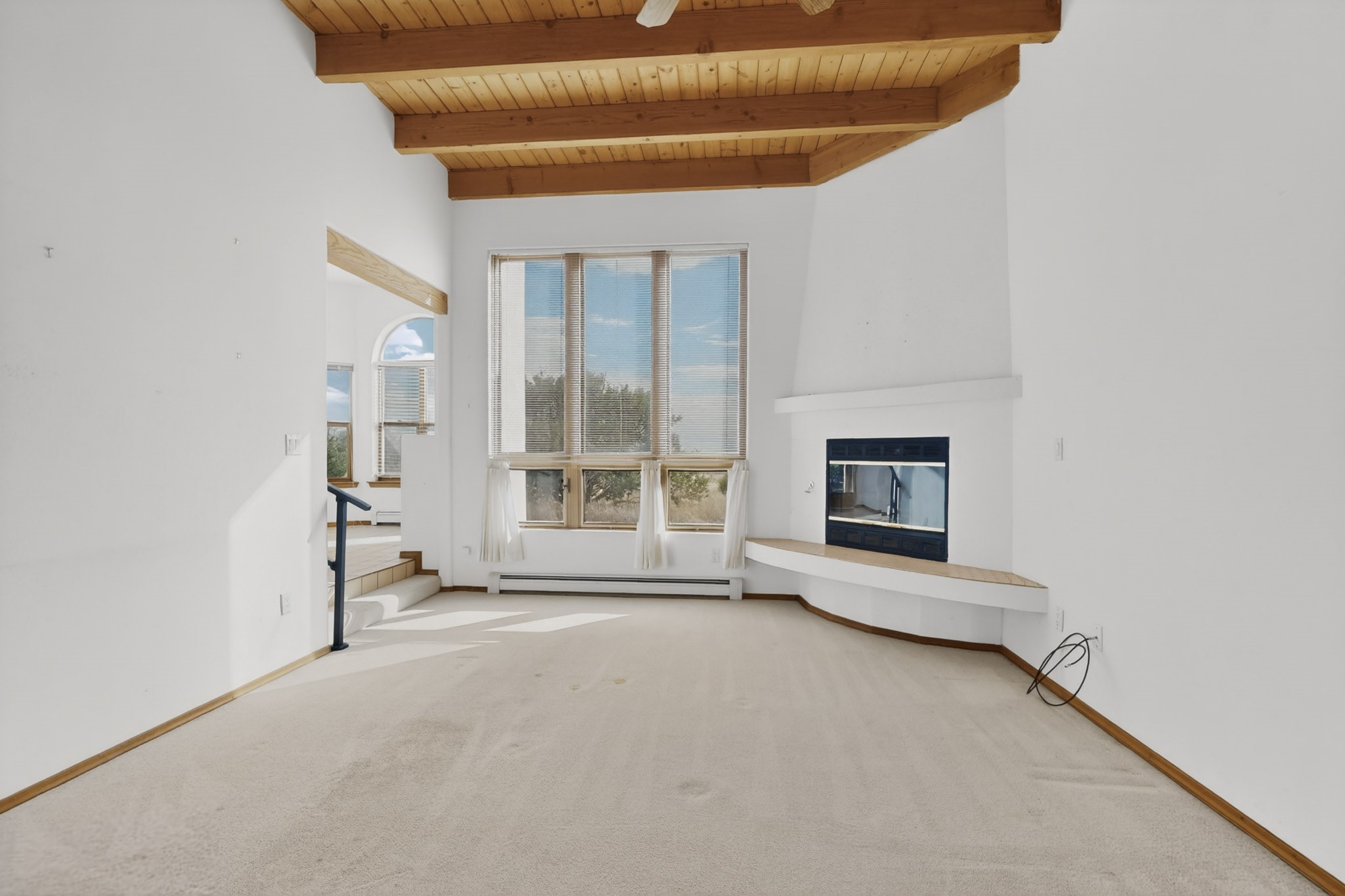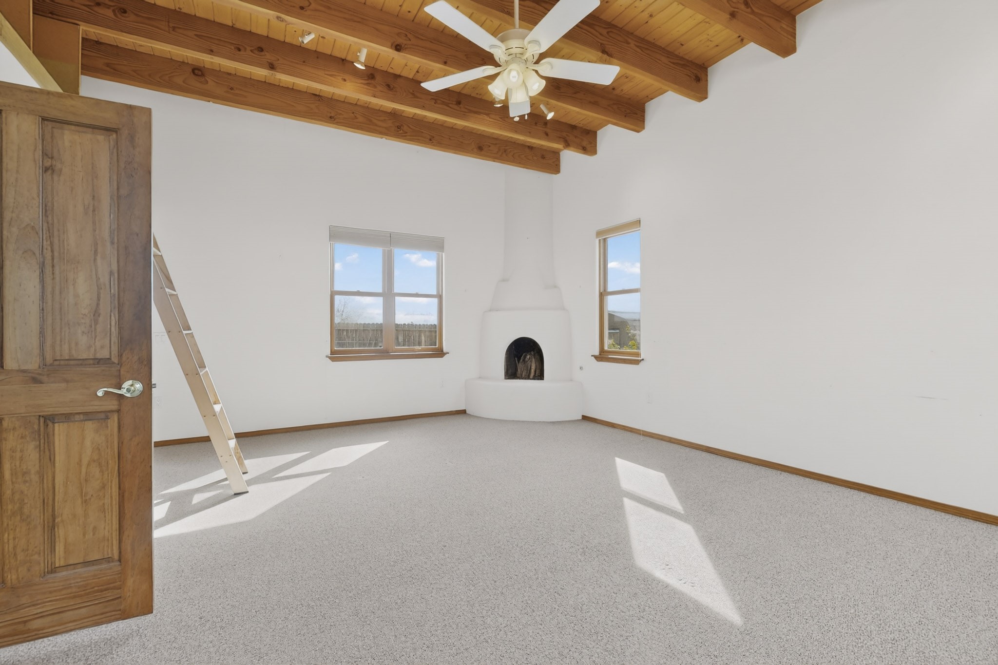 A Painter's Studio custom built for a painter including high ceiling, tons of light and special art storage area. Originally custom built by Hi Point for an artist couple, this 3 bedroom, 2 bath passive solar designed home is filled with light. The kitchen includes an east facing breakfast nook ideal for your morning beverage, a central island, and a dining area which also makes a lovely office. Steps lead down to the livingroom featuring high beam ceilings and kiva fireplace, plus long southern exposure to sunset mountain views. The main bedroom is nicely separated from the guest suite, and can also access the studio for night time inspired moments! There are two portals and a large privately fenced yard, plus a 2 car garage with circular driveway. This home needs TLC which over time will bring it back to its former glory. Conveniently located just off paved access to Eldorado Amenities and local shopping, hike/bike trails, greenbelt, and minutes into Santa Fe.