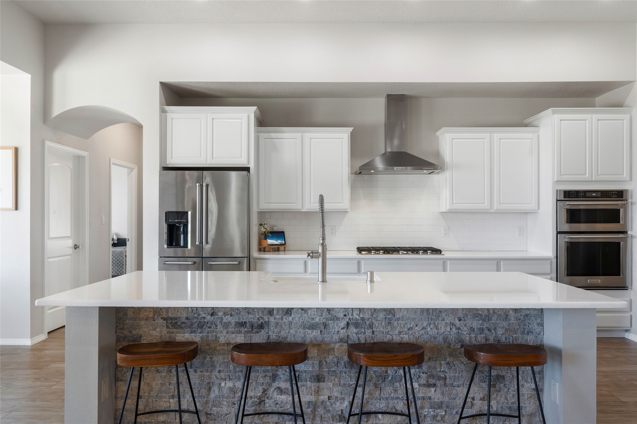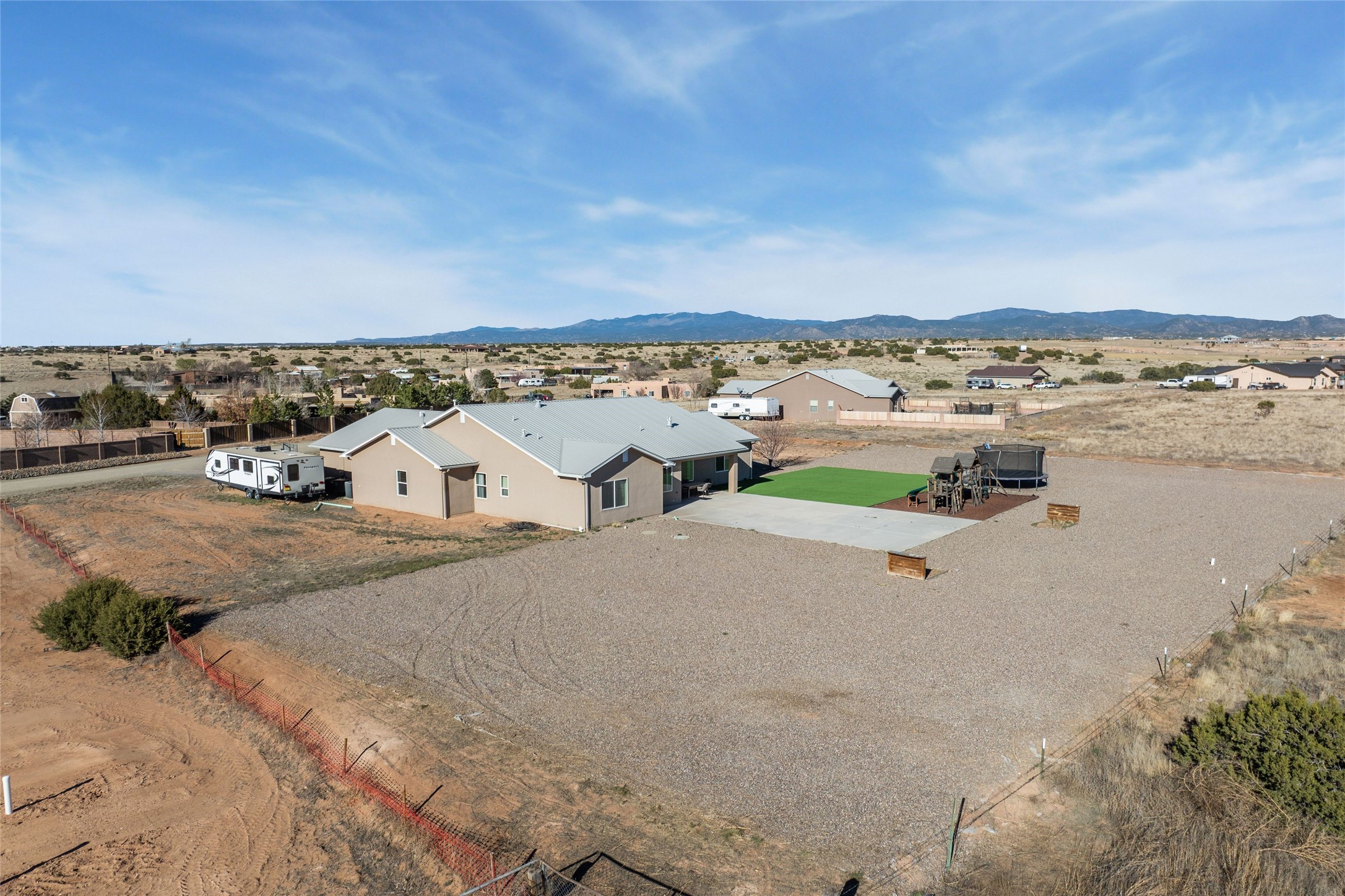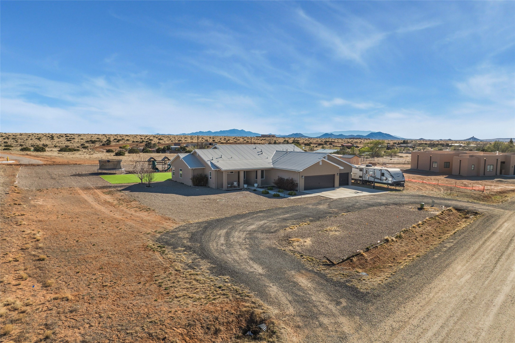 A true entertainer's delight, aesthetically stunning, in a gated community, Valle Serena, built in 2017. This single level home with a pro-panel roof has it all....VIEWS, 1.3 acre lot to spread out, light and bright with high ceilings, 3 bedrooms, including a spacious primary suite with an additional oversized entertaining/studio/ office space (multi purpose room), 3 baths, 3 designated eating areas: Separate Dining Room, Breakfast Nook and Kitchen Island. The meticulously designed home offers the perfect balance of comfort, luxury & livability. CHEF'S KITCHEN is a culinary haven outfitted with premier appliances, custom cabinetry, large island with seating and a generous walk in pantry. The entertainment room has a service bar and is wired for a projection screen. This open concept home shows pride of ownership and has been very well maintained. The attached finished 3 car garage offers 2 oversized spaces as well as additional storage/work space. This home is great for Los Alamos commuters, it's minutes from Hwy 599. There are several Los Alamos commuters in the subdivision! The road to the subdivision, Avenida Del Sur is scheduled to be paved. Quiet and private setting. Move-in ready and waiting for you and your family.