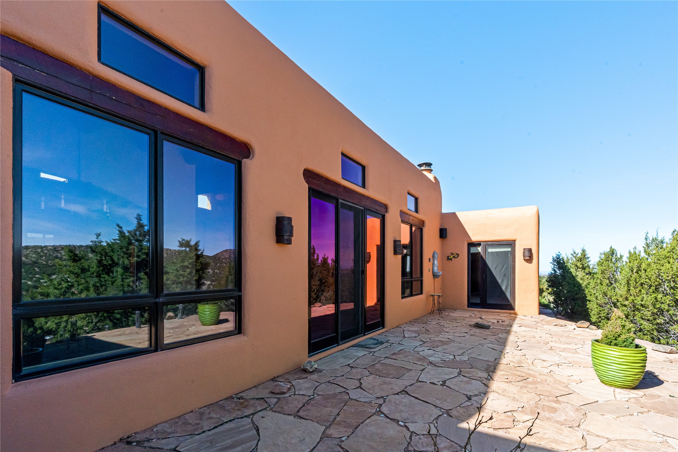 Set on a premier ridge-top lot in The Ridges, this 3.78+/- acre property offers exceptional privacy and sweeping views across nearly 2,000 acres of bordering open space and surrounding mountain ranges. The setting delivers a rare sense of space and quiet while still being conveniently located near the amenities of Eldorado and approximately 25 minutes to the Santa Fe Plaza. Built in 2002 and well-maintained, the 2,433+/- sq ft home features classic Santa Fe architecture with a functional single-level layout. The main living area showcases high ceilings with exposed vigas, a kiva fireplace, and large windows that capture the expansive views, while multiple skylights throughout the home bring in abundant natural light. Hand-carved posts and hard trowel plaster walls in the main living area and primary suite add warmth and craftsmanship throughout. The kitchen opens to the living and dining areas and features custom cabinetry, tile countertops, and a central island, creating an inviting space for everyday living and entertaining. The home offers three bedrooms and a well-balanced layout with one full bath, one 3/4 bath, and one 1/2 bath. The primary suite includes its own kiva fireplace, viga ceilings, and a comfortable, private retreat. Outdoor living is a standout feature, with multiple areas to take in the big skies, sunsets, and surrounding landscape. A new hot tub is included, providing the perfect place to unwind and enjoy the setting. A new roof was installed on September 22, 2025 and includes a 10-year transferable warranty, offering added peace of mind. The oversized finished garage provides flexibility for a workshop, studio, or additional storage. Horses are allowed on the property, with ample space to add facilities if desired. A rare opportunity to own a true ridge-top property with privacy, character, and convenience in one of the area's most desirable settings.