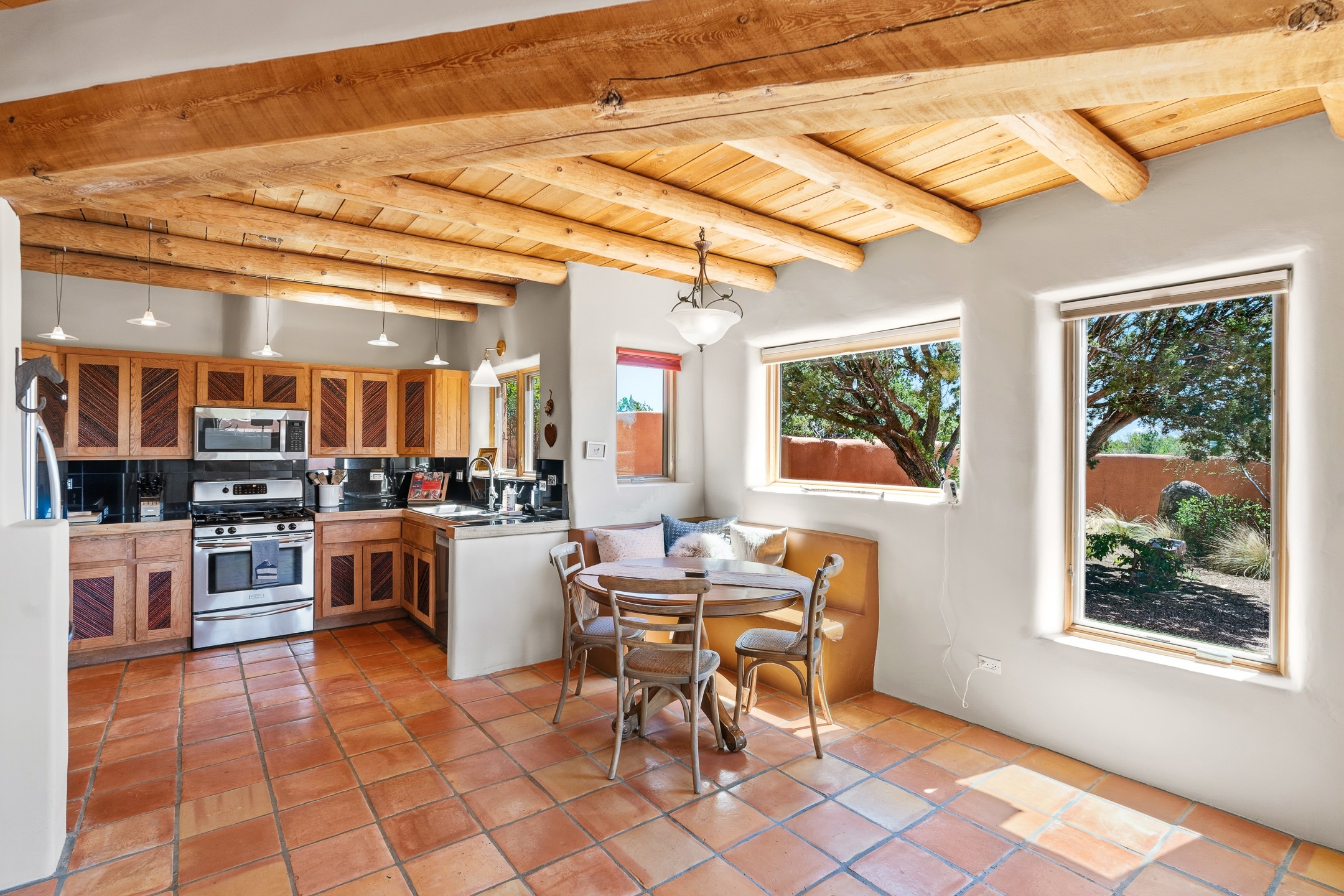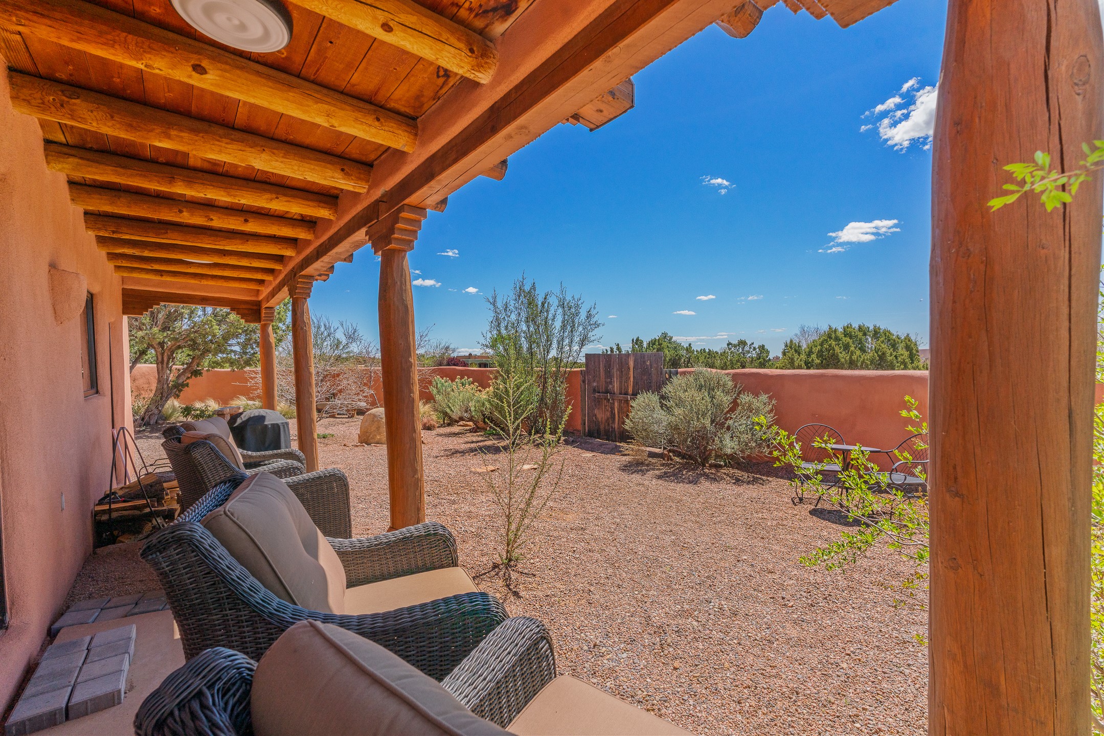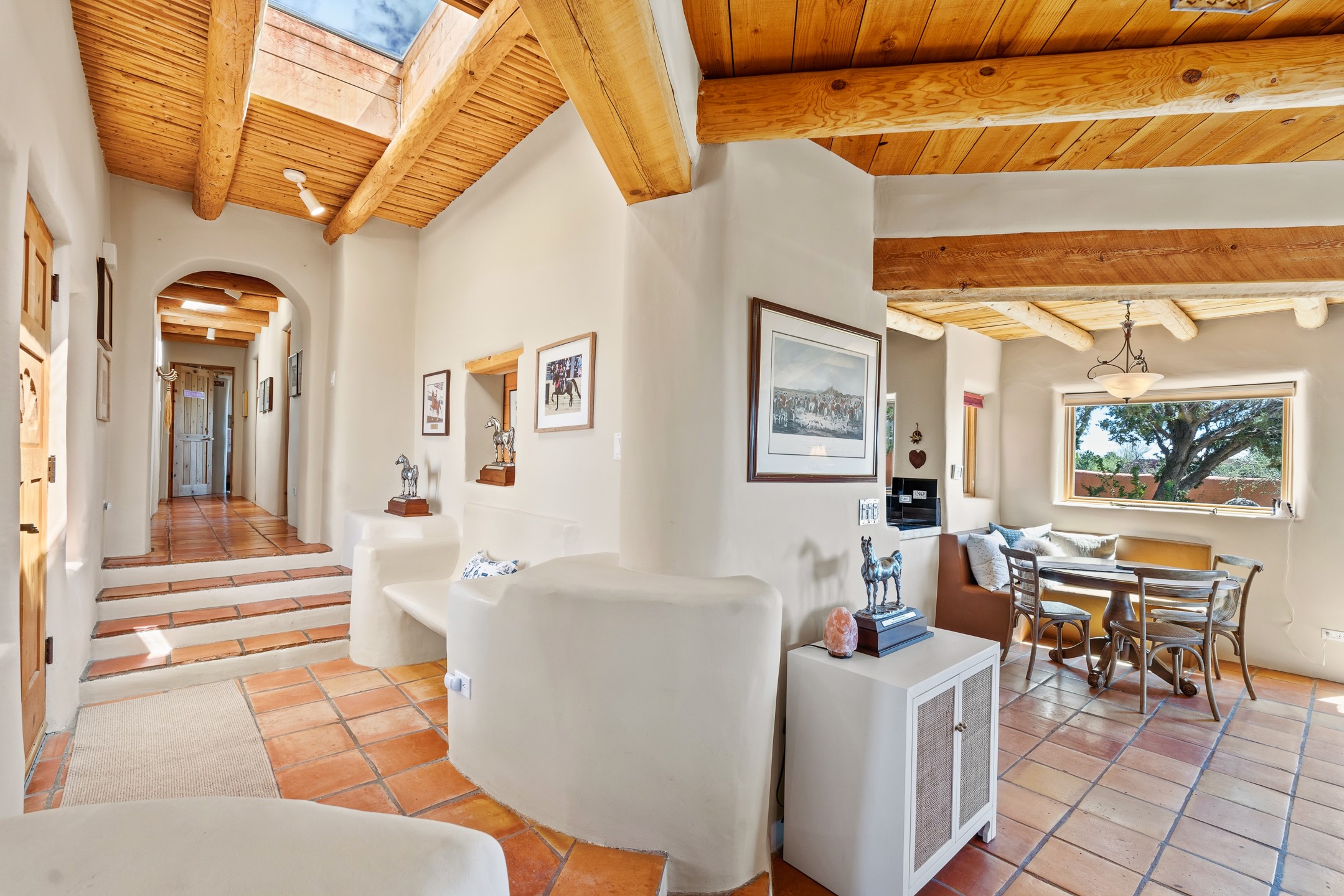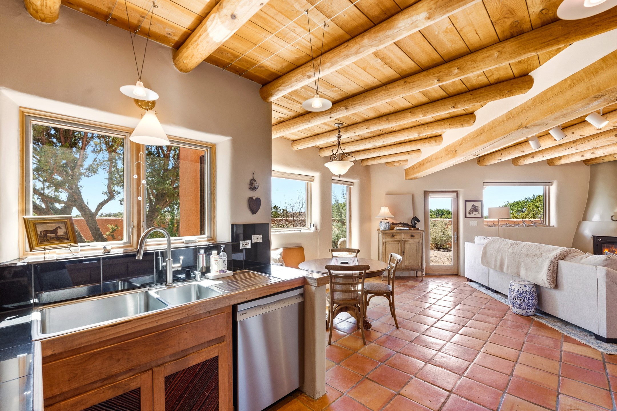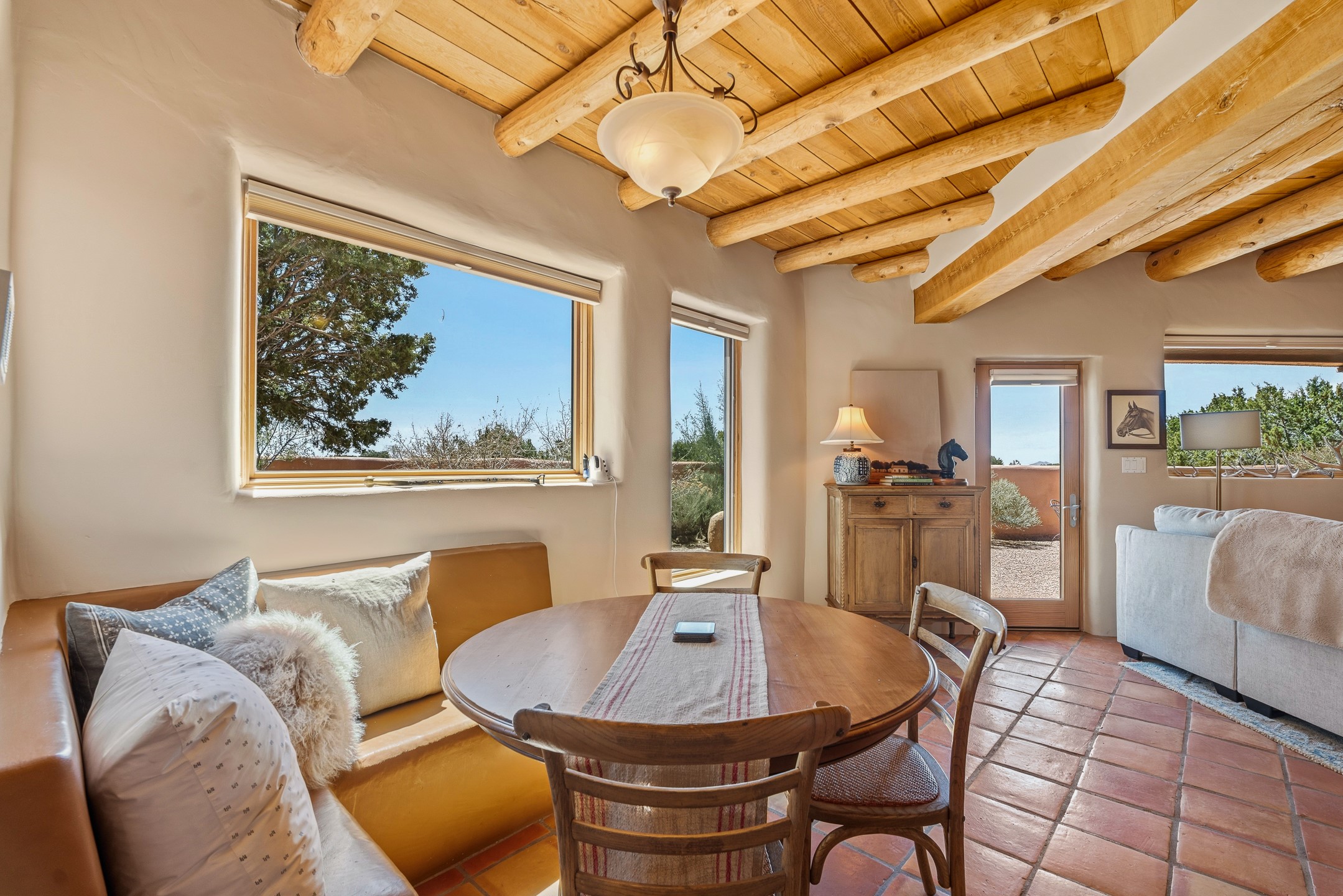 Welcome to this timeless adobe residence that beautifully captures the essence of classic Southwestern charm. From the moment you enter the walled front courtyard, you're greeted by lush gardens and a sense of privacy that sets the tone for this inviting home. Inside, rich architectural details abound, smooth plaster walls, warm Saltillo tile floors, and exposed vigas create an authentic and cozy atmosphere throughout. The open-concept living, dining, and kitchen area is designed for both comfort and connection, featuring a charming plaster banco at the dining space that invites long, relaxed gatherings. A traditional kiva fireplace anchors the living room, flanked by additional banco seating, perfect for quiet evenings or entertaining. The thoughtfully designed floor plan offers excellent separation of space. The primary suite is tucked just off the living area, with direct access to the backyard, creating a peaceful retreat. The ensuite bath features double sinks, a separate soaking tub, and a walk-in shower. Guest bedrooms are privately situated on the opposite side of the home, with a well-appointed guest bath in between. Function meets convenience with a dedicated laundry room complete with shelving and a countertop for folding. Even the two-car garage reflects the home's character, showcasing exposed adobe walls. Step outside to a fully walled backyard designed for easy living and enjoyment. Low-maintenance landscaping, stone seating areas, a raised garden bed, and a covered portal provide multiple spaces to relax, dine, and take in the serene surroundings. This is a rare opportunity to own a home that seamlessly blends traditional craftsmanship with everyday comfort--an authentic Southwestern sanctuary in a truly special setting.
