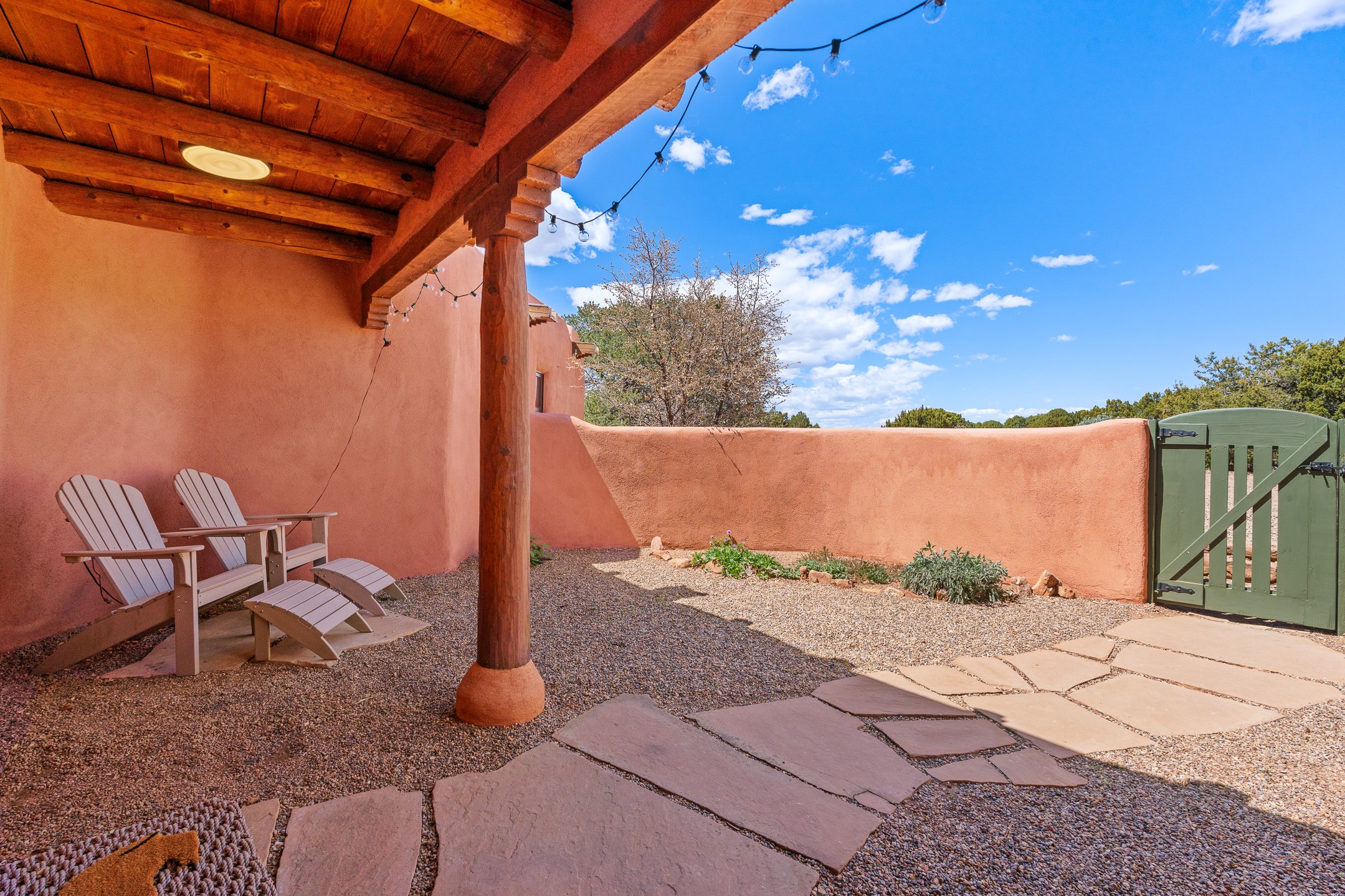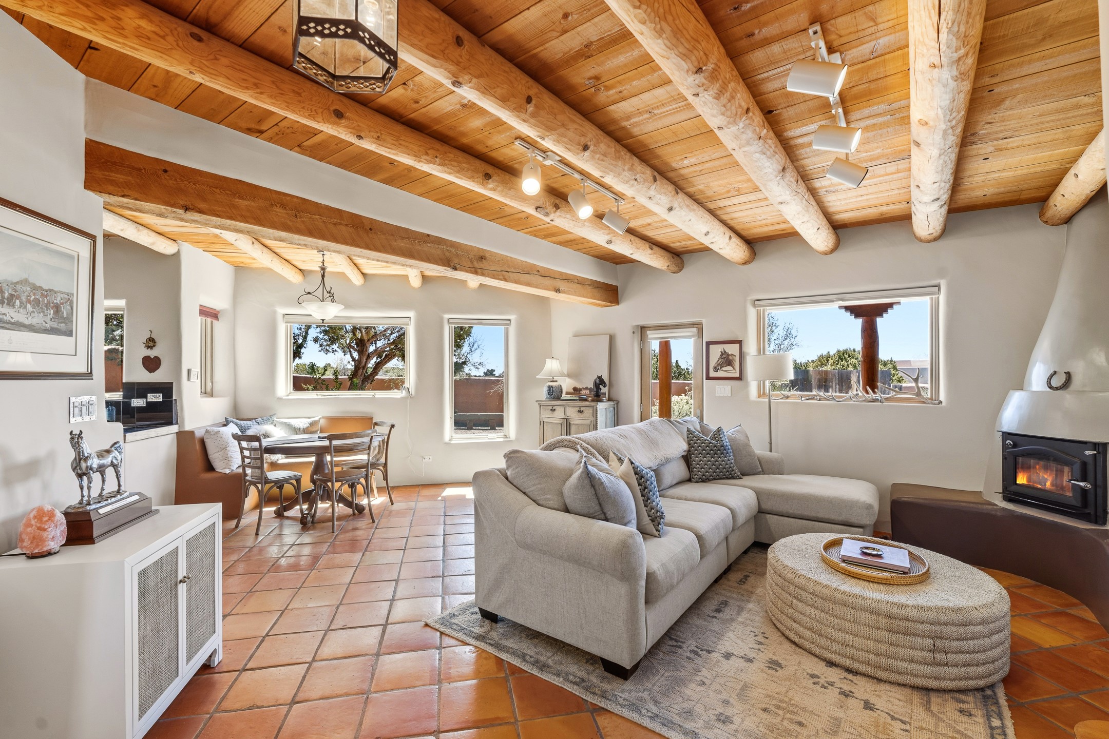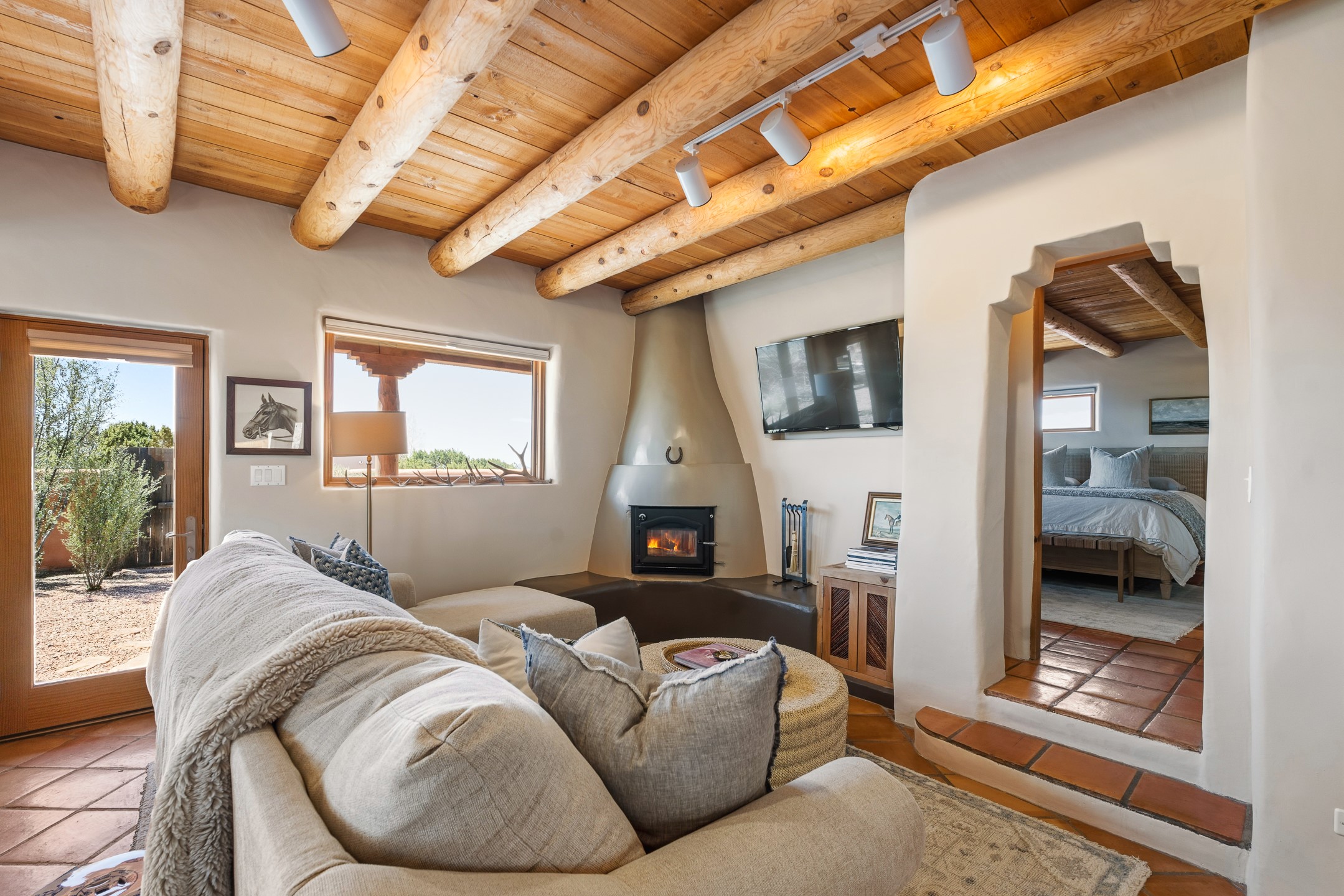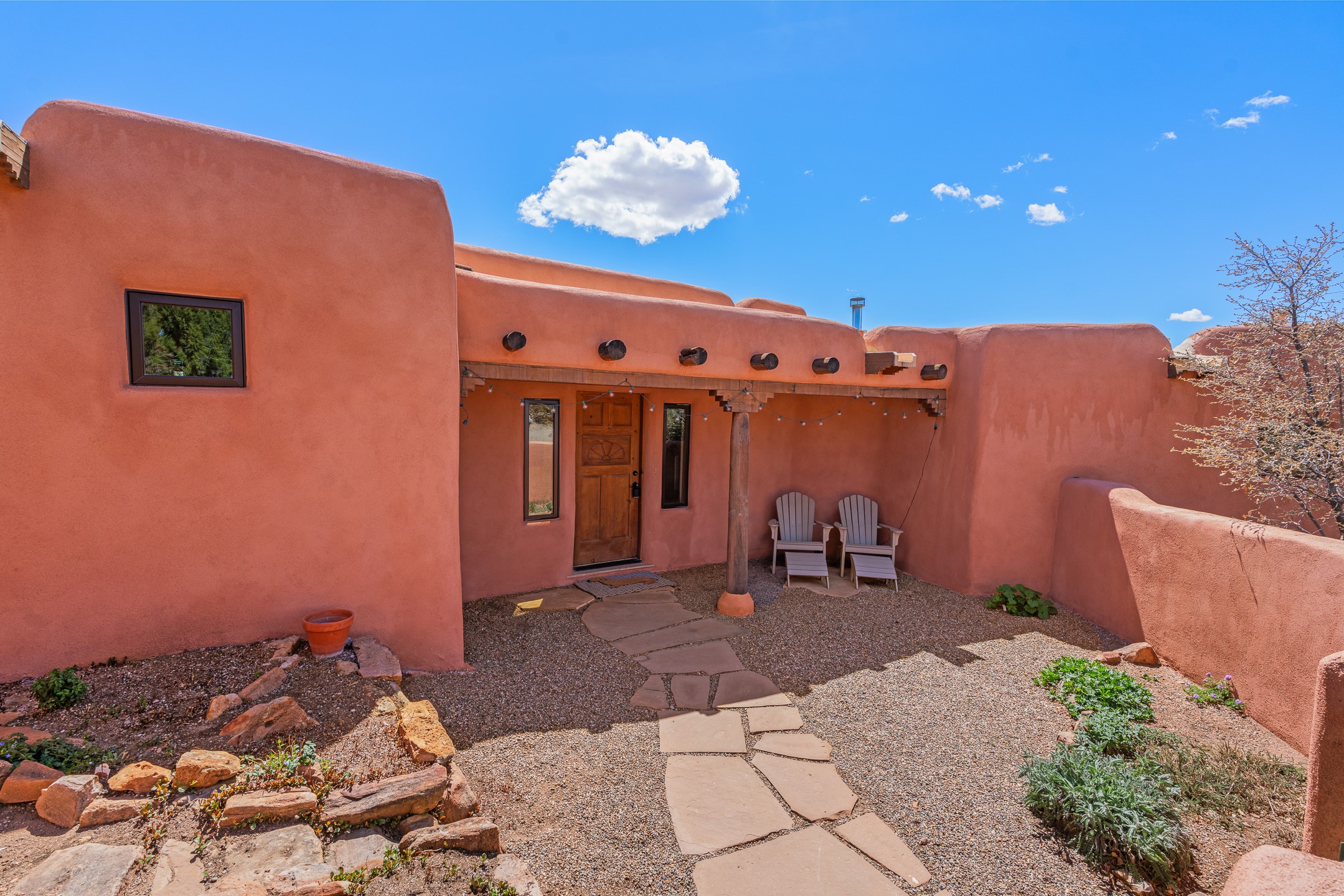 Welcome to this timeless adobe residence that beautifully captures the essence of classic Southwestern charm. From the moment you enter the walled front courtyard, you're greeted by lush gardens and a sense of privacy that sets the tone for this inviting home. Inside, rich architectural details abound, smooth plaster walls, warm Saltillo tile floors, and exposed vigas create an authentic and cozy atmosphere throughout. The open-concept living, dining, and kitchen area is designed for both comfort and connection, featuring a charming plaster banco at the dining space that invites long, relaxed gatherings. A traditional kiva fireplace anchors the living room, flanked by additional banco seating, perfect for quiet evenings or entertaining. The thoughtfully designed floor plan offers excellent separation of space. The primary suite is tucked just off the living area, with direct access to the backyard, creating a peaceful retreat. The ensuite bath features double sinks, a separate soaking tub, and a walk-in shower. Guest bedrooms are privately situated on the opposite side of the home, with a well-appointed guest bath in between. Function meets convenience with a dedicated laundry room complete with shelving and a countertop for folding. Even the two-car garage reflects the home's character, showcasing exposed adobe walls. Step outside to a fully walled backyard designed for easy living and enjoyment. Low-maintenance landscaping, stone seating areas, a raised garden bed, and a covered portal provide multiple spaces to relax, dine, and take in the serene surroundings. This is a rare opportunity to own a home that seamlessly blends traditional craftsmanship with everyday comfort--an authentic Southwestern sanctuary in a truly special setting.