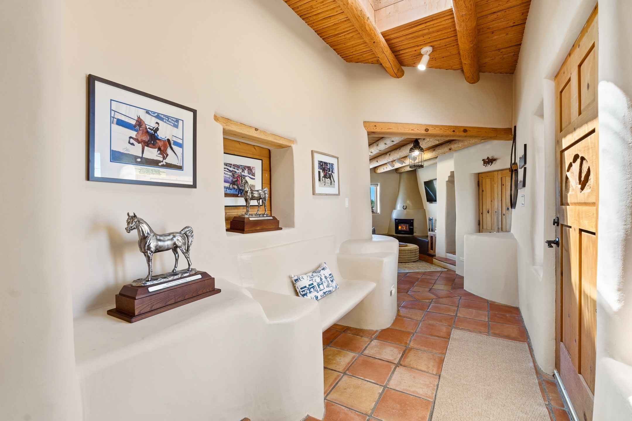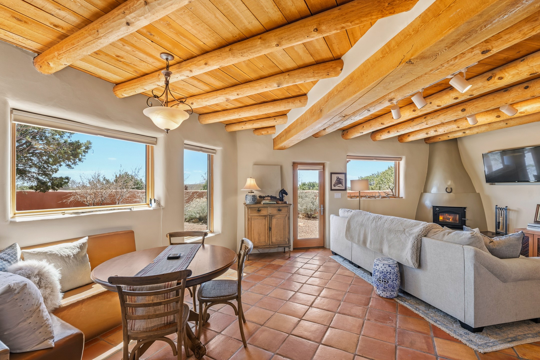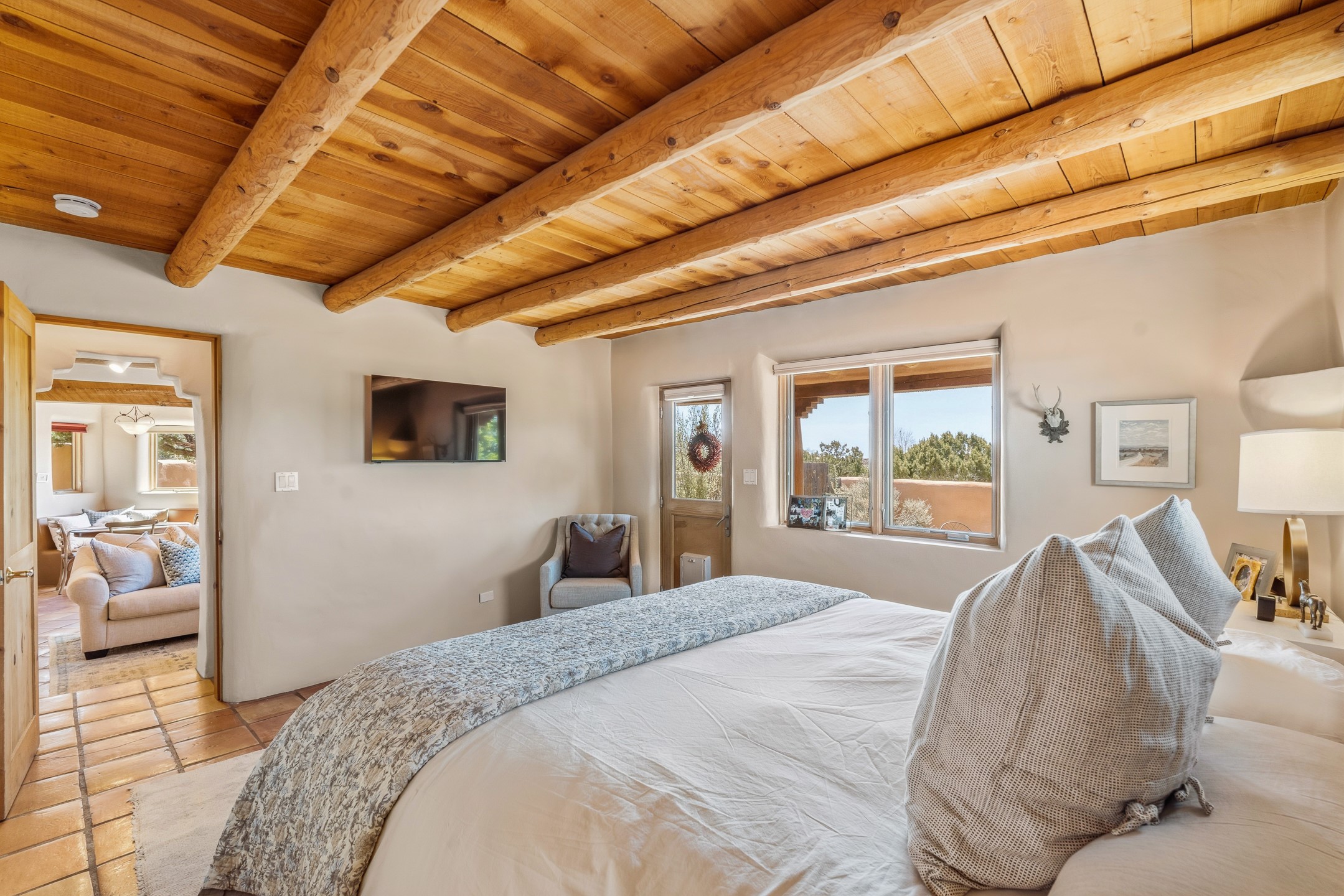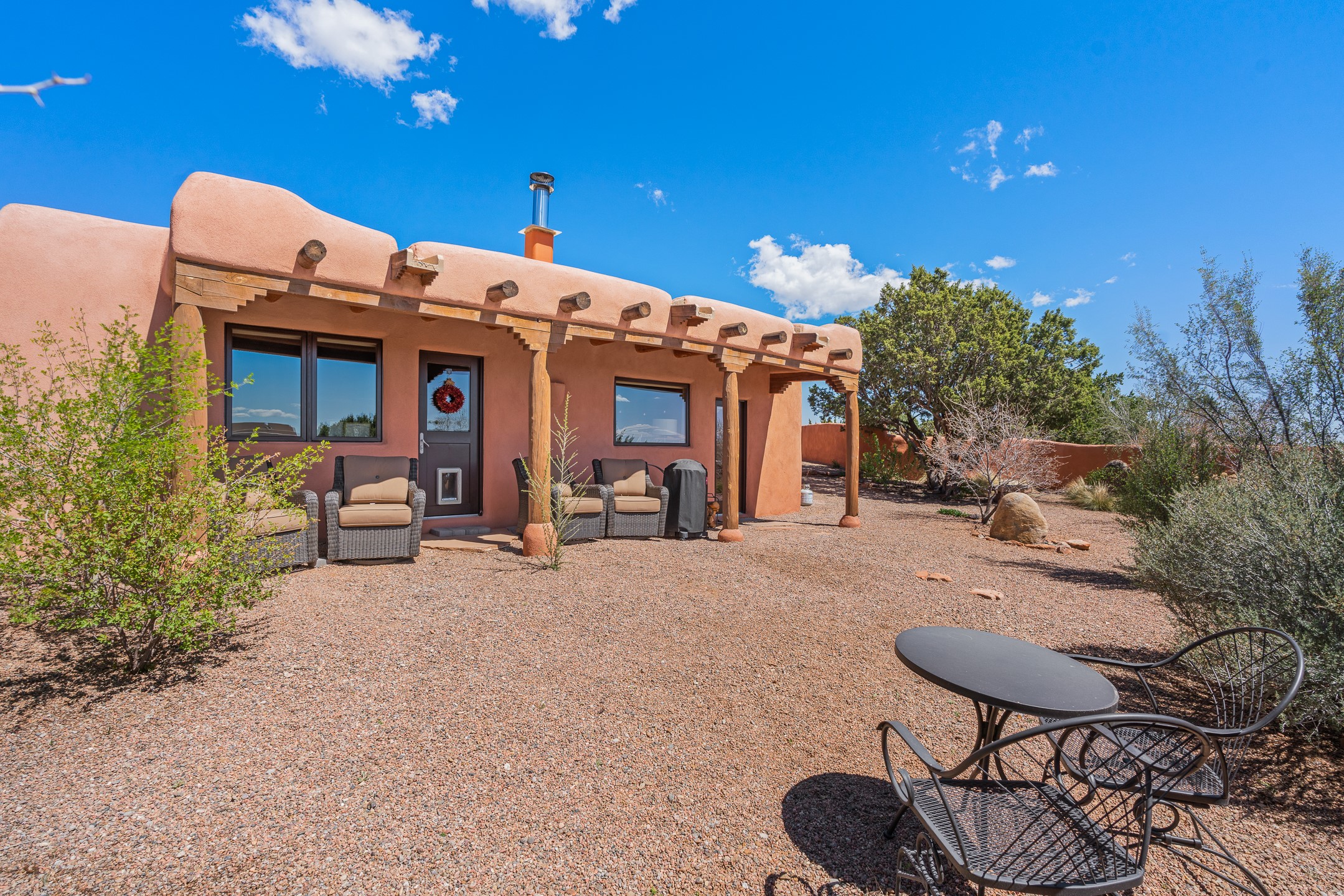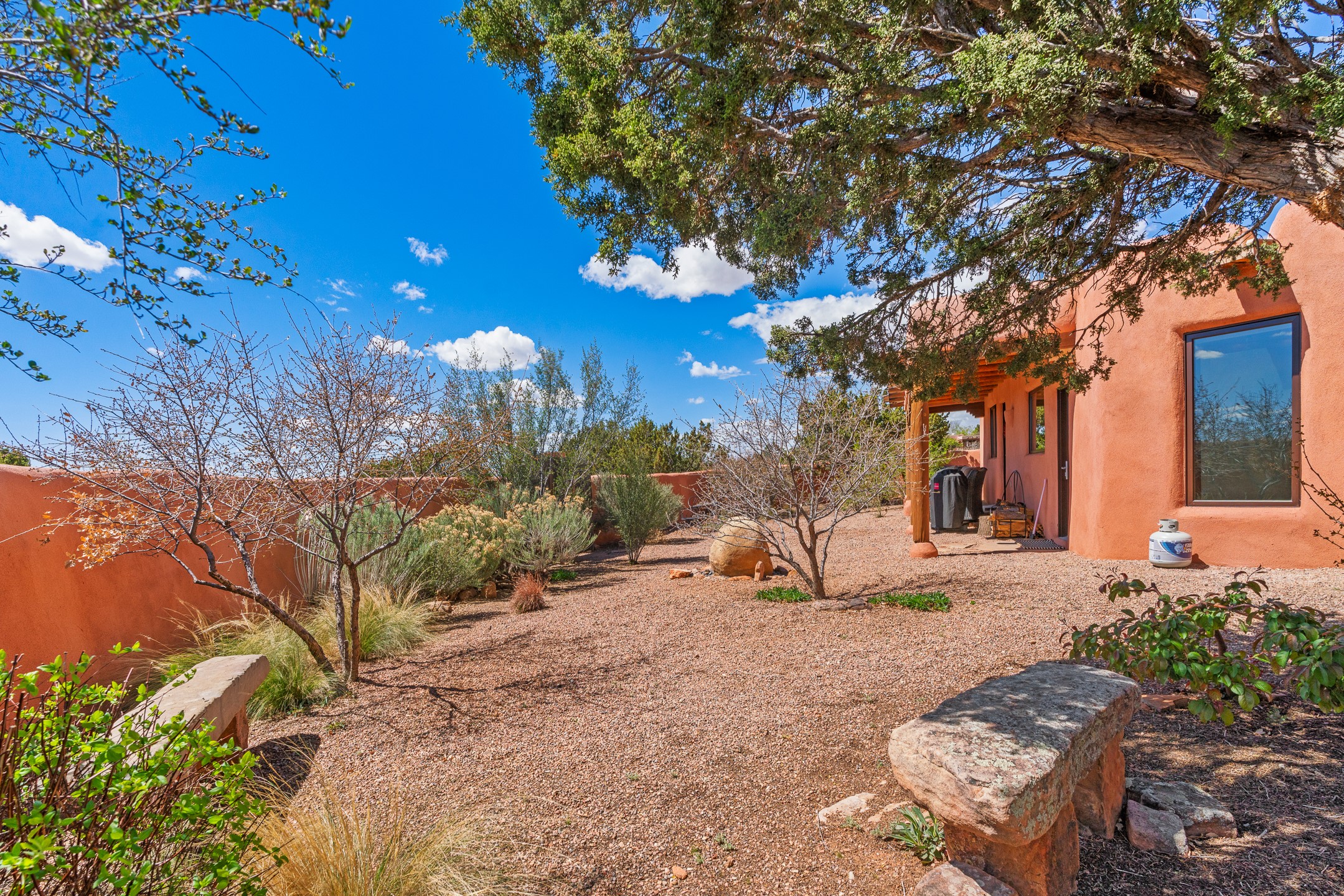 Welcome to this timeless adobe residence that beautifully captures the essence of classic Southwestern charm. From the moment you enter the walled front courtyard, you're greeted by lush gardens and a sense of privacy that sets the tone for this inviting home. Inside, rich architectural details abound, smooth plaster walls, warm Saltillo tile floors, and exposed vigas create an authentic and cozy atmosphere throughout. The open-concept living, dining, and kitchen area is designed for both comfort and connection, featuring a charming plaster banco at the dining space that invites long, relaxed gatherings. A traditional kiva fireplace anchors the living room, flanked by additional banco seating, perfect for quiet evenings or entertaining. The thoughtfully designed floor plan offers excellent separation of space. The primary suite is tucked just off the living area, with direct access to the backyard, creating a peaceful retreat. The ensuite bath features double sinks, a separate soaking tub, and a walk-in shower. Guest bedrooms are privately situated on the opposite side of the home, with a well-appointed guest bath in between. Function meets convenience with a dedicated laundry room complete with shelving and a countertop for folding. Even the two-car garage reflects the home's character, showcasing exposed adobe walls. Step outside to a fully walled backyard designed for easy living and enjoyment. Low-maintenance landscaping, stone seating areas, a raised garden bed, and a covered portal provide multiple spaces to relax, dine, and take in the serene surroundings. This is a rare opportunity to own a home that seamlessly blends traditional craftsmanship with everyday comfort--an authentic Southwestern sanctuary in a truly special setting.
