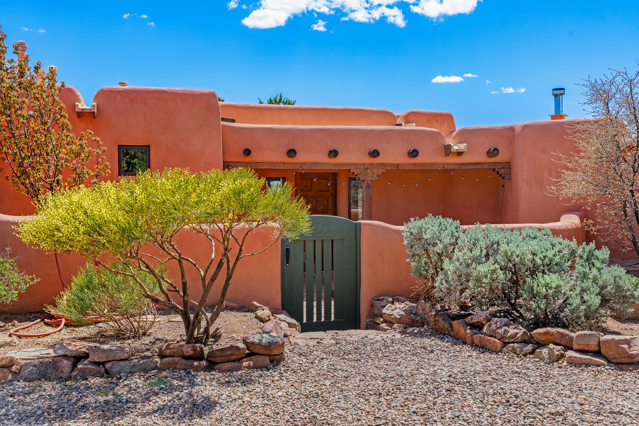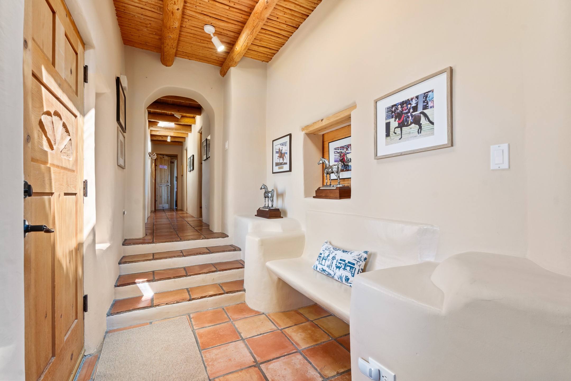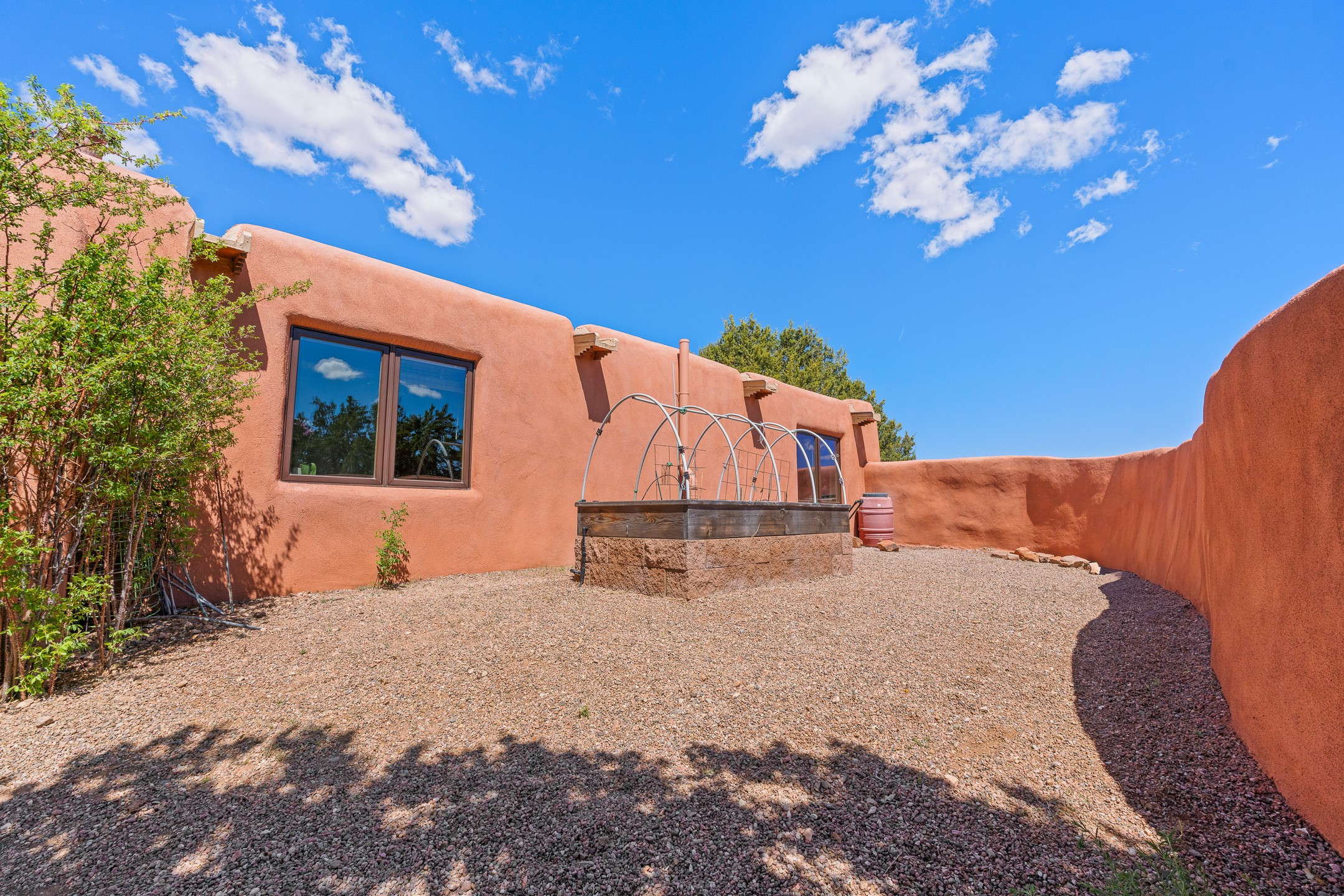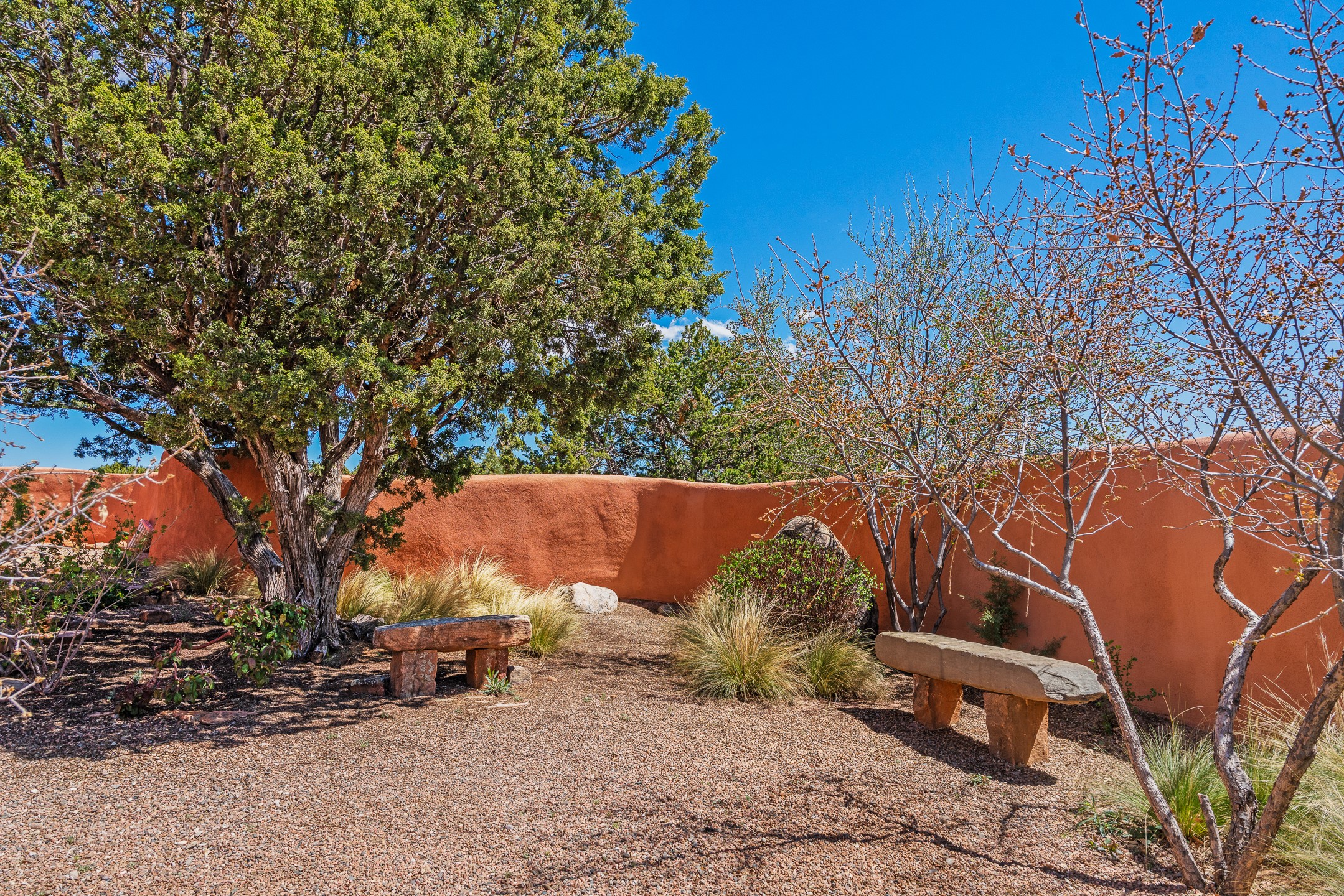 Welcome to this timeless adobe residence that beautifully captures the essence of classic Southwestern charm. From the moment you enter the walled front courtyard, you're greeted by lush gardens and a sense of privacy that sets the tone for this inviting home. Inside, rich architectural details abound, smooth plaster walls, warm Saltillo tile floors, and exposed vigas create an authentic and cozy atmosphere throughout. The open-concept living, dining, and kitchen area is designed for both comfort and connection, featuring a charming plaster banco at the dining space that invites long, relaxed gatherings. A traditional kiva fireplace anchors the living room, flanked by additional banco seating, perfect for quiet evenings or entertaining. The thoughtfully designed floor plan offers excellent separation of space. The primary suite is tucked just off the living area, with direct access to the backyard, creating a peaceful retreat. The ensuite bath features double sinks, a separate soaking tub, and a walk-in shower. Guest bedrooms are privately situated on the opposite side of the home, with a well-appointed guest bath in between. Function meets convenience with a dedicated laundry room complete with shelving and a countertop for folding. Even the two-car garage reflects the home's character, showcasing exposed adobe walls. Step outside to a fully walled backyard designed for easy living and enjoyment. Low-maintenance landscaping, stone seating areas, a raised garden bed, and a covered portal provide multiple spaces to relax, dine, and take in the serene surroundings. This is a rare opportunity to own a home that seamlessly blends traditional craftsmanship with everyday comfort--an authentic Southwestern sanctuary in a truly special setting.