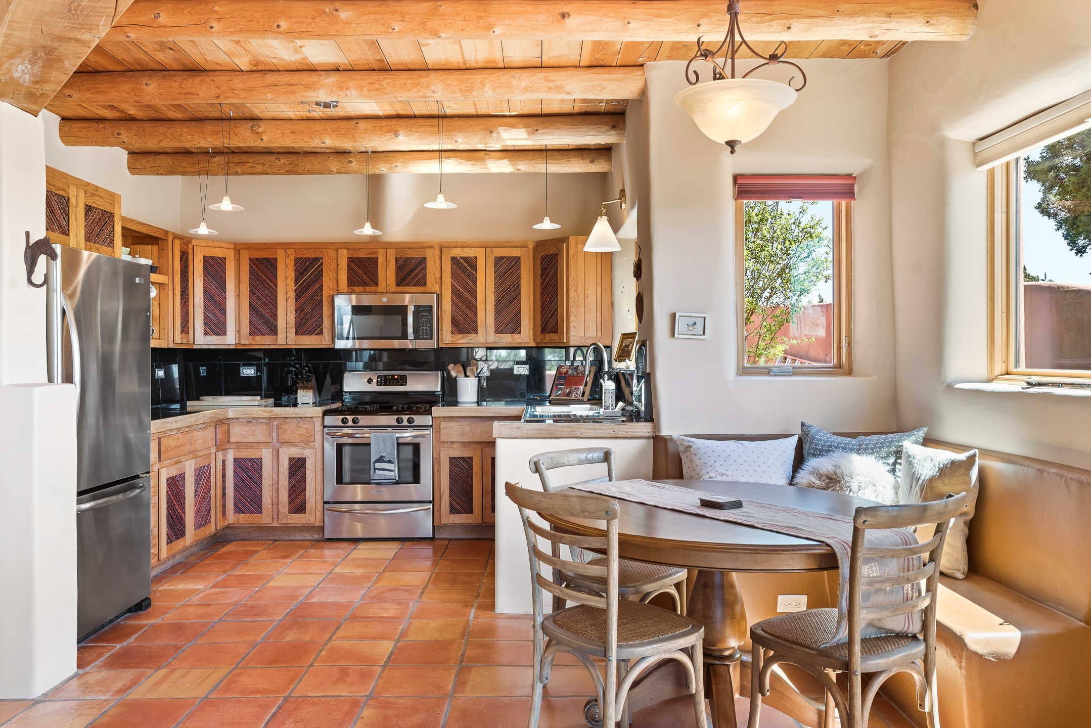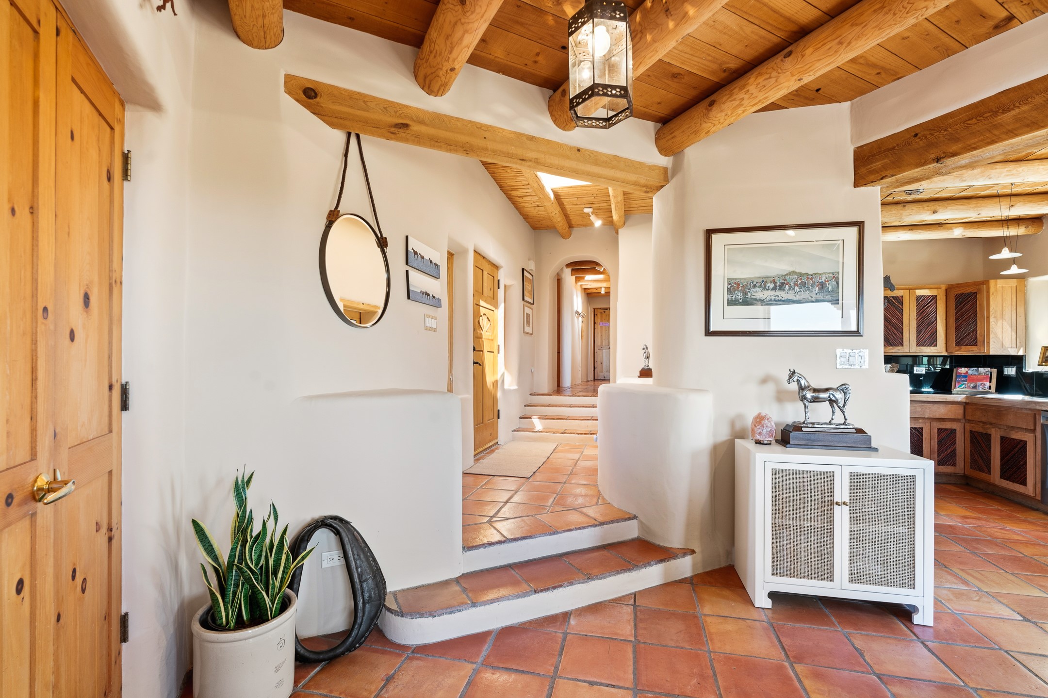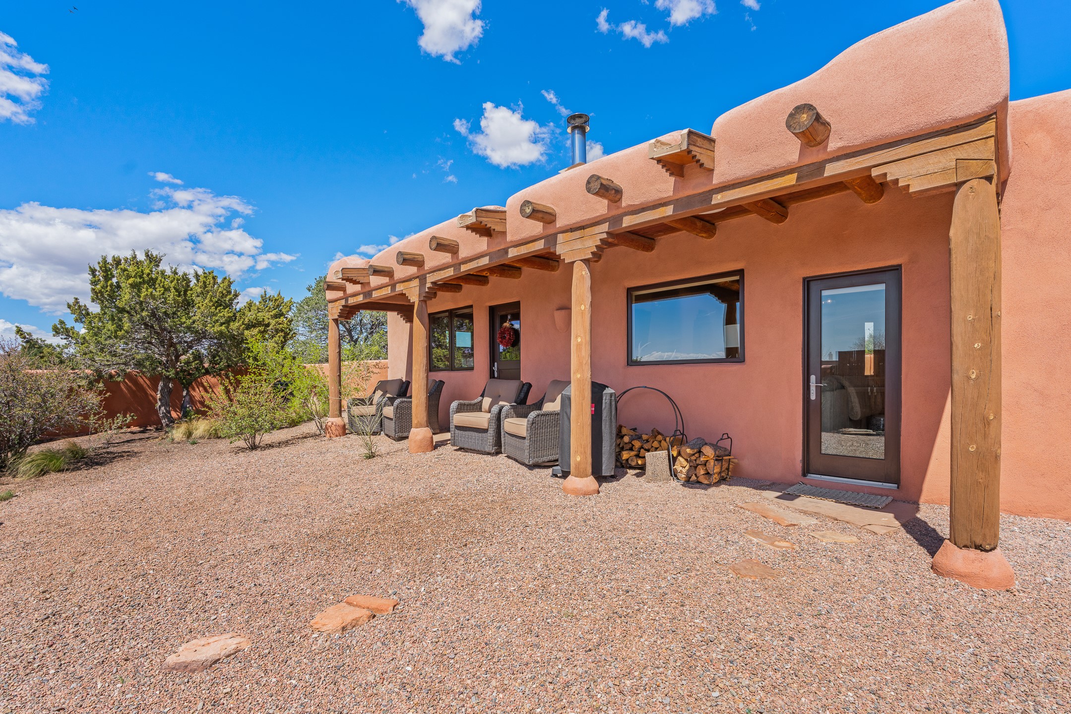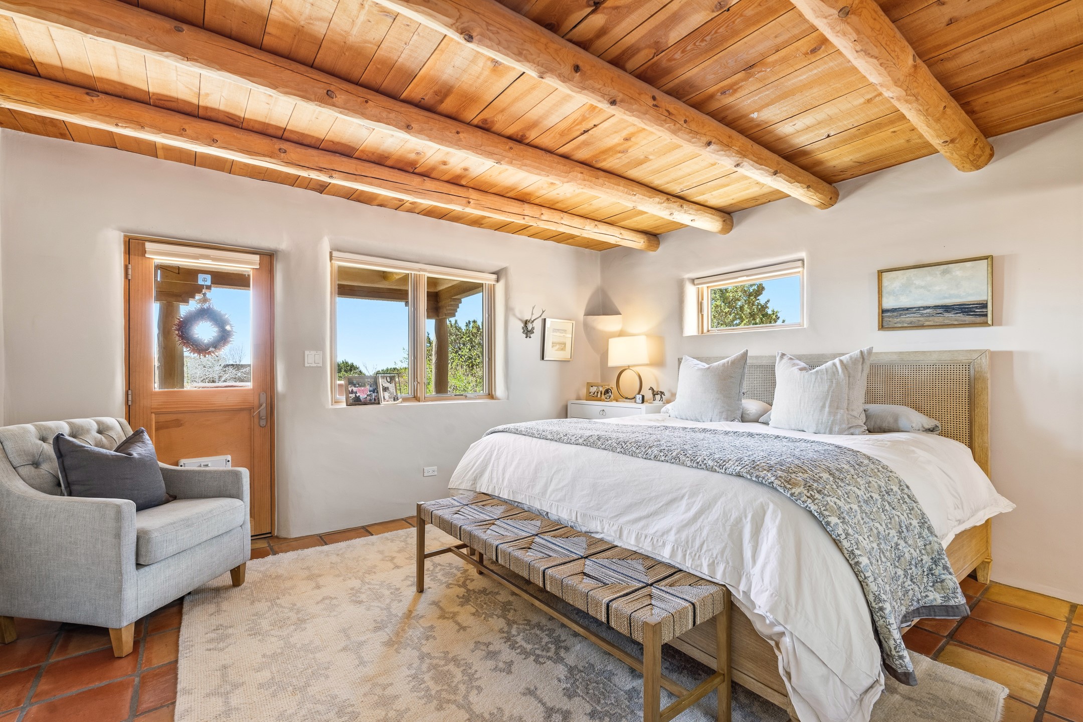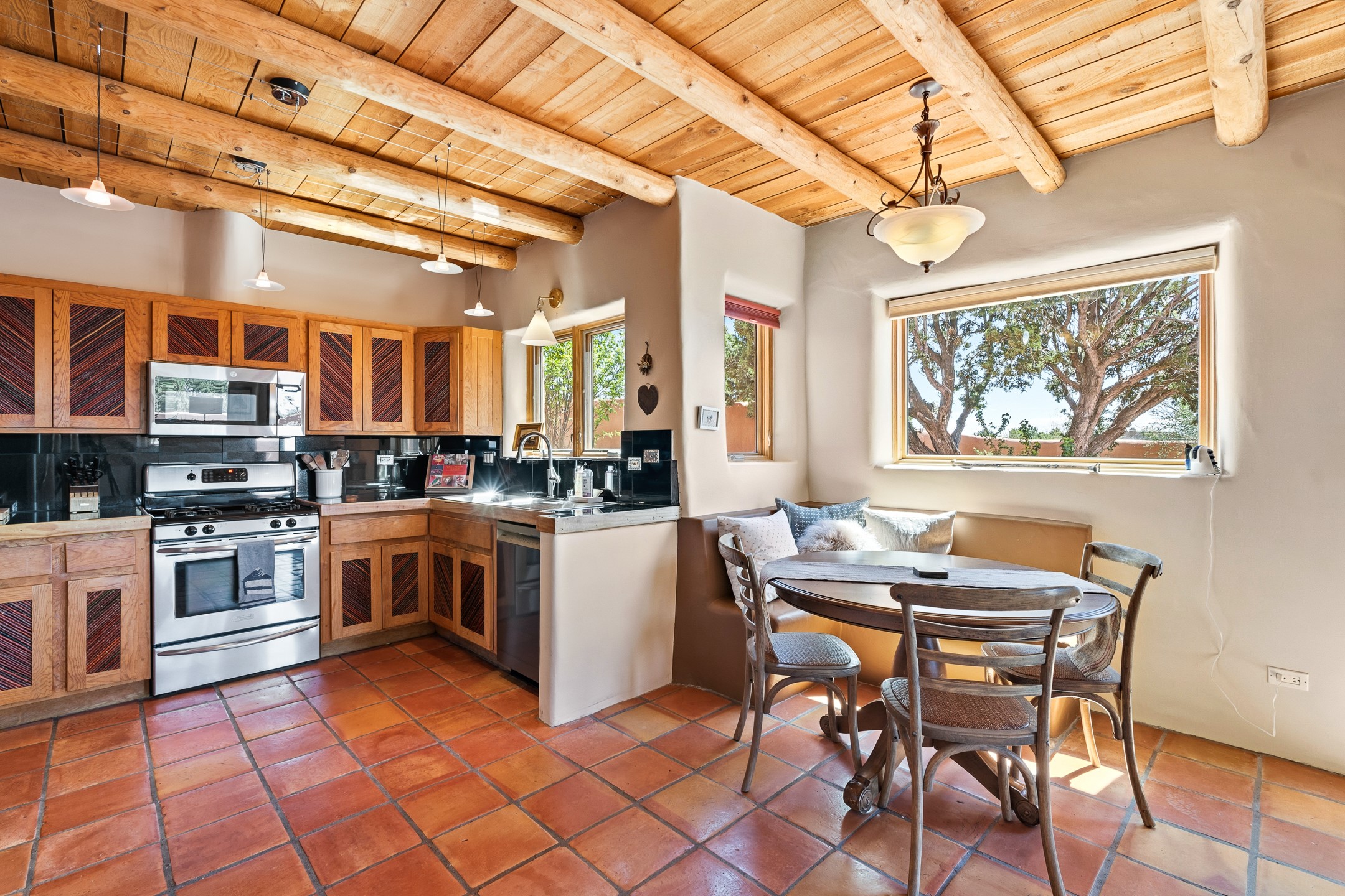 Welcome to this timeless adobe residence that beautifully captures the essence of classic Southwestern charm. From the moment you enter the walled front courtyard, you're greeted by lush gardens and a sense of privacy that sets the tone for this inviting home. Inside, rich architectural details abound, smooth plaster walls, warm Saltillo tile floors, and exposed vigas create an authentic and cozy atmosphere throughout. The open-concept living, dining, and kitchen area is designed for both comfort and connection, featuring a charming plaster banco at the dining space that invites long, relaxed gatherings. A traditional kiva fireplace anchors the living room, flanked by additional banco seating, perfect for quiet evenings or entertaining. The thoughtfully designed floor plan offers excellent separation of space. The primary suite is tucked just off the living area, with direct access to the backyard, creating a peaceful retreat. The ensuite bath features double sinks, a separate soaking tub, and a walk-in shower. Guest bedrooms are privately situated on the opposite side of the home, with a well-appointed guest bath in between. Function meets convenience with a dedicated laundry room complete with shelving and a countertop for folding. Even the two-car garage reflects the home's character, showcasing exposed adobe walls. Step outside to a fully walled backyard designed for easy living and enjoyment. Low-maintenance landscaping, stone seating areas, a raised garden bed, and a covered portal provide multiple spaces to relax, dine, and take in the serene surroundings. This is a rare opportunity to own a home that seamlessly blends traditional craftsmanship with everyday comfort--an authentic Southwestern sanctuary in a truly special setting.