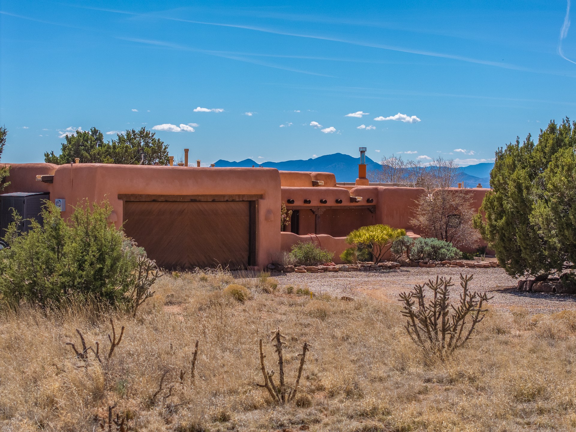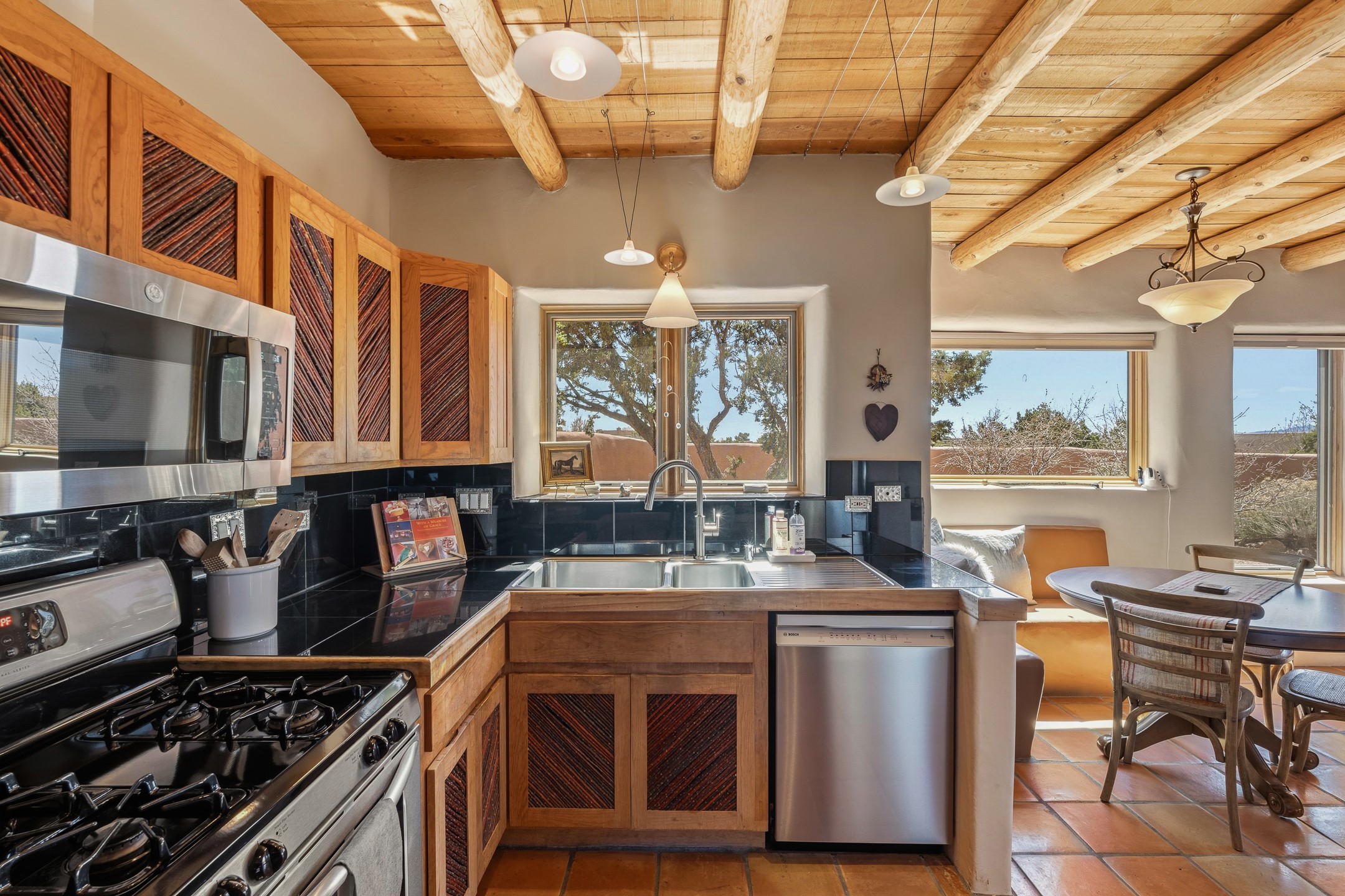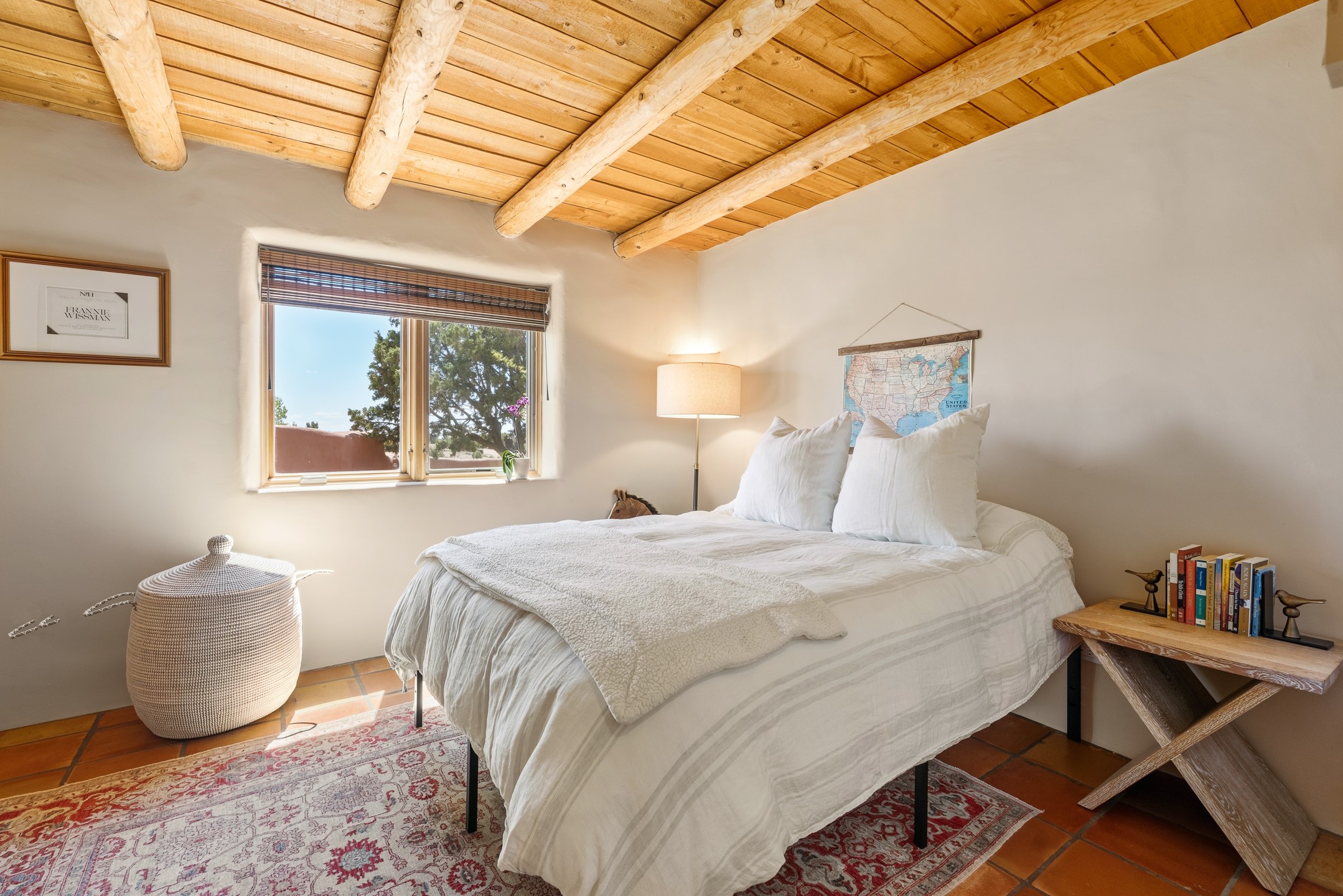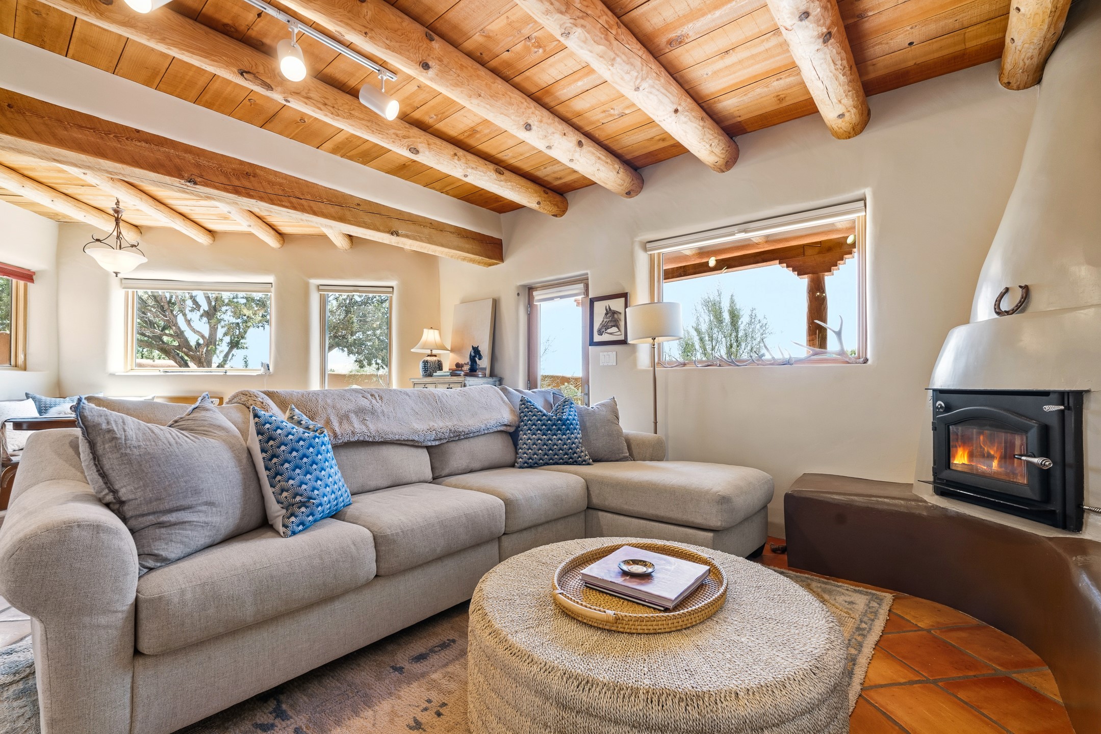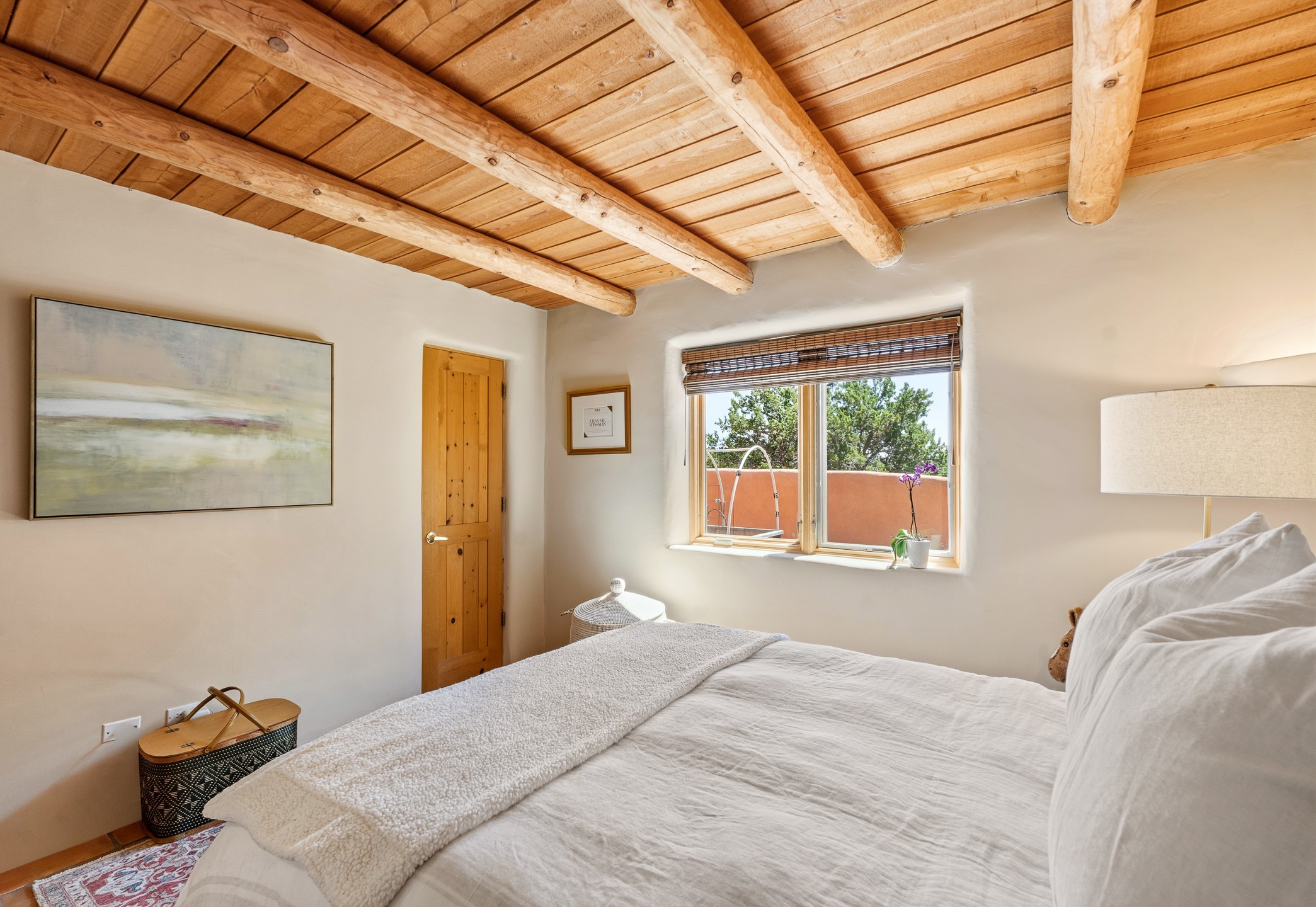 Welcome to this timeless adobe residence that beautifully captures the essence of classic Southwestern charm. From the moment you enter the walled front courtyard, you're greeted by lush gardens and a sense of privacy that sets the tone for this inviting home. Inside, rich architectural details abound, smooth plaster walls, warm Saltillo tile floors, and exposed vigas create an authentic and cozy atmosphere throughout. The open-concept living, dining, and kitchen area is designed for both comfort and connection, featuring a charming plaster banco at the dining space that invites long, relaxed gatherings. A traditional kiva fireplace anchors the living room, flanked by additional banco seating, perfect for quiet evenings or entertaining. The thoughtfully designed floor plan offers excellent separation of space. The primary suite is tucked just off the living area, with direct access to the backyard, creating a peaceful retreat. The ensuite bath features double sinks, a separate soaking tub, and a walk-in shower. Guest bedrooms are privately situated on the opposite side of the home, with a well-appointed guest bath in between. Function meets convenience with a dedicated laundry room complete with shelving and a countertop for folding. Even the two-car garage reflects the home's character, showcasing exposed adobe walls. Step outside to a fully walled backyard designed for easy living and enjoyment. Low-maintenance landscaping, stone seating areas, a raised garden bed, and a covered portal provide multiple spaces to relax, dine, and take in the serene surroundings. This is a rare opportunity to own a home that seamlessly blends traditional craftsmanship with everyday comfort--an authentic Southwestern sanctuary in a truly special setting.