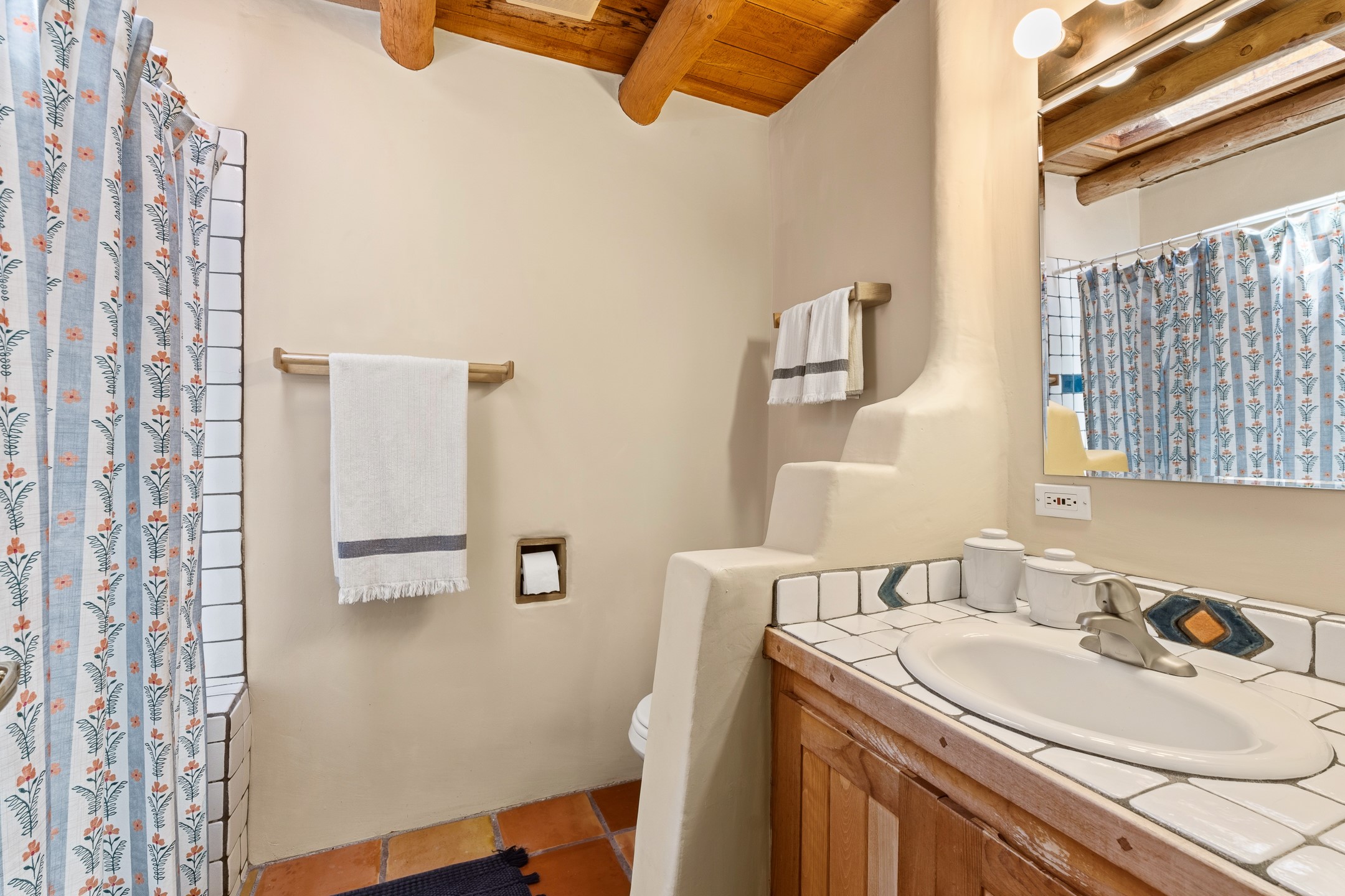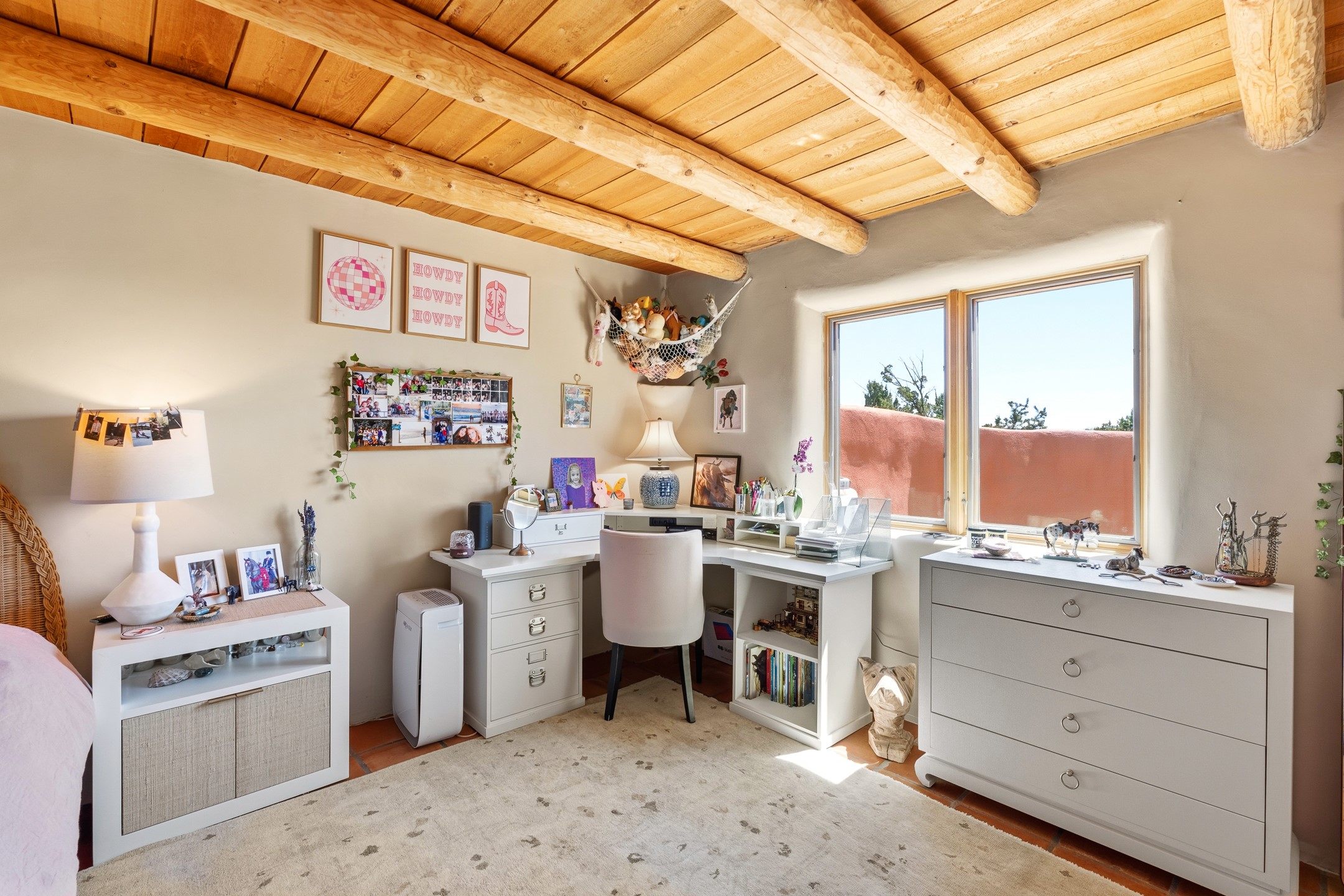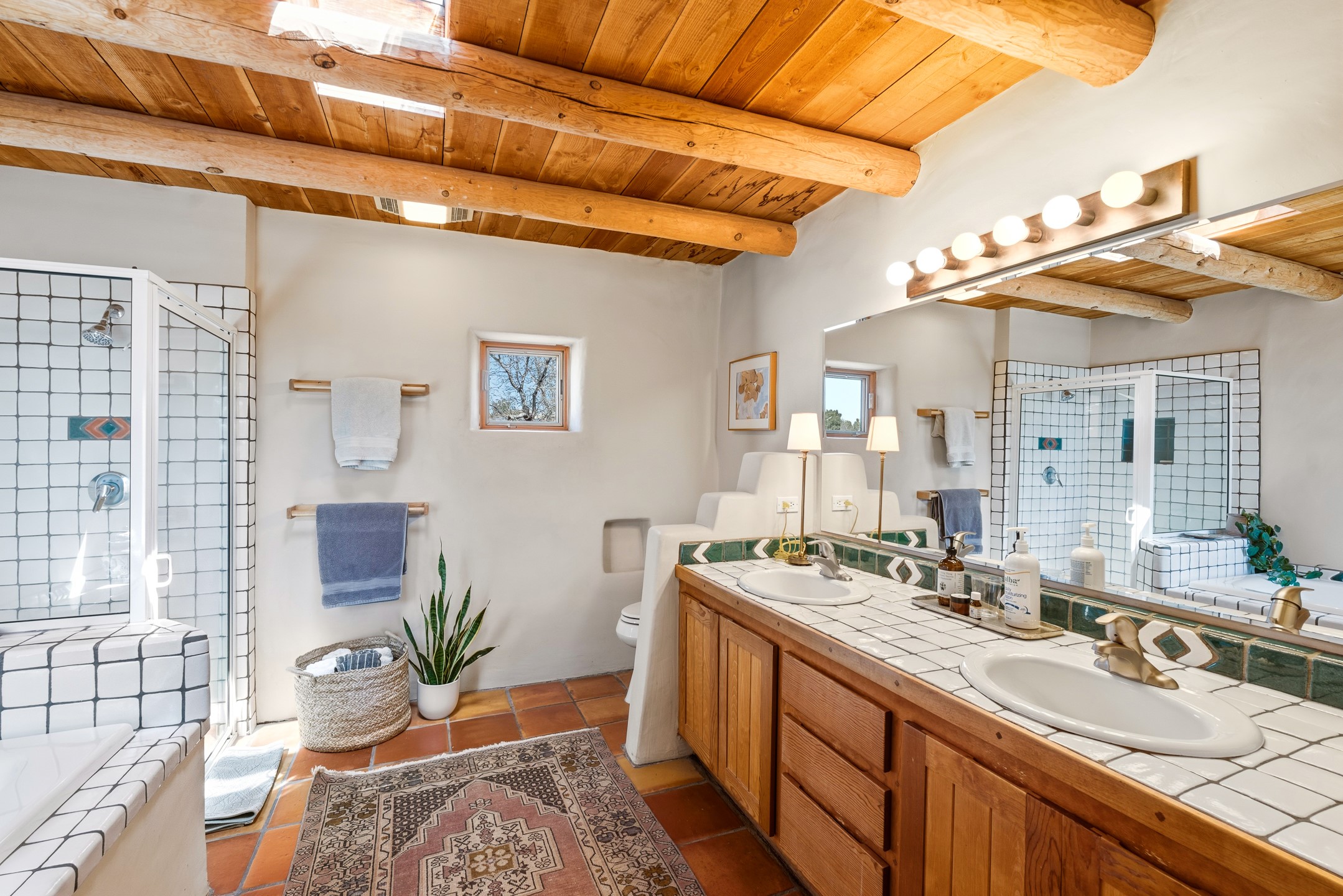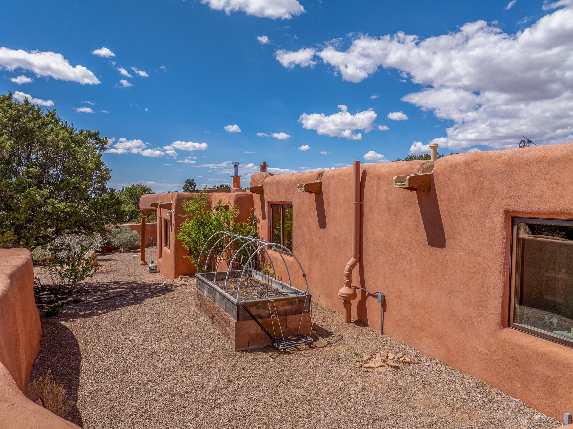 Welcome to this timeless adobe residence that beautifully captures the essence of classic Southwestern charm. From the moment you enter the walled front courtyard, you're greeted by lush gardens and a sense of privacy that sets the tone for this inviting home. Inside, rich architectural details abound, smooth plaster walls, warm Saltillo tile floors, and exposed vigas create an authentic and cozy atmosphere throughout. The open-concept living, dining, and kitchen area is designed for both comfort and connection, featuring a charming plaster banco at the dining space that invites long, relaxed gatherings. A traditional kiva fireplace anchors the living room, flanked by additional banco seating, perfect for quiet evenings or entertaining. The thoughtfully designed floor plan offers excellent separation of space. The primary suite is tucked just off the living area, with direct access to the backyard, creating a peaceful retreat. The ensuite bath features double sinks, a separate soaking tub, and a walk-in shower. Guest bedrooms are privately situated on the opposite side of the home, with a well-appointed guest bath in between. Function meets convenience with a dedicated laundry room complete with shelving and a countertop for folding. Even the two-car garage reflects the home's character, showcasing exposed adobe walls. Step outside to a fully walled backyard designed for easy living and enjoyment. Low-maintenance landscaping, stone seating areas, a raised garden bed, and a covered portal provide multiple spaces to relax, dine, and take in the serene surroundings. This is a rare opportunity to own a home that seamlessly blends traditional craftsmanship with everyday comfort--an authentic Southwestern sanctuary in a truly special setting.