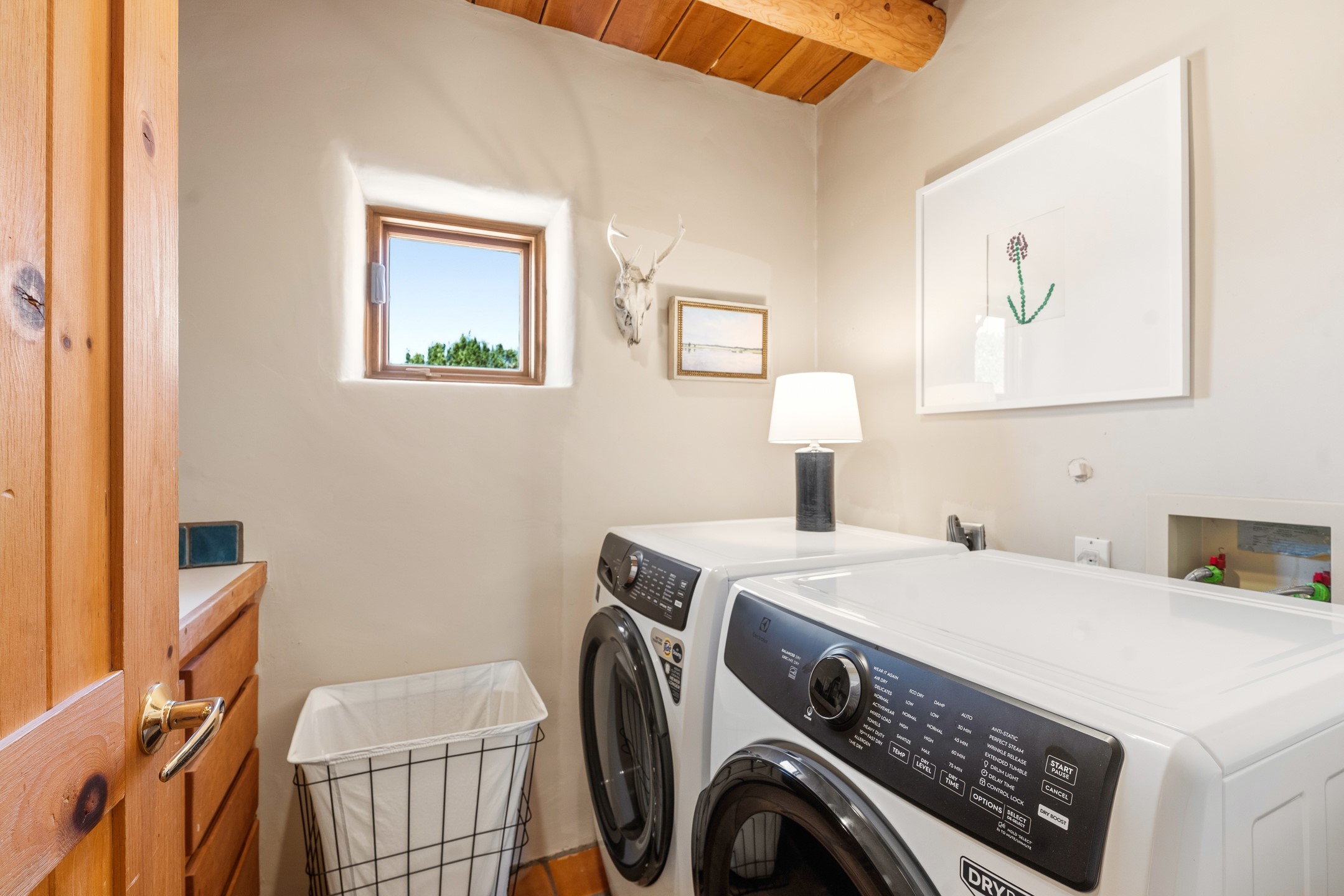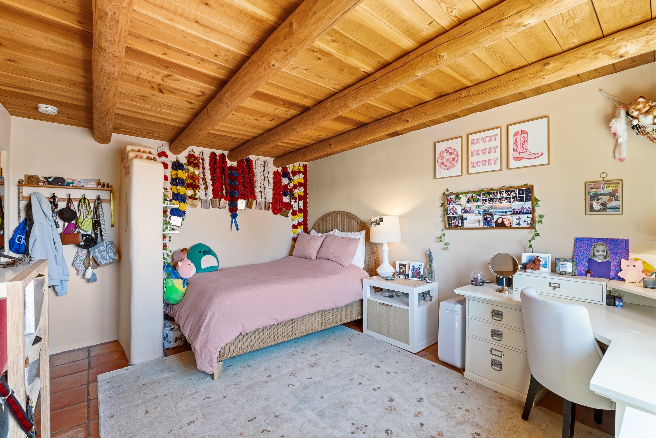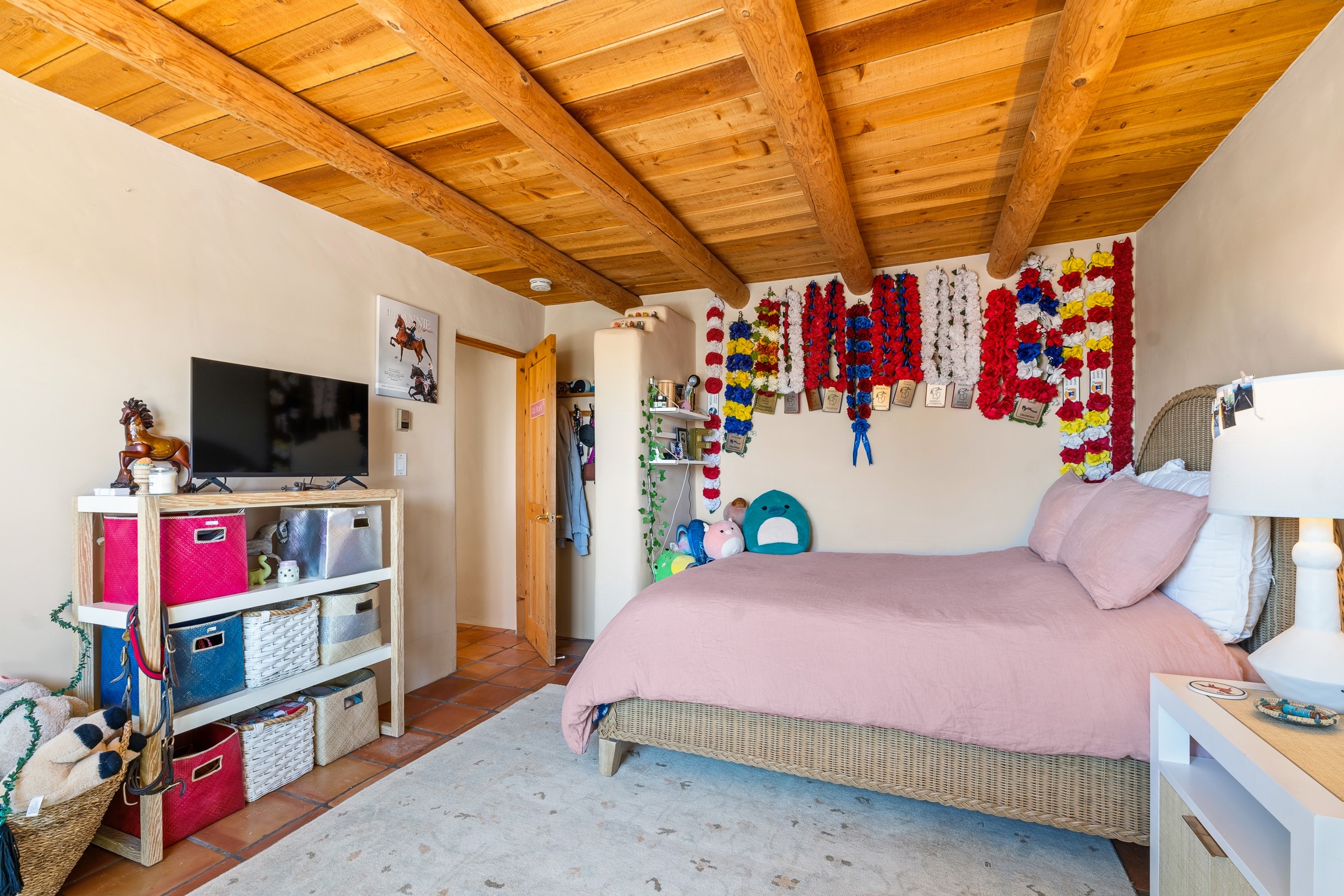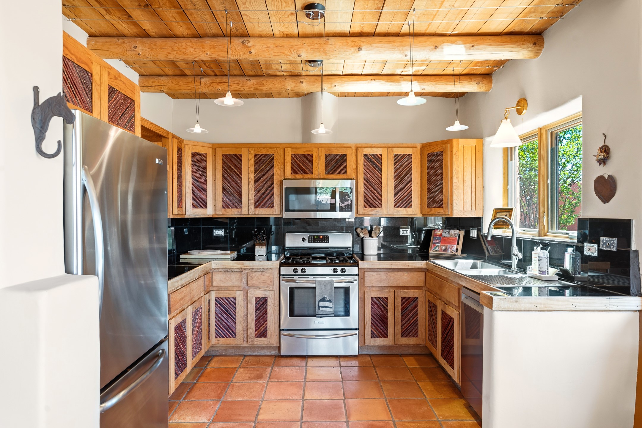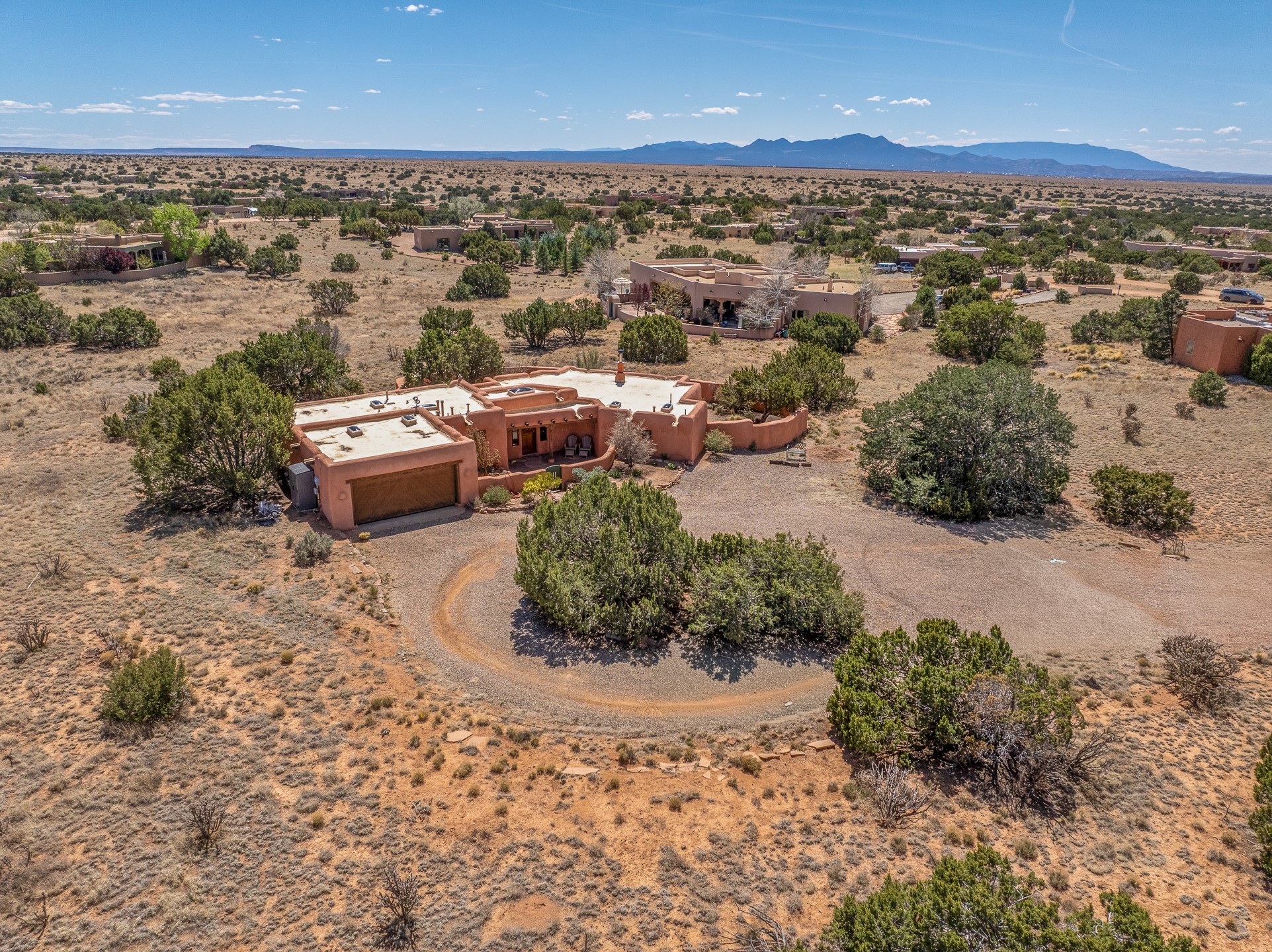 Welcome to this timeless adobe residence that beautifully captures the essence of classic Southwestern charm. From the moment you enter the walled front courtyard, you're greeted by lush gardens and a sense of privacy that sets the tone for this inviting home. Inside, rich architectural details abound, smooth plaster walls, warm Saltillo tile floors, and exposed vigas create an authentic and cozy atmosphere throughout. The open-concept living, dining, and kitchen area is designed for both comfort and connection, featuring a charming plaster banco at the dining space that invites long, relaxed gatherings. A traditional kiva fireplace anchors the living room, flanked by additional banco seating, perfect for quiet evenings or entertaining. The thoughtfully designed floor plan offers excellent separation of space. The primary suite is tucked just off the living area, with direct access to the backyard, creating a peaceful retreat. The ensuite bath features double sinks, a separate soaking tub, and a walk-in shower. Guest bedrooms are privately situated on the opposite side of the home, with a well-appointed guest bath in between. Function meets convenience with a dedicated laundry room complete with shelving and a countertop for folding. Even the two-car garage reflects the home's character, showcasing exposed adobe walls. Step outside to a fully walled backyard designed for easy living and enjoyment. Low-maintenance landscaping, stone seating areas, a raised garden bed, and a covered portal provide multiple spaces to relax, dine, and take in the serene surroundings. This is a rare opportunity to own a home that seamlessly blends traditional craftsmanship with everyday comfort--an authentic Southwestern sanctuary in a truly special setting.