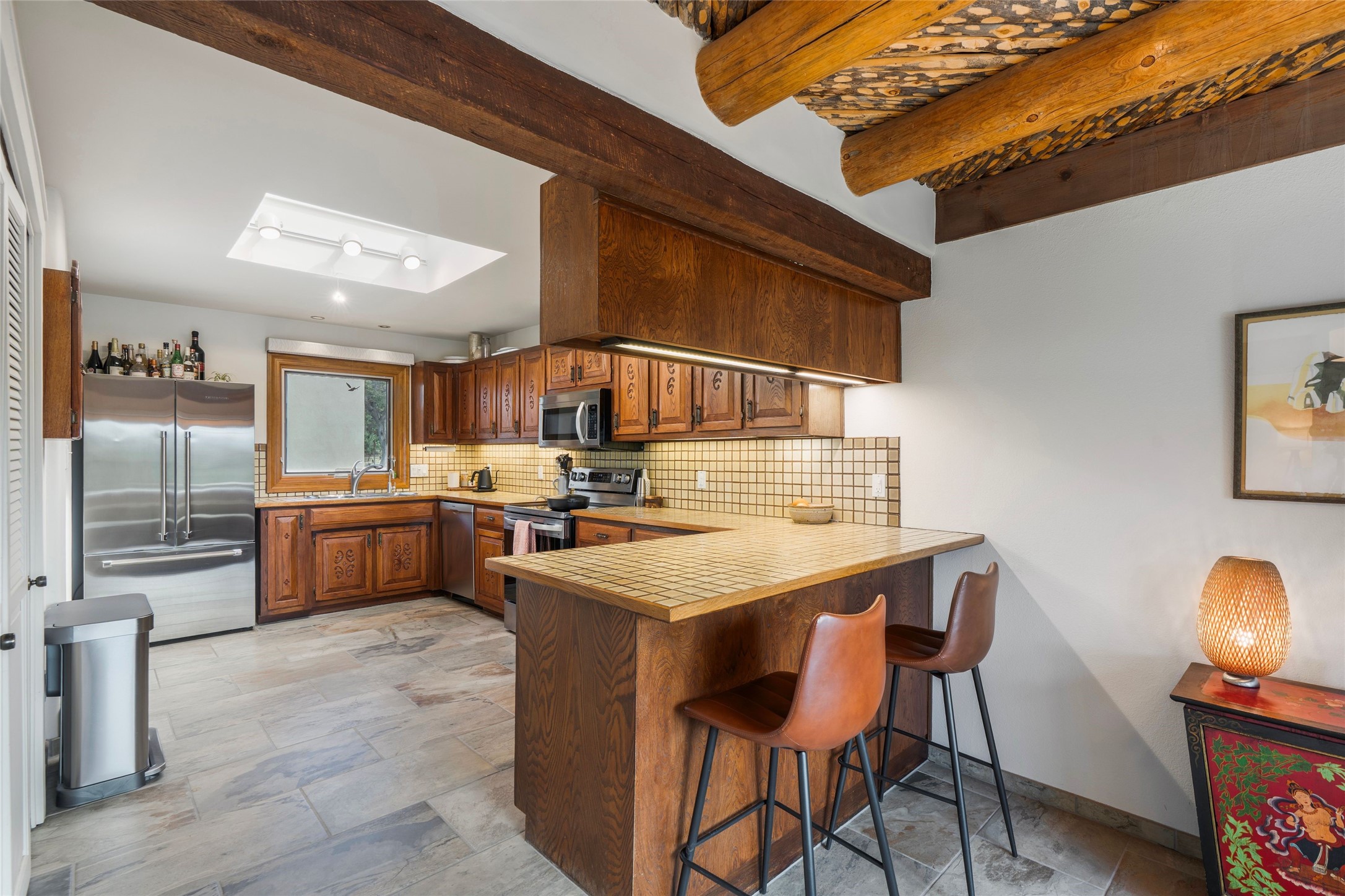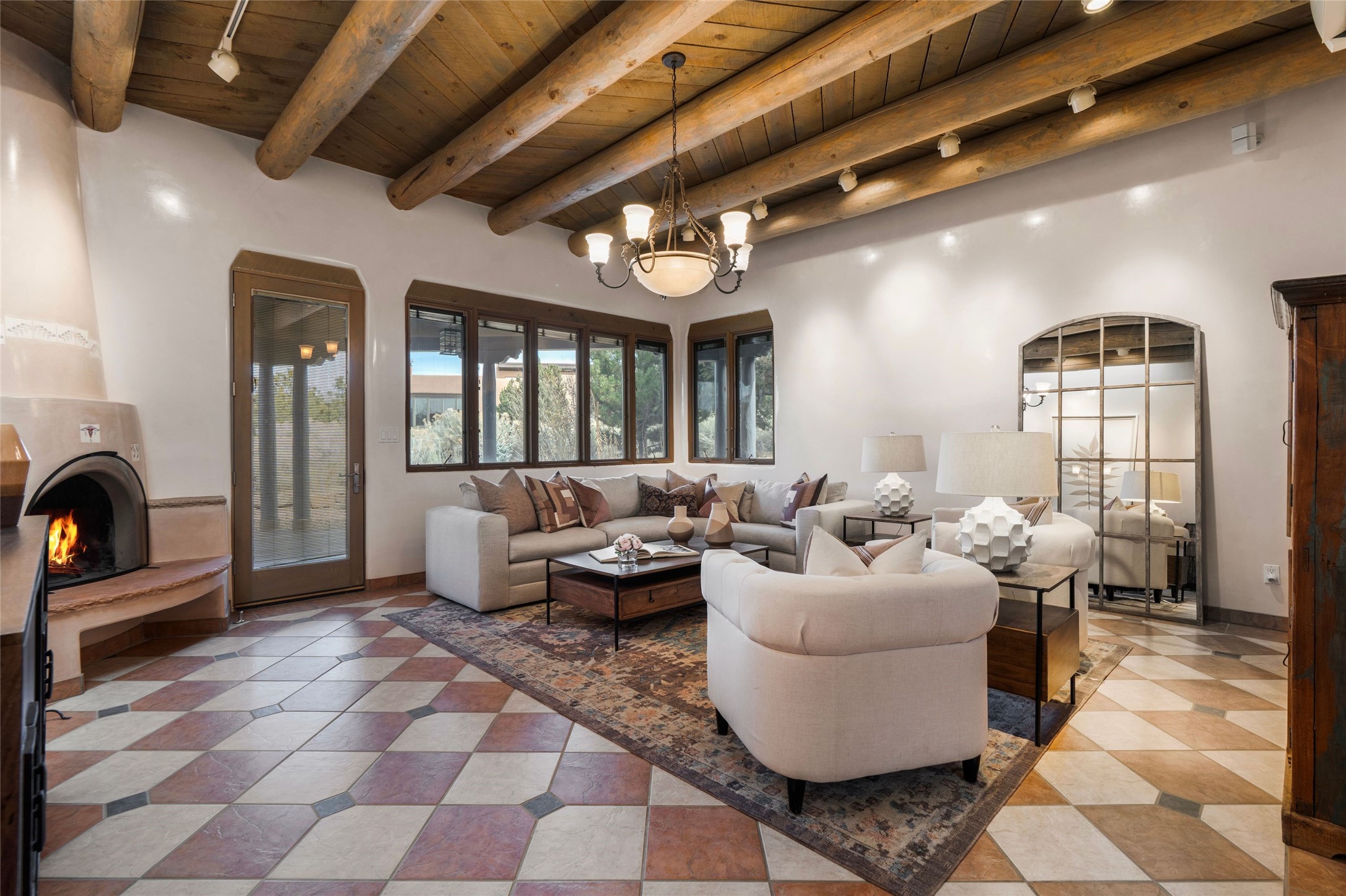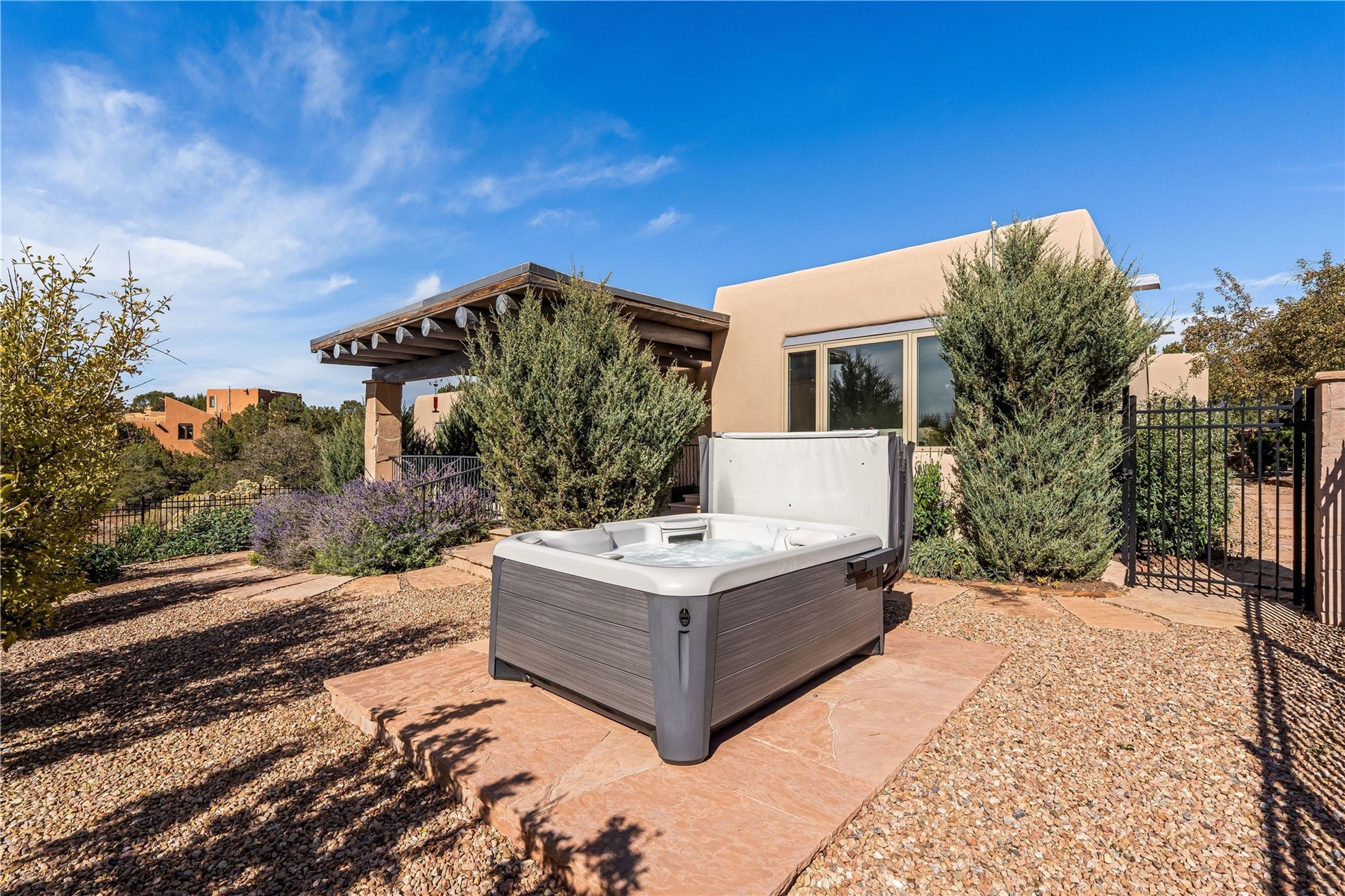 Hyde Park Road 4-bedroom, 2.5 bath Pueblo-style home on 1.08-acres with spectacular views of Sun and Moon Mountain. Iconic Santa Fe design with hand-troweled plaster walls, vigas and beams, nichos, tile and wood floors, and five kiva fireplaces. Flexible floor plan offers space for multi-generational living with separate wing with 2 bedrooms or 1 bedroom plus sitting area, bathroom and a second kitchen. Primary wing offers a spacious living room, dining room, kitchen and informal dining area, 2- bedrooms and ensuite bath. Expansive portals wrap around the home, providing multiple areas for al fresco dining and entertaining. Bonus feature is an above ground heated spa/hot tub for soaking under the magical New Mexican skies. 2-car attached garage. Superbly located close to the Santa Fe Plaza, Dale Ball Trails, Ten Thousand Waves and the Santa Fe Ski Basin.
