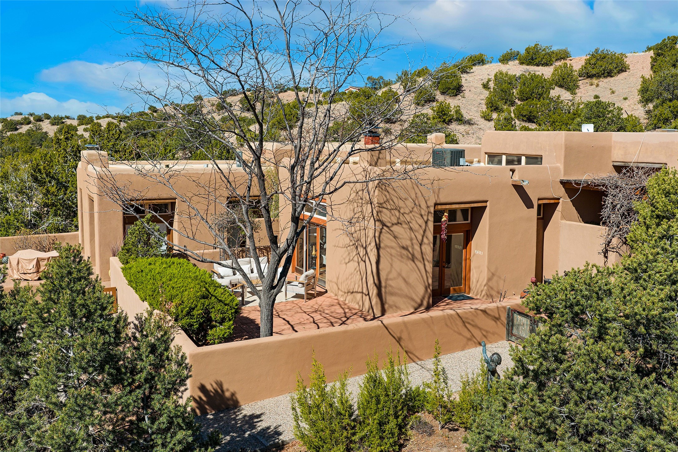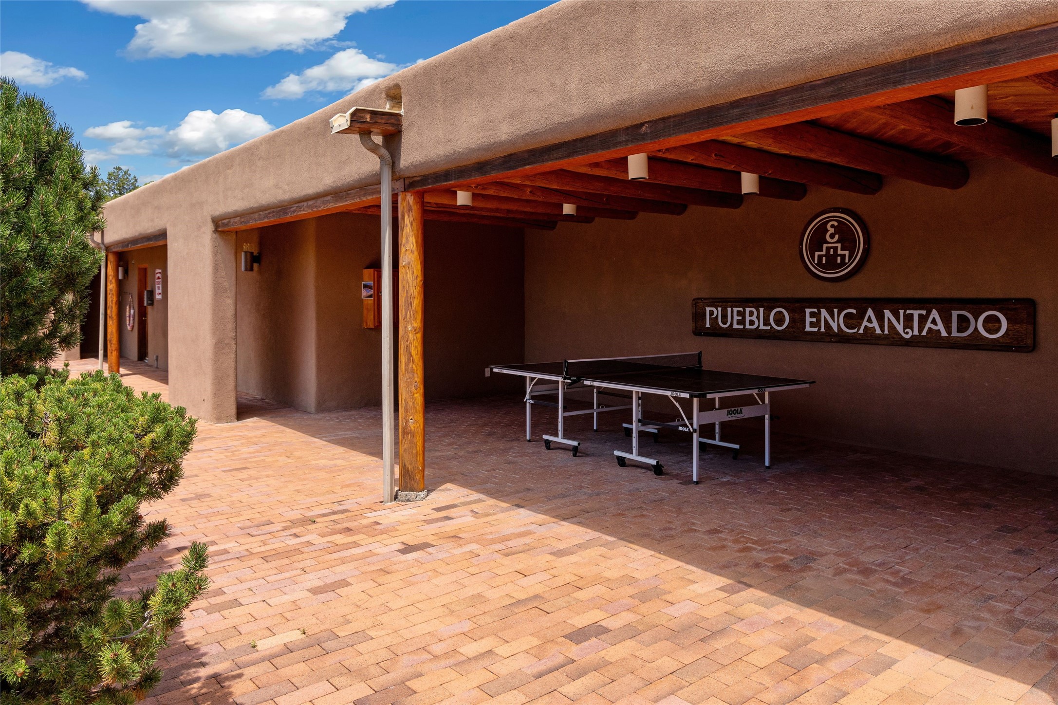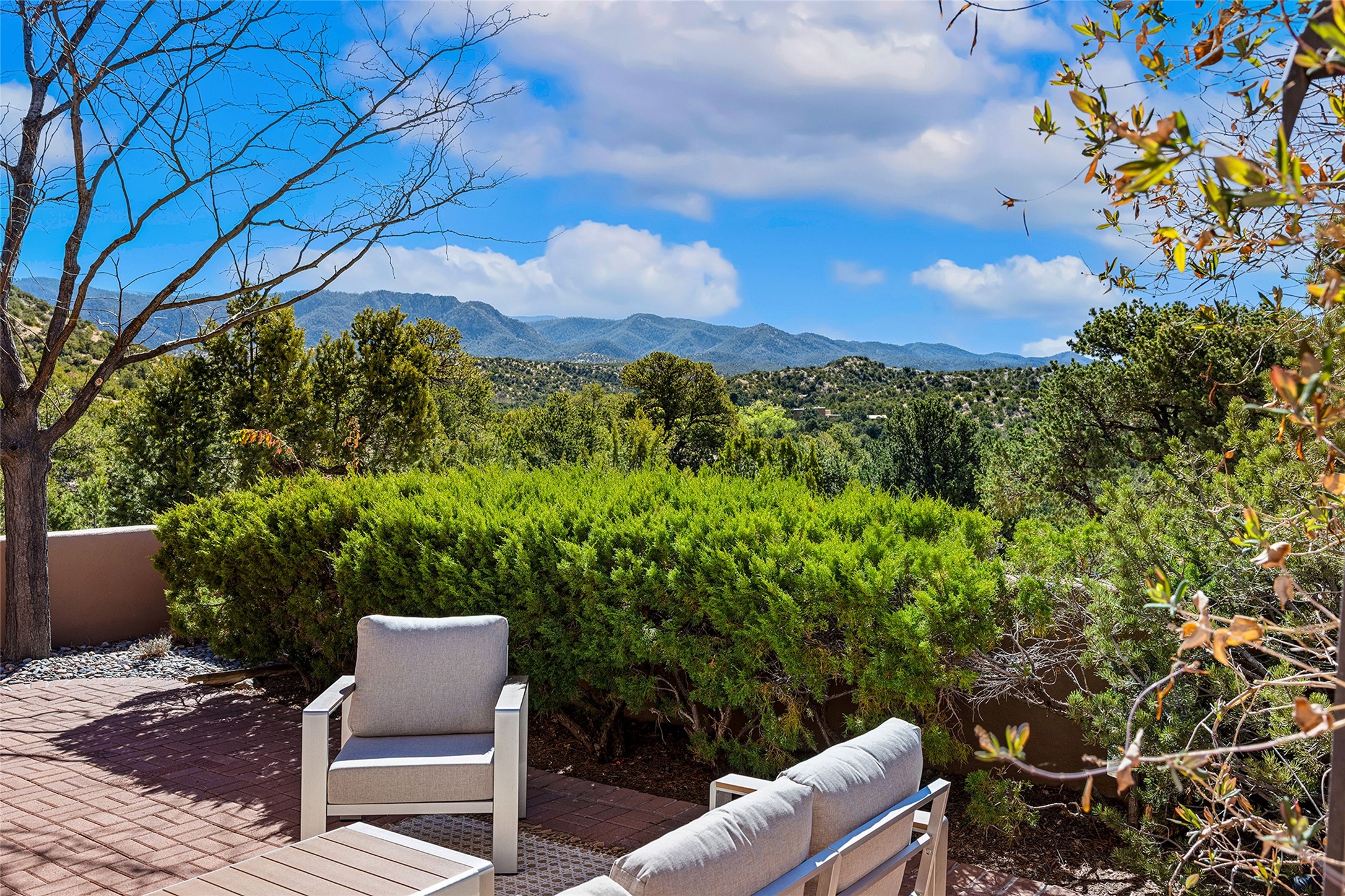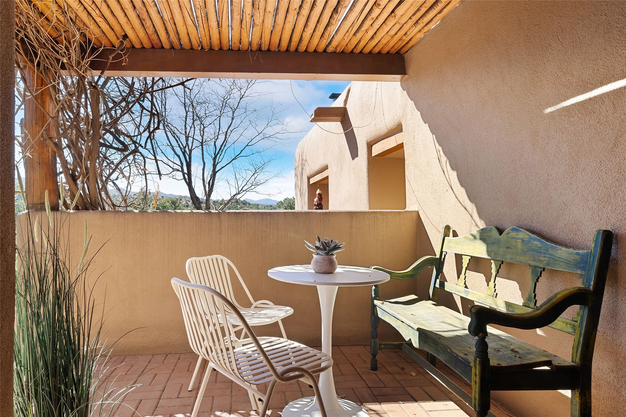 Nestled in the sought-after Pueblo Encantado community just above the historic village of Tesuque, this enchanting 2-bedroom, 2-bath casita offers the quintessential Santa Fe lifestyle with income potential. Ideally located directly across from the renowned Four Seasons Resort Rancho Encantado Santa Fe, owners enjoy convenient access to world-class amenities including dining, bar, spa, pool, sunset views around the fire pit and optional private memberships. Elevated on the land to capture sweeping mountain views and enhanced privacy by being the end unit, this charming residence is perfectly suited to take in Santa Fe's scenic landscape and night skies. The private brick patio invites al fresco dining and quiet moments surrounded by the high desert landscape. Inside, authentic Southwestern character is on full display with warm brick floors, rustic wood beamed ceilings, custom wood doors and an inviting Kiva fireplace that creates a cozy, welcoming ambiance. A short flight of steps leads to a well-appointed kitchen with Mexican Talavera tile counters and a separate dining area. Both bedrooms are generously sized, both have access to private outdoor patios with the primary suite offering a romantic kiva-style wood-burning fireplace. Pueblo Encantado is a short-term rental-friendly community, making this an excellent opportunity for those seeking a lock-and-leave second home with income potential. Community amenities include a pool and the benefit of an on-site property manager, enhancing ease of ownership. With direct access to nearby hiking trails and just minutes from the cultural and culinary offerings of Santa Fe, this is a rare opportunity to own a serene desert retreat in one of the area's most desirable locations.
