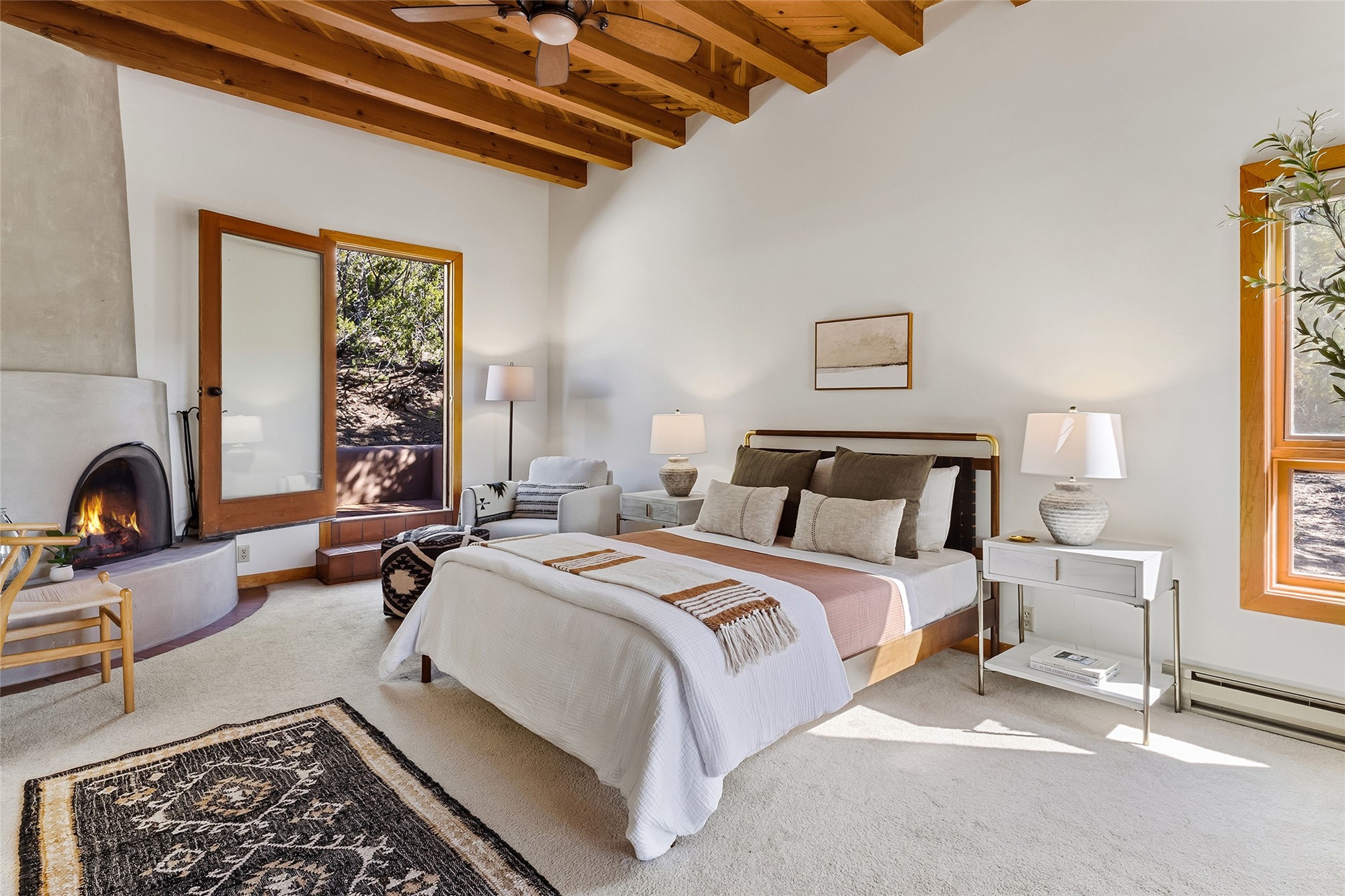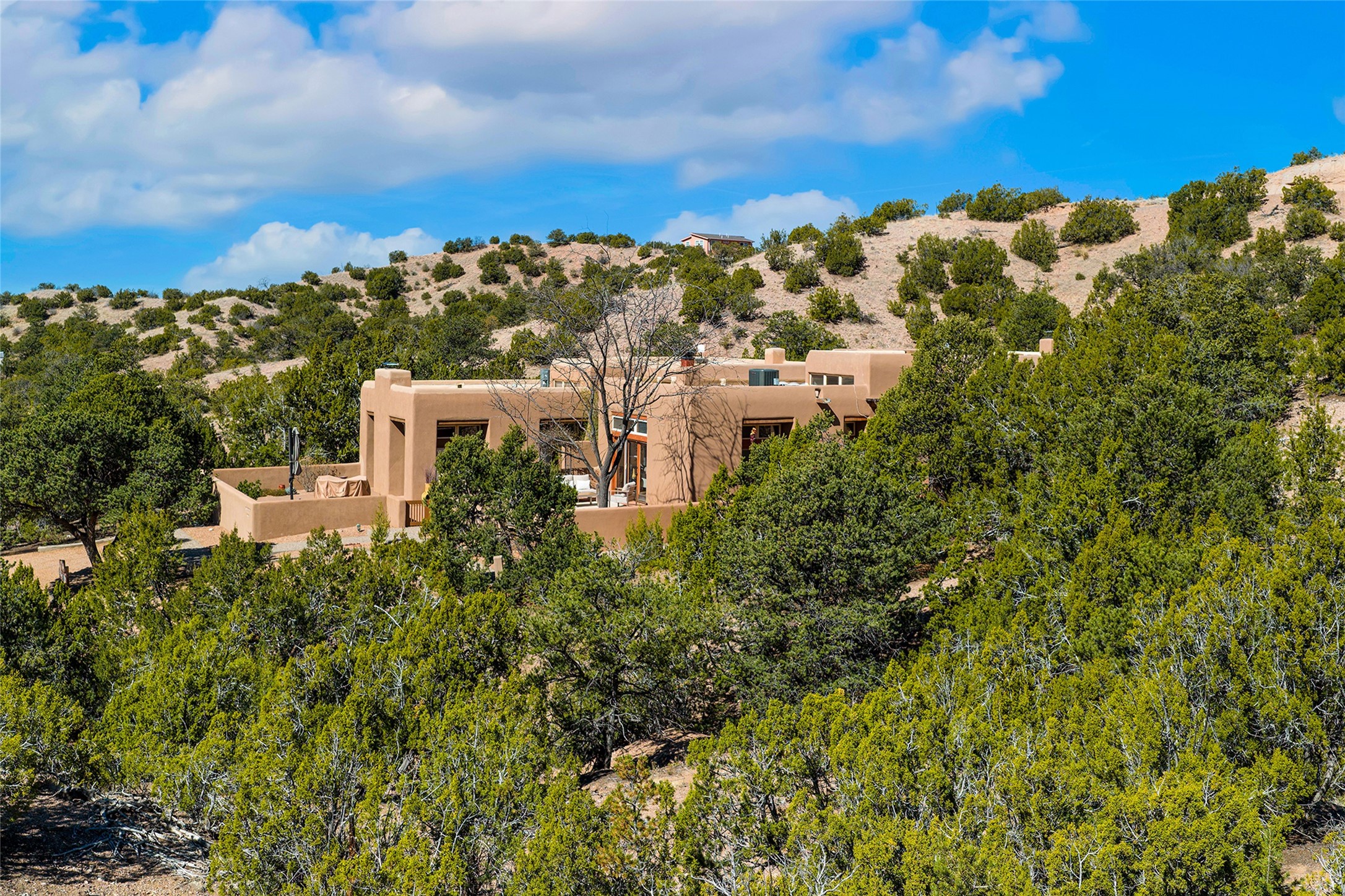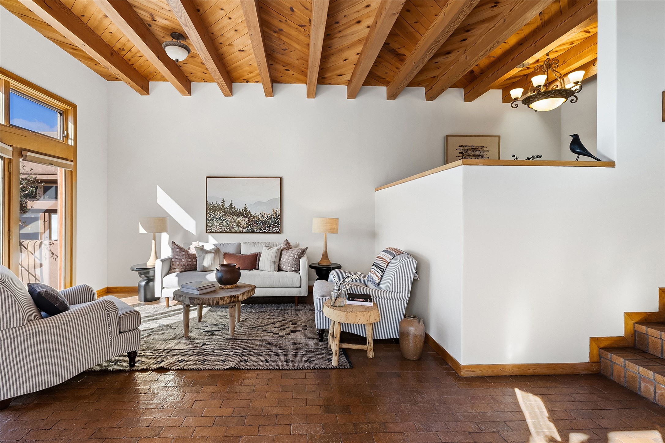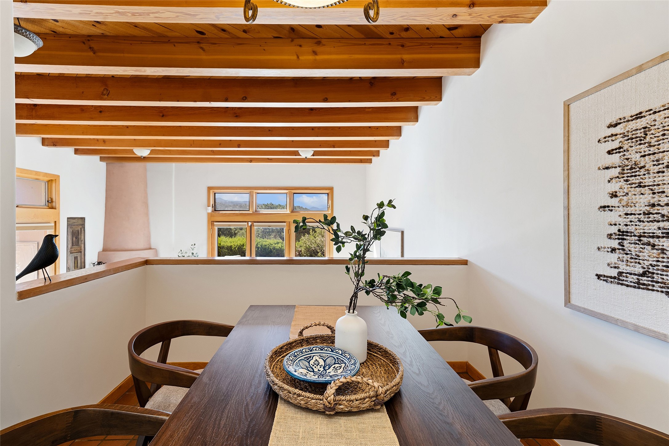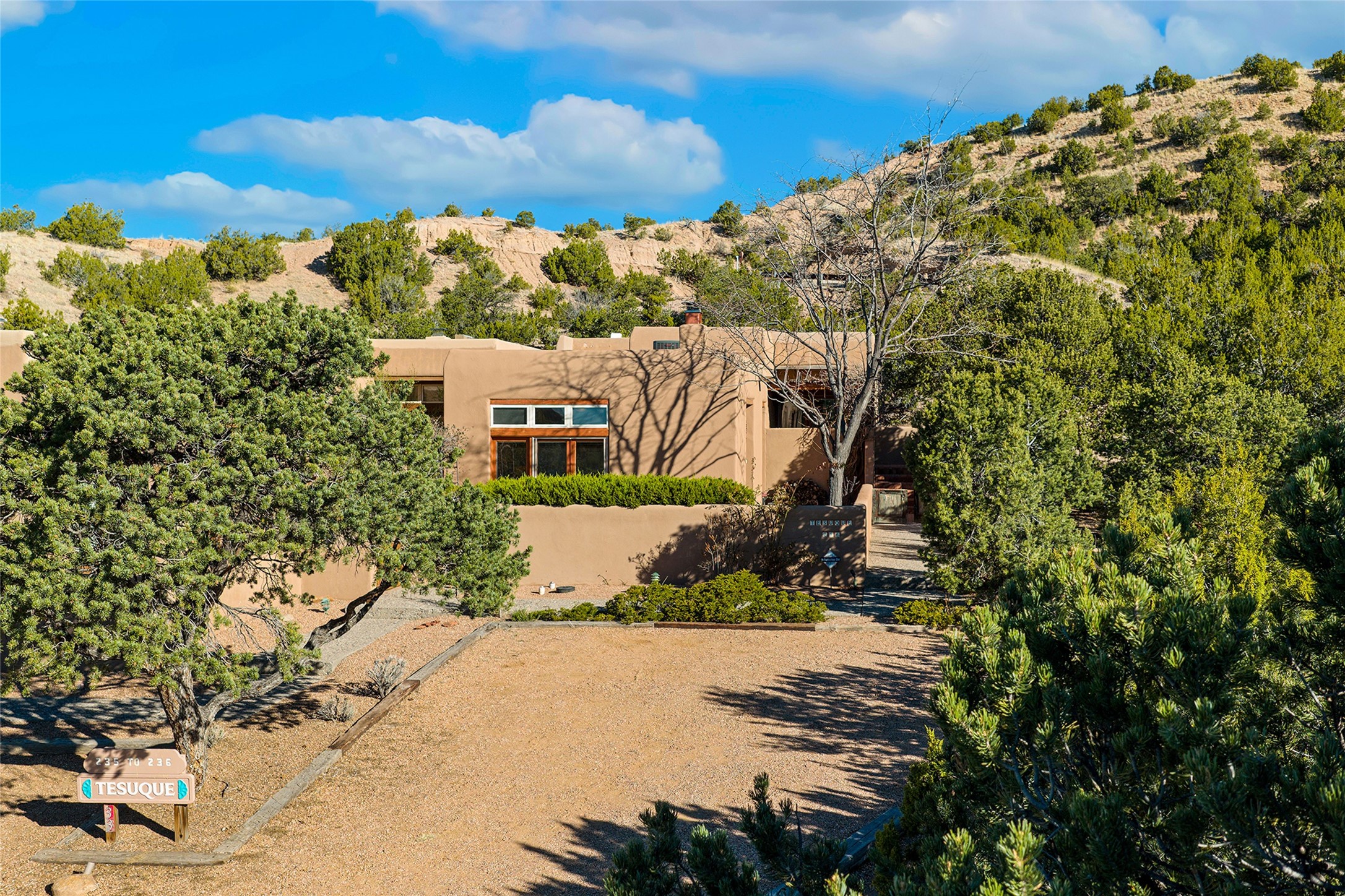 Nestled in the sought-after Pueblo Encantado community just above the historic village of Tesuque, this enchanting 2-bedroom, 2-bath casita offers the quintessential Santa Fe lifestyle with income potential. Ideally located directly across from the renowned Four Seasons Resort Rancho Encantado Santa Fe, owners enjoy convenient access to world-class amenities including dining, bar, spa, pool, sunset views around the fire pit and optional private memberships. Elevated on the land to capture sweeping mountain views and enhanced privacy by being the end unit, this charming residence is perfectly suited to take in Santa Fe's scenic landscape and night skies. The private brick patio invites al fresco dining and quiet moments surrounded by the high desert landscape. Inside, authentic Southwestern character is on full display with warm brick floors, rustic wood beamed ceilings, custom wood doors and an inviting Kiva fireplace that creates a cozy, welcoming ambiance. A short flight of steps leads to a well-appointed kitchen with Mexican Talavera tile counters and a separate dining area. Both bedrooms are generously sized, both have access to private outdoor patios with the primary suite offering a romantic kiva-style wood-burning fireplace. Pueblo Encantado is a short-term rental-friendly community, making this an excellent opportunity for those seeking a lock-and-leave second home with income potential. Community amenities include a pool and the benefit of an on-site property manager, enhancing ease of ownership. With direct access to nearby hiking trails and just minutes from the cultural and culinary offerings of Santa Fe, this is a rare opportunity to own a serene desert retreat in one of the area's most desirable locations.