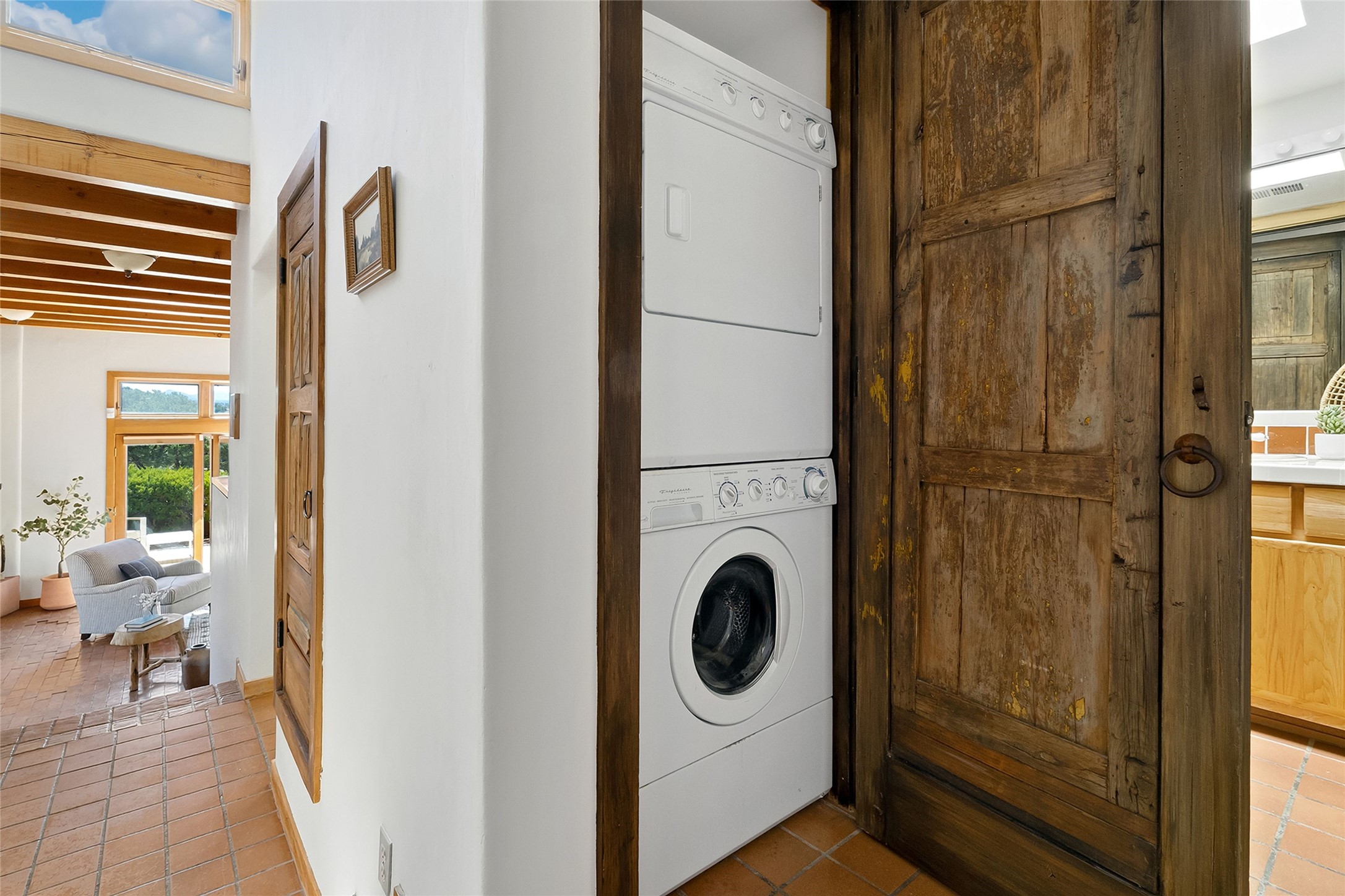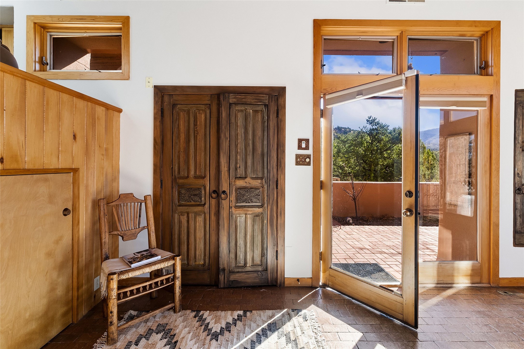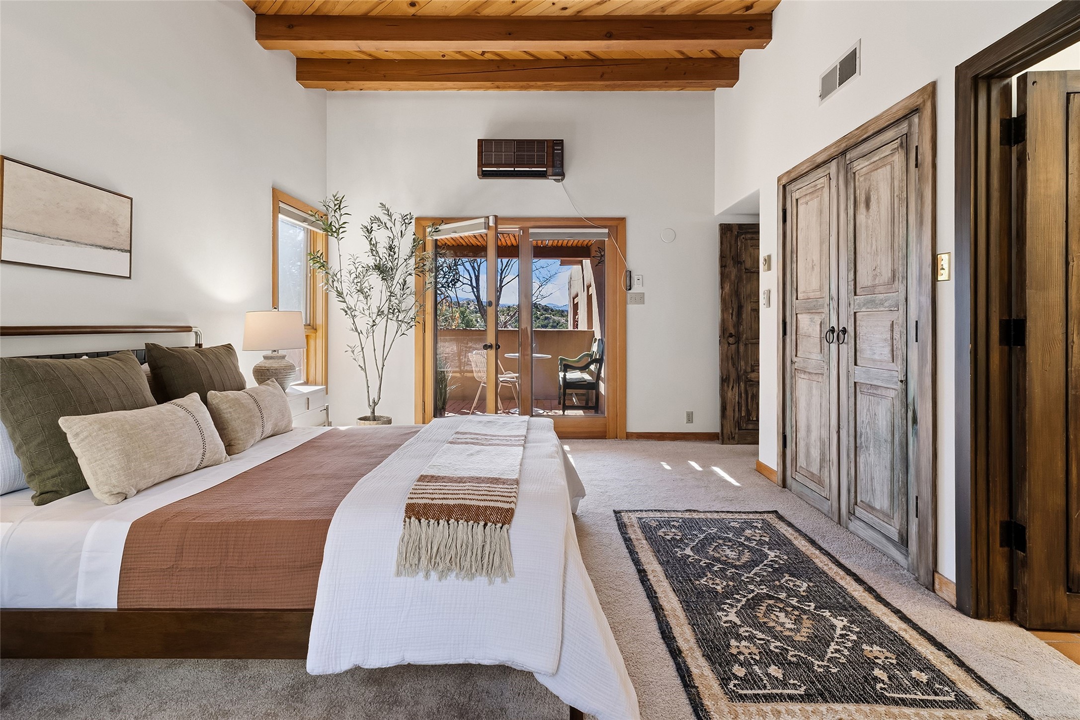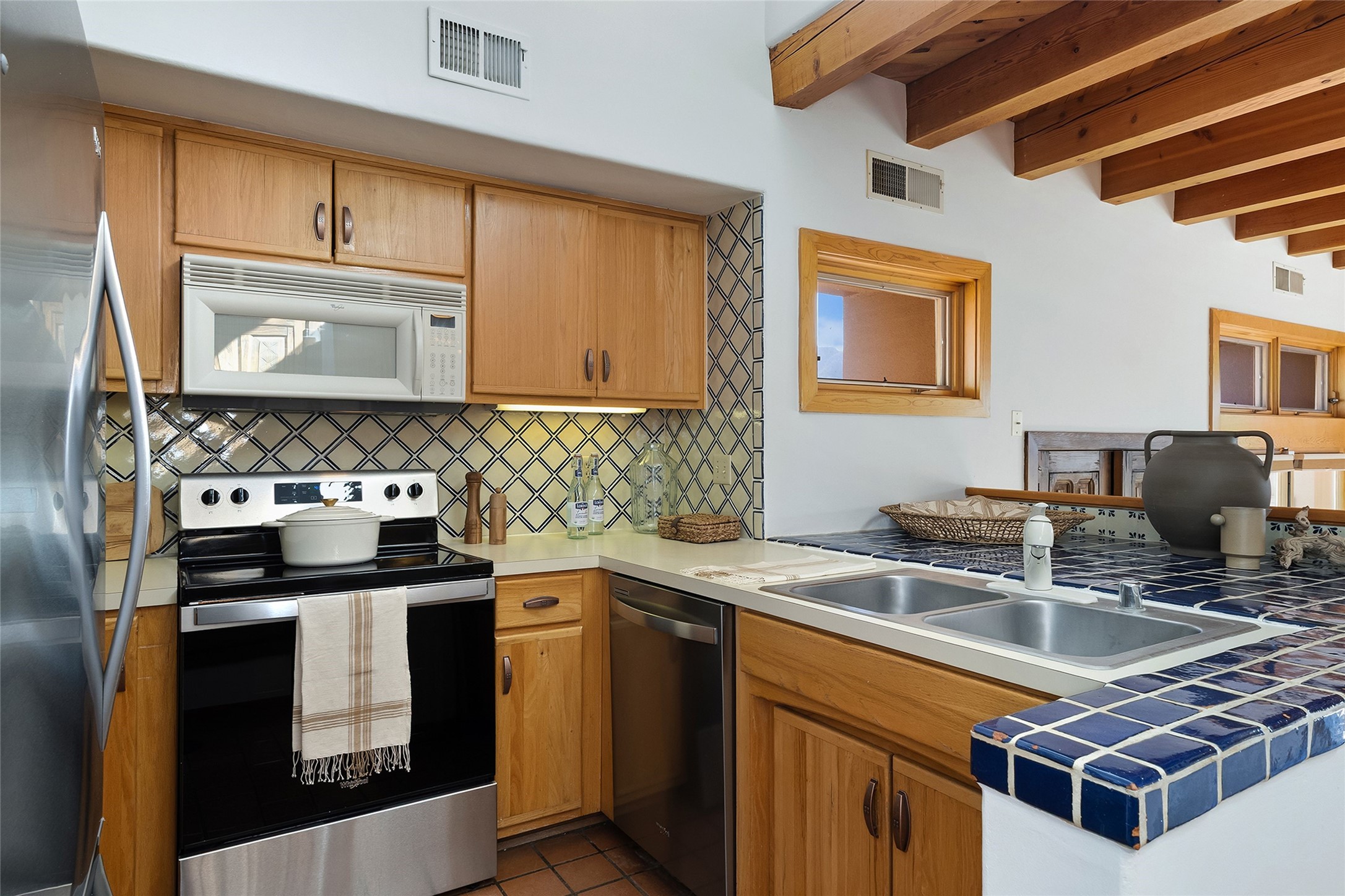 Nestled in the sought-after Pueblo Encantado community just above the historic village of Tesuque, this enchanting 2-bedroom, 2-bath casita offers the quintessential Santa Fe lifestyle with income potential. Ideally located directly across from the renowned Four Seasons Resort Rancho Encantado Santa Fe, owners enjoy convenient access to world-class amenities including dining, bar, spa, pool, sunset views around the fire pit and optional private memberships. Elevated on the land to capture sweeping mountain views and enhanced privacy by being the end unit, this charming residence is perfectly suited to take in Santa Fe's scenic landscape and night skies. The private brick patio invites al fresco dining and quiet moments surrounded by the high desert landscape. Inside, authentic Southwestern character is on full display with warm brick floors, rustic wood beamed ceilings, custom wood doors and an inviting Kiva fireplace that creates a cozy, welcoming ambiance. A short flight of steps leads to a well-appointed kitchen with Mexican Talavera tile counters and a separate dining area. Both bedrooms are generously sized, both have access to private outdoor patios with the primary suite offering a romantic kiva-style wood-burning fireplace. Pueblo Encantado is a short-term rental-friendly community, making this an excellent opportunity for those seeking a lock-and-leave second home with income potential. Community amenities include a pool and the benefit of an on-site property manager, enhancing ease of ownership. With direct access to nearby hiking trails and just minutes from the cultural and culinary offerings of Santa Fe, this is a rare opportunity to own a serene desert retreat in one of the area's most desirable locations.
