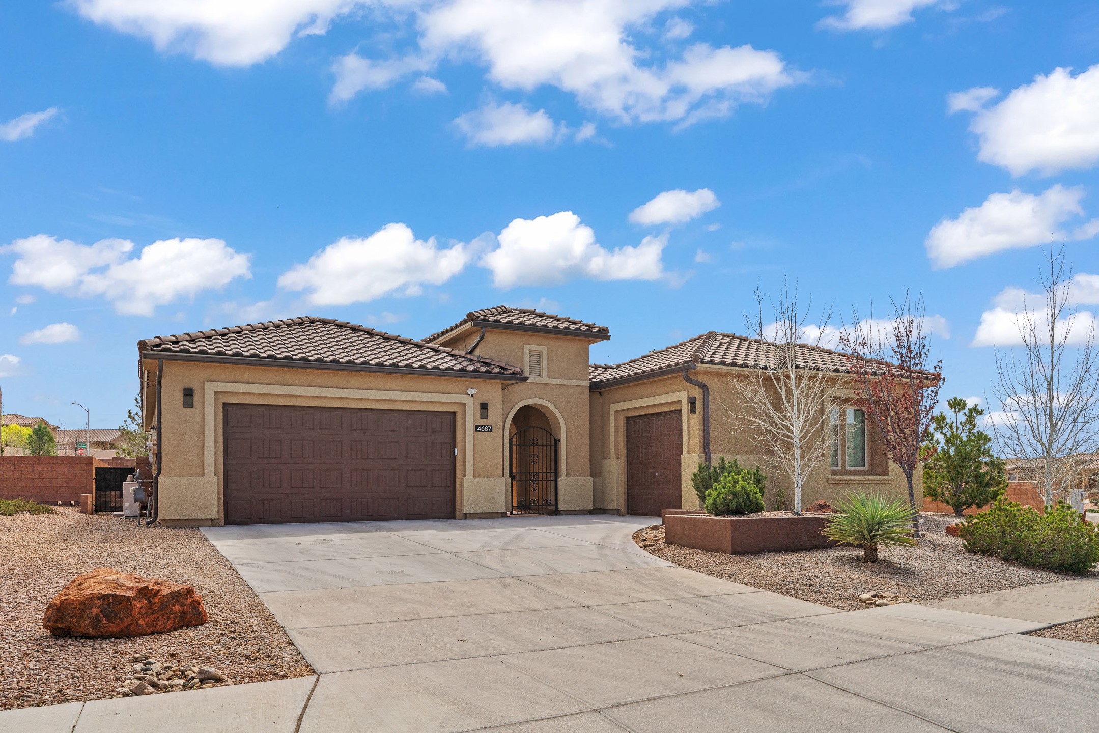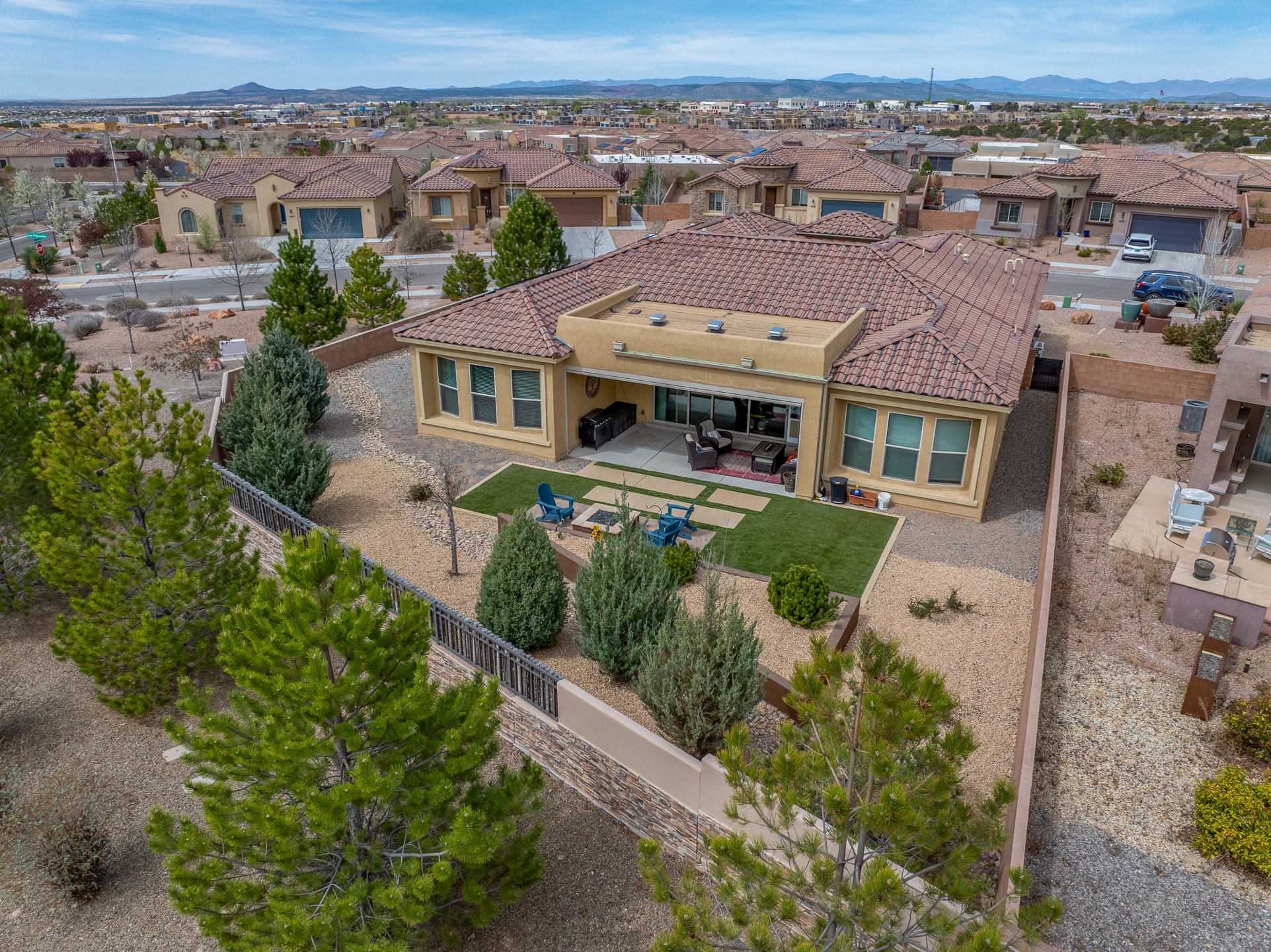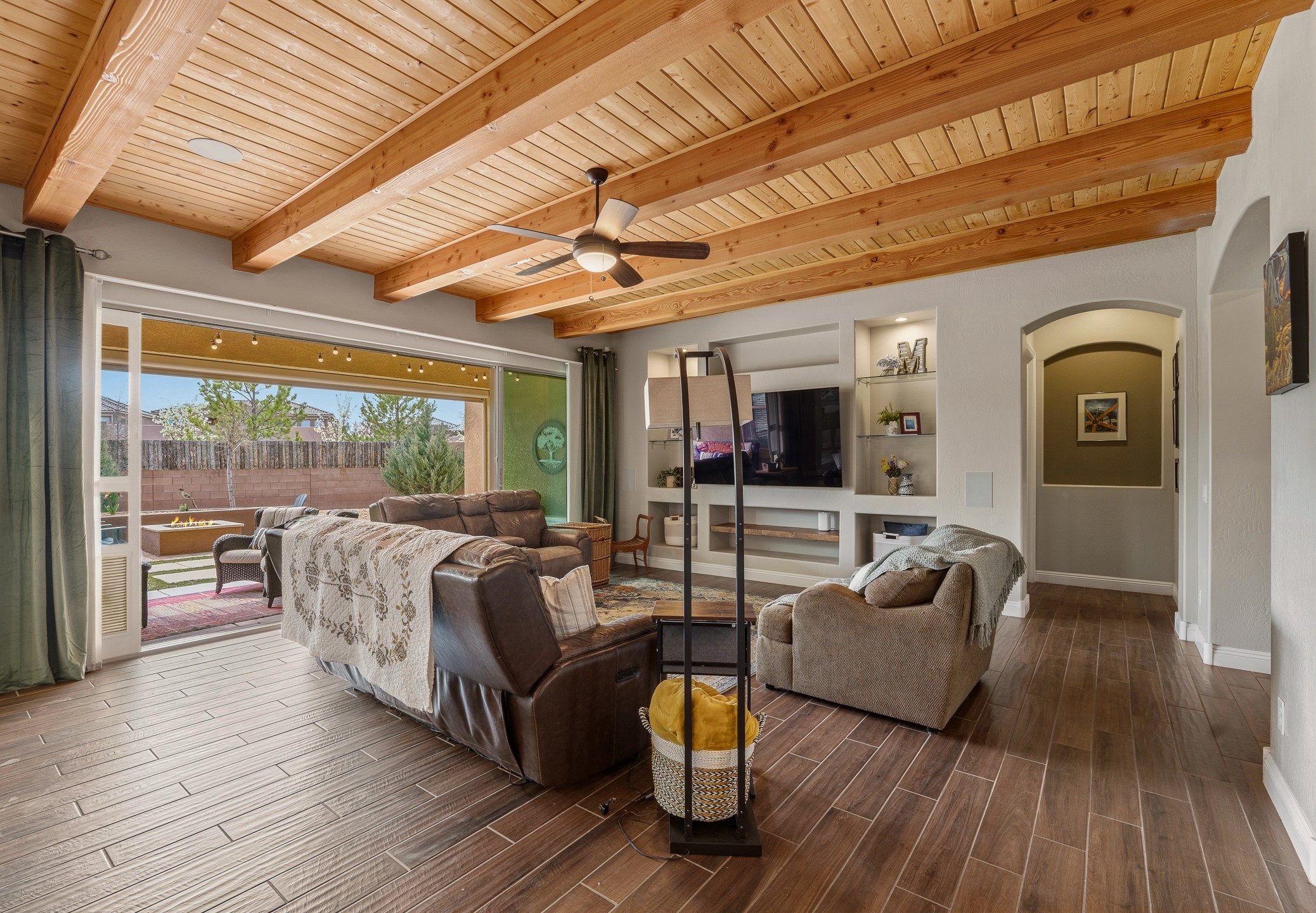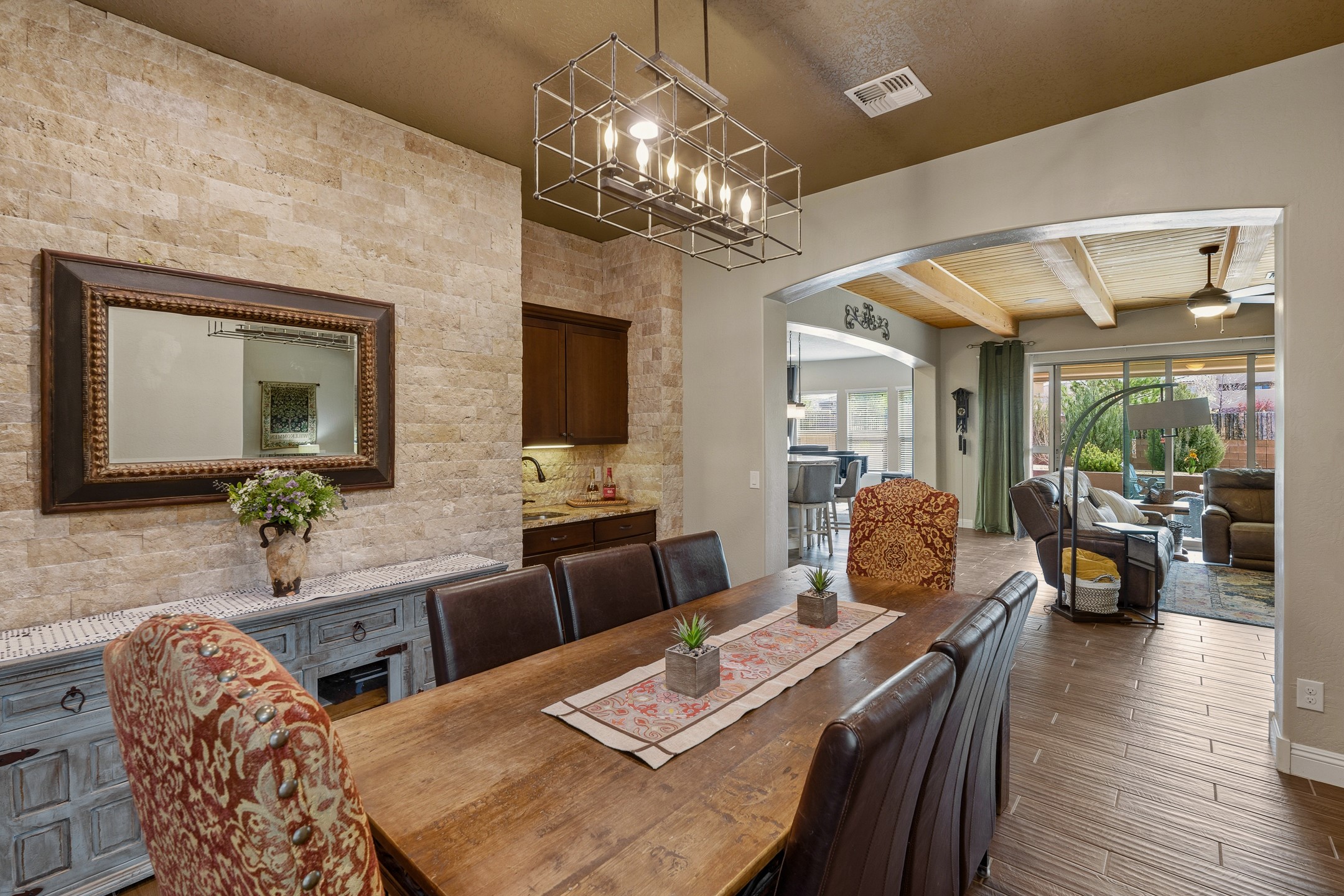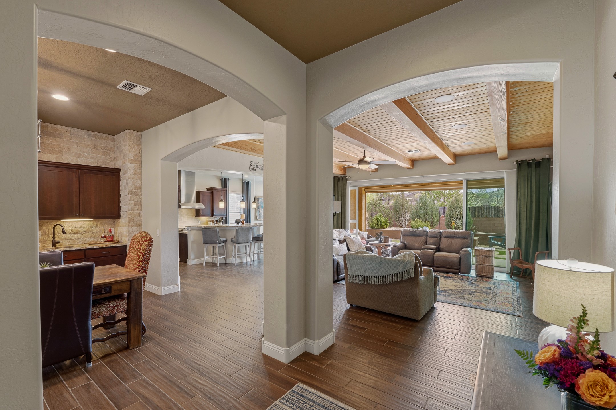 Las Soleras's coveted Journey Model home. Sited on a .25-acre corner lot, this beautifully upgraded 2,589 sq. ft. residence offers 3 bedrooms and 2.5 baths and was designed to elevate the Pulte living experience.The living room features tongue-and-groove ceilings with wood beams and a dramatic wall of sliding glass doors that fully open, seamlessly extending the living space to the covered portal and landscaped backyard--ideal for indoor-outdoor living.A formal dining room is enhanced by a striking stone accent wall and wet bar, creating an elegant setting for entertaining. The kitchen is well-appointed with upgraded KitchenAid stainless steel appliances and granite countertops, and opens to a charming breakfast nook, where a graceful curved wall of windows frames views of the landscaped backyard and adds a distinctive architectural touch.The private backyard is beautifully landscaped and features a raised gas firepit, while the side yard offers a blank canvas for future customization.The primary suite continues the home's refined design with wood beam ceilings and a curved wall detail. The fully renovated primary bath features an impressive walk-in shower. Two guest bedrooms are located in a separate wing and share a Jack-and-Jill bath.Additional features include a solar system, a two-car garage, and a separate one-car garage. The two-car garage is equipped with a mini-split system for heating and cooling and wired for an EV charger. With its thoughtful upgrades, architectural details, and prime Las Soleras location, this exceptional home offers a wonderful opportunity to enjoy the best of Las Soleras living.