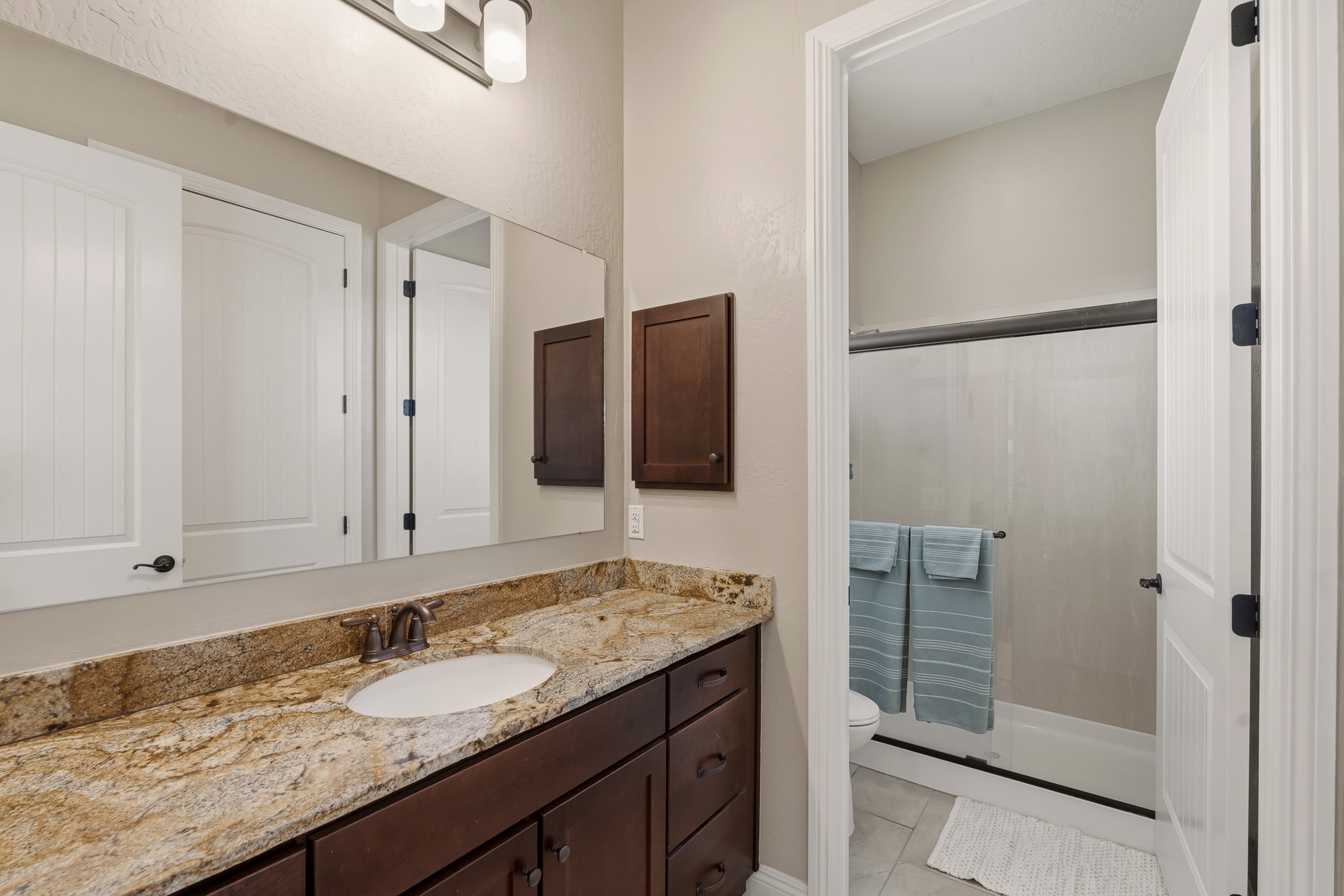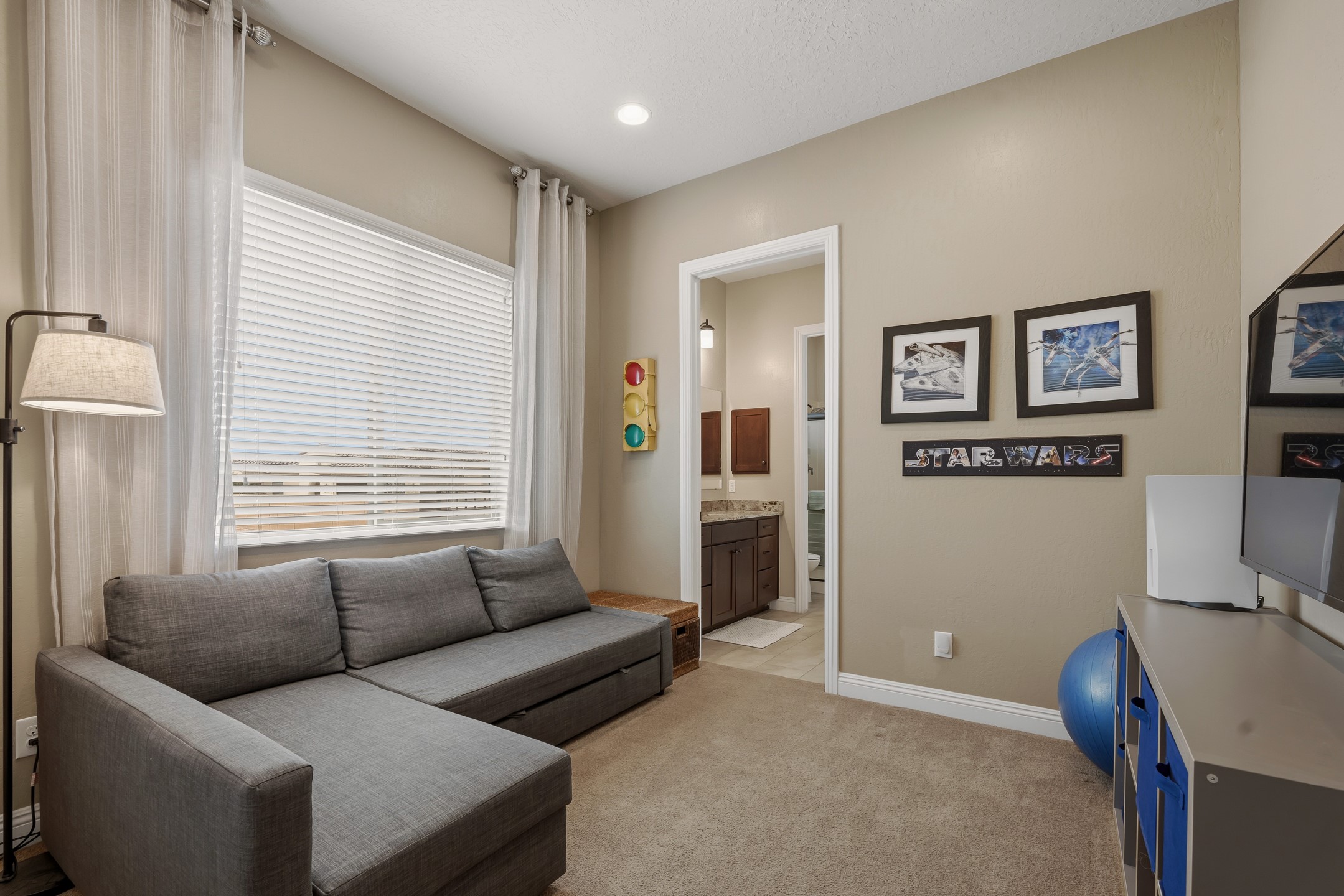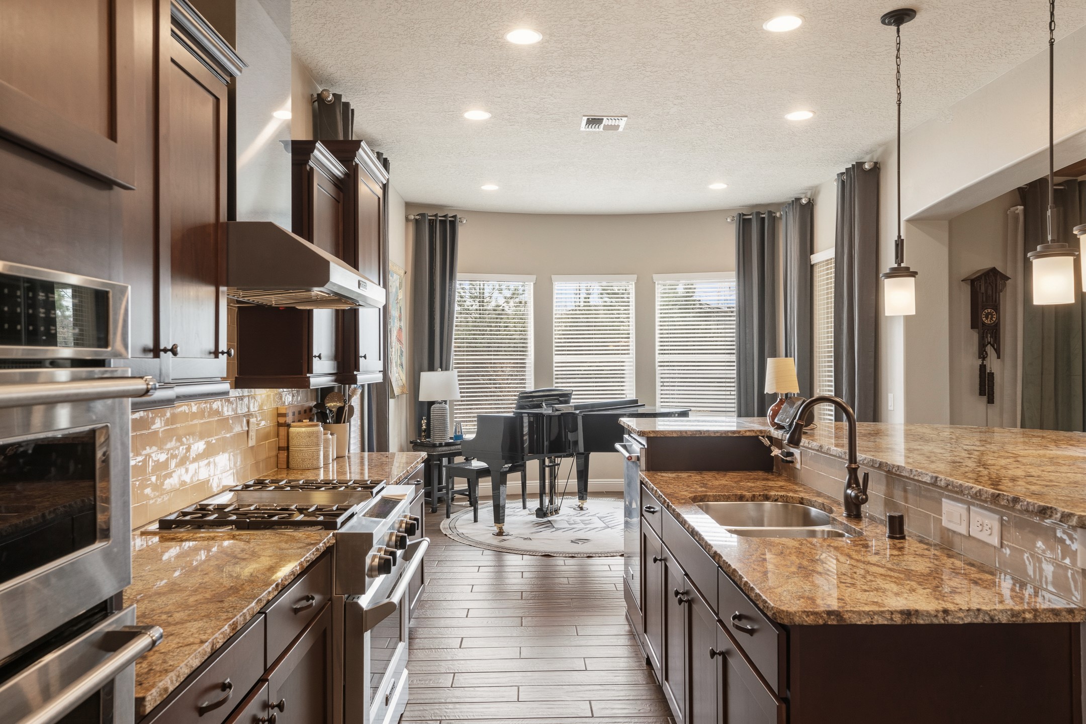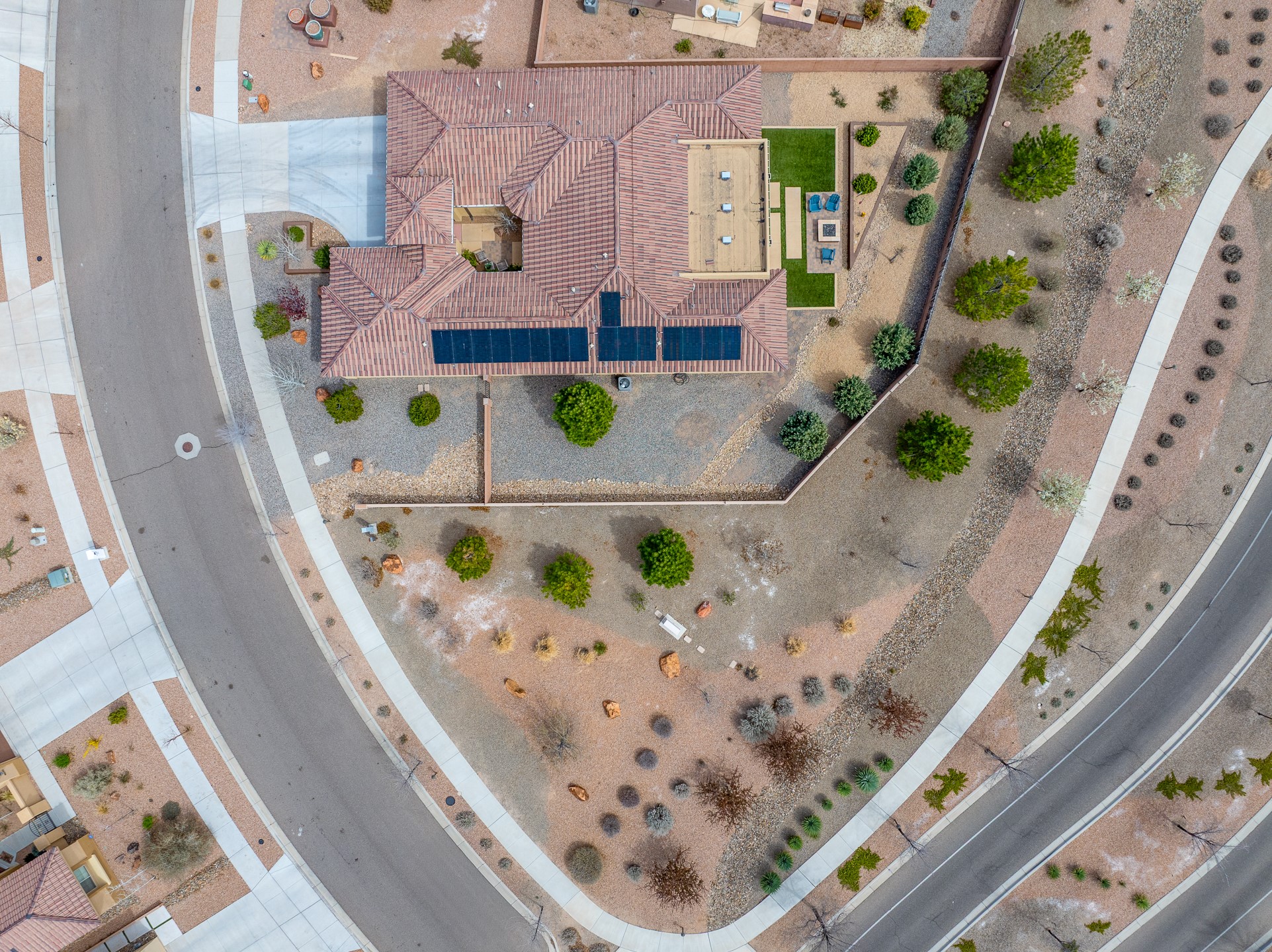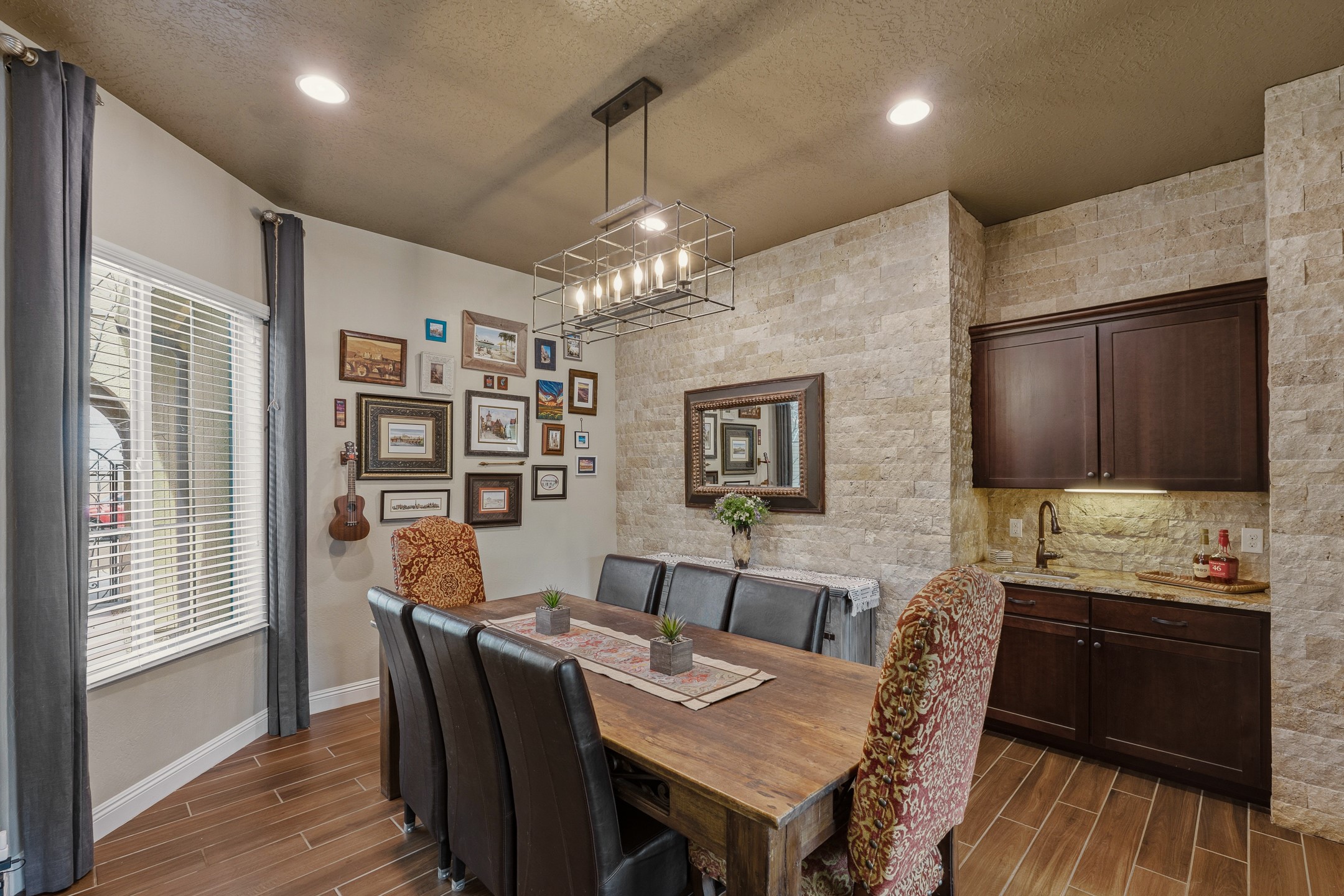 Las Soleras's coveted Journey Model home. Sited on a .25-acre corner lot, this beautifully upgraded 2,589 sq. ft. residence offers 3 bedrooms and 2.5 baths and was designed to elevate the Pulte living experience.The living room features tongue-and-groove ceilings with wood beams and a dramatic wall of sliding glass doors that fully open, seamlessly extending the living space to the covered portal and landscaped backyard--ideal for indoor-outdoor living.A formal dining room is enhanced by a striking stone accent wall and wet bar, creating an elegant setting for entertaining. The kitchen is well-appointed with upgraded KitchenAid stainless steel appliances and granite countertops, and opens to a charming breakfast nook, where a graceful curved wall of windows frames views of the landscaped backyard and adds a distinctive architectural touch.The private backyard is beautifully landscaped and features a raised gas firepit, while the side yard offers a blank canvas for future customization.The primary suite continues the home's refined design with wood beam ceilings and a curved wall detail. The fully renovated primary bath features an impressive walk-in shower. Two guest bedrooms are located in a separate wing and share a Jack-and-Jill bath.Additional features include a solar system, a two-car garage, and a separate one-car garage. The two-car garage is equipped with a mini-split system for heating and cooling and wired for an EV charger. With its thoughtful upgrades, architectural details, and prime Las Soleras location, this exceptional home offers a wonderful opportunity to enjoy the best of Las Soleras living.