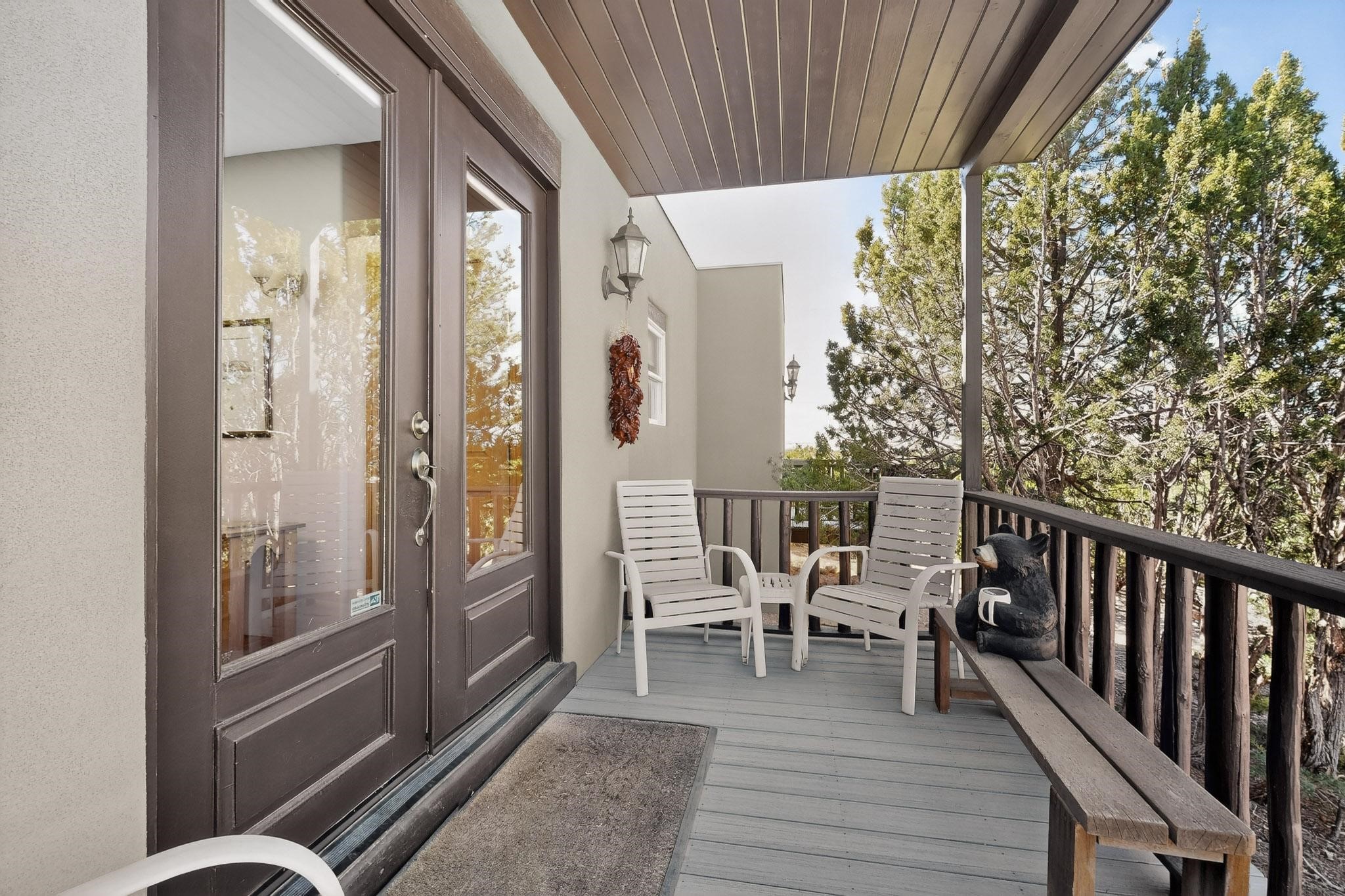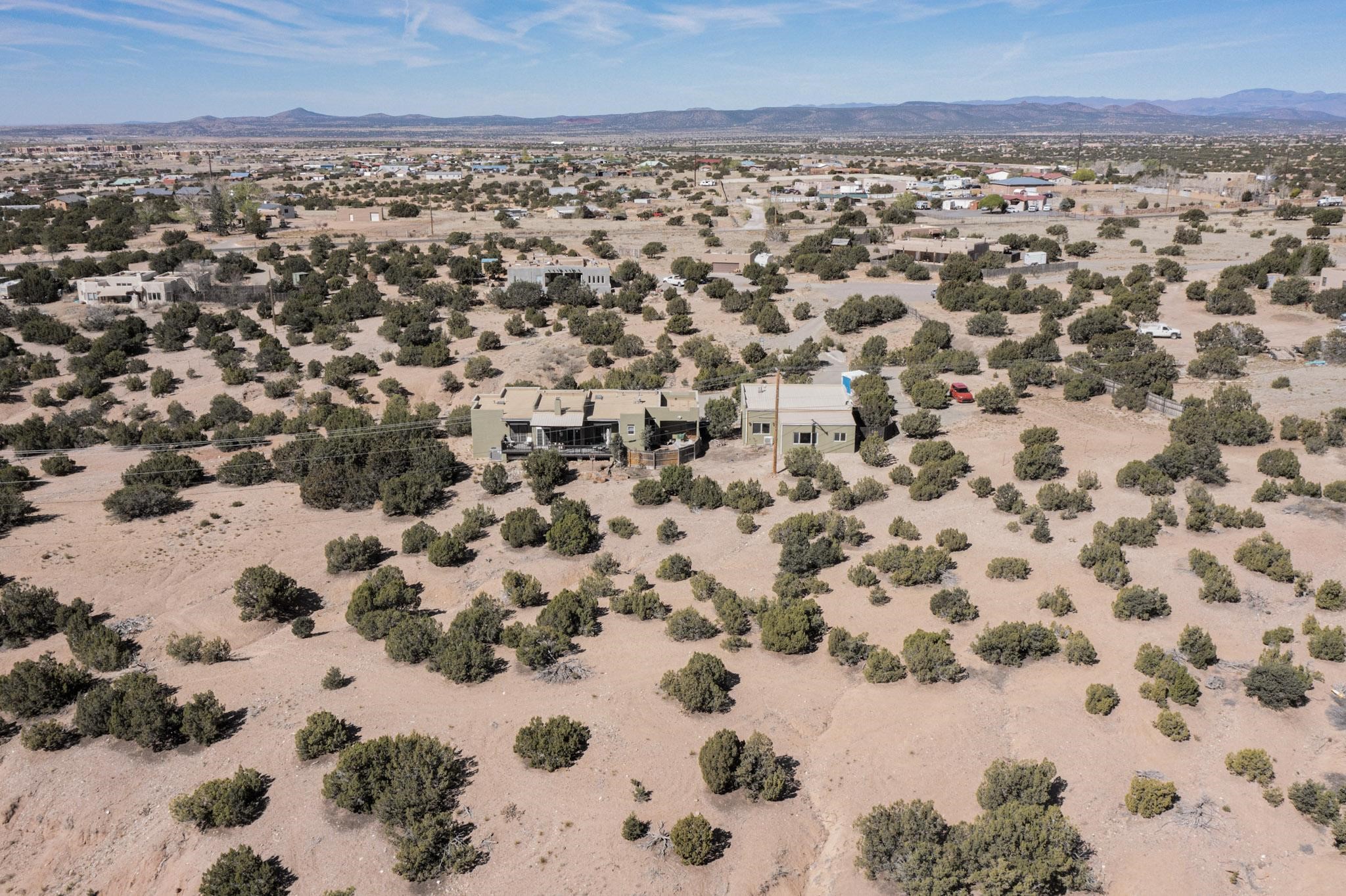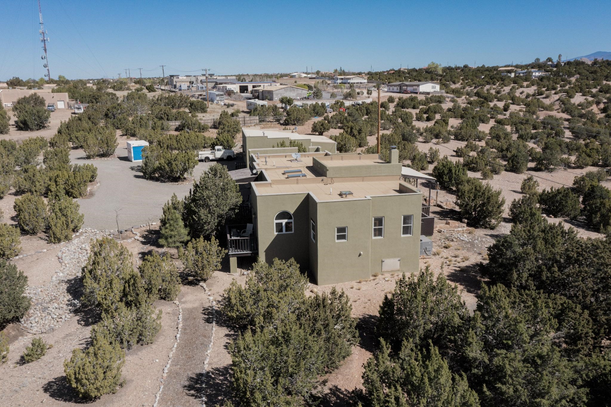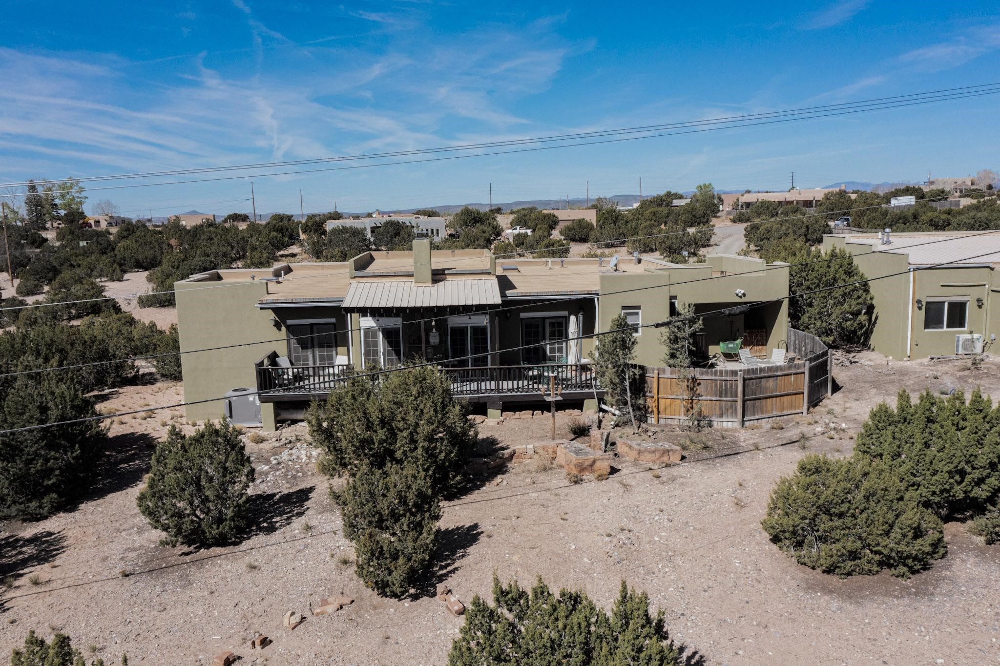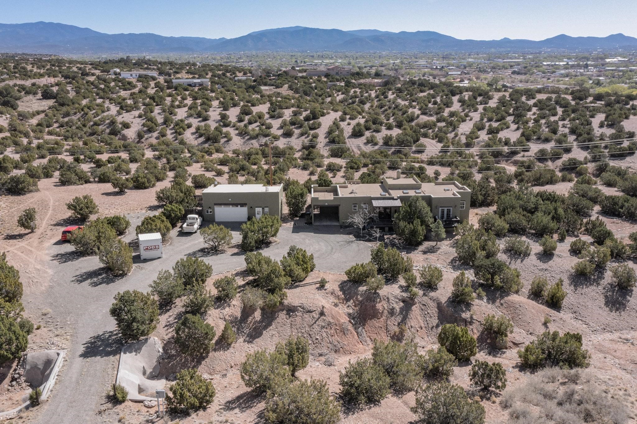 Tucked away on 2.5 tree-covered acres, this private country retreat offers stunning views of the Sangre de Cristo Mountains. Conveniently located south of W. Alameda and just east of San Ysidro Crossing, the property blends tranquility with accessibility.A detached studio--ideal as an office or guest house--features a bath, full kitchen, spacious living/sleeping area, walk-in closet, and an enclosed courtyard with pet access, all with beautiful eastern views. The oversized, finished two-car garage includes abundant windows, a loft, and direct entry.The main home is primarily single-level, offering an open-concept great room and kitchen with high viga ceilings, fireplace, built-in media center, and French doors leading to the east deck. The private primary suite includes a walk-in closet and a spa-like bath with jetted tub and separate shower. A flexible third bedroom with courtyard access is perfect for a home office. Additional highlights include a separate dining area with French doors to the west deck!Truly, MUST SEE!