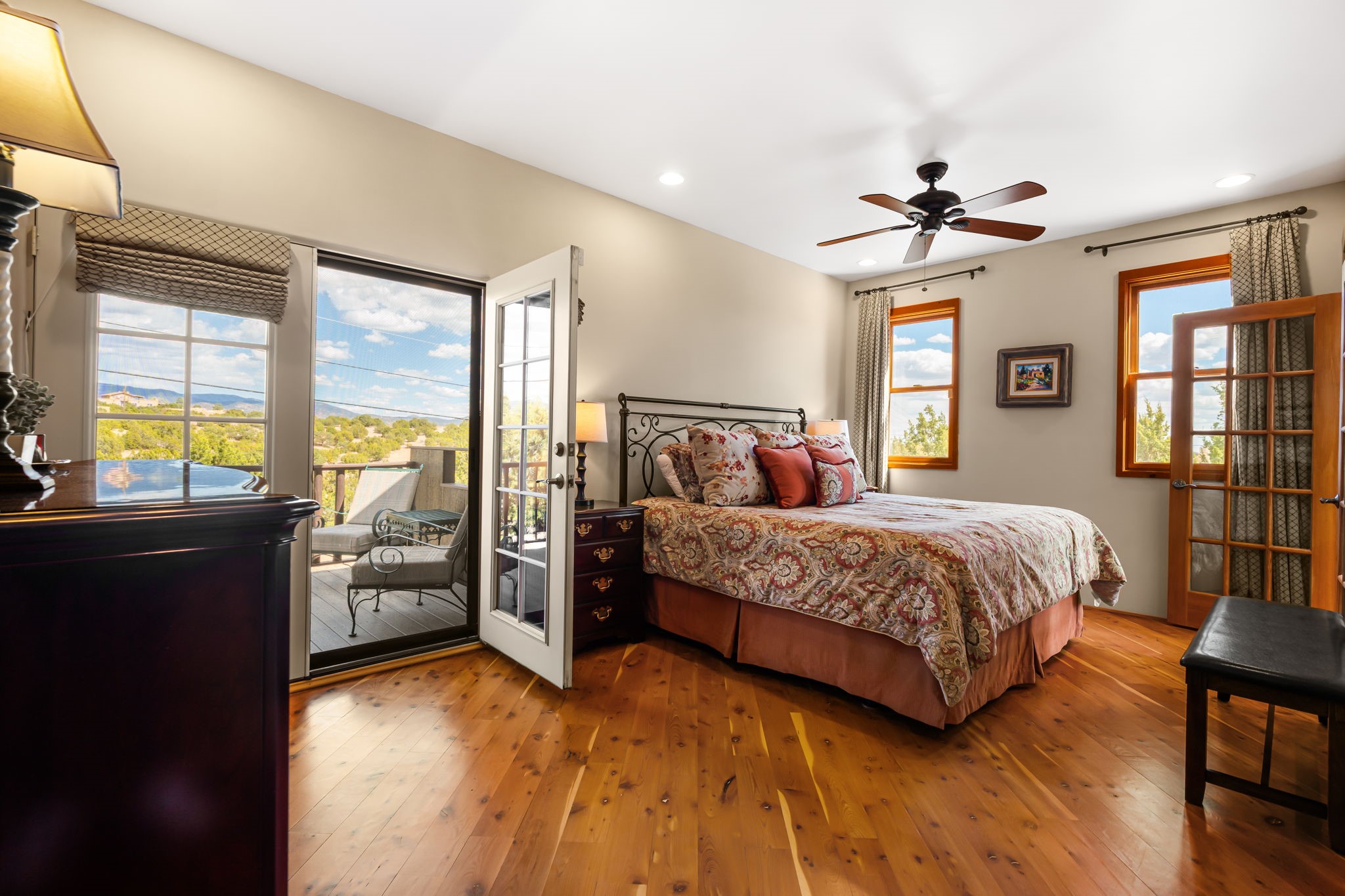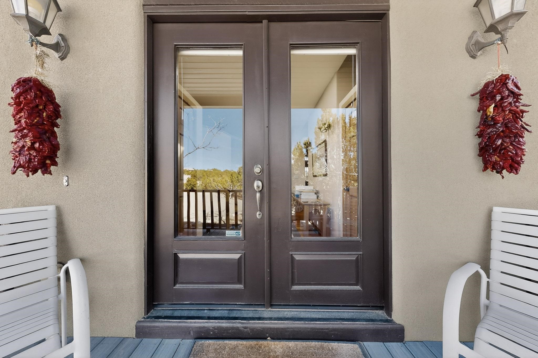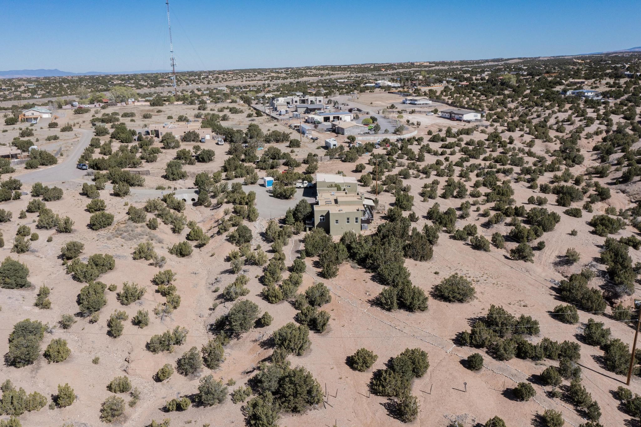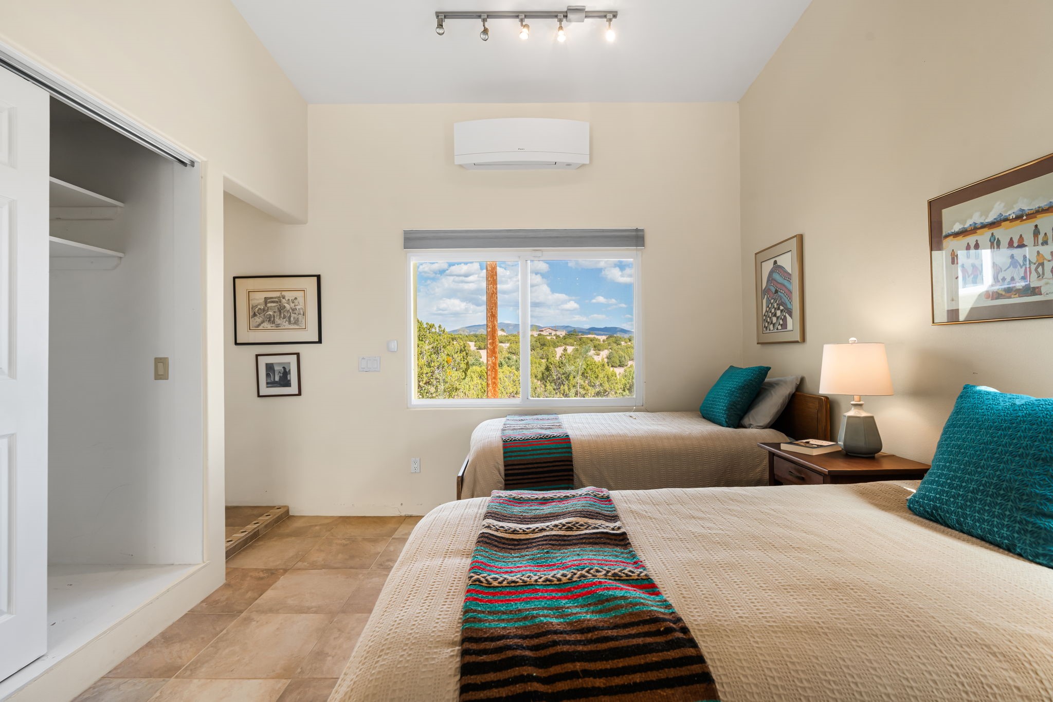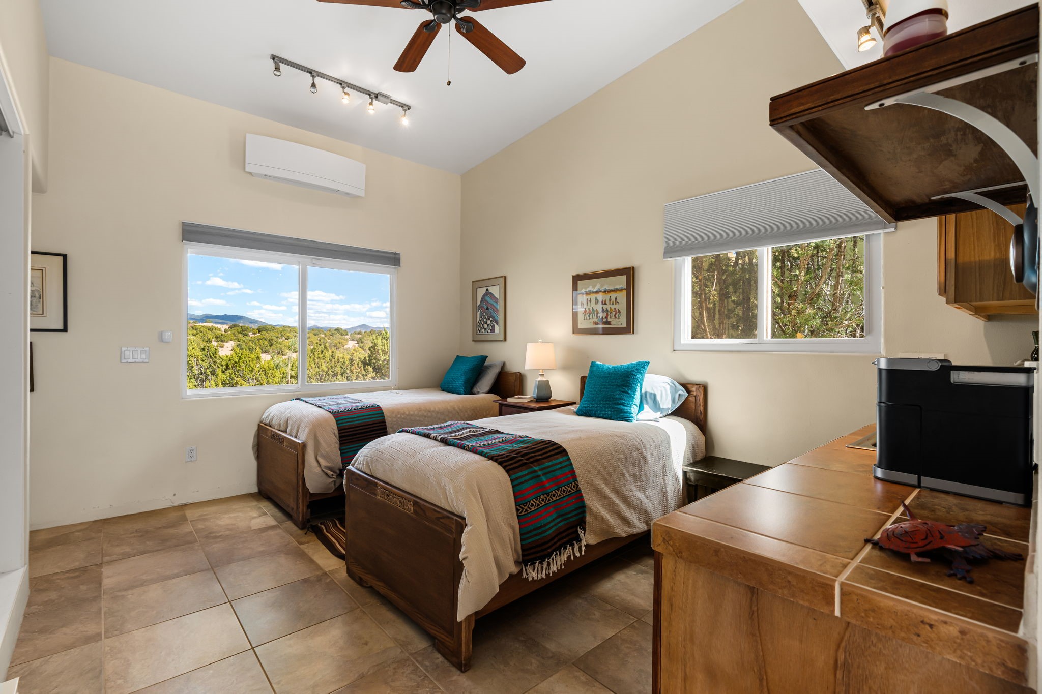Tucked away on 2.5 tree-covered acres, this private country retreat offers stunning views of the Sangre de Cristo Mountains. Conveniently located south of W. Alameda and just east of San Ysidro Crossing, the property blends tranquility with accessibility.A detached studio--ideal as an office or guest house--features a bath, full kitchen, spacious living/sleeping area, walk-in closet, and an enclosed courtyard with pet access, all with beautiful eastern views. The oversized, finished two-car garage includes abundant windows, a loft, and direct entry.The main home is primarily single-level, offering an open-concept great room and kitchen with high viga ceilings, fireplace, built-in media center, and French doors leading to the east deck. The private primary suite includes a walk-in closet and a spa-like bath with jetted tub and separate shower. A flexible third bedroom with courtyard access is perfect for a home office. Additional highlights include a separate dining area with French doors to the west deck!Truly, MUST SEE!