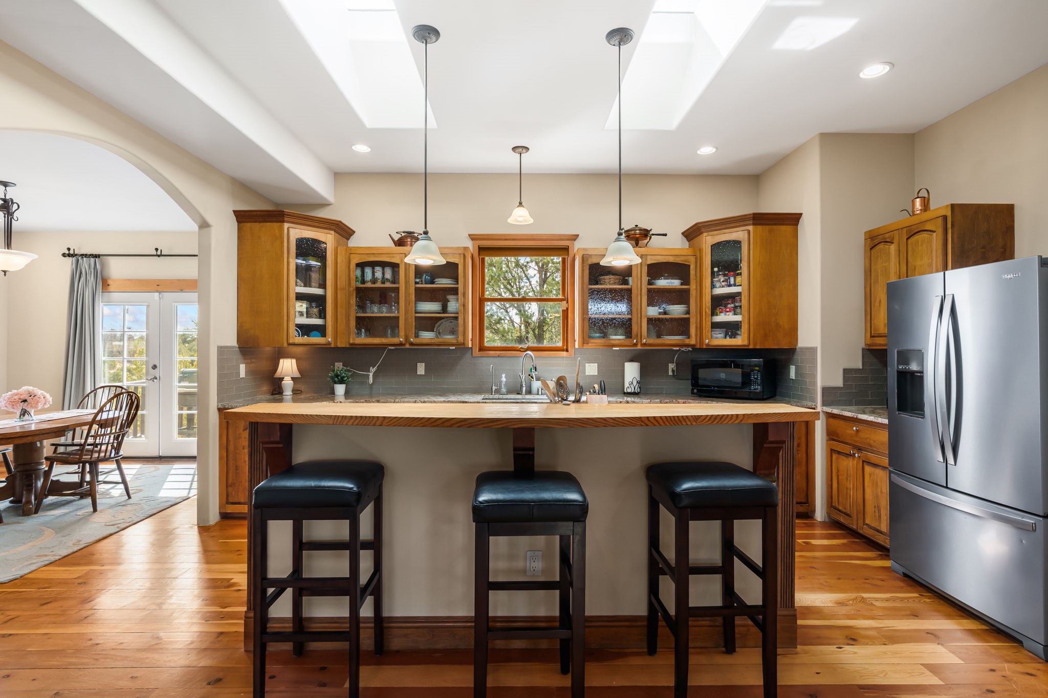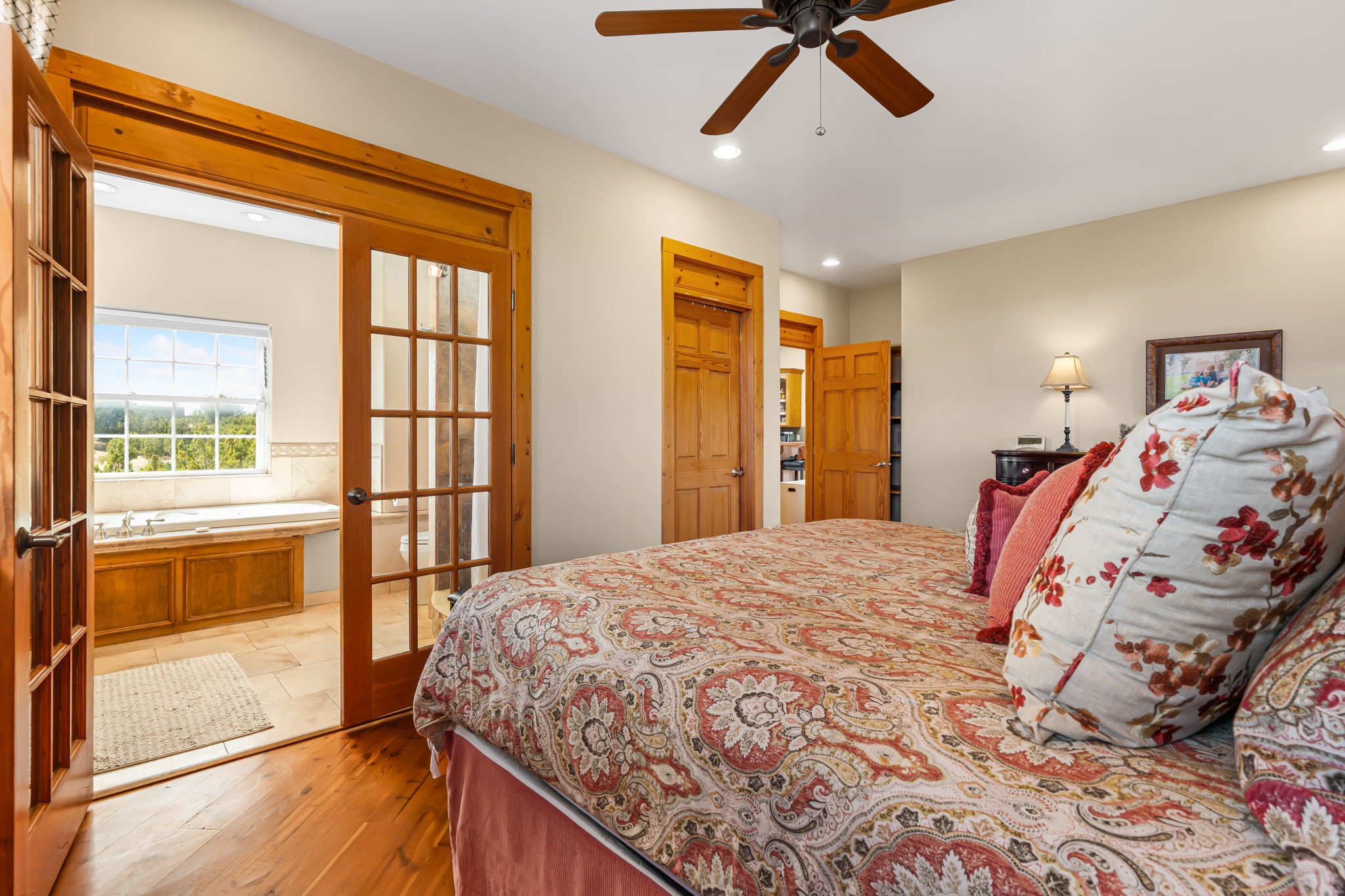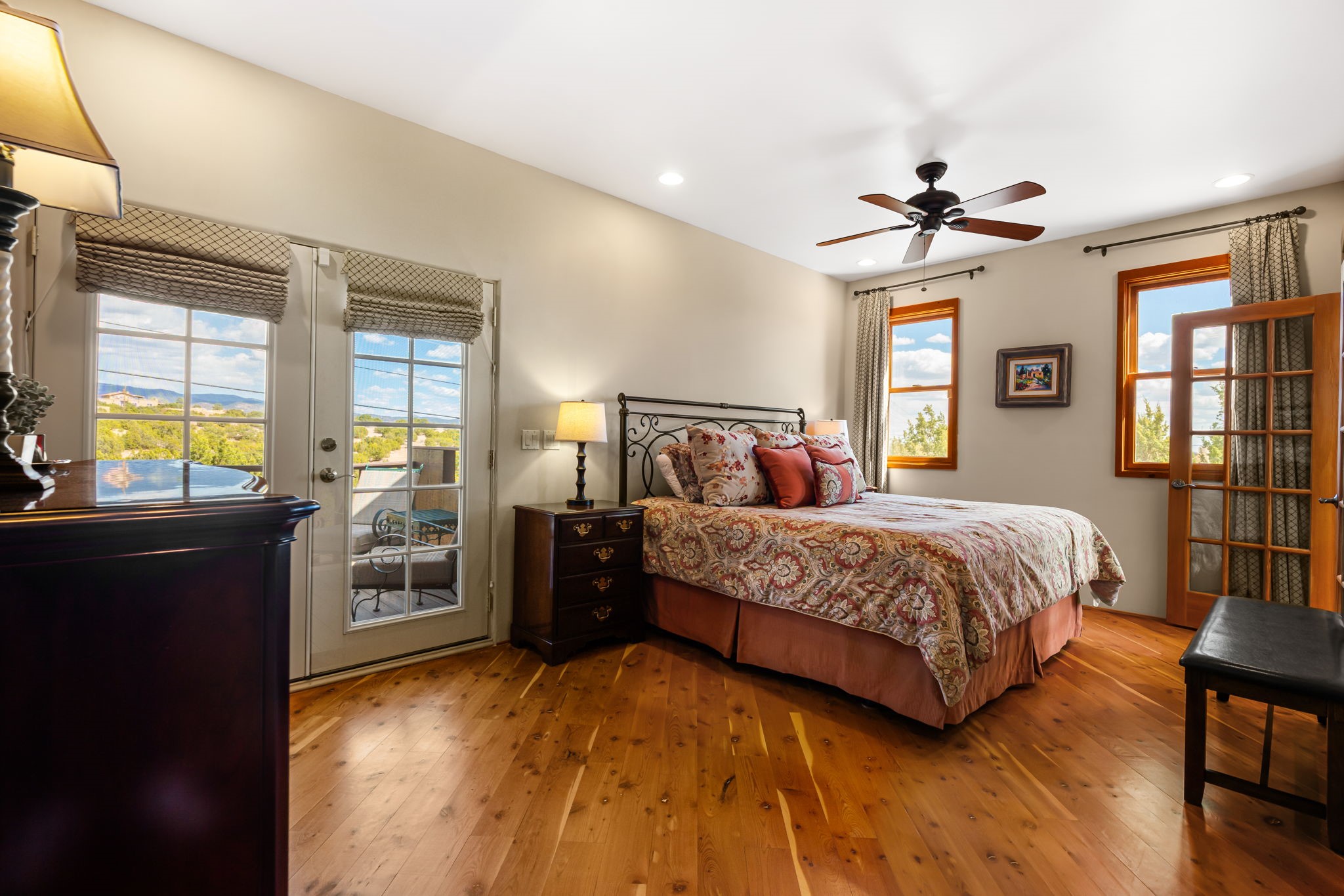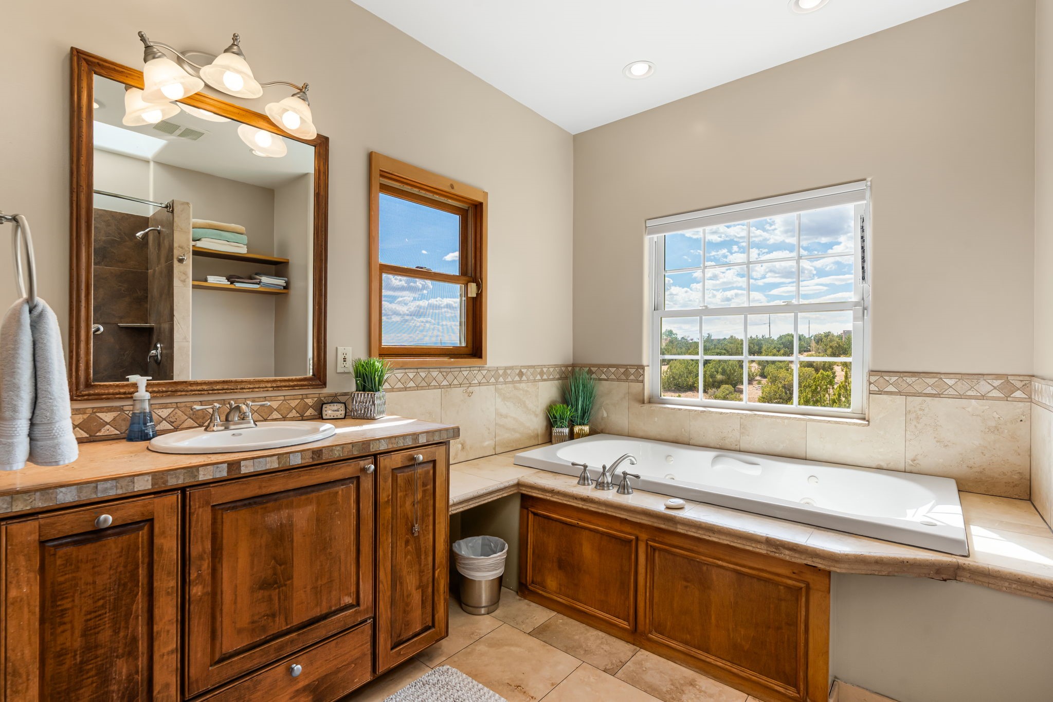 Tucked away on 2.5 tree-covered acres, this private country retreat offers stunning views of the Sangre de Cristo Mountains. Conveniently located south of W. Alameda and just east of San Ysidro Crossing, the property blends tranquility with accessibility.A detached studio--ideal as an office or guest house--features a bath, full kitchen, spacious living/sleeping area, walk-in closet, and an enclosed courtyard with pet access, all with beautiful eastern views. The oversized, finished two-car garage includes abundant windows, a loft, and direct entry.The main home is primarily single-level, offering an open-concept great room and kitchen with high viga ceilings, fireplace, built-in media center, and French doors leading to the east deck. The private primary suite includes a walk-in closet and a spa-like bath with jetted tub and separate shower. A flexible third bedroom with courtyard access is perfect for a home office. Additional highlights include a separate dining area with French doors to the west deck!Truly, MUST SEE!