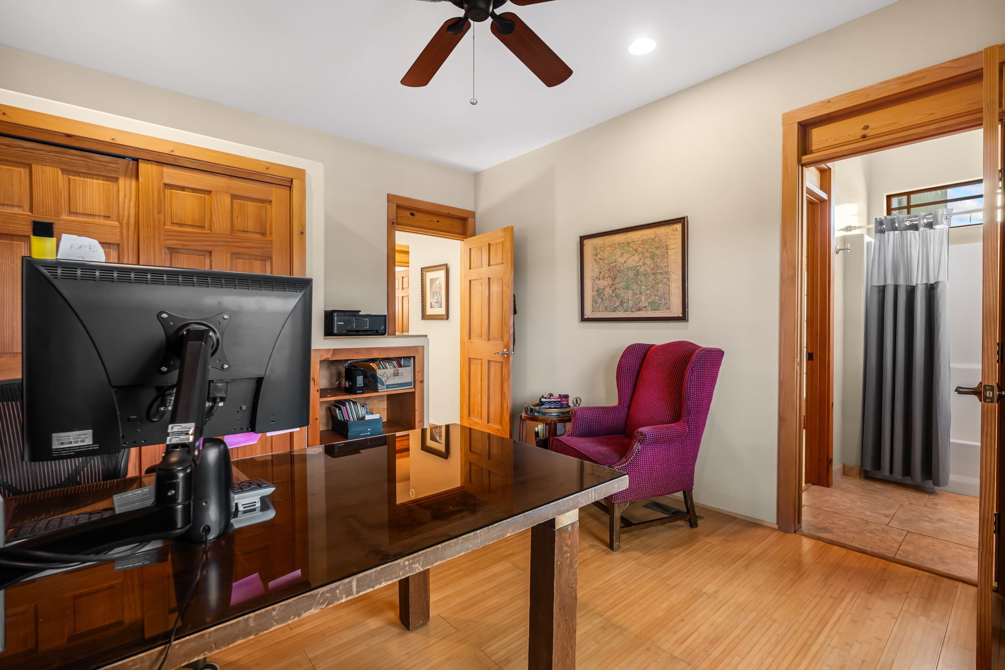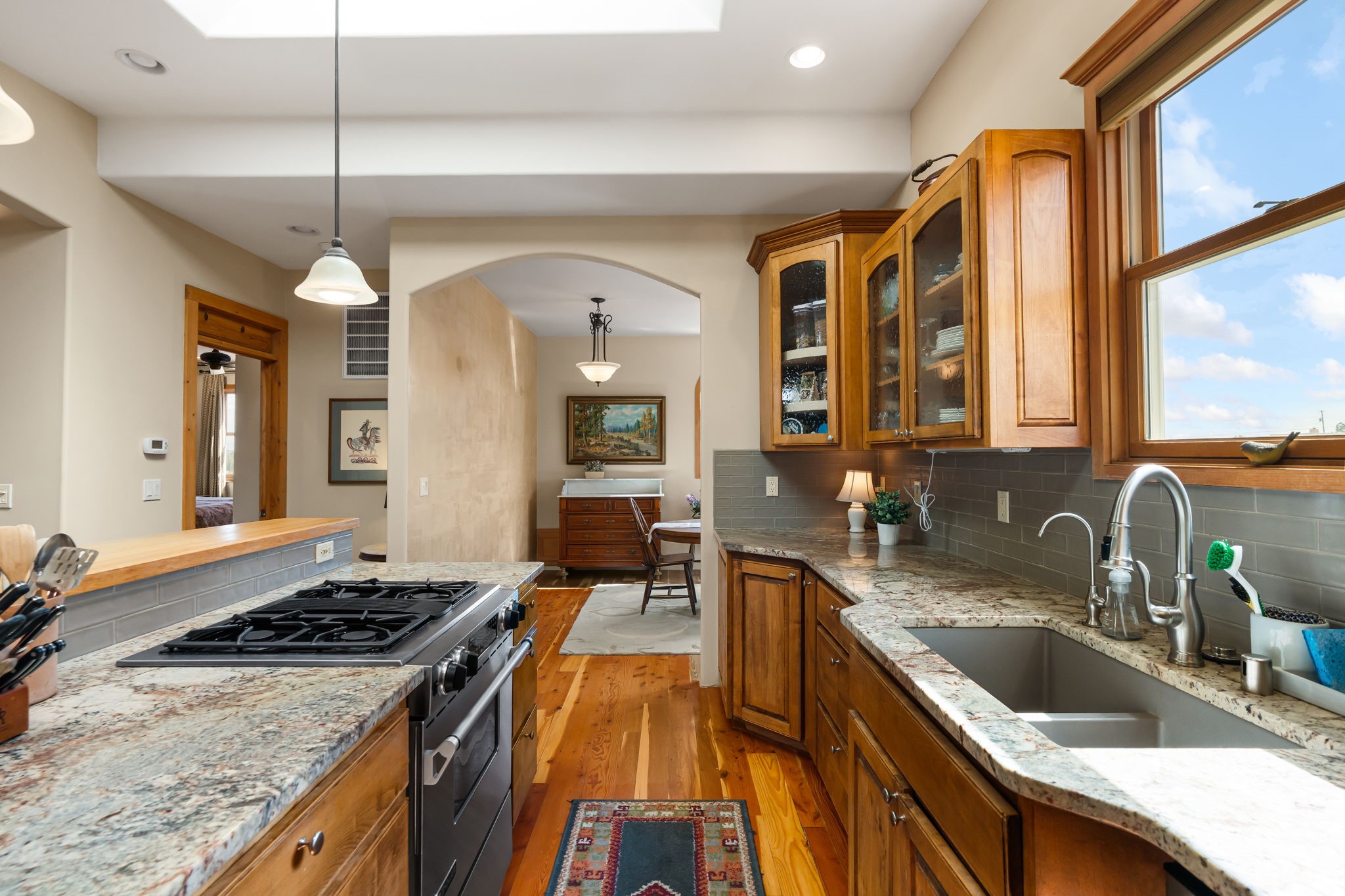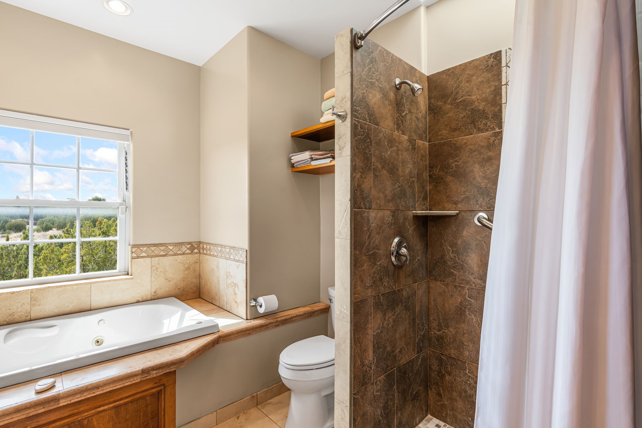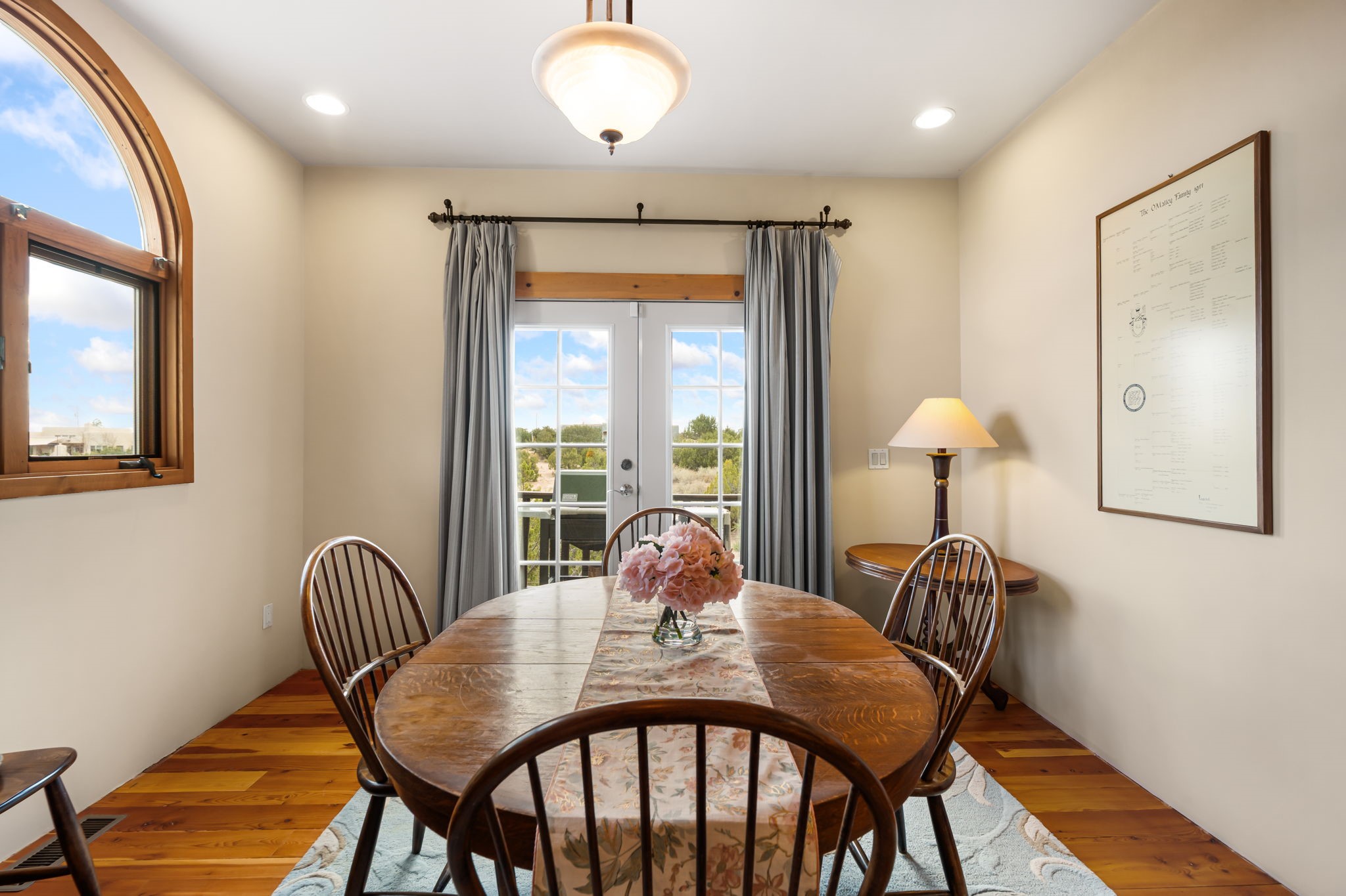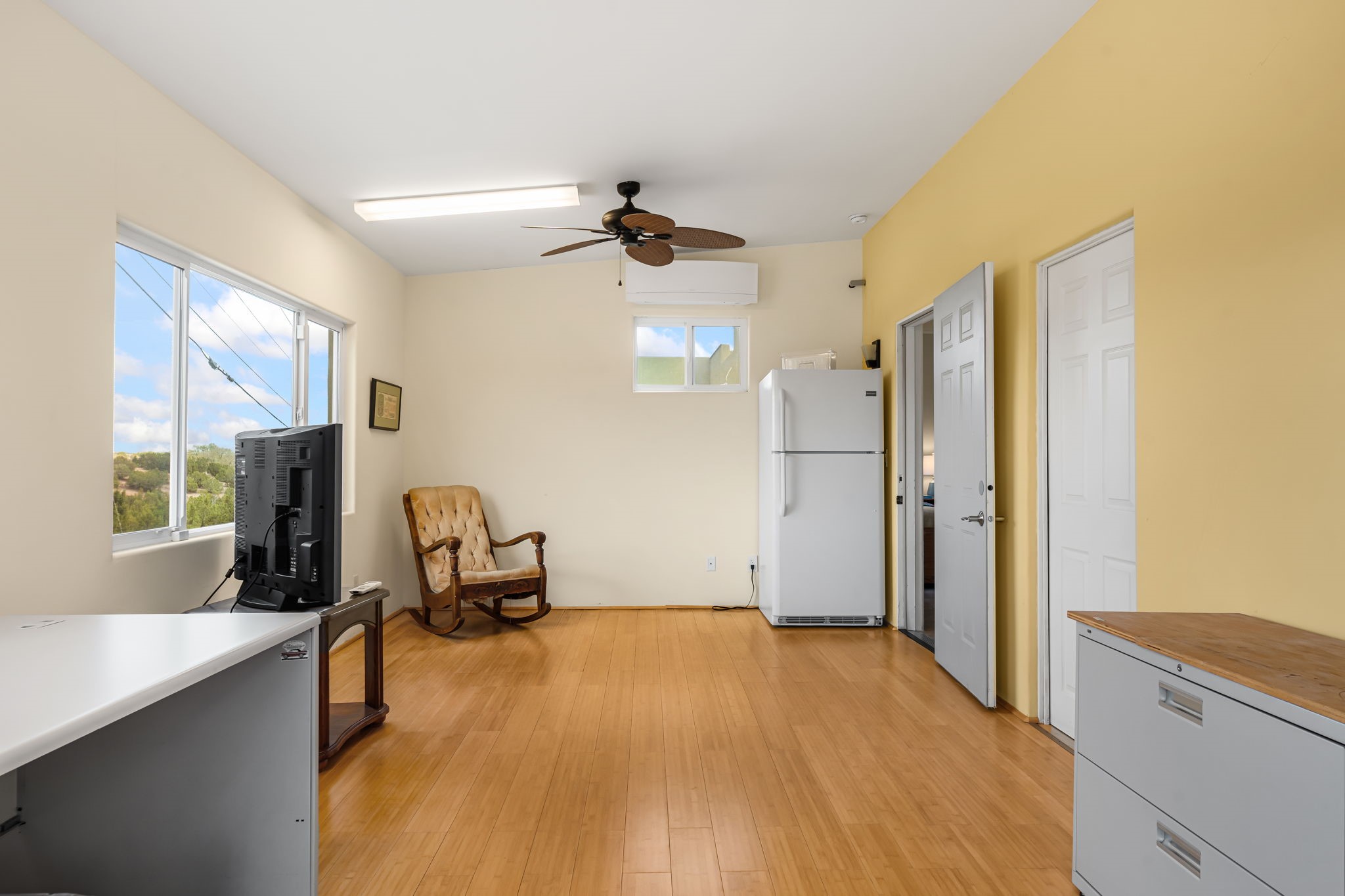 Tucked away on 2.5 tree-covered acres, this private country retreat offers stunning views of the Sangre de Cristo Mountains. Conveniently located south of W. Alameda and just east of San Ysidro Crossing, the property blends tranquility with accessibility.A detached studio--ideal as an office or guest house--features a bath, full kitchen, spacious living/sleeping area, walk-in closet, and an enclosed courtyard with pet access, all with beautiful eastern views. The oversized, finished two-car garage includes abundant windows, a loft, and direct entry.The main home is primarily single-level, offering an open-concept great room and kitchen with high viga ceilings, fireplace, built-in media center, and French doors leading to the east deck. The private primary suite includes a walk-in closet and a spa-like bath with jetted tub and separate shower. A flexible third bedroom with courtyard access is perfect for a home office. Additional highlights include a separate dining area with French doors to the west deck!Truly, MUST SEE!