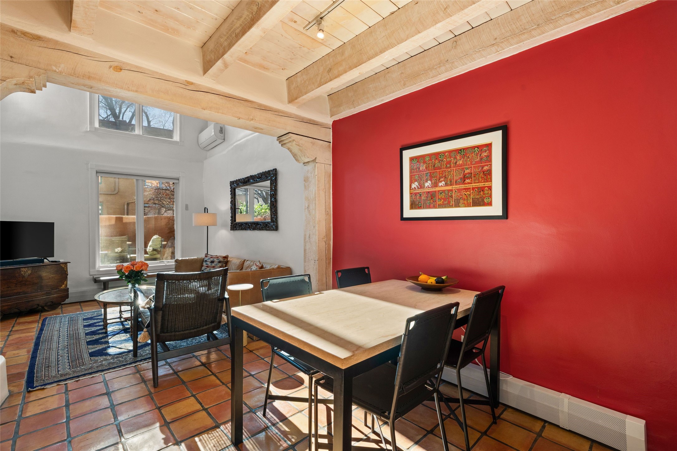 South Capitol 2-bedroom 2 bath condo in Las Brisas with iconic Santa Fe design: hand-carved vigas, Mexican tiling, hickory hard wood stairs, and a kiva fireplace. Perfect for a second home, investment, or a full-time residence. 2-story living room has an abundance of natural light with large south facing windows. Updated kitchen and baths. Main floor includes a bedroom, bath and laundry room with a second bedroom and full bath upstairs. In addition, the second level includes a versatile loft area for an office or studio. Back patio offers expanded living and dining. Newer TPO roof, rear fence, boiler, and refurbished front/back patios. One reserved parking spot with a sign. HOA covers fire insurance, roof, stucco and landscaping. Super convenient location close to the Santa Fe Farmers' Market, The Railyard, Canyon Road art galleries, Museum Hill, the Plaza and much more.
