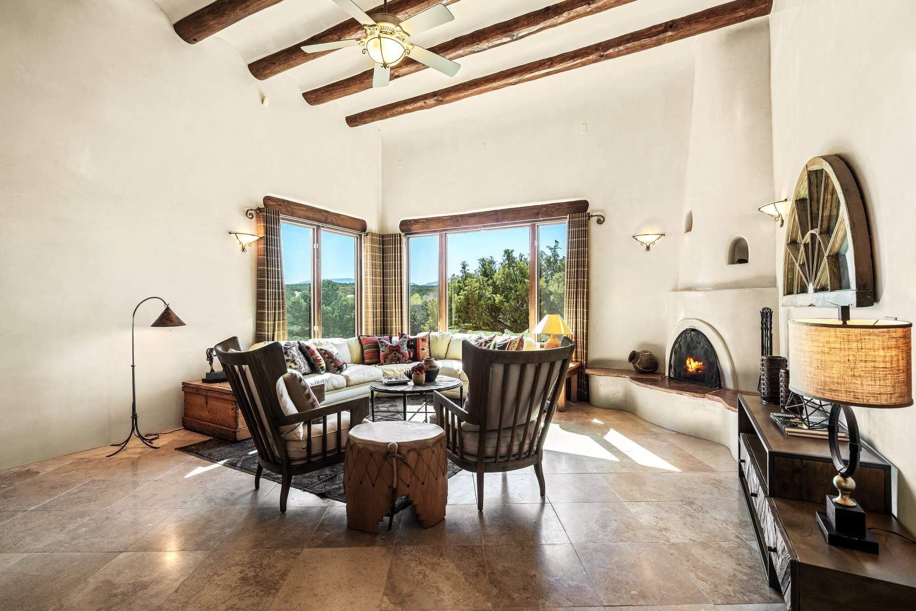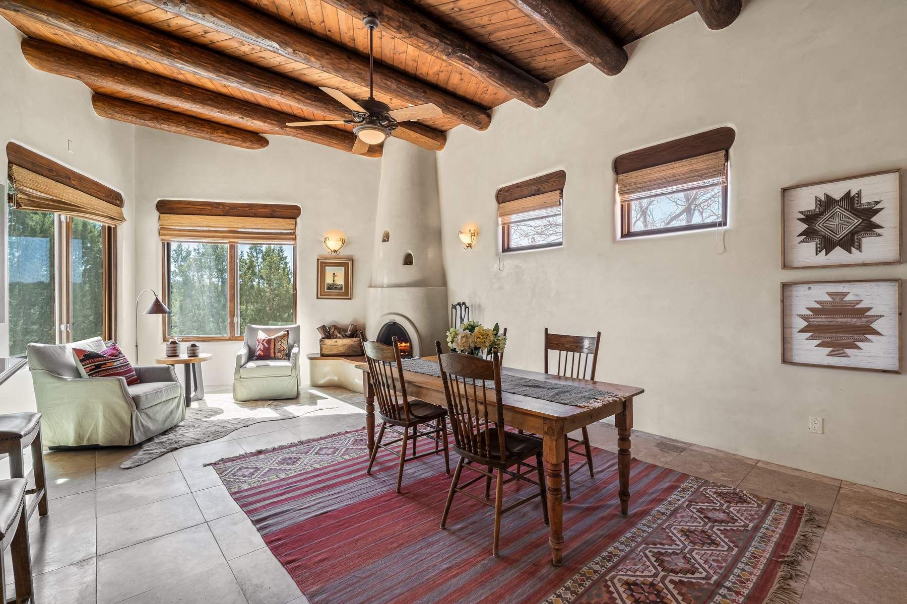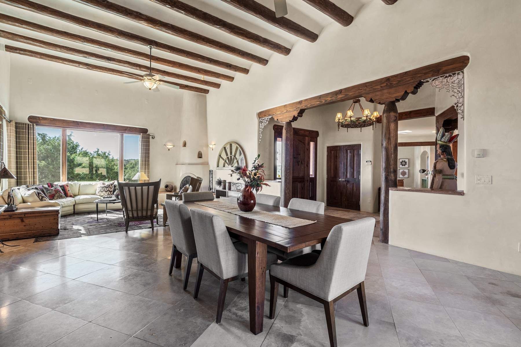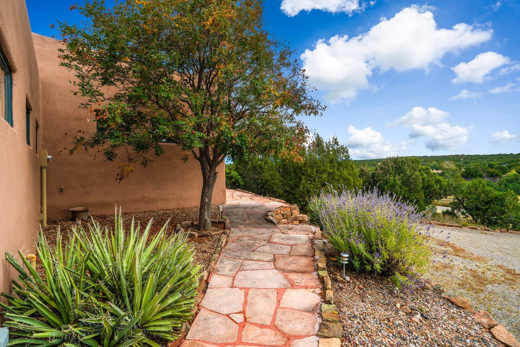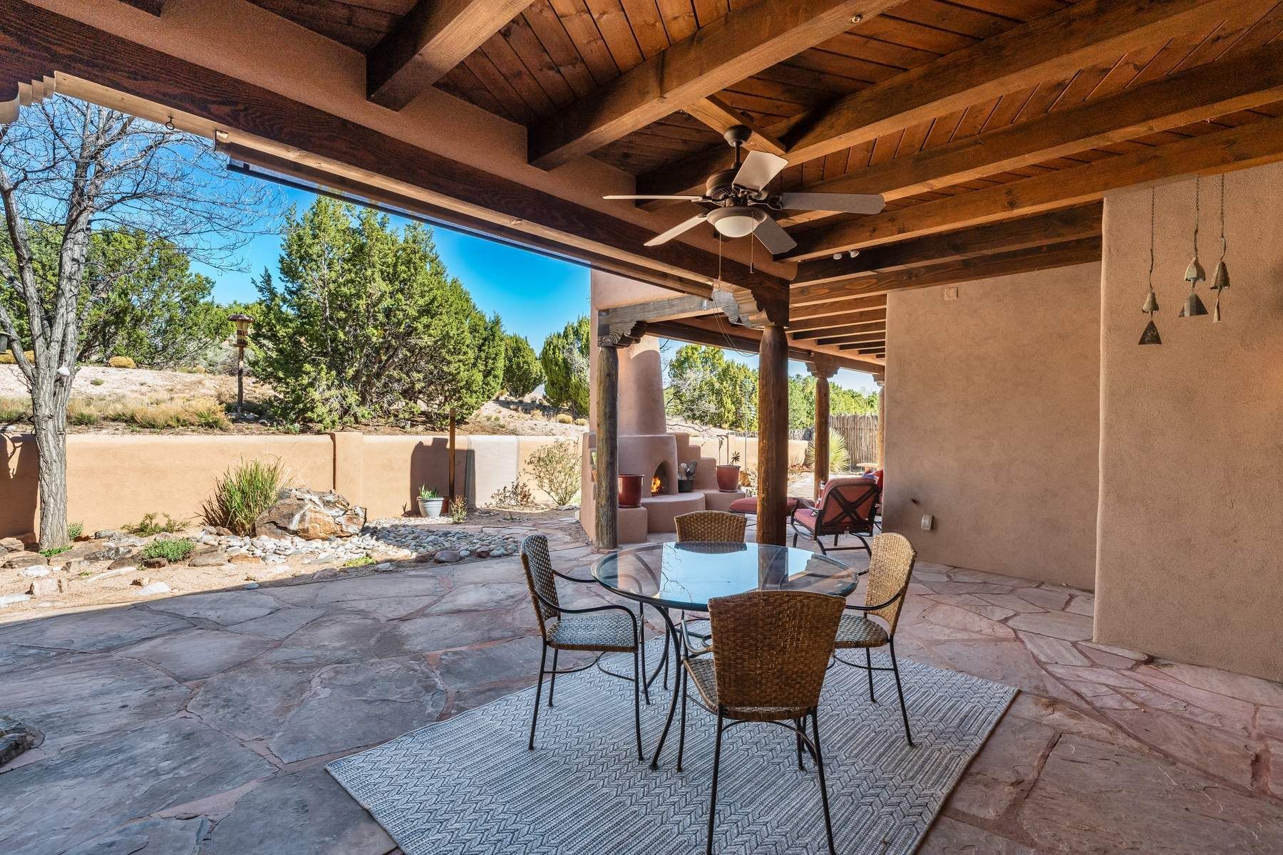 Single-level Pueblo Revival home on 2.86 acres with Sangre de Cristo mountain views, located just 13 minutes from the Santa Fe Plaza. Built in 2005, this 3,486 sq ft residence offers no interior steps, high ceilings, and classic Santa Fe architectural details designed for comfortable living and entertaining. Diamond plaster walls, coved viga ceilings, travertine tile floors, nichos, bancos, skylights, and corbels define the interior, along with four wood-burning kiva fireplaces, including one on the outdoor portal. The great room opens through French doors to a covered rear portal with kiva fireplace, sunshade, and landscaped privacy wall, creating a strong indoor-outdoor living connection. The kitchen features abundant wood cabinetry, granite countertops, a large island with second sink, built-in desk area, and flows into an additional gathering space with its own kiva fireplace. A separate laundry room with sink and cabinetry opens to a side yard with an established herb garden. Three en-suite bedrooms and five bathrooms provide flexibility and privacy. The primary suite includes a kiva fireplace, large walk-in closet, French doors to a portal, and a generous flex space suitable for office, gym, or studio use. ADA-compliant front entry and primary bathroom shower add accessibility. Comfort systems include in-floor radiant heating and evaporative cooling. Recent improvements include full re-stucco of the home and rear privacy wall (2023) and partial TPO roof replacement (2023). Additional features include a heated 3-car garage with RV bay, workshop or studio space, central vacuum, ample parking, rock fountain, native plant landscaping, and flagstone walkways. Located near La Tierra trail access and with no HOA, this property offers a combination of single-level living, acreage, architectural detail, and proximity to Santa Fe.