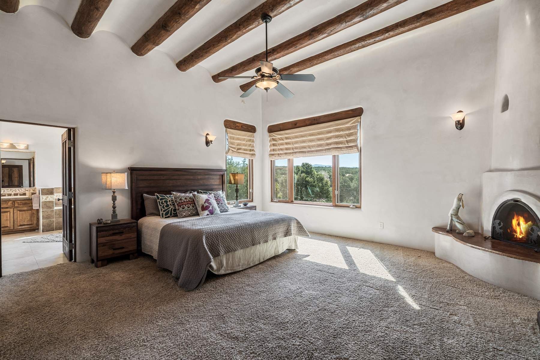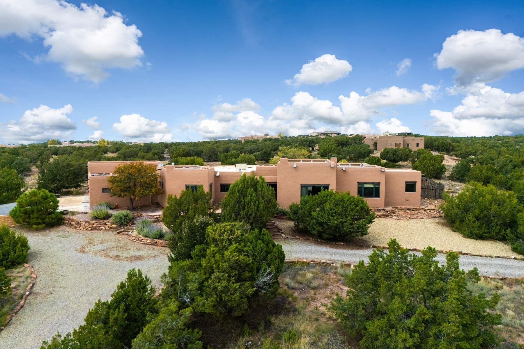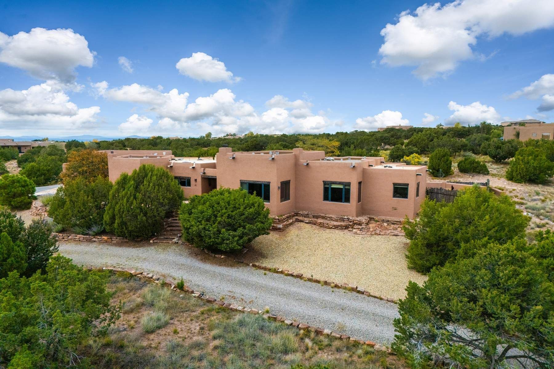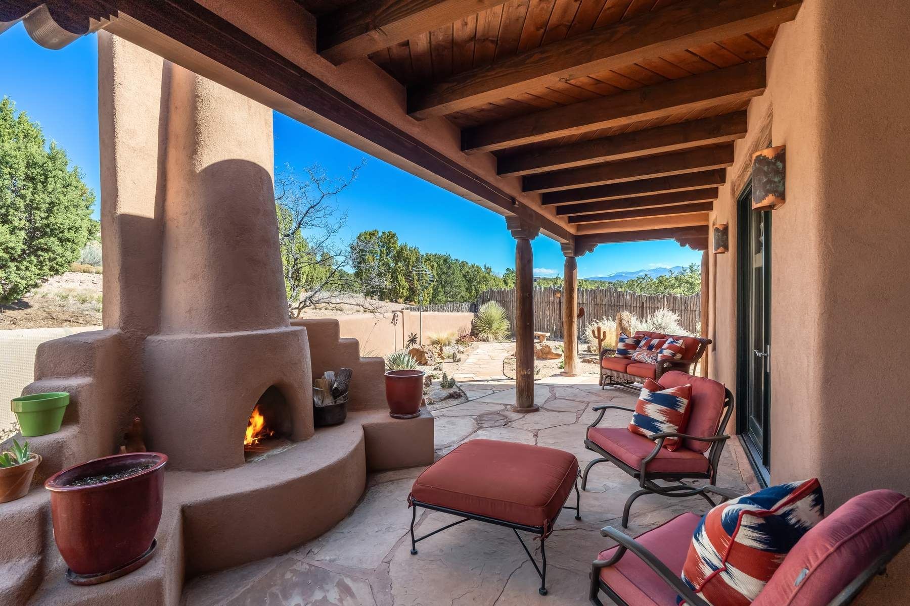 Single-level Pueblo Revival home on 2.86 acres with Sangre de Cristo mountain views, located just 13 minutes from the Santa Fe Plaza. Built in 2005, this 3,486 sq ft residence offers no interior steps, high ceilings, and classic Santa Fe architectural details designed for comfortable living and entertaining. Diamond plaster walls, coved viga ceilings, travertine tile floors, nichos, bancos, skylights, and corbels define the interior, along with four wood-burning kiva fireplaces, including one on the outdoor portal. The great room opens through French doors to a covered rear portal with kiva fireplace, sunshade, and landscaped privacy wall, creating a strong indoor-outdoor living connection. The kitchen features abundant wood cabinetry, granite countertops, a large island with second sink, built-in desk area, and flows into an additional gathering space with its own kiva fireplace. A separate laundry room with sink and cabinetry opens to a side yard with an established herb garden. Three en-suite bedrooms and five bathrooms provide flexibility and privacy. The primary suite includes a kiva fireplace, large walk-in closet, French doors to a portal, and a generous flex space suitable for office, gym, or studio use. ADA-compliant front entry and primary bathroom shower add accessibility. Comfort systems include in-floor radiant heating and evaporative cooling. Recent improvements include full re-stucco of the home and rear privacy wall (2023) and partial TPO roof replacement (2023). Additional features include a heated 3-car garage with RV bay, workshop or studio space, central vacuum, ample parking, rock fountain, native plant landscaping, and flagstone walkways. Located near La Tierra trail access and with no HOA, this property offers a combination of single-level living, acreage, architectural detail, and proximity to Santa Fe.