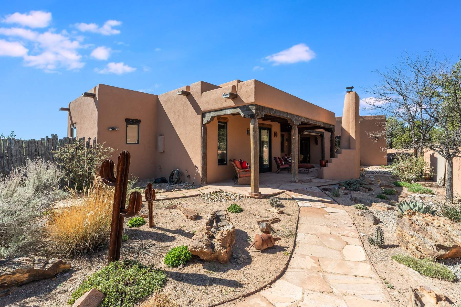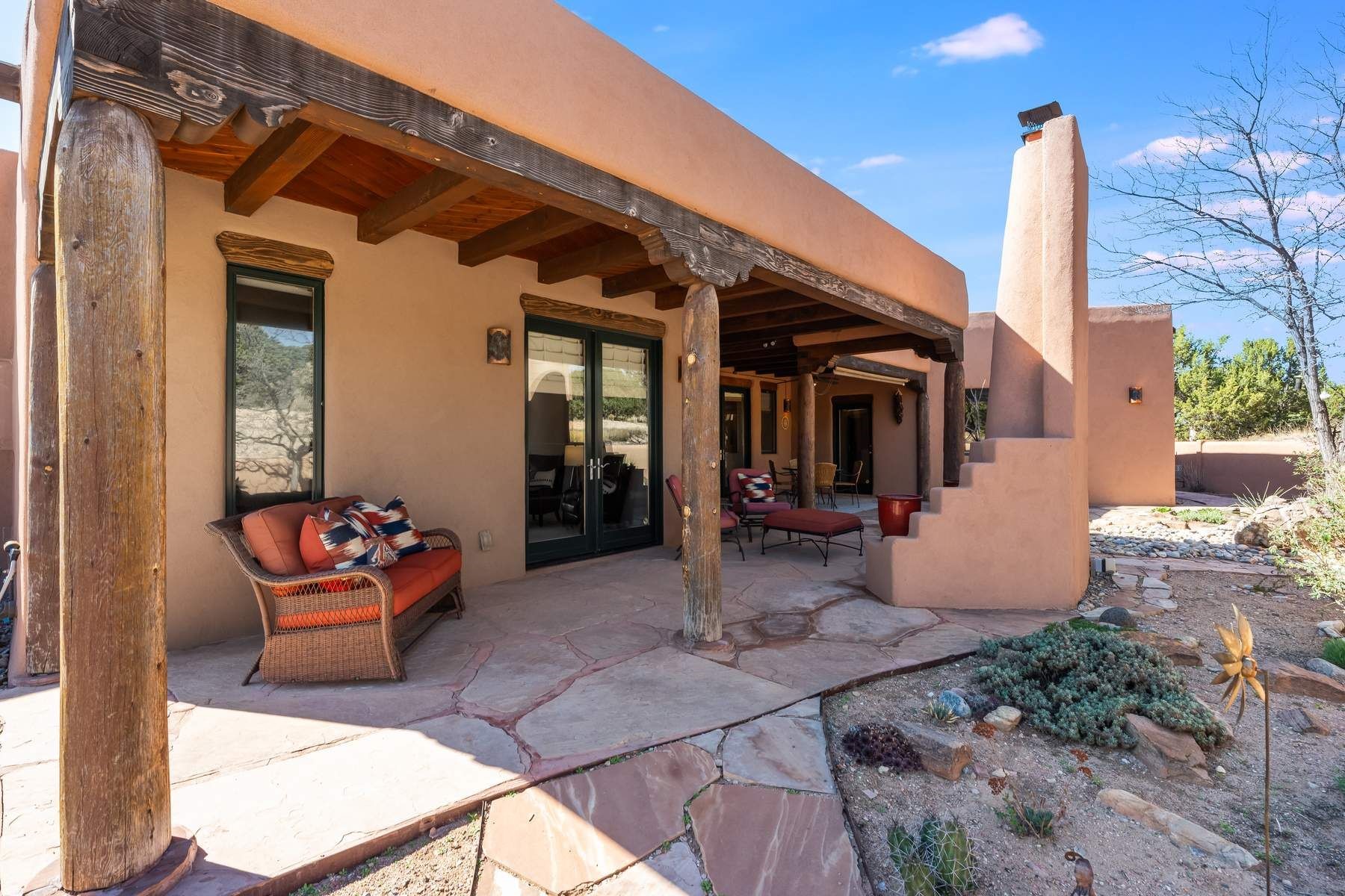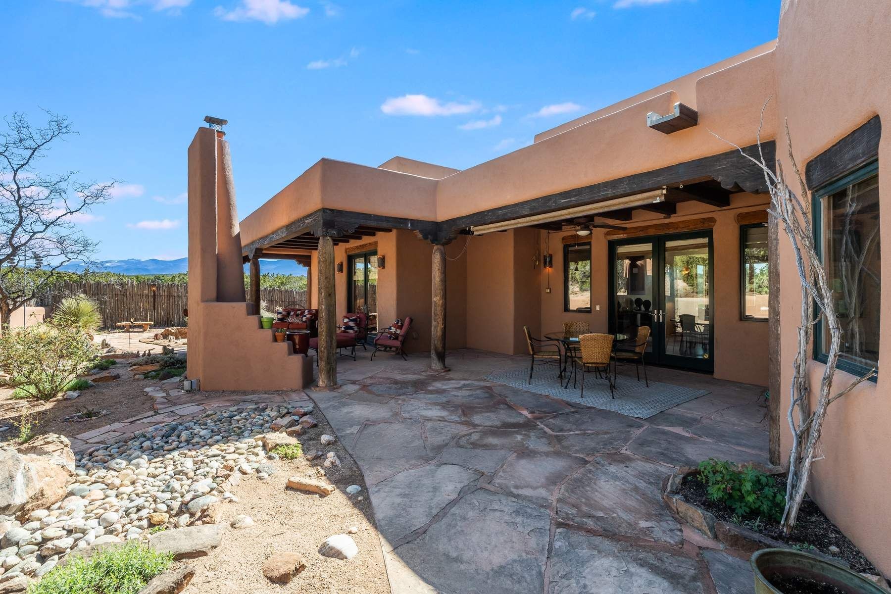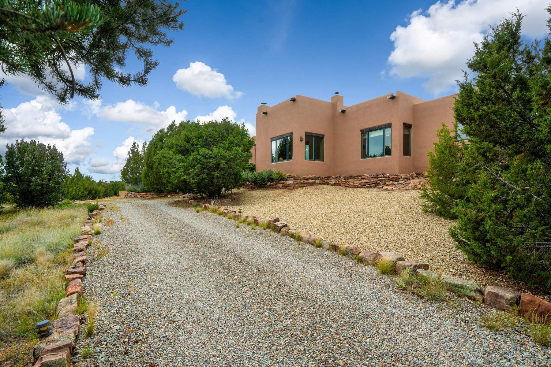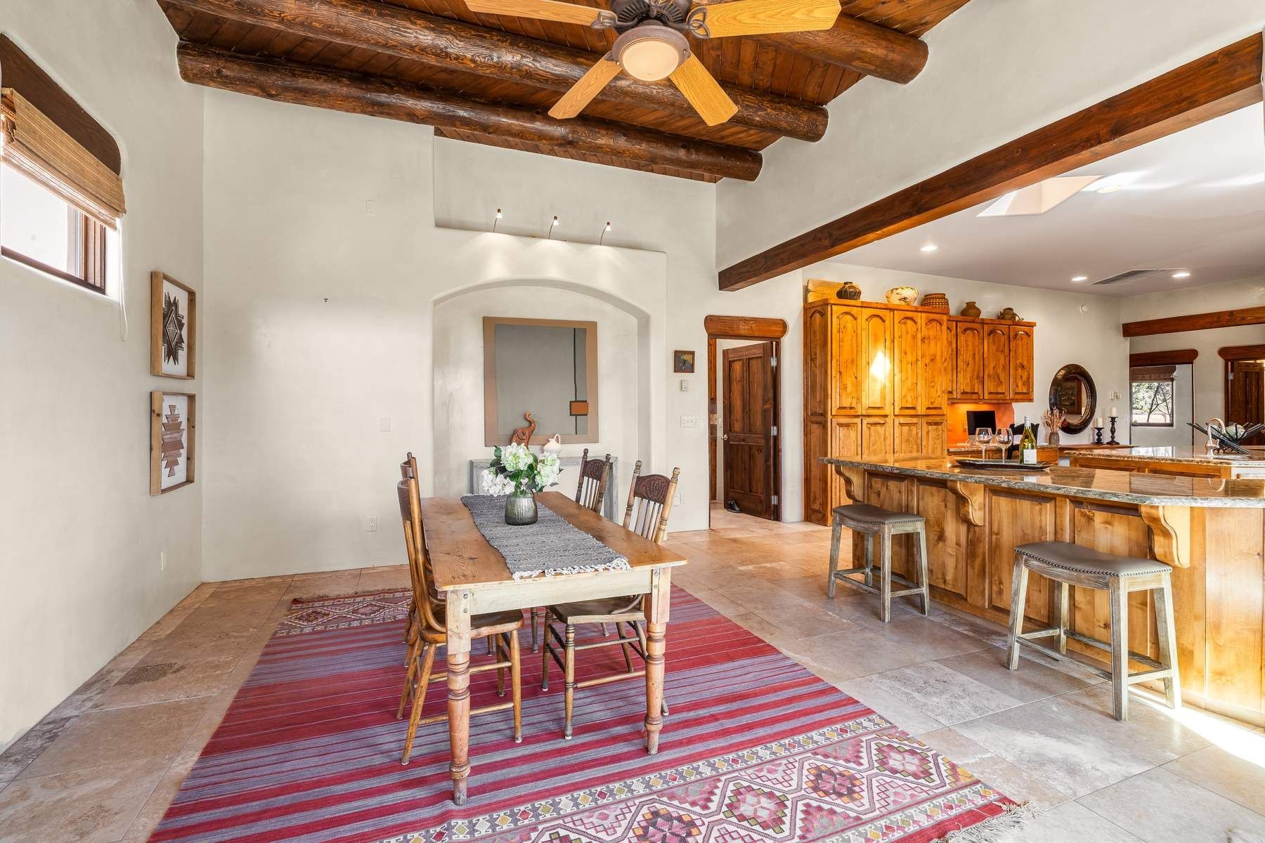 Single-level Pueblo Revival home on 2.86 acres with Sangre de Cristo mountain views, located just 13 minutes from the Santa Fe Plaza. Built in 2005, this 3,486 sq ft residence offers no interior steps, high ceilings, and classic Santa Fe architectural details designed for comfortable living and entertaining. Diamond plaster walls, coved viga ceilings, travertine tile floors, nichos, bancos, skylights, and corbels define the interior, along with four wood-burning kiva fireplaces, including one on the outdoor portal. The great room opens through French doors to a covered rear portal with kiva fireplace, sunshade, and landscaped privacy wall, creating a strong indoor-outdoor living connection. The kitchen features abundant wood cabinetry, granite countertops, a large island with second sink, built-in desk area, and flows into an additional gathering space with its own kiva fireplace. A separate laundry room with sink and cabinetry opens to a side yard with an established herb garden. Three en-suite bedrooms and five bathrooms provide flexibility and privacy. The primary suite includes a kiva fireplace, large walk-in closet, French doors to a portal, and a generous flex space suitable for office, gym, or studio use. ADA-compliant front entry and primary bathroom shower add accessibility. Comfort systems include in-floor radiant heating and evaporative cooling. Recent improvements include full re-stucco of the home and rear privacy wall (2023) and partial TPO roof replacement (2023). Additional features include a heated 3-car garage with RV bay, workshop or studio space, central vacuum, ample parking, rock fountain, native plant landscaping, and flagstone walkways. Located near La Tierra trail access and with no HOA, this property offers a combination of single-level living, acreage, architectural detail, and proximity to Santa Fe.