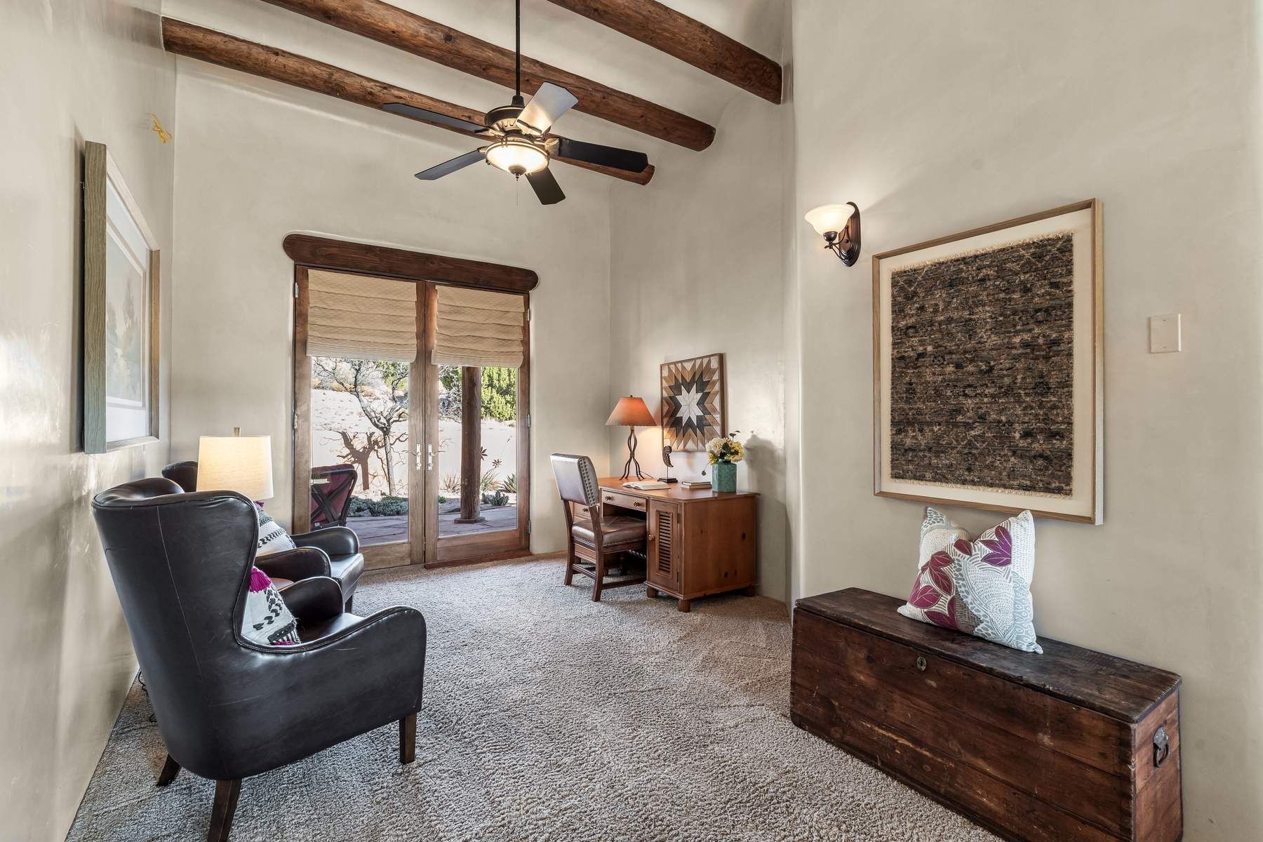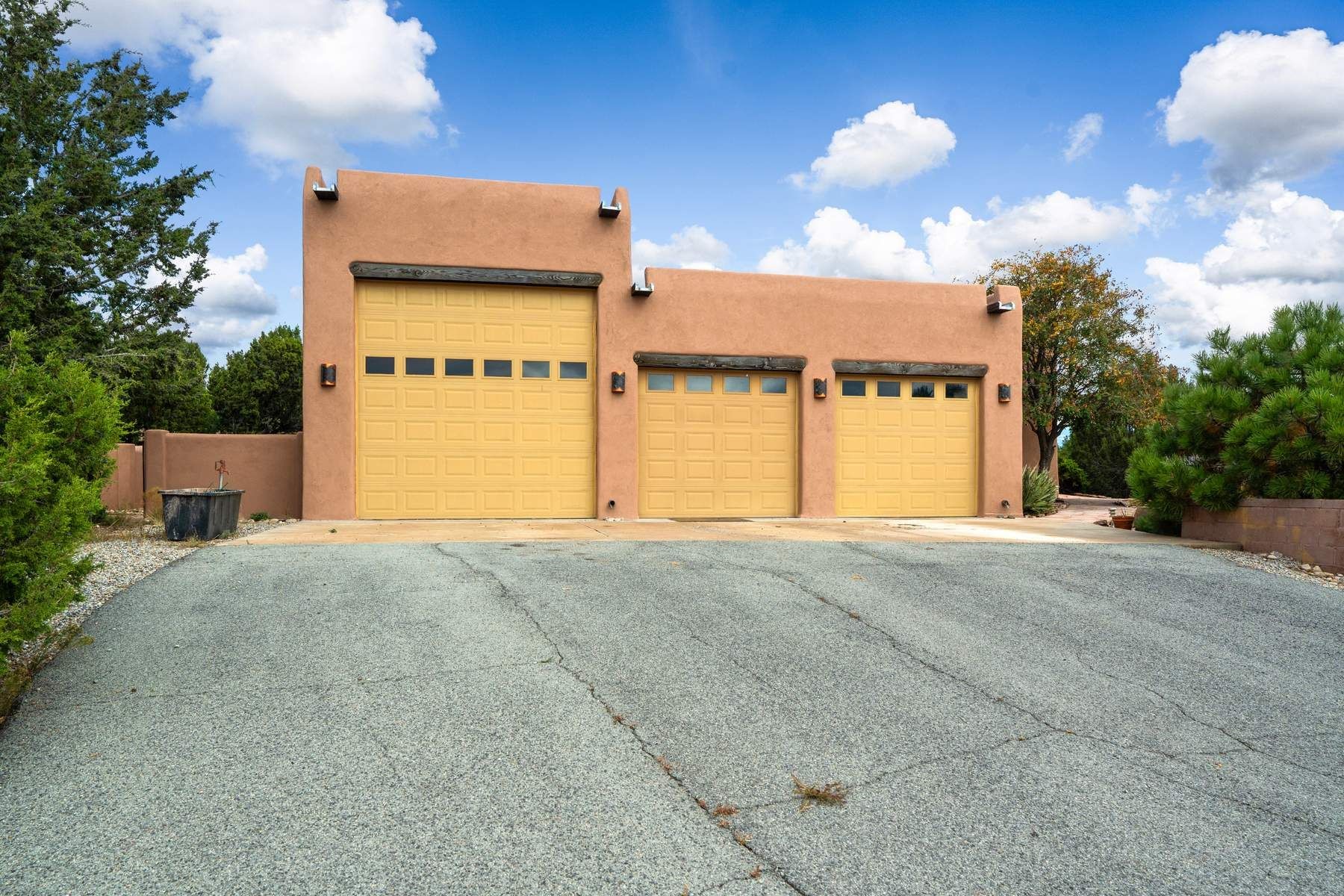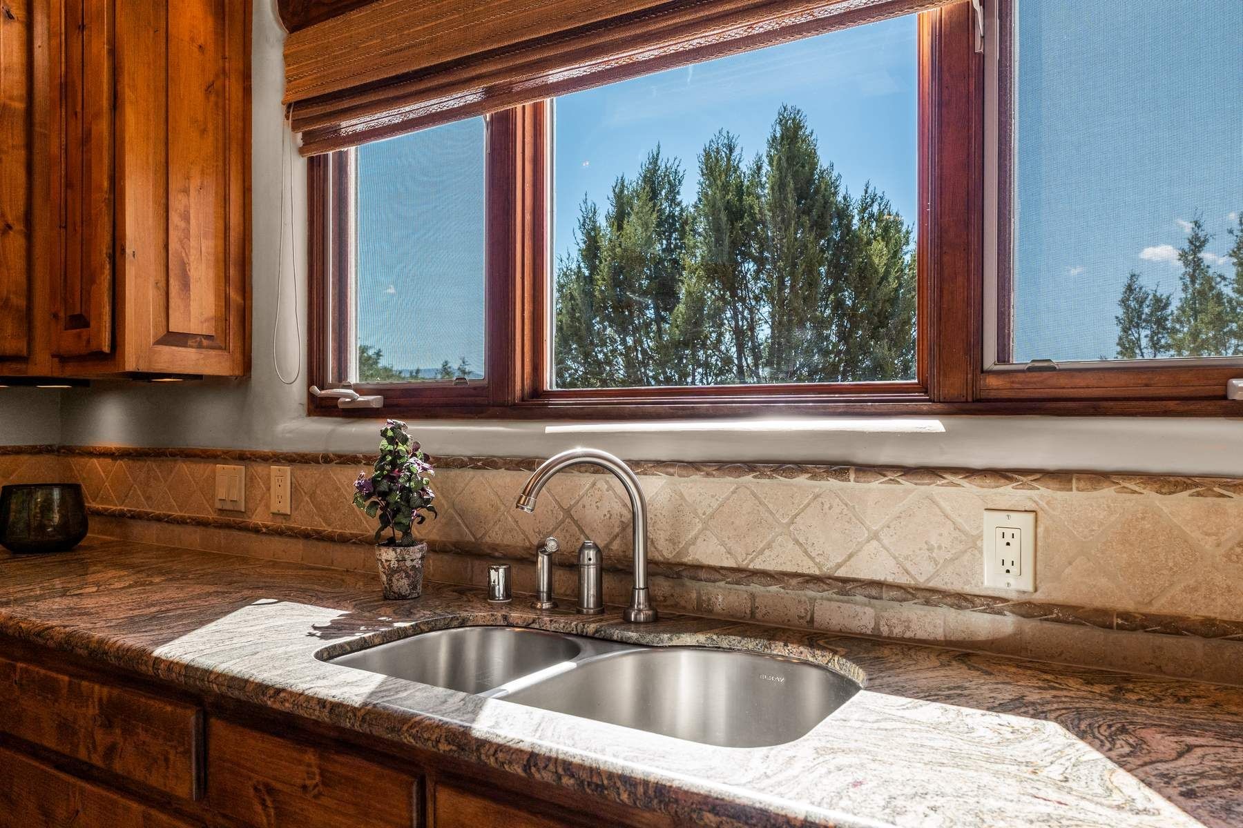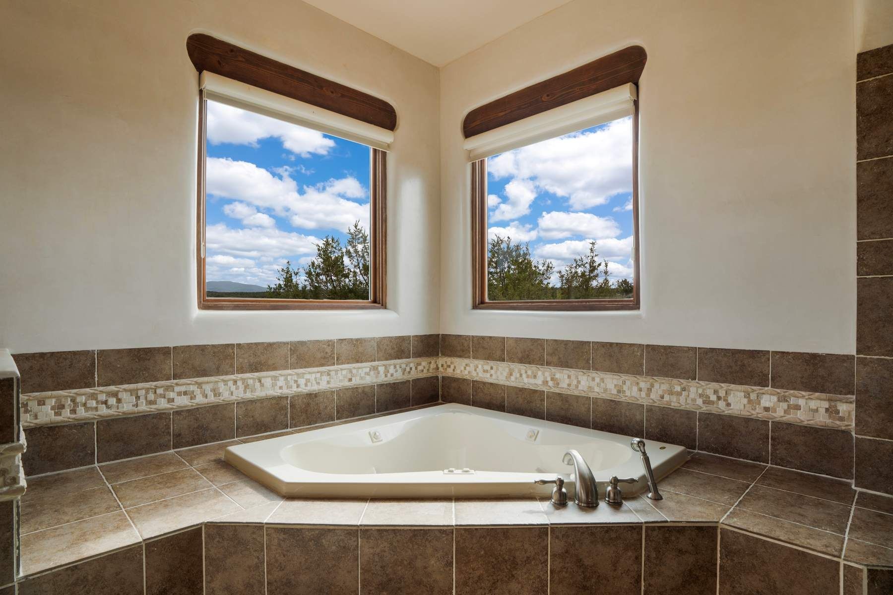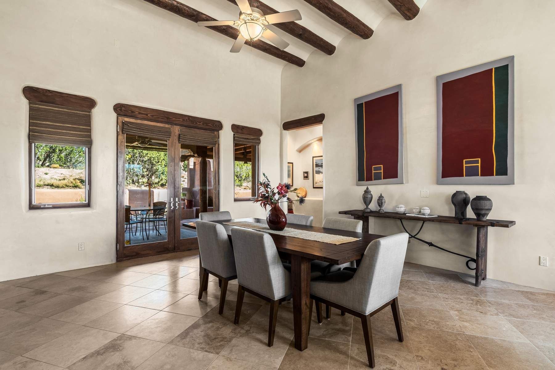 Single-level Pueblo Revival home on 2.86 acres with Sangre de Cristo mountain views, located just 13 minutes from the Santa Fe Plaza. Built in 2005, this 3,486 sq ft residence offers no interior steps, high ceilings, and classic Santa Fe architectural details designed for comfortable living and entertaining. Diamond plaster walls, coved viga ceilings, travertine tile floors, nichos, bancos, skylights, and corbels define the interior, along with four wood-burning kiva fireplaces, including one on the outdoor portal. The great room opens through French doors to a covered rear portal with kiva fireplace, sunshade, and landscaped privacy wall, creating a strong indoor-outdoor living connection. The kitchen features abundant wood cabinetry, granite countertops, a large island with second sink, built-in desk area, and flows into an additional gathering space with its own kiva fireplace. A separate laundry room with sink and cabinetry opens to a side yard with an established herb garden. Three en-suite bedrooms and five bathrooms provide flexibility and privacy. The primary suite includes a kiva fireplace, large walk-in closet, French doors to a portal, and a generous flex space suitable for office, gym, or studio use. ADA-compliant front entry and primary bathroom shower add accessibility. Comfort systems include in-floor radiant heating and evaporative cooling. Recent improvements include full re-stucco of the home and rear privacy wall (2023) and partial TPO roof replacement (2023). Additional features include a heated 3-car garage with RV bay, workshop or studio space, central vacuum, ample parking, rock fountain, native plant landscaping, and flagstone walkways. Located near La Tierra trail access and with no HOA, this property offers a combination of single-level living, acreage, architectural detail, and proximity to Santa Fe.