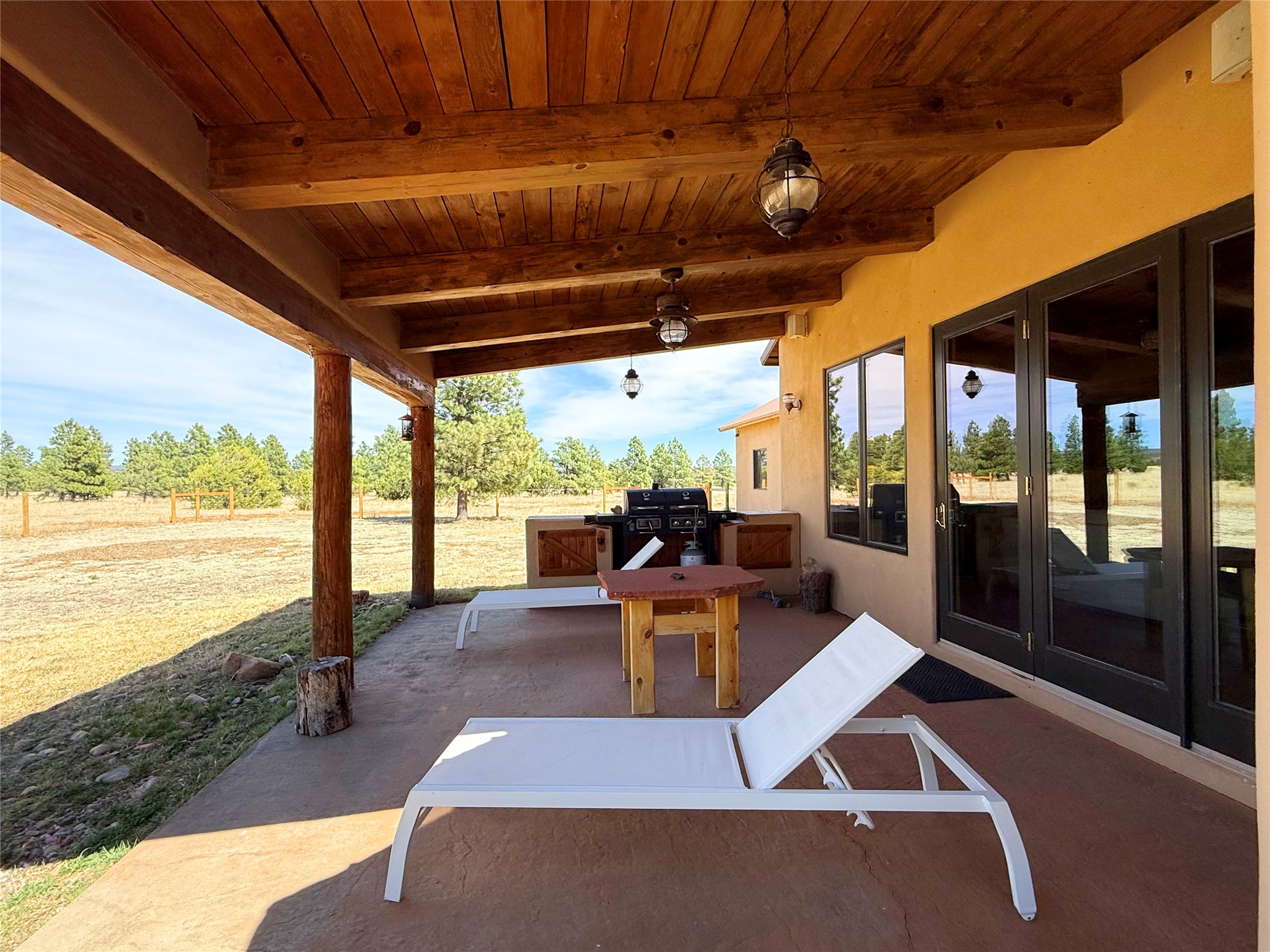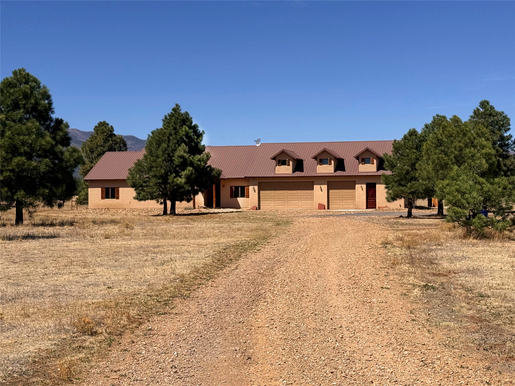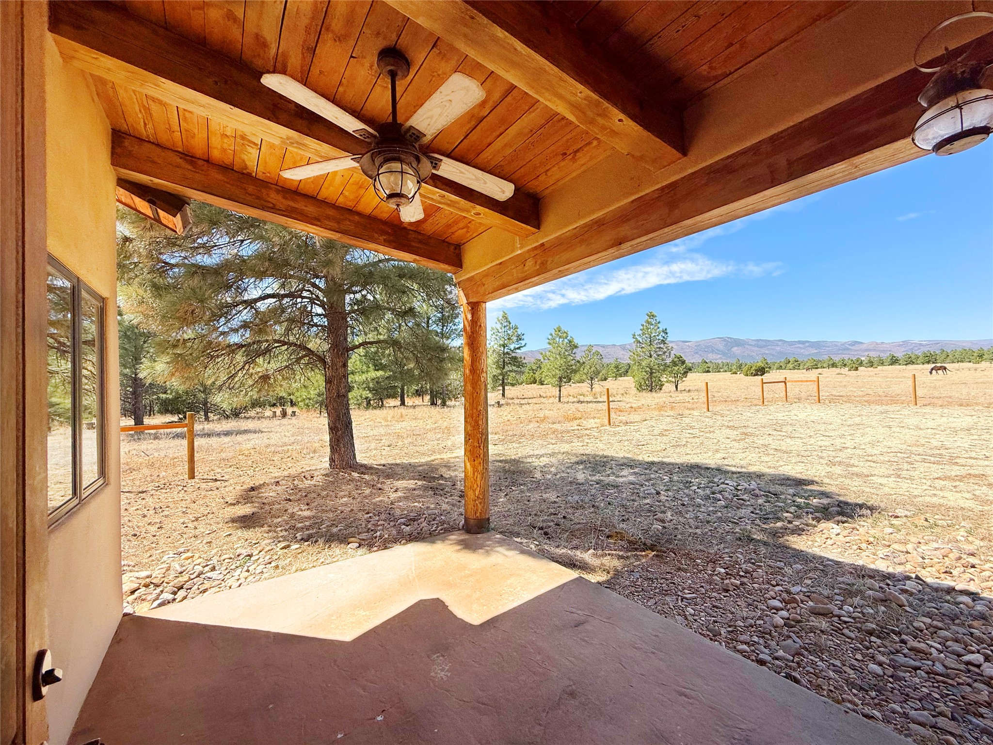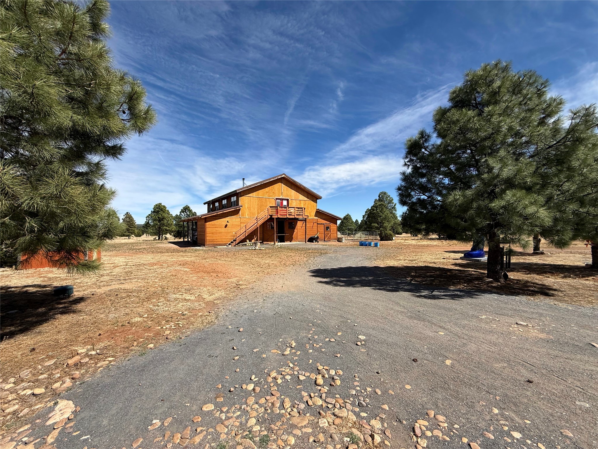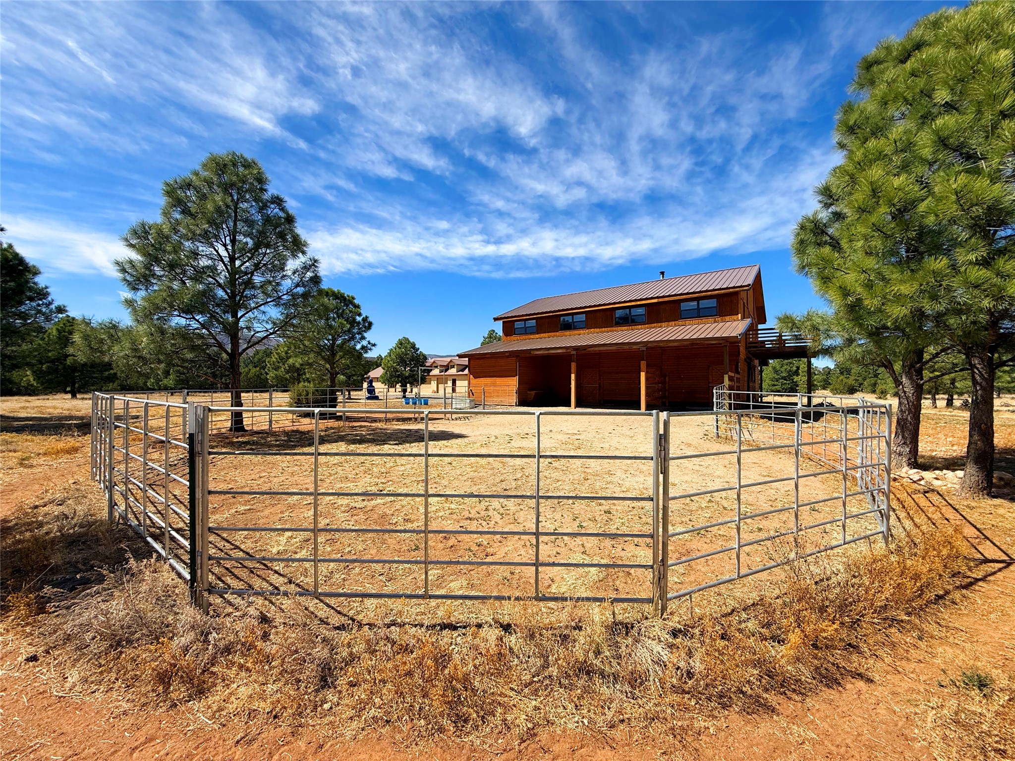 Tara Ranch is a substantially built Northern New Mexico ranch property offering privacy, scale, and exceptional equestrian improvements on 20 fully fenced, mostly flat acres. From the gated entrance, a beautiful quarter-mile private driveway leads to the 3,400+square-foot main home and the impressive barn. Built in 2006, the one-level home features 12-foot ceilings, diamond-finish walls, arches, and large beams throughout, creating a spacious feel with oversized rooms and generous living areas. The open main living, dining, and kitchen spaces take in magnificent views and connect easily to a covered portal for outdoor dining, grilling, and enjoying the landscape. The chef's kitchen is well equipped with two ovens, a large gas cooktop with griddle, two sinks, wild stone granite counters, stainless steel appliances, large pantry, and abundant cabinetry. The layout is practical and comfortable, with the primary suite, office or media room, and one guest bedroom on the west wing, while two additional bedrooms and a Jack-and-Jill bath are on the east wing. The heated 3+ car garage, radiant floor heat, fenced backyard, updated boiler in 2024, hot water heater in 2022, private well, and water softener add everyday function and value. Completed in 2025, the state-of-the-art 6-stall Barn Pros equestrian facility includes rubber flooring, tack room, workshop, hay storage, wash area, fenced 45x60 corral, RV covered parking, and a 1,600-square-foot apartment above. Surrounded on three sides by a 2,500-acre private ranch, with sweeping Hermit's Peak views and easy access to riding trails, Tara Ranch is well situated for access to Santa Fe and Las Vegas NM.