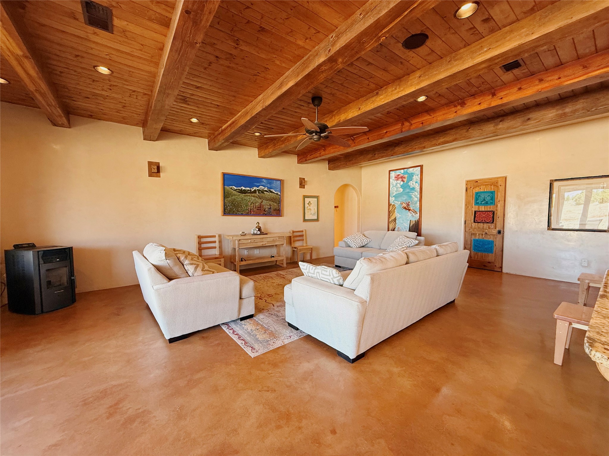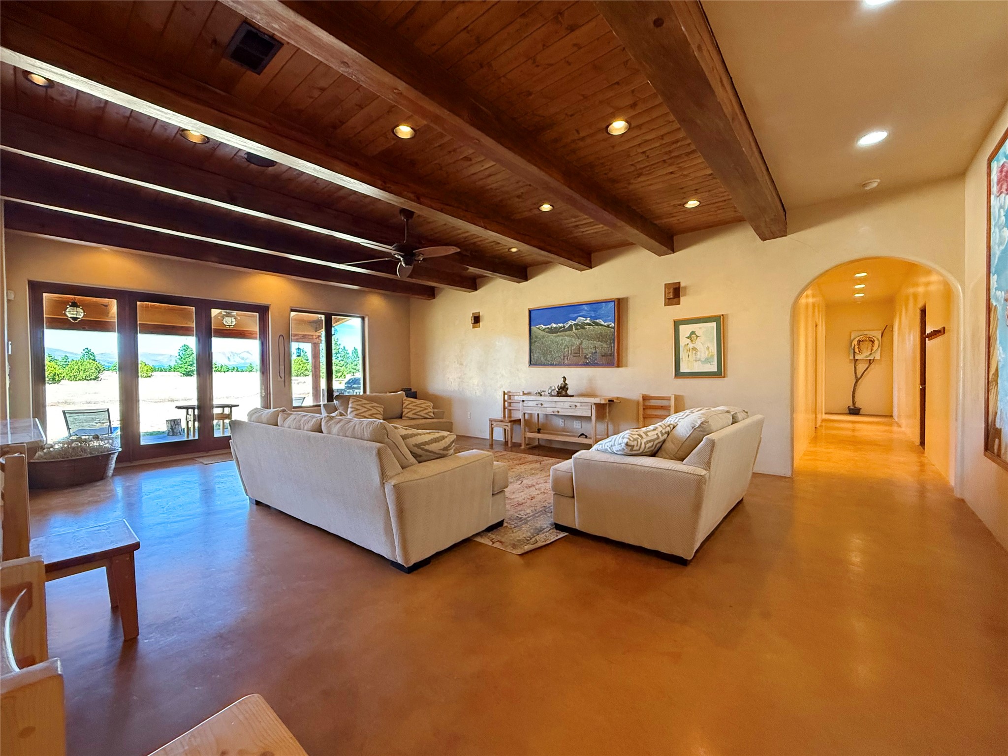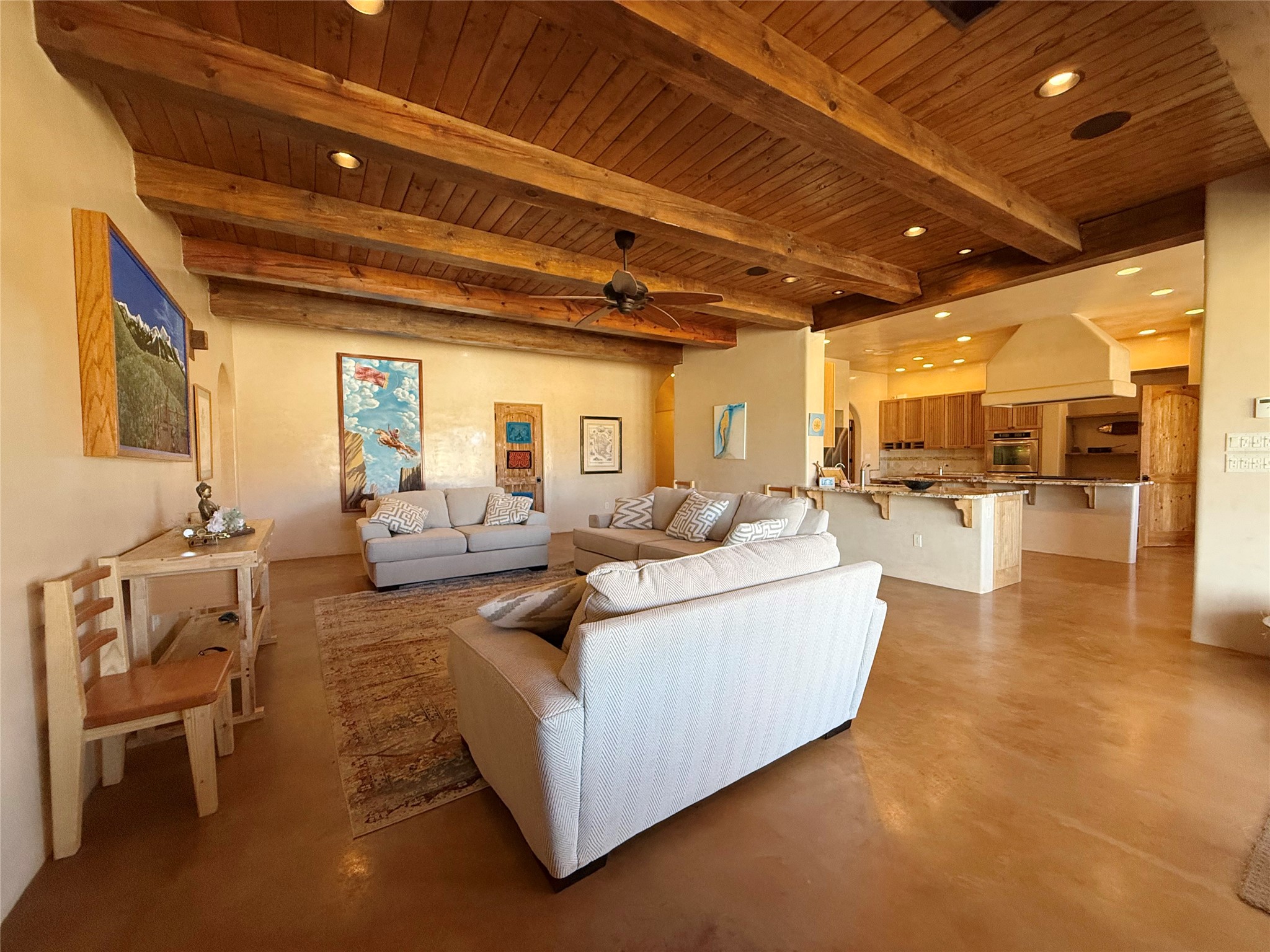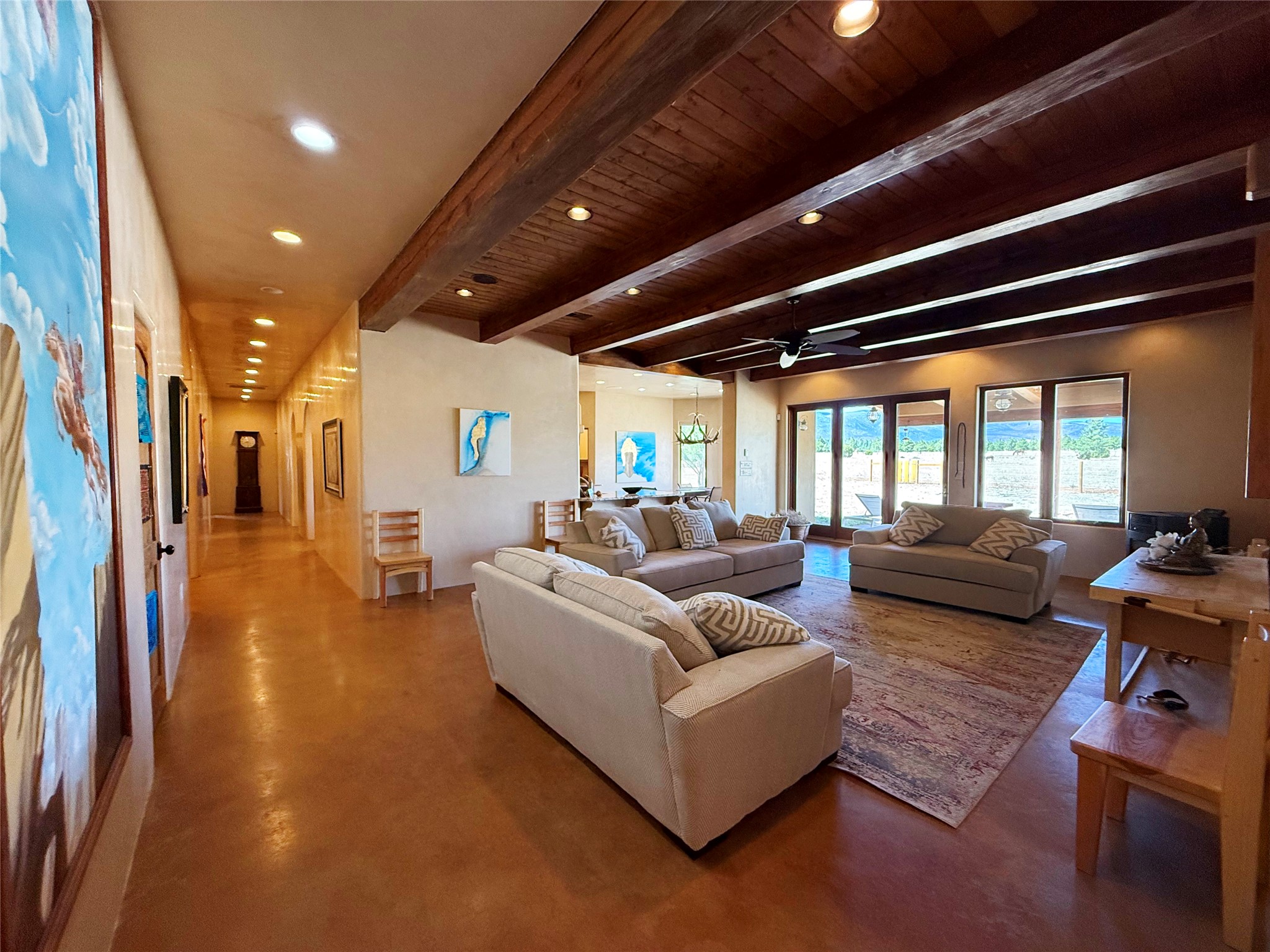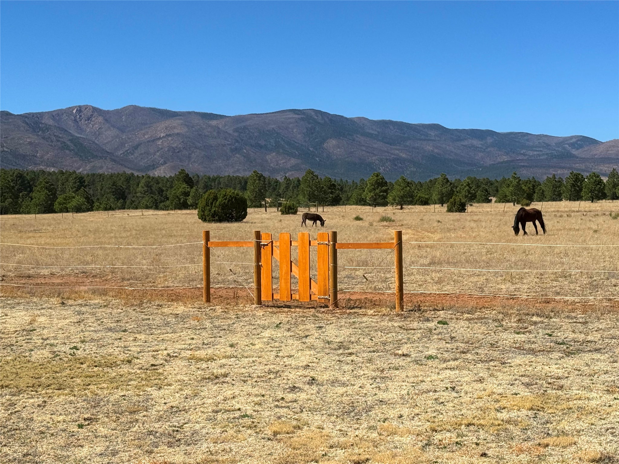 Tara Ranch is a substantially built Northern New Mexico ranch property offering privacy, scale, and exceptional equestrian improvements on 20 fully fenced, mostly flat acres. From the gated entrance, a beautiful quarter-mile private driveway leads to the 3,400+square-foot main home and the impressive barn. Built in 2006, the one-level home features 12-foot ceilings, diamond-finish walls, arches, and large beams throughout, creating a spacious feel with oversized rooms and generous living areas. The open main living, dining, and kitchen spaces take in magnificent views and connect easily to a covered portal for outdoor dining, grilling, and enjoying the landscape. The chef's kitchen is well equipped with two ovens, a large gas cooktop with griddle, two sinks, wild stone granite counters, stainless steel appliances, large pantry, and abundant cabinetry. The layout is practical and comfortable, with the primary suite, office or media room, and one guest bedroom on the west wing, while two additional bedrooms and a Jack-and-Jill bath are on the east wing. The heated 3+ car garage, radiant floor heat, fenced backyard, updated boiler in 2024, hot water heater in 2022, private well, and water softener add everyday function and value. Completed in 2025, the state-of-the-art 6-stall Barn Pros equestrian facility includes rubber flooring, tack room, workshop, hay storage, wash area, fenced 45x60 corral, RV covered parking, and a 1,600-square-foot apartment above. Surrounded on three sides by a 2,500-acre private ranch, with sweeping Hermit's Peak views and easy access to riding trails, Tara Ranch is well situated for access to Santa Fe and Las Vegas NM.