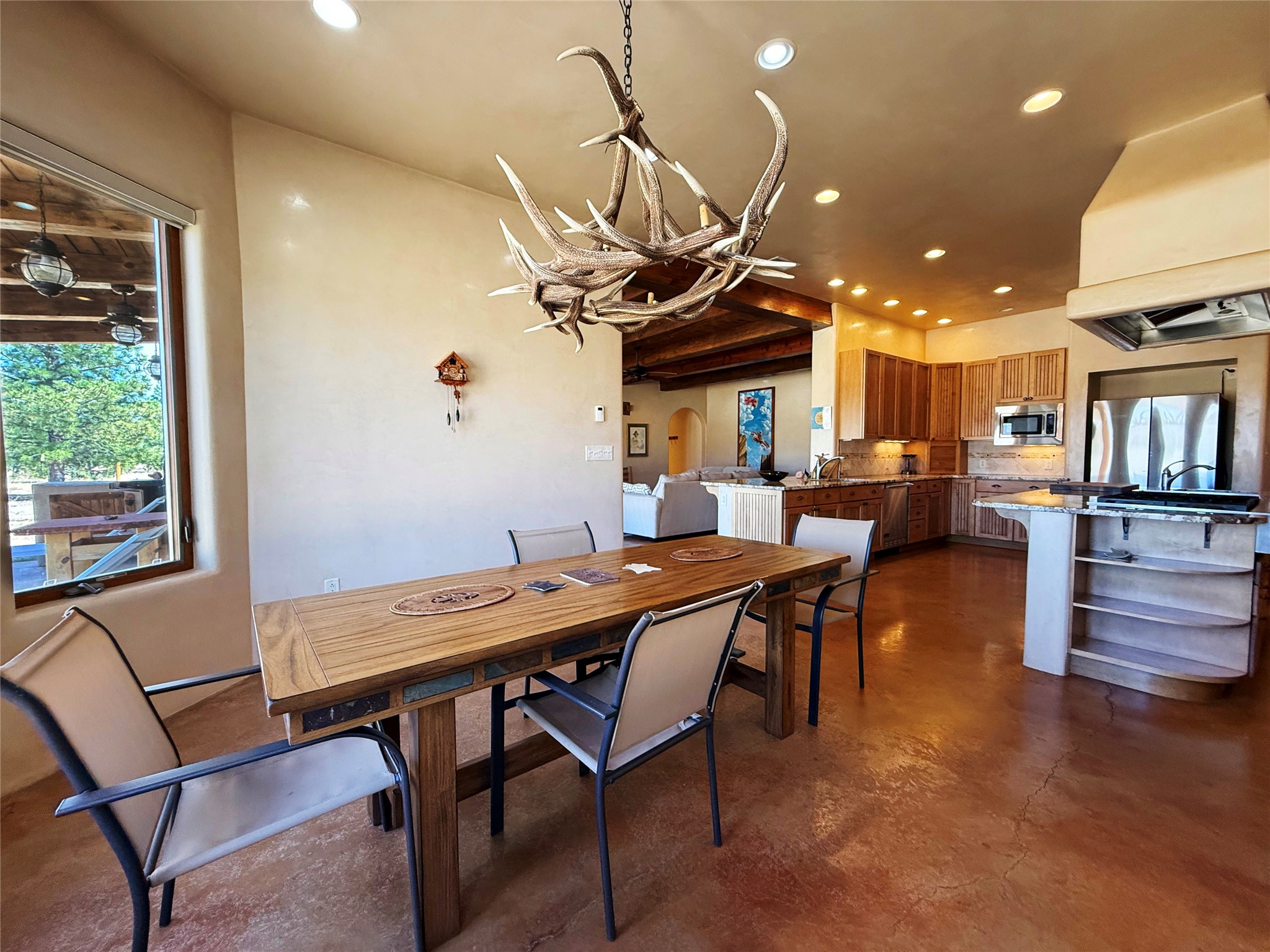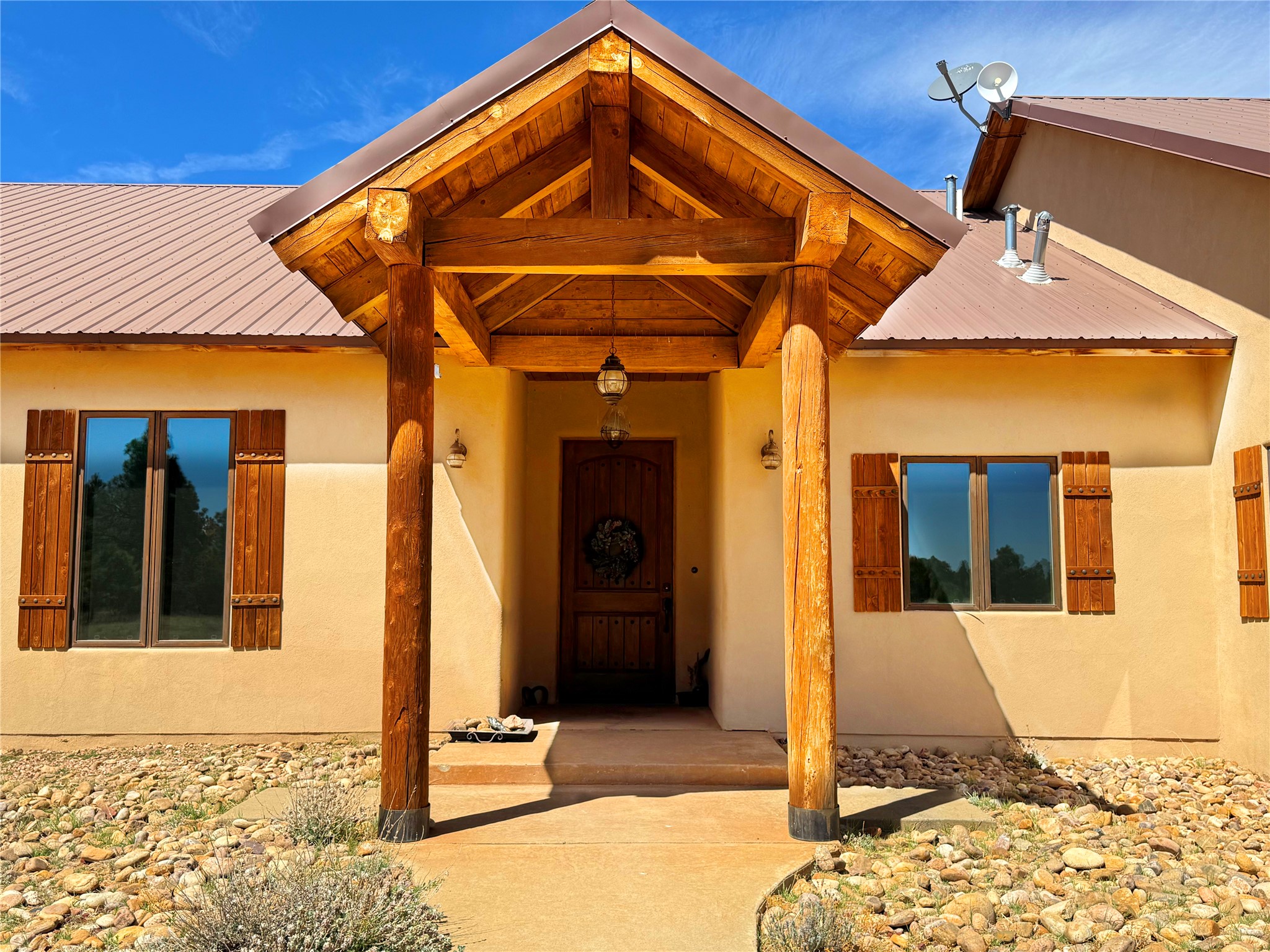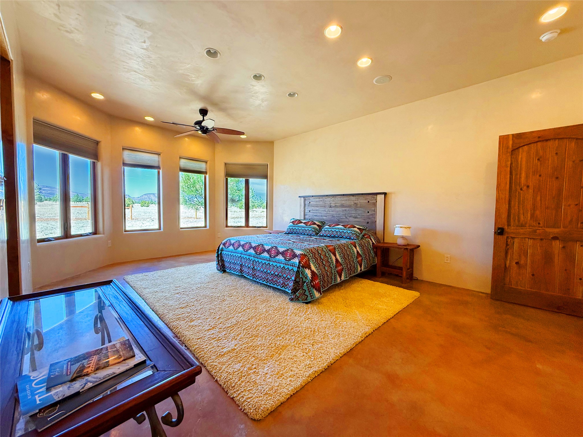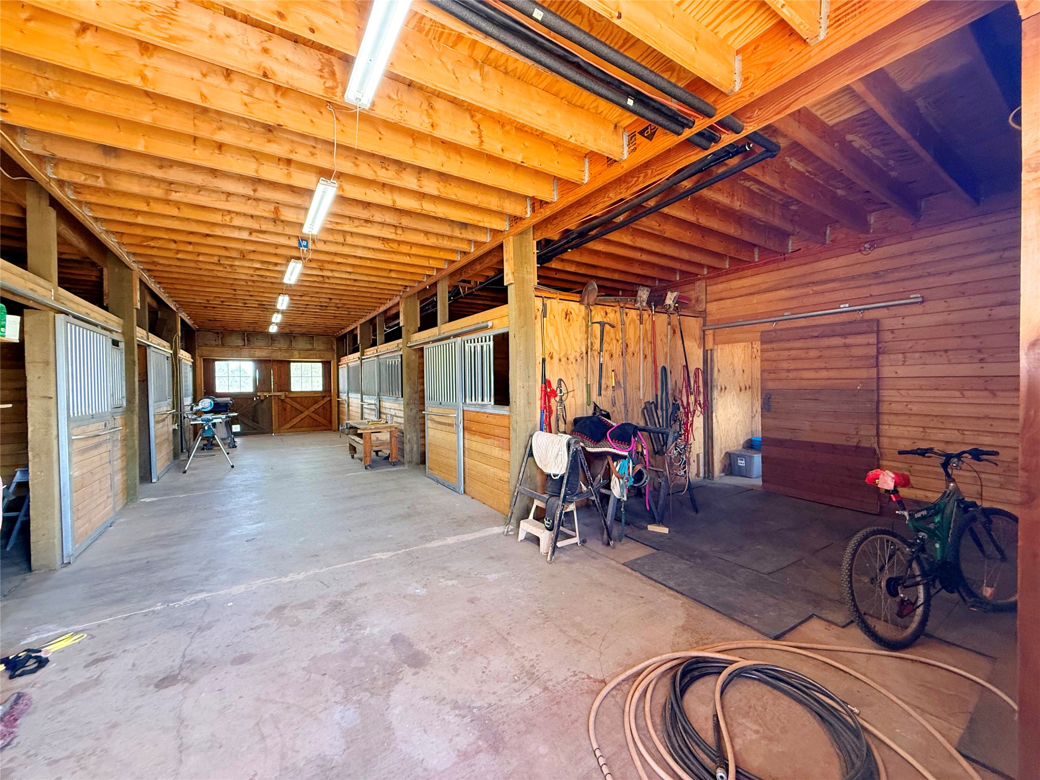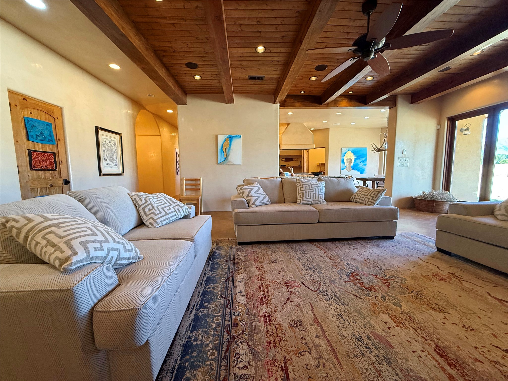 Tara Ranch is a substantially built Northern New Mexico ranch property offering privacy, scale, and exceptional equestrian improvements on 20 fully fenced, mostly flat acres. From the gated entrance, a beautiful quarter-mile private driveway leads to the 3,400+square-foot main home and the impressive barn. Built in 2006, the one-level home features 12-foot ceilings, diamond-finish walls, arches, and large beams throughout, creating a spacious feel with oversized rooms and generous living areas. The open main living, dining, and kitchen spaces take in magnificent views and connect easily to a covered portal for outdoor dining, grilling, and enjoying the landscape. The chef's kitchen is well equipped with two ovens, a large gas cooktop with griddle, two sinks, wild stone granite counters, stainless steel appliances, large pantry, and abundant cabinetry. The layout is practical and comfortable, with the primary suite, office or media room, and one guest bedroom on the west wing, while two additional bedrooms and a Jack-and-Jill bath are on the east wing. The heated 3+ car garage, radiant floor heat, fenced backyard, updated boiler in 2024, hot water heater in 2022, private well, and water softener add everyday function and value. Completed in 2025, the state-of-the-art 6-stall Barn Pros equestrian facility includes rubber flooring, tack room, workshop, hay storage, wash area, fenced 45x60 corral, RV covered parking, and a 1,600-square-foot apartment above. Surrounded on three sides by a 2,500-acre private ranch, with sweeping Hermit's Peak views and easy access to riding trails, Tara Ranch is well situated for access to Santa Fe and Las Vegas NM.
