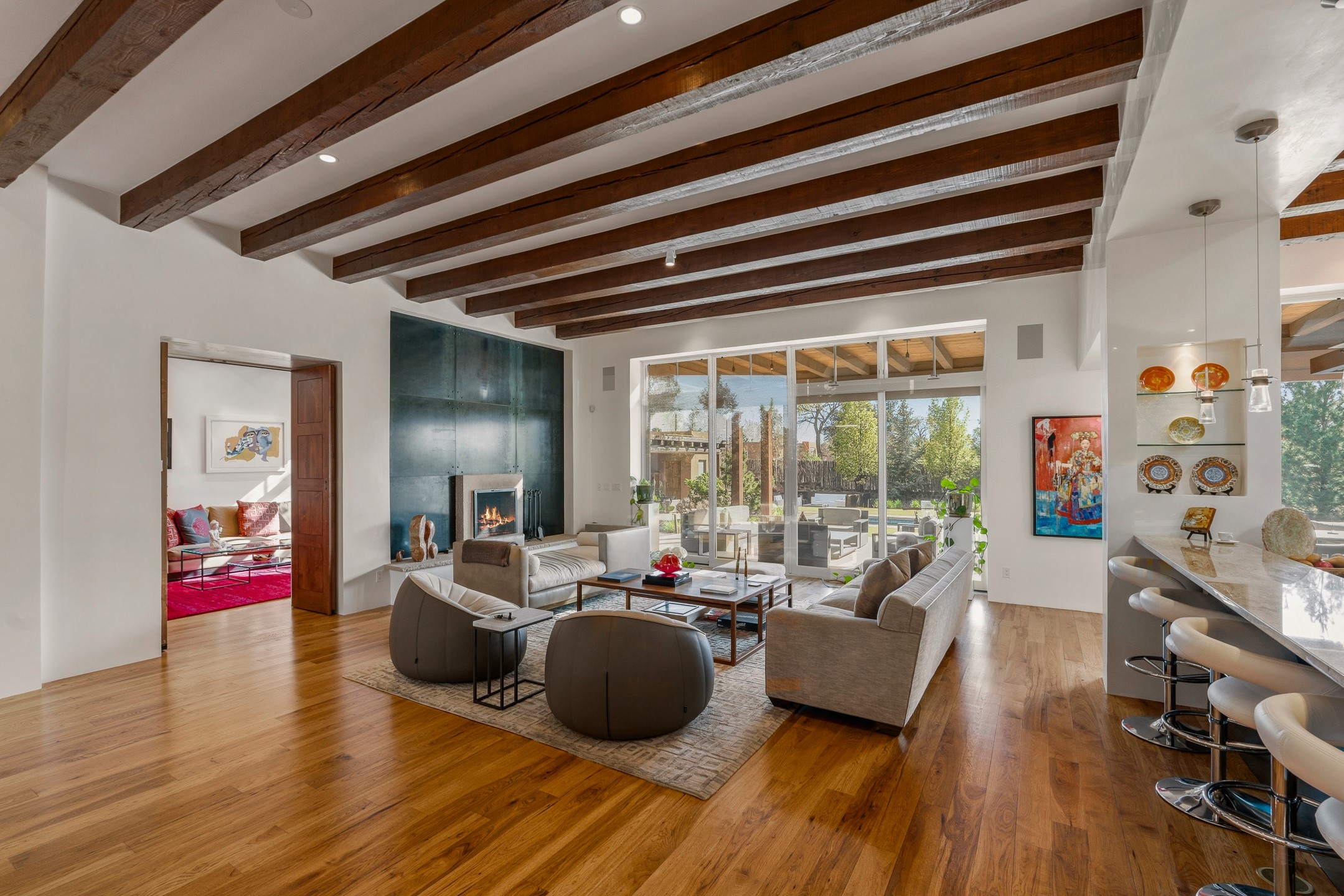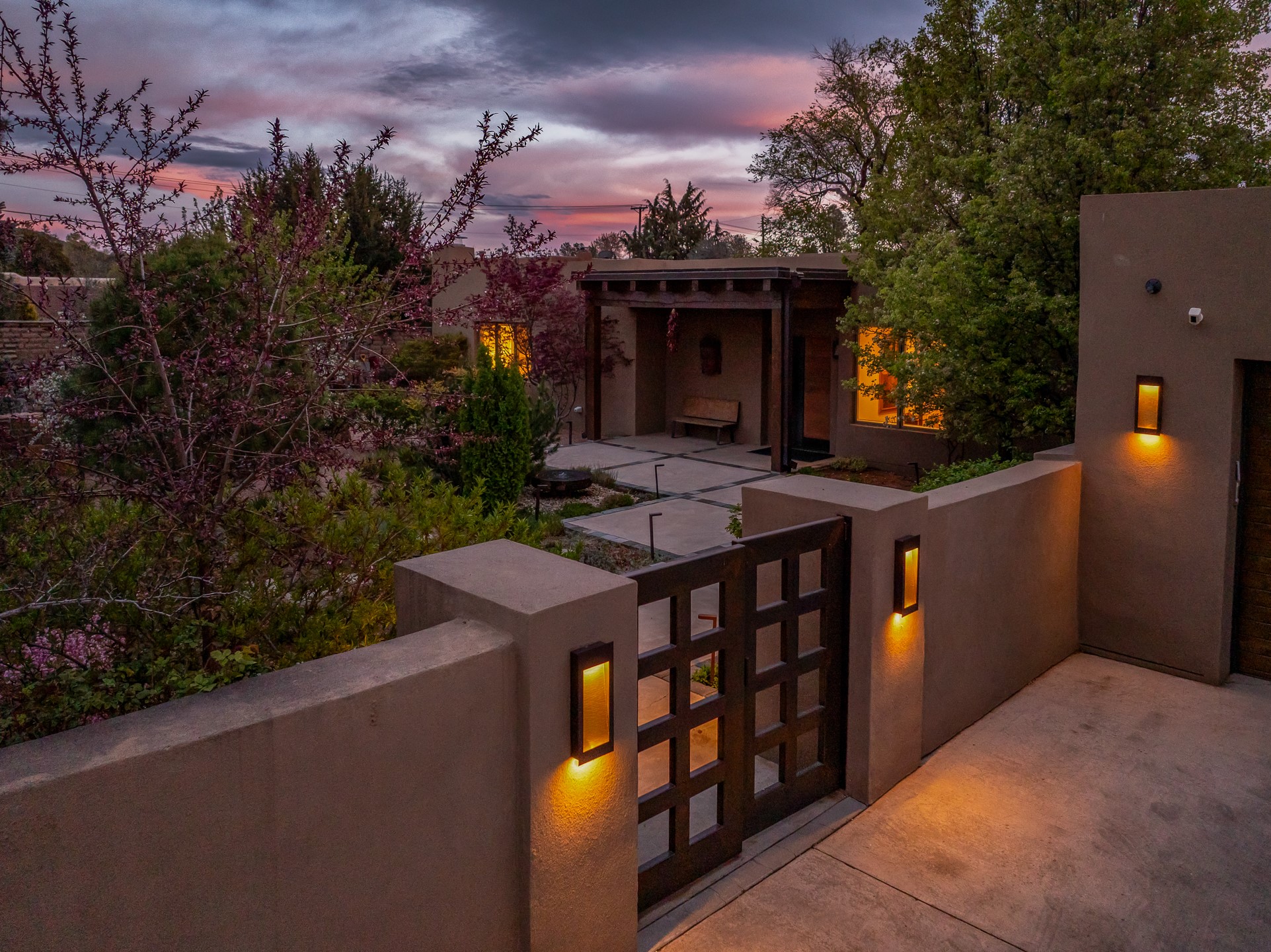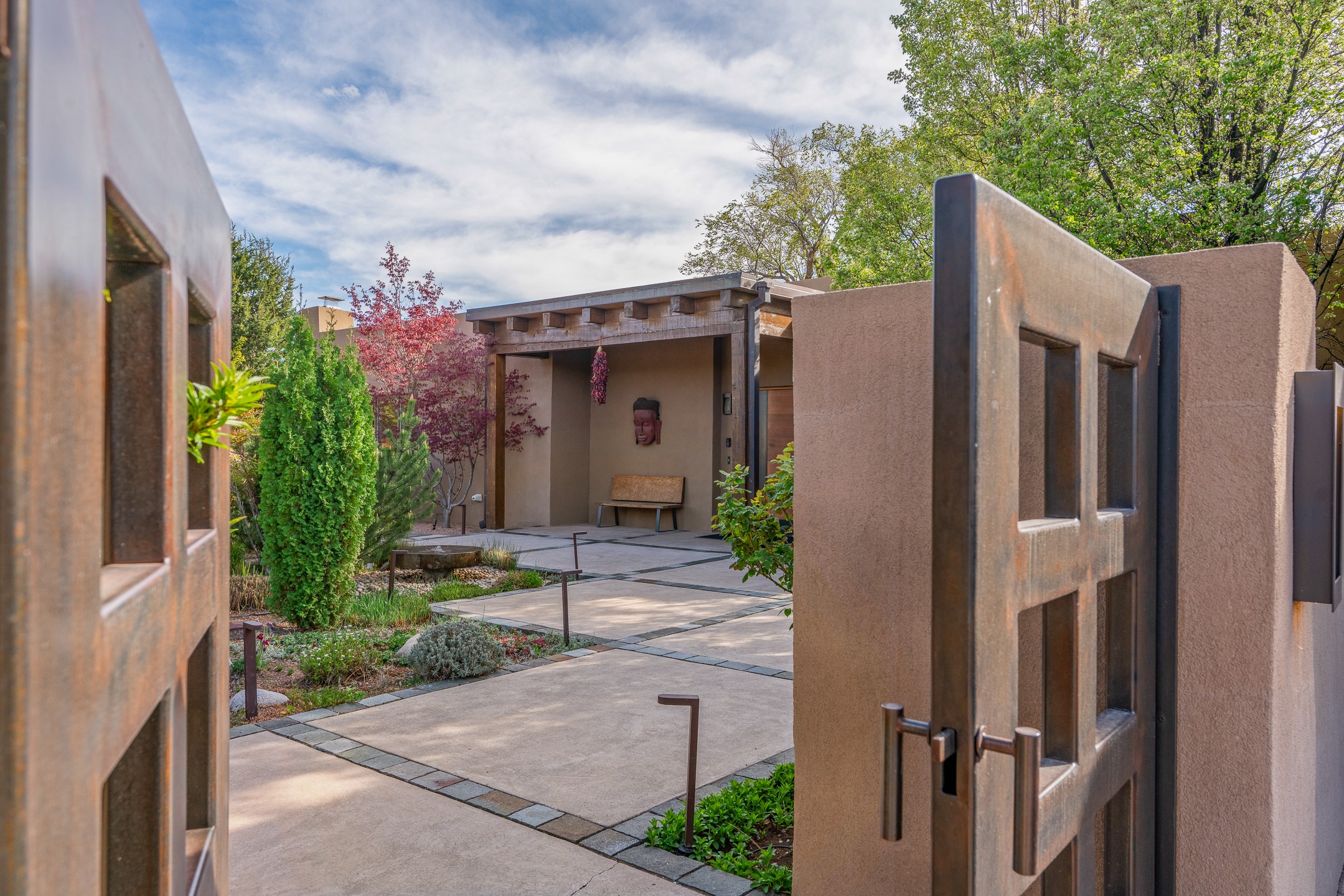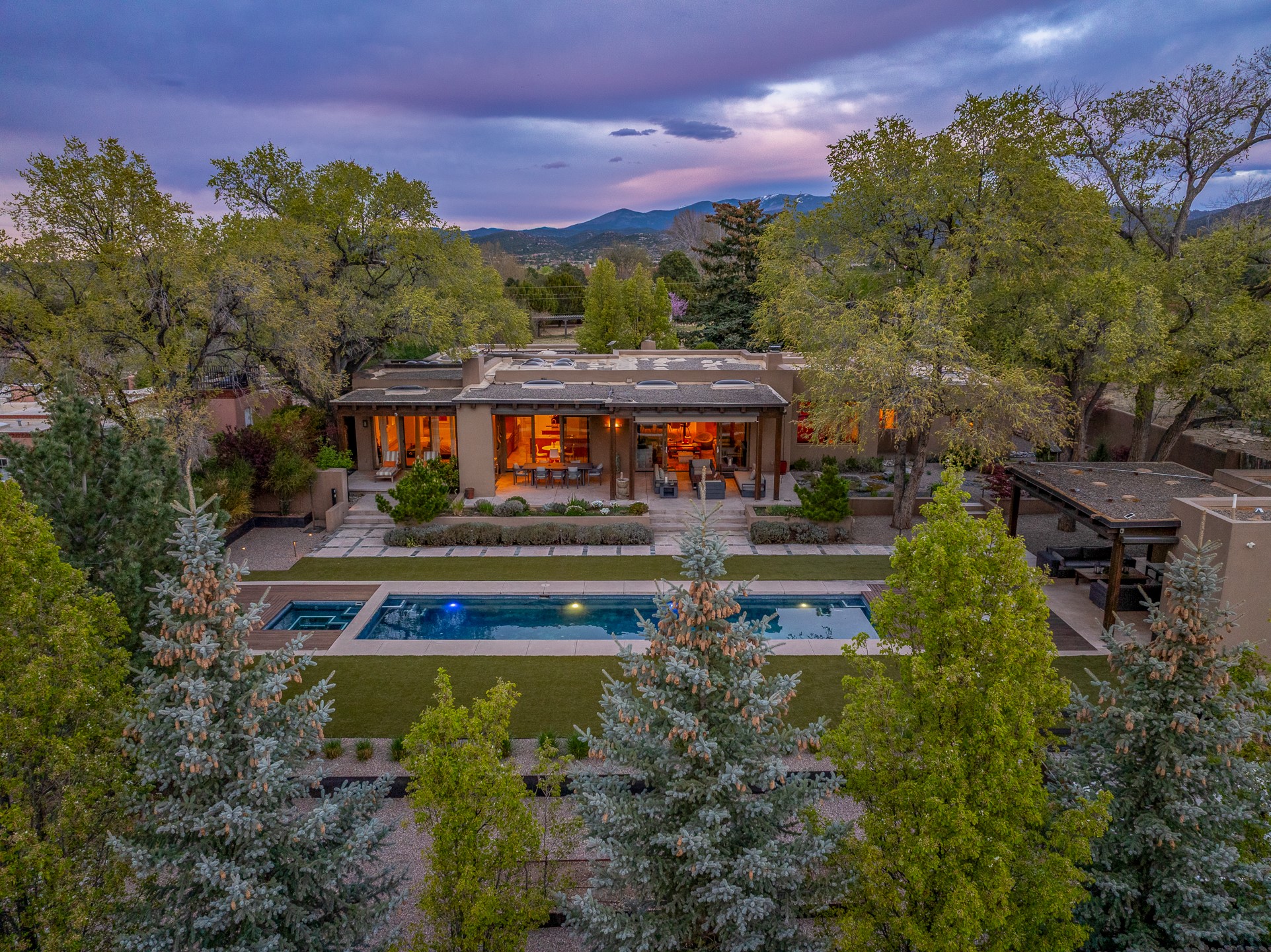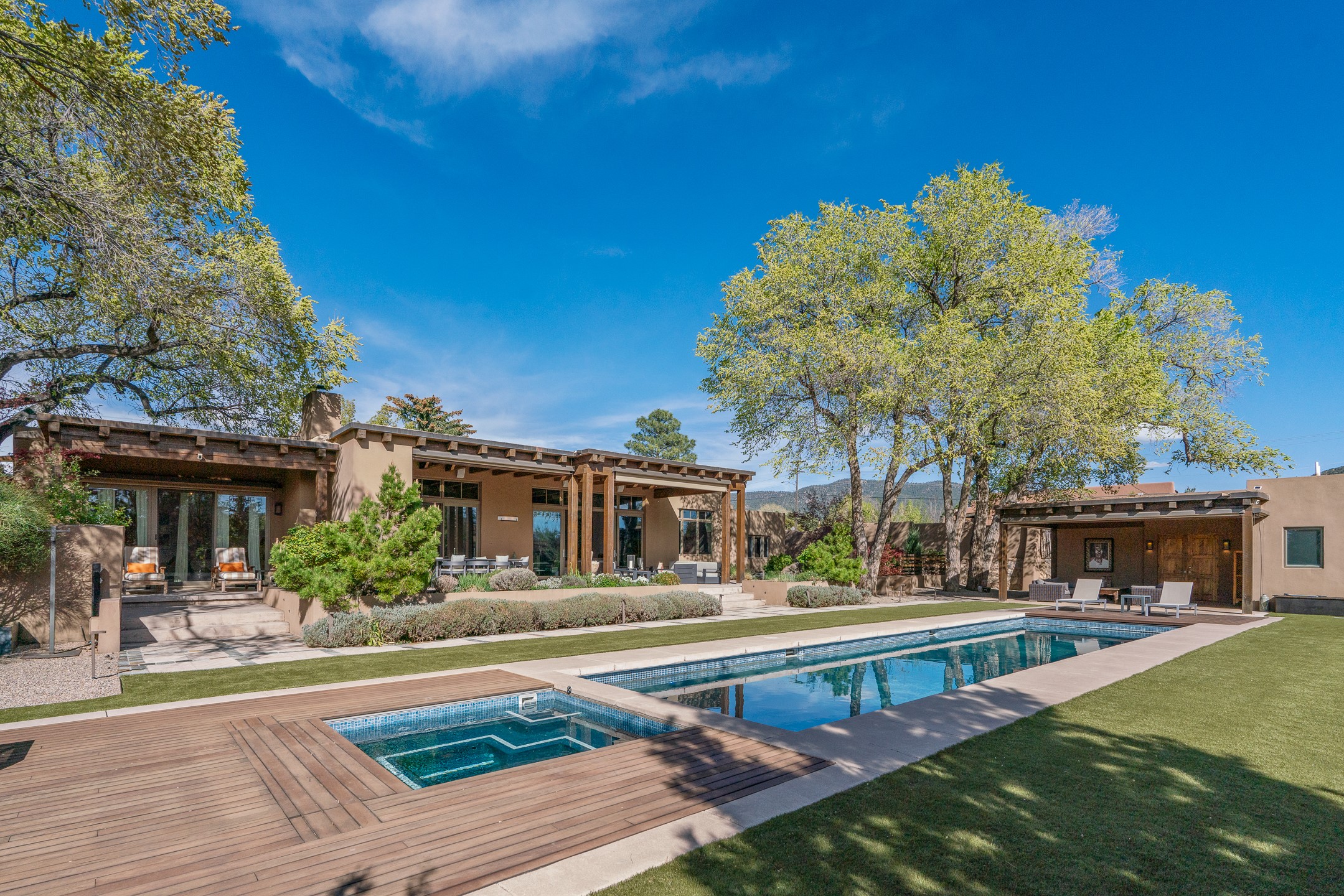 A rare offering that captures the essence of a refined Santa Fe retreat, this sophisticated compound delivers privacy, design excellence, and seamless access to the city's most celebrated destinations. Downtown, Canyon Road, and Museum Hill are moments away. Beyond its walled and gated entry, the property unfolds as a lifestyle experience. Lush landscaping and cultivated gardens create calm and seclusion, while multiple outdoor living areas invite relaxation and entertaining. A heated pool and spa anchor grounds, complemented by a stylish cabana evoking a resort. The residence is a study in modern elegance. Expansive twelve-foot ceilings, and a fluid layout create a natural connection between interior spaces and the surrounding environment. Walls of glass draw in soft light and frame sunset skies, while refined finishes lend enduring sophistication throughout. At the heart of the home, a striking chef's kitchen is designed for both performance and presence, equally suited to intimate evenings or larger gatherings, and enhanced by a climate-controlled wine room. The primary suite offers a tranquil escape with a sitting area and coffee bar, dual walk-in closets, and a spa-caliber bath with steam shower and soaking tub. A secluded outdoor portal extends the sense of retreat. Separate guest accommodations ensure comfort and privacy, including two en-suite bedrooms and a flexible additional space for a media room, office, or bunk room. Features include sleek cabinetry, integrated audio and technology, whole-home water purification, diamond plaster finishes, and limestone detailing. Resort-level amenities include an infrared sauna, an outdoor kitchen with Wolf grill and pizza oven, and a fitness area by the pool. Impeccably maintained and offered turnkey, the property spans more than 4,300 square feet of interior living space and over 2,000 square feet of covered outdoor areas. It is an exceptional expression of style, comfort, and location in the heart of Santa Fe.
