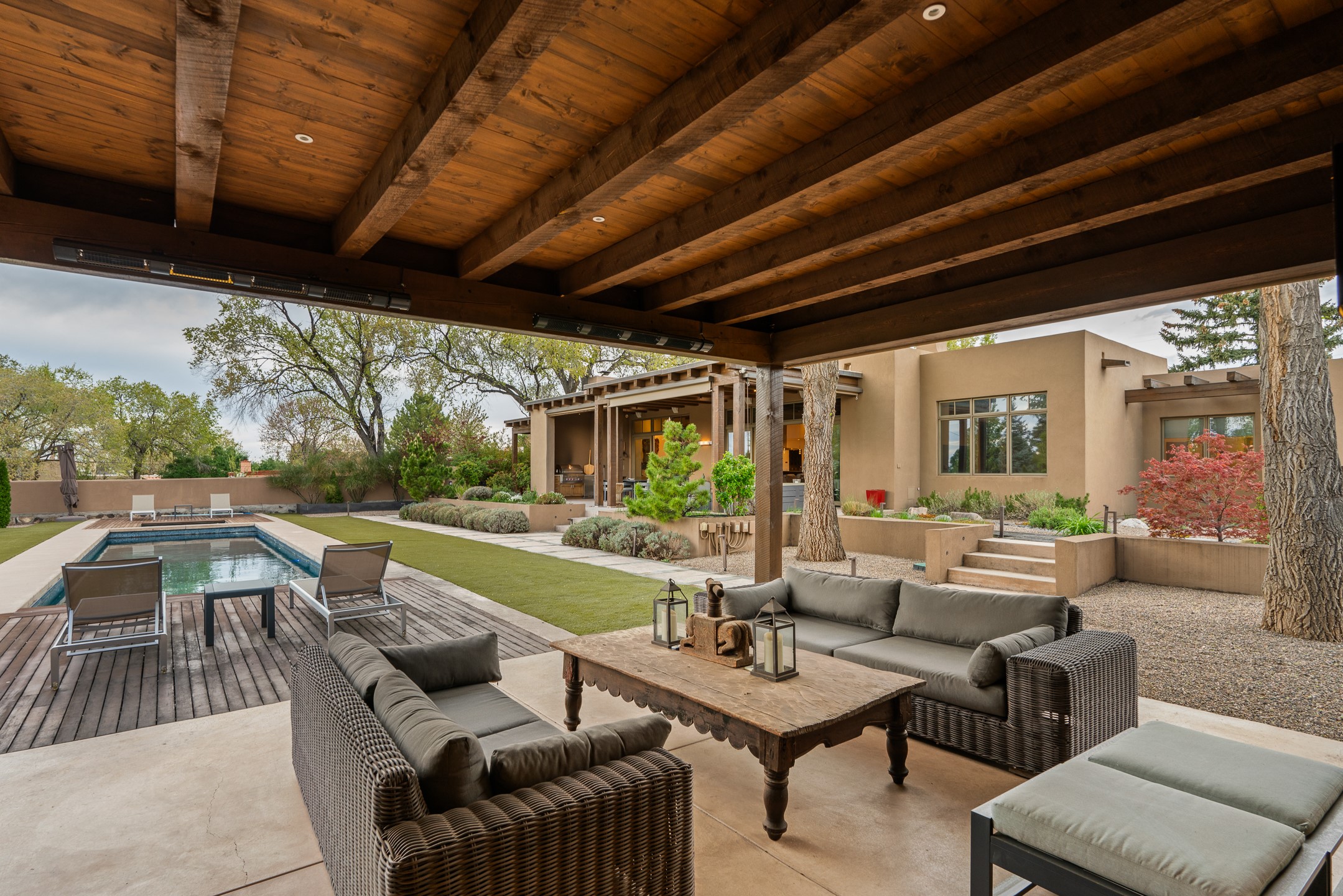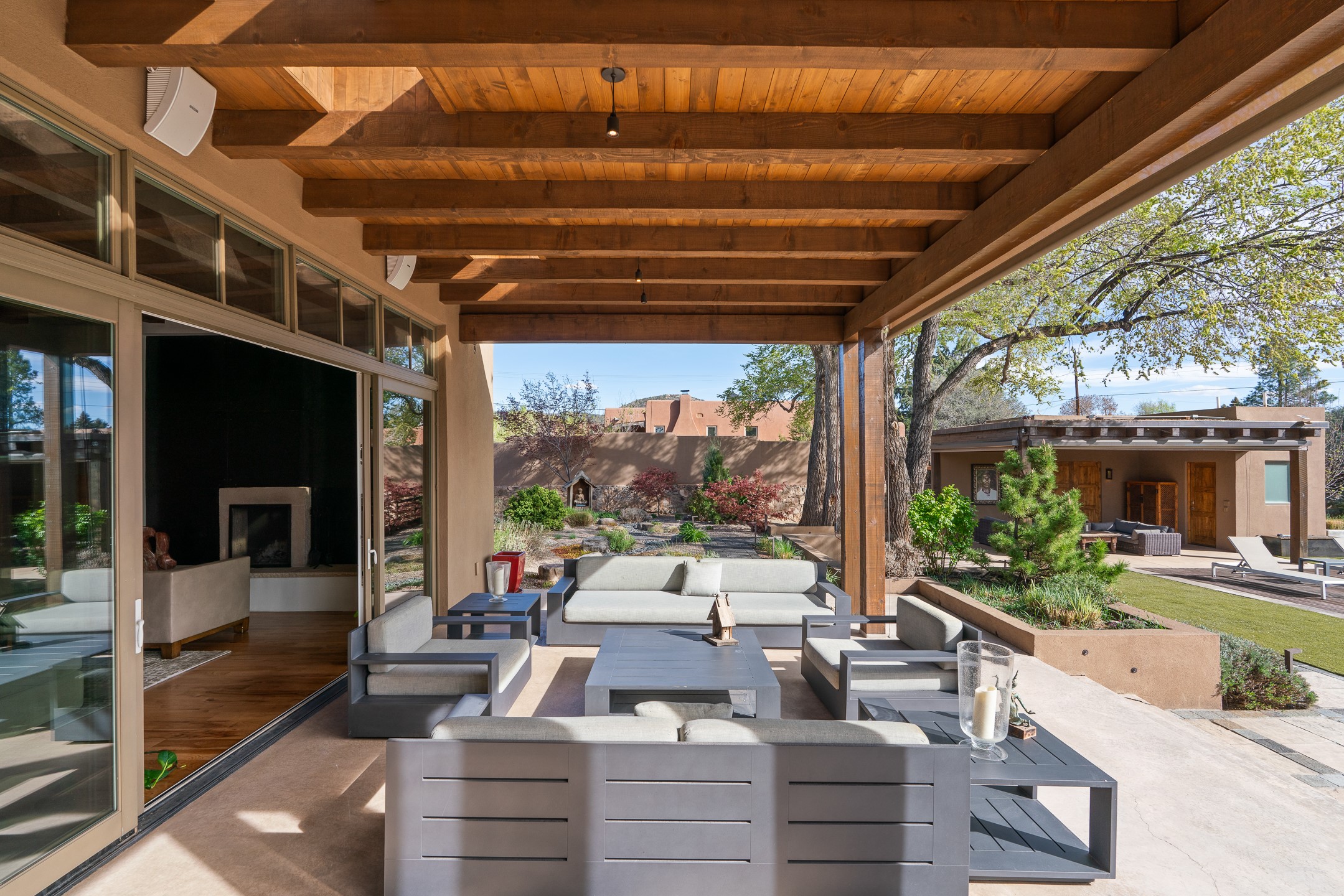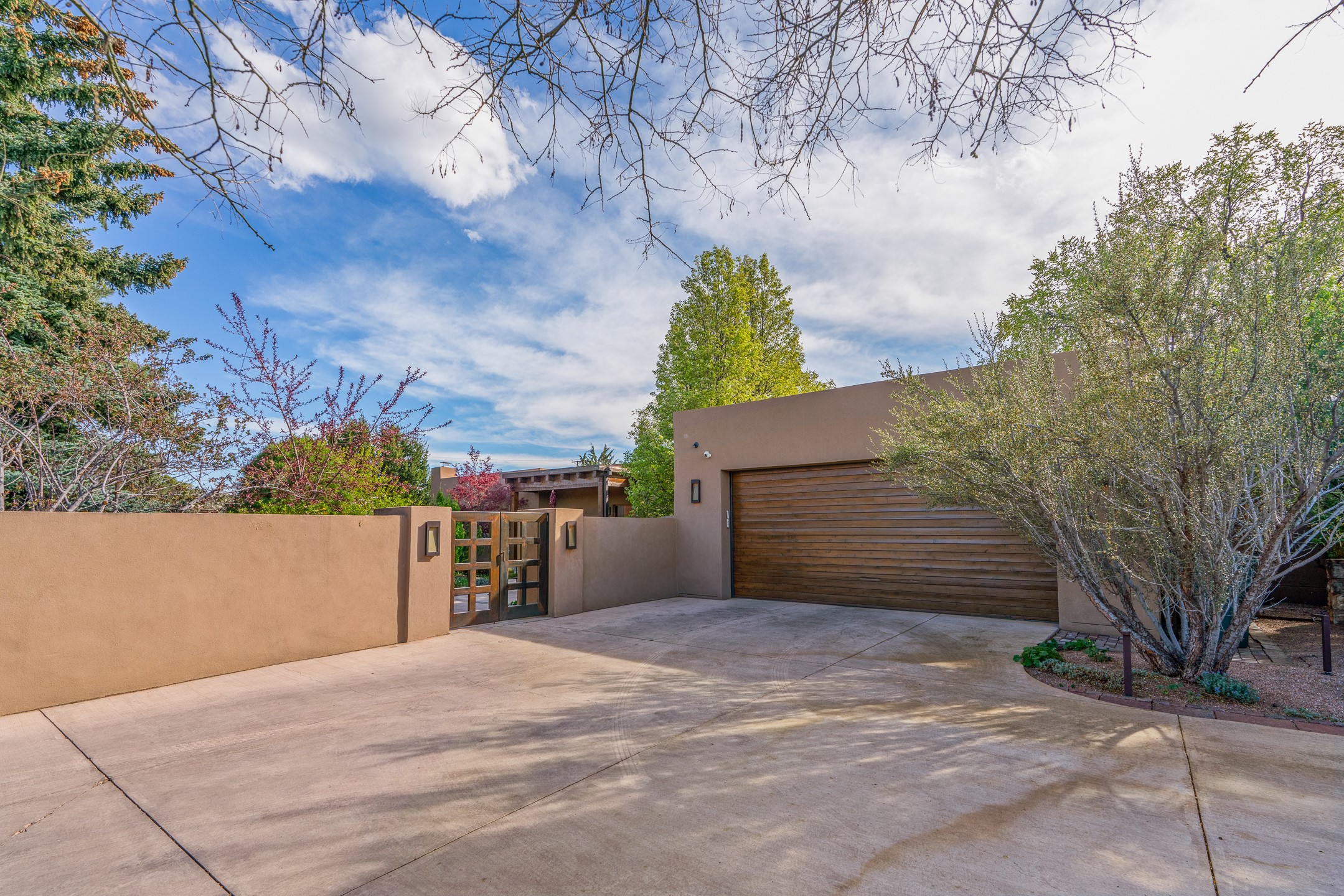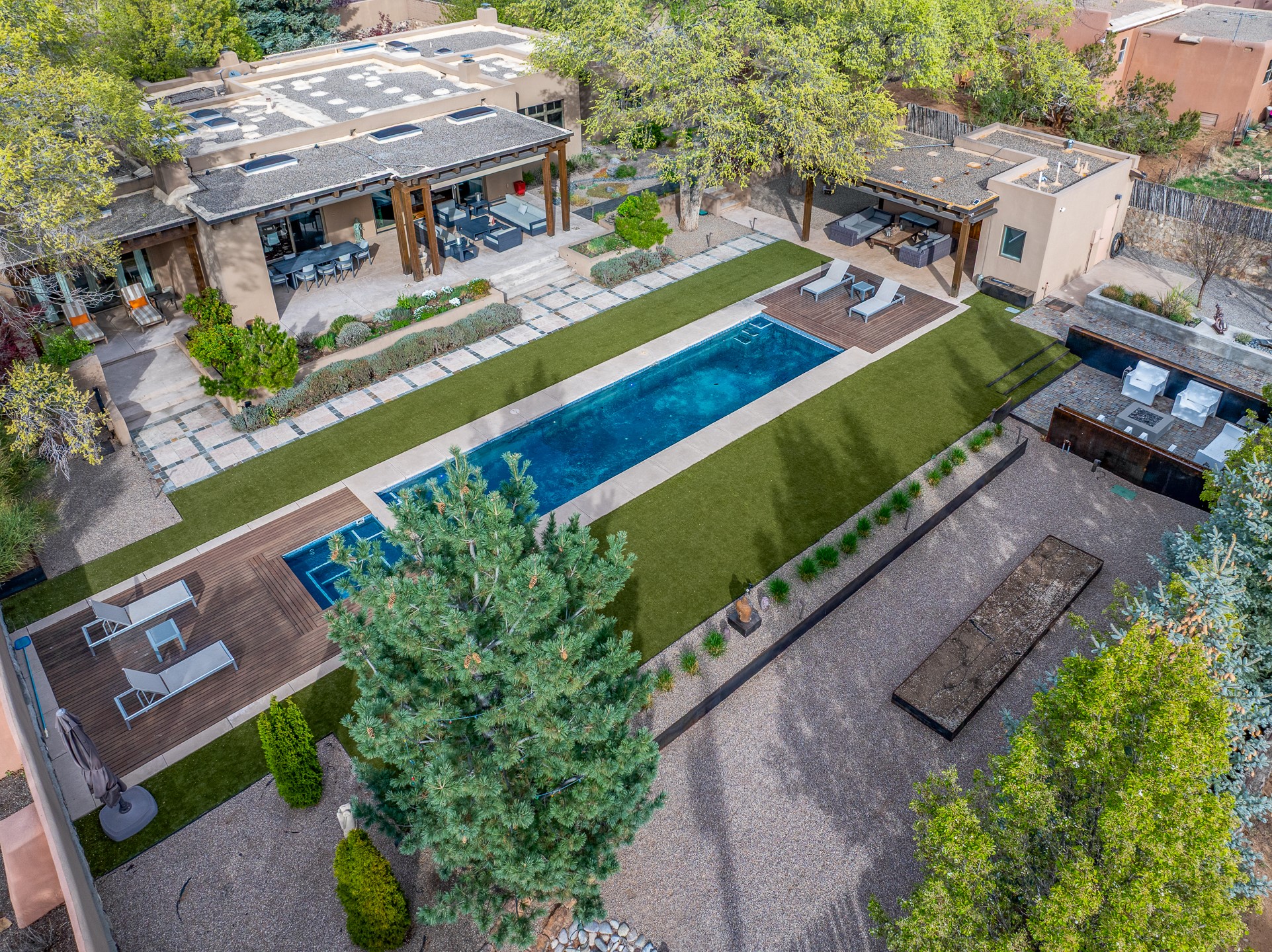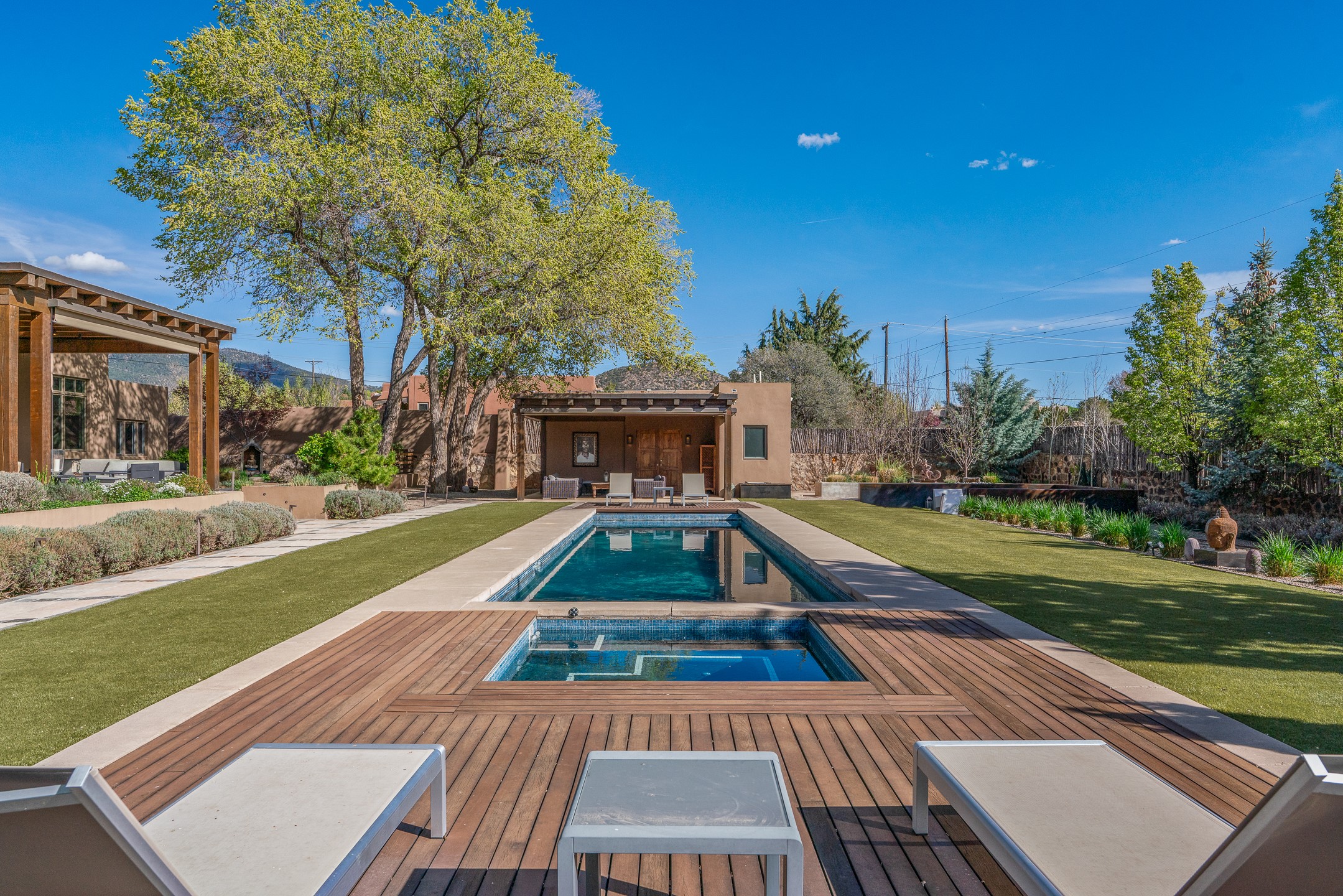A rare offering that captures the essence of a refined Santa Fe retreat, this sophisticated compound delivers privacy, design excellence, and seamless access to the city's most celebrated destinations. Downtown, Canyon Road, and Museum Hill are moments away. Beyond its walled and gated entry, the property unfolds as a lifestyle experience. Lush landscaping and cultivated gardens create calm and seclusion, while multiple outdoor living areas invite relaxation and entertaining. A heated pool and spa anchor grounds, complemented by a stylish cabana evoking a resort. The residence is a study in modern elegance. Expansive twelve-foot ceilings, and a fluid layout create a natural connection between interior spaces and the surrounding environment. Walls of glass draw in soft light and frame sunset skies, while refined finishes lend enduring sophistication throughout. At the heart of the home, a striking chef's kitchen is designed for both performance and presence, equally suited to intimate evenings or larger gatherings, and enhanced by a climate-controlled wine room. The primary suite offers a tranquil escape with a sitting area and coffee bar, dual walk-in closets, and a spa-caliber bath with steam shower and soaking tub. A secluded outdoor portal extends the sense of retreat. Separate guest accommodations ensure comfort and privacy, including two en-suite bedrooms and a flexible additional space for a media room, office, or bunk room. Features include sleek cabinetry, integrated audio and technology, whole-home water purification, diamond plaster finishes, and limestone detailing. Resort-level amenities include an infrared sauna, an outdoor kitchen with Wolf grill and pizza oven, and a fitness area by the pool. Impeccably maintained and offered turnkey, the property spans more than 4,300 square feet of interior living space and over 2,000 square feet of covered outdoor areas. It is an exceptional expression of style, comfort, and location in the heart of Santa Fe.