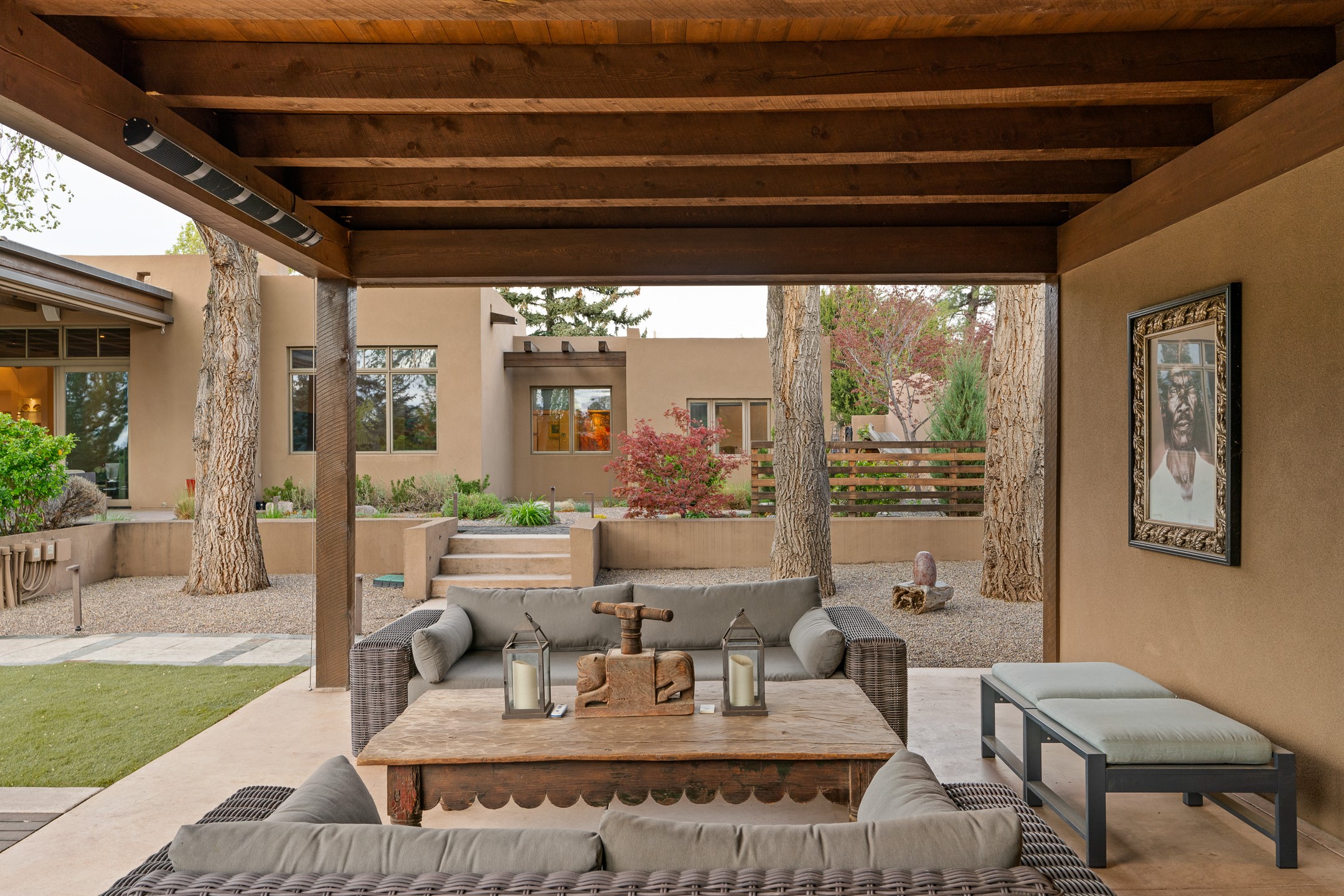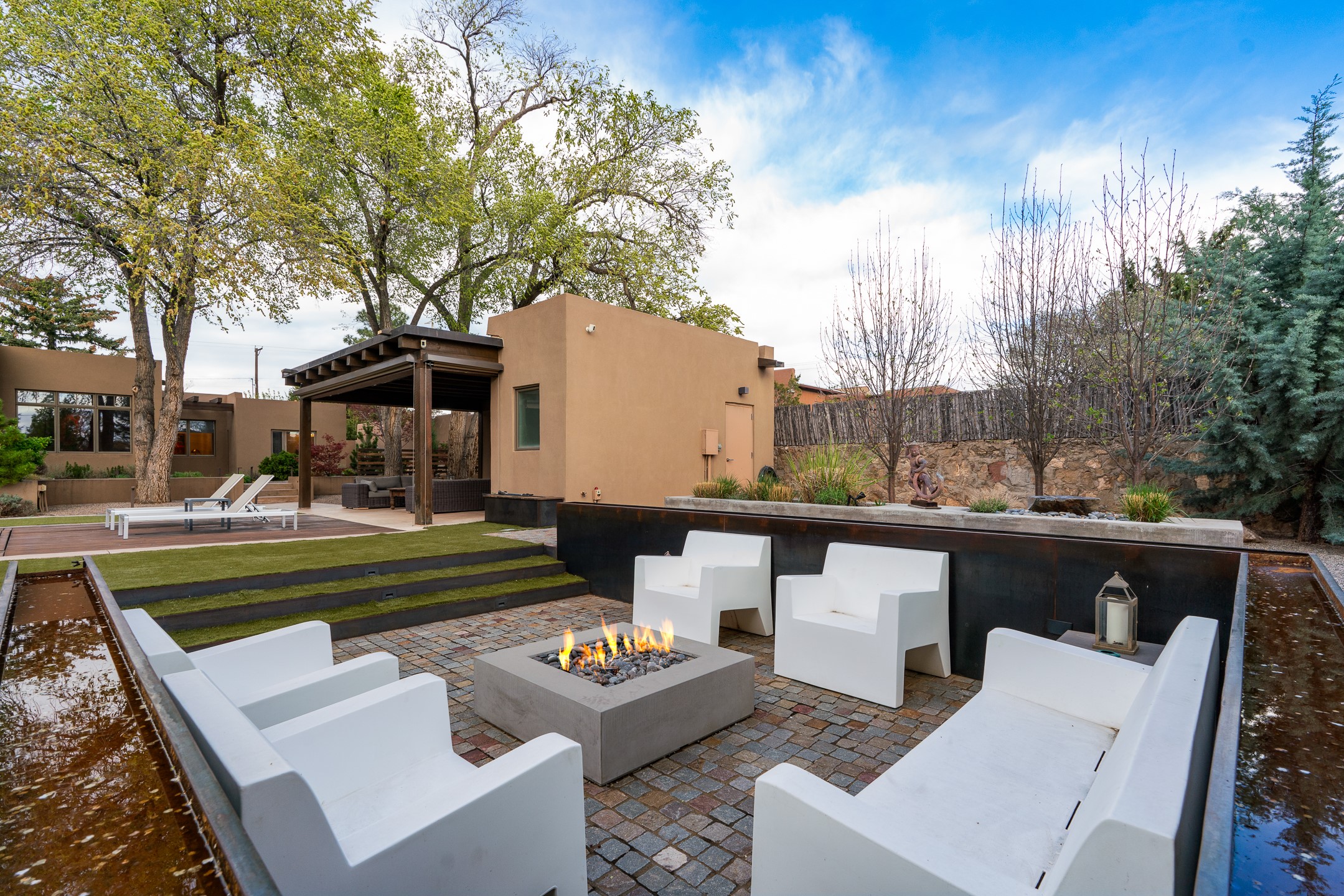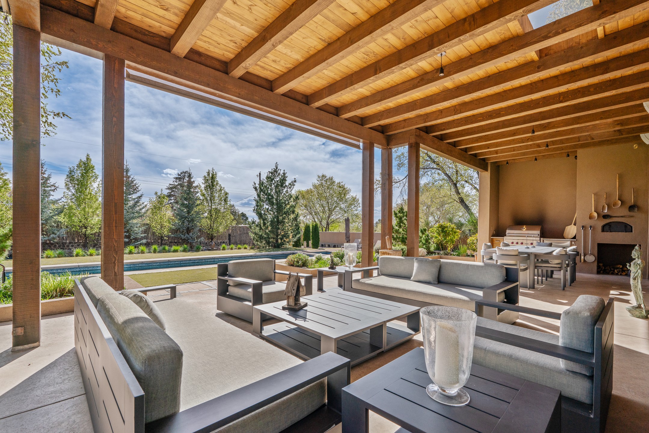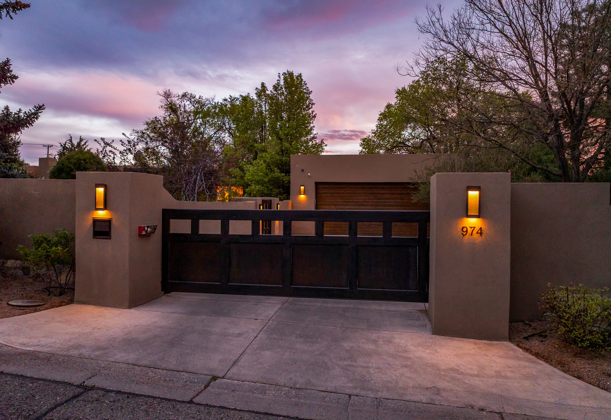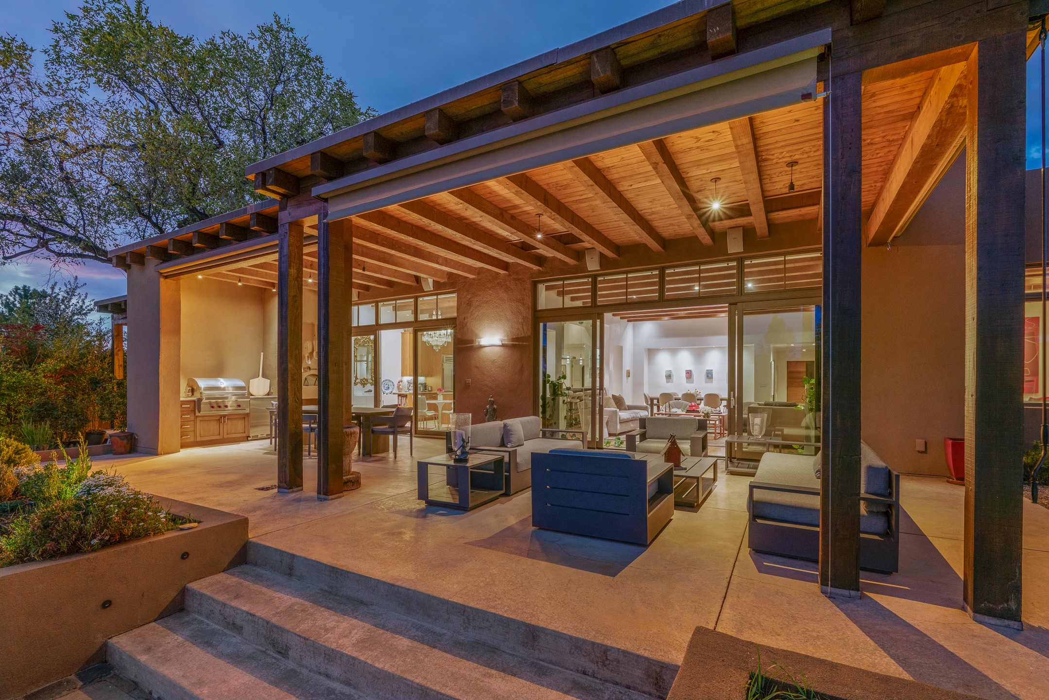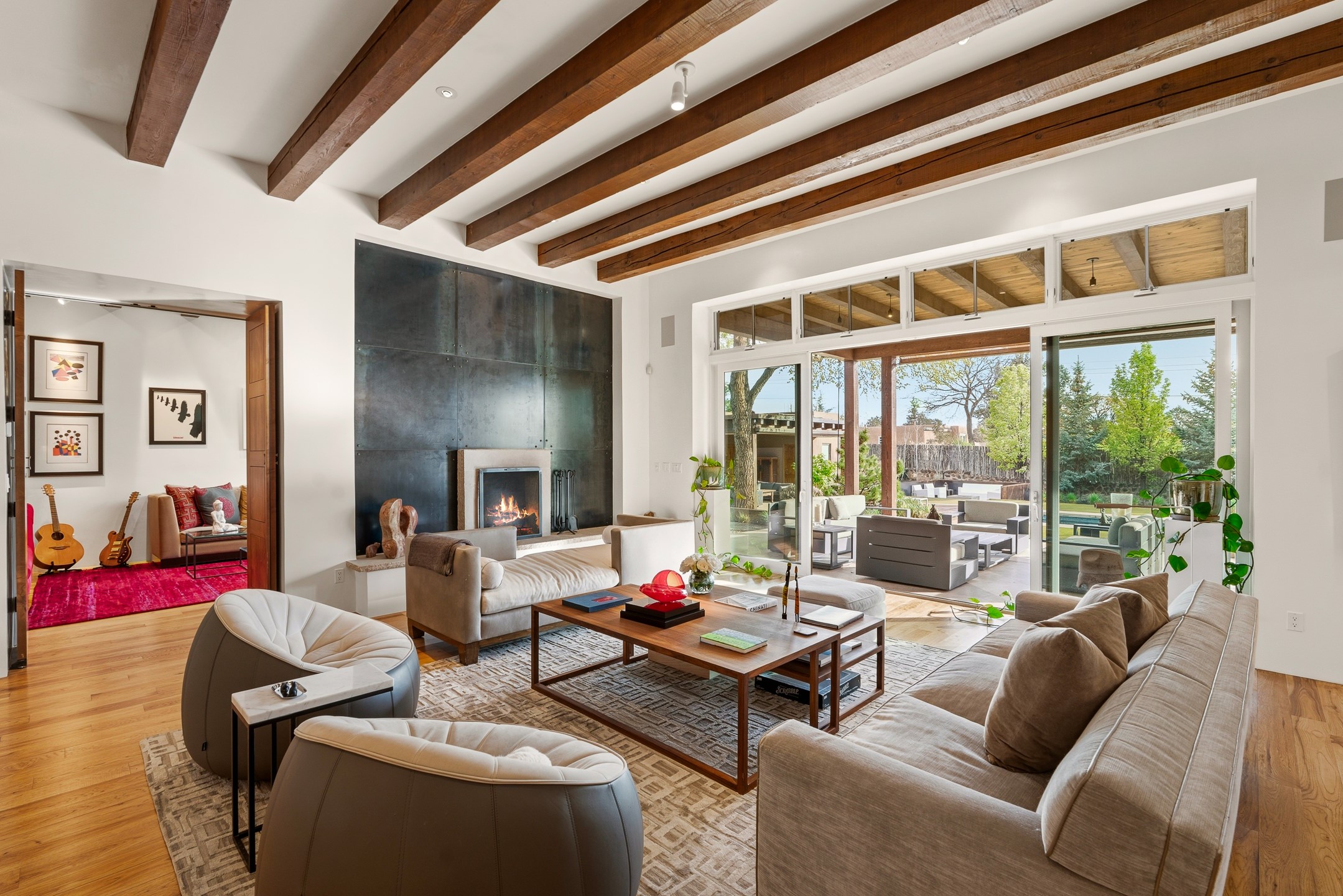 A rare offering that captures the essence of a refined Santa Fe retreat, this sophisticated compound delivers privacy, design excellence, and seamless access to the city's most celebrated destinations. Downtown, Canyon Road, and Museum Hill are moments away. Beyond its walled and gated entry, the property unfolds as a lifestyle experience. Lush landscaping and cultivated gardens create calm and seclusion, while multiple outdoor living areas invite relaxation and entertaining. A heated pool and spa anchor grounds, complemented by a stylish cabana evoking a resort. The residence is a study in modern elegance. Expansive twelve-foot ceilings, and a fluid layout create a natural connection between interior spaces and the surrounding environment. Walls of glass draw in soft light and frame sunset skies, while refined finishes lend enduring sophistication throughout. At the heart of the home, a striking chef's kitchen is designed for both performance and presence, equally suited to intimate evenings or larger gatherings, and enhanced by a climate-controlled wine room. The primary suite offers a tranquil escape with a sitting area and coffee bar, dual walk-in closets, and a spa-caliber bath with steam shower and soaking tub. A secluded outdoor portal extends the sense of retreat. Separate guest accommodations ensure comfort and privacy, including two en-suite bedrooms and a flexible additional space for a media room, office, or bunk room. Features include sleek cabinetry, integrated audio and technology, whole-home water purification, diamond plaster finishes, and limestone detailing. Resort-level amenities include an infrared sauna, an outdoor kitchen with Wolf grill and pizza oven, and a fitness area by the pool. Impeccably maintained and offered turnkey, the property spans more than 4,300 square feet of interior living space and over 2,000 square feet of covered outdoor areas. It is an exceptional expression of style, comfort, and location in the heart of Santa Fe.
