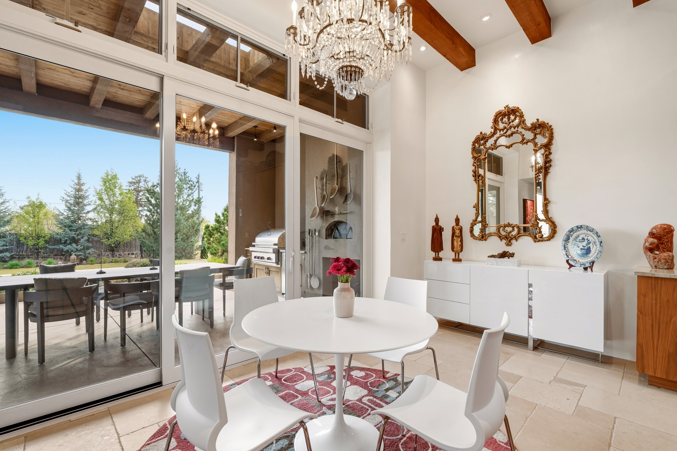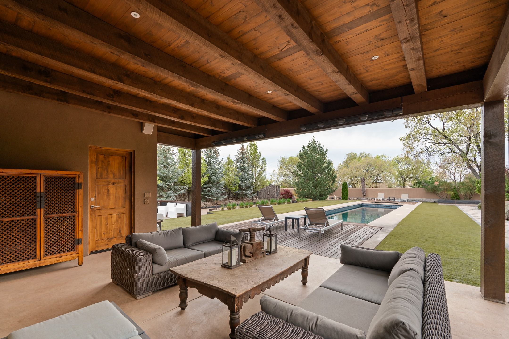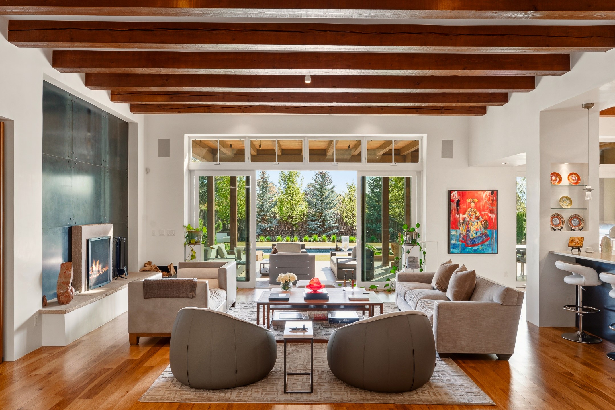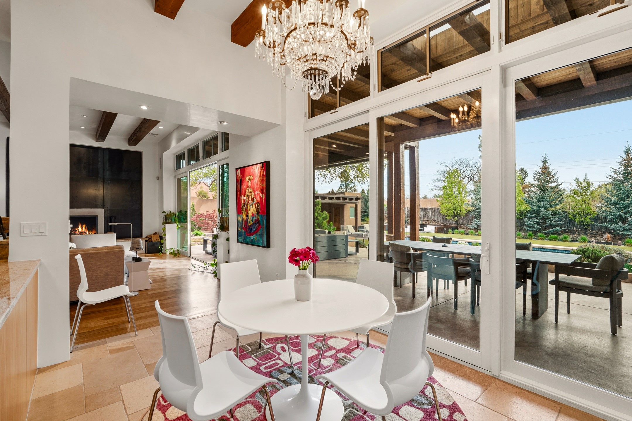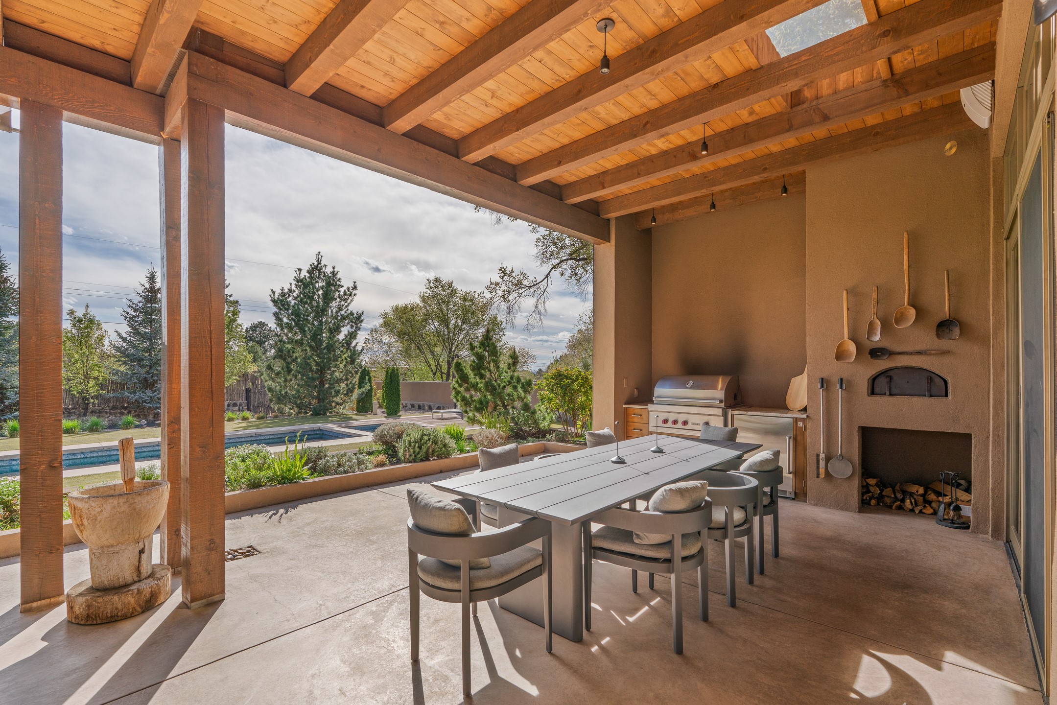A rare offering that captures the essence of a refined Santa Fe retreat, this sophisticated compound delivers privacy, design excellence, and seamless access to the city's most celebrated destinations. Downtown, Canyon Road, and Museum Hill are moments away. Beyond its walled and gated entry, the property unfolds as a lifestyle experience. Lush landscaping and cultivated gardens create calm and seclusion, while multiple outdoor living areas invite relaxation and entertaining. A heated pool and spa anchor grounds, complemented by a stylish cabana evoking a resort. The residence is a study in modern elegance. Expansive twelve-foot ceilings, and a fluid layout create a natural connection between interior spaces and the surrounding environment. Walls of glass draw in soft light and frame sunset skies, while refined finishes lend enduring sophistication throughout. At the heart of the home, a striking chef's kitchen is designed for both performance and presence, equally suited to intimate evenings or larger gatherings, and enhanced by a climate-controlled wine room. The primary suite offers a tranquil escape with a sitting area and coffee bar, dual walk-in closets, and a spa-caliber bath with steam shower and soaking tub. A secluded outdoor portal extends the sense of retreat. Separate guest accommodations ensure comfort and privacy, including two en-suite bedrooms and a flexible additional space for a media room, office, or bunk room. Features include sleek cabinetry, integrated audio and technology, whole-home water purification, diamond plaster finishes, and limestone detailing. Resort-level amenities include an infrared sauna, an outdoor kitchen with Wolf grill and pizza oven, and a fitness area by the pool. Impeccably maintained and offered turnkey, the property spans more than 4,300 square feet of interior living space and over 2,000 square feet of covered outdoor areas. It is an exceptional expression of style, comfort, and location in the heart of Santa Fe.