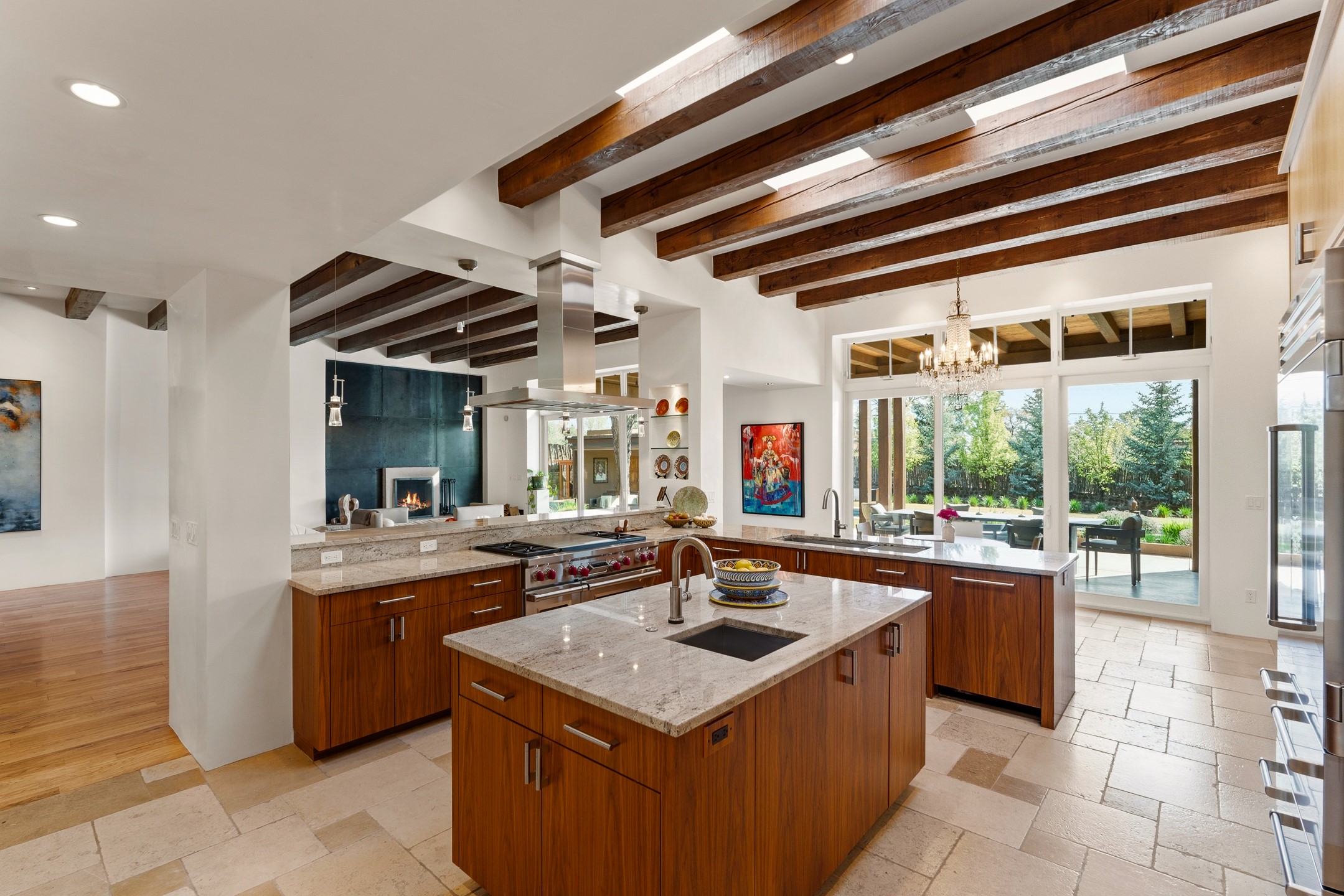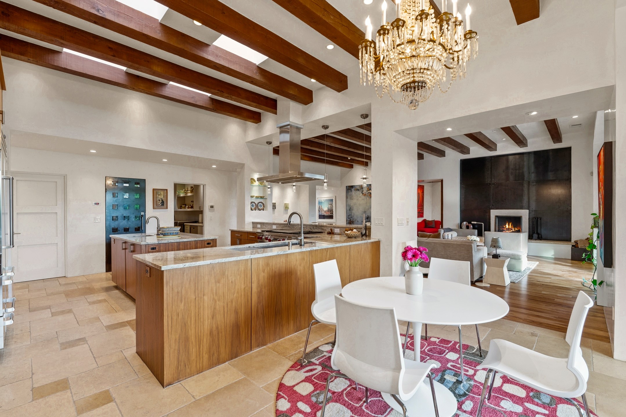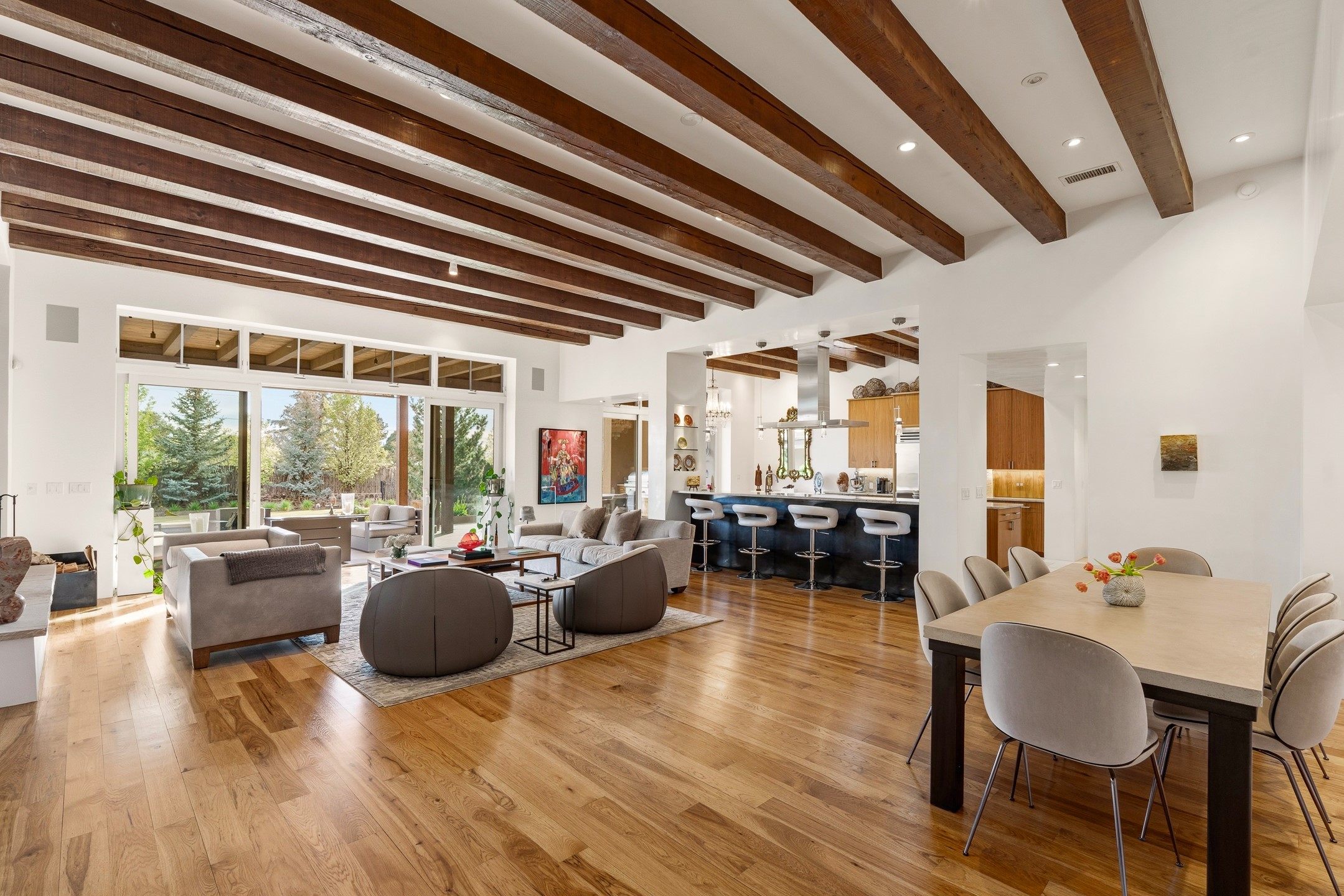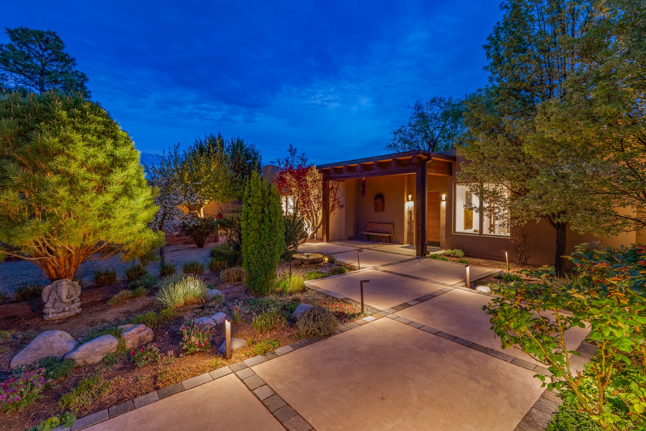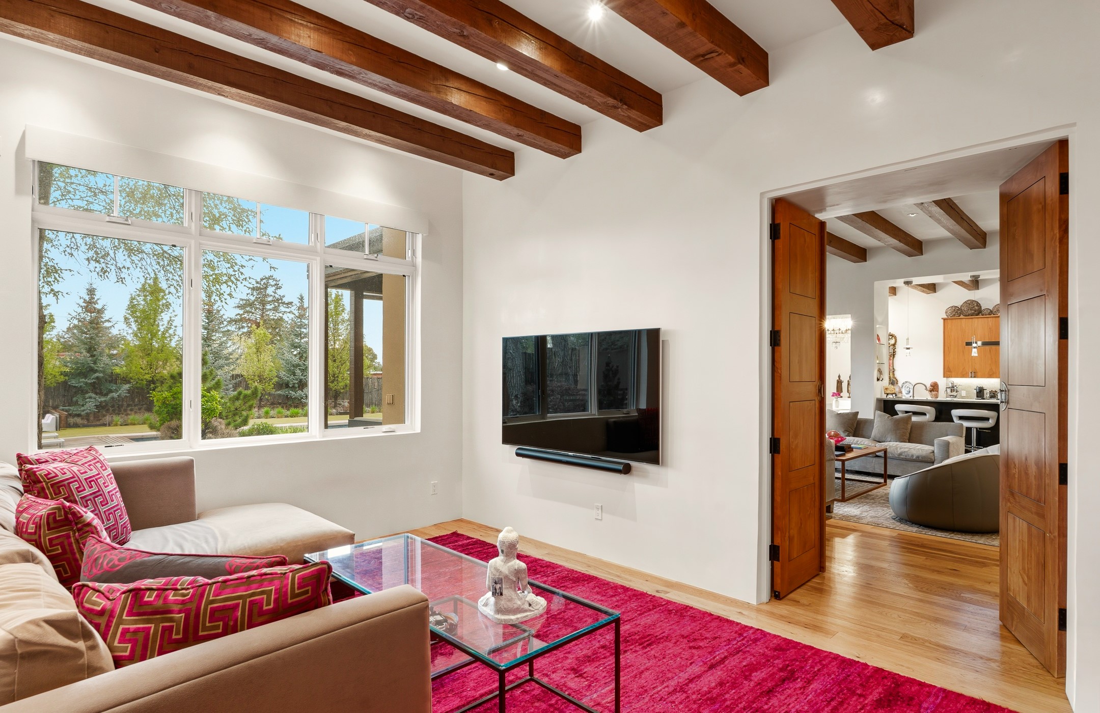 A rare offering that captures the essence of a refined Santa Fe retreat, this sophisticated compound delivers privacy, design excellence, and seamless access to the city's most celebrated destinations. Downtown, Canyon Road, and Museum Hill are moments away. Beyond its walled and gated entry, the property unfolds as a lifestyle experience. Lush landscaping and cultivated gardens create calm and seclusion, while multiple outdoor living areas invite relaxation and entertaining. A heated pool and spa anchor grounds, complemented by a stylish cabana evoking a resort. The residence is a study in modern elegance. Expansive twelve-foot ceilings, and a fluid layout create a natural connection between interior spaces and the surrounding environment. Walls of glass draw in soft light and frame sunset skies, while refined finishes lend enduring sophistication throughout. At the heart of the home, a striking chef's kitchen is designed for both performance and presence, equally suited to intimate evenings or larger gatherings, and enhanced by a climate-controlled wine room. The primary suite offers a tranquil escape with a sitting area and coffee bar, dual walk-in closets, and a spa-caliber bath with steam shower and soaking tub. A secluded outdoor portal extends the sense of retreat. Separate guest accommodations ensure comfort and privacy, including two en-suite bedrooms and a flexible additional space for a media room, office, or bunk room. Features include sleek cabinetry, integrated audio and technology, whole-home water purification, diamond plaster finishes, and limestone detailing. Resort-level amenities include an infrared sauna, an outdoor kitchen with Wolf grill and pizza oven, and a fitness area by the pool. Impeccably maintained and offered turnkey, the property spans more than 4,300 square feet of interior living space and over 2,000 square feet of covered outdoor areas. It is an exceptional expression of style, comfort, and location in the heart of Santa Fe.