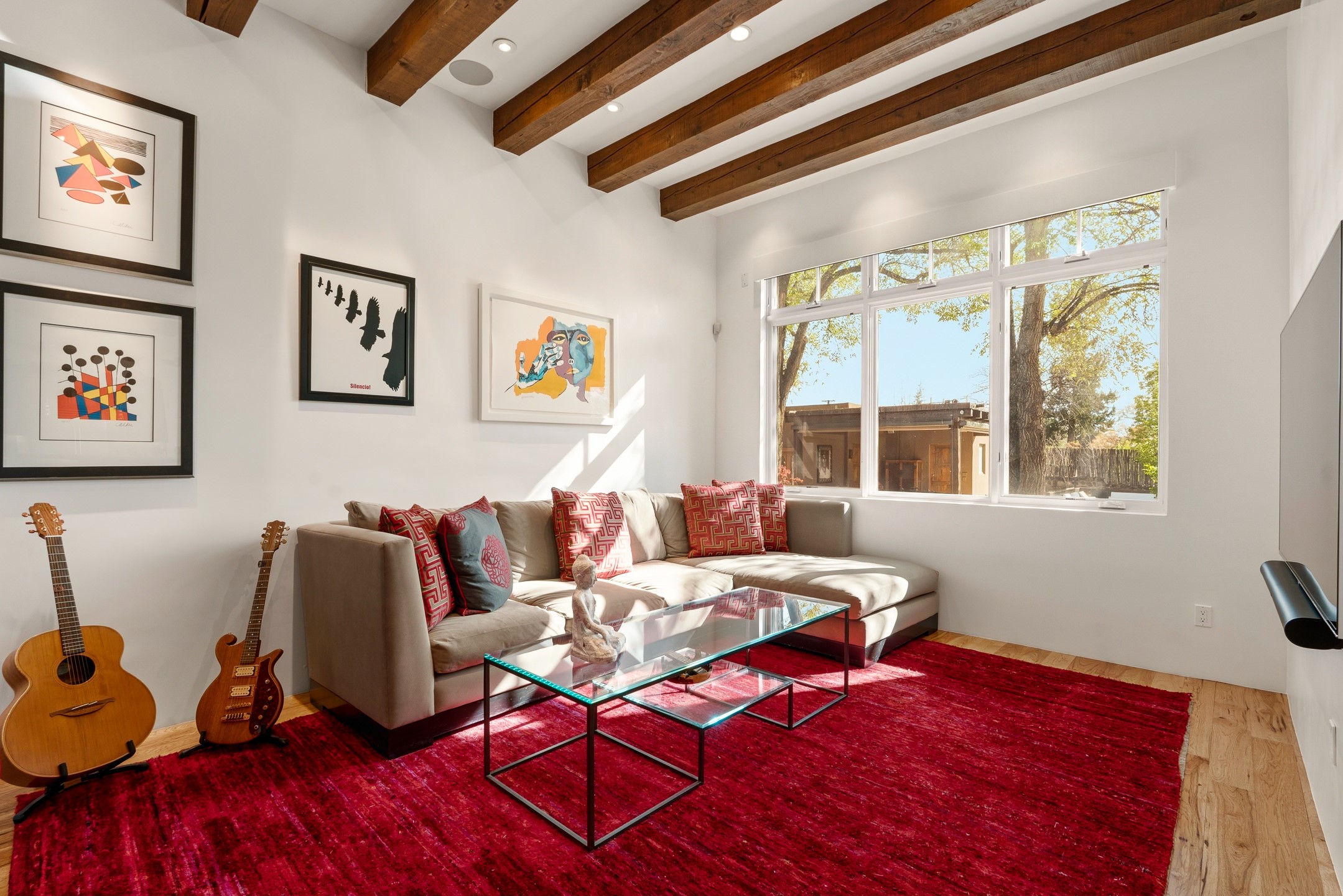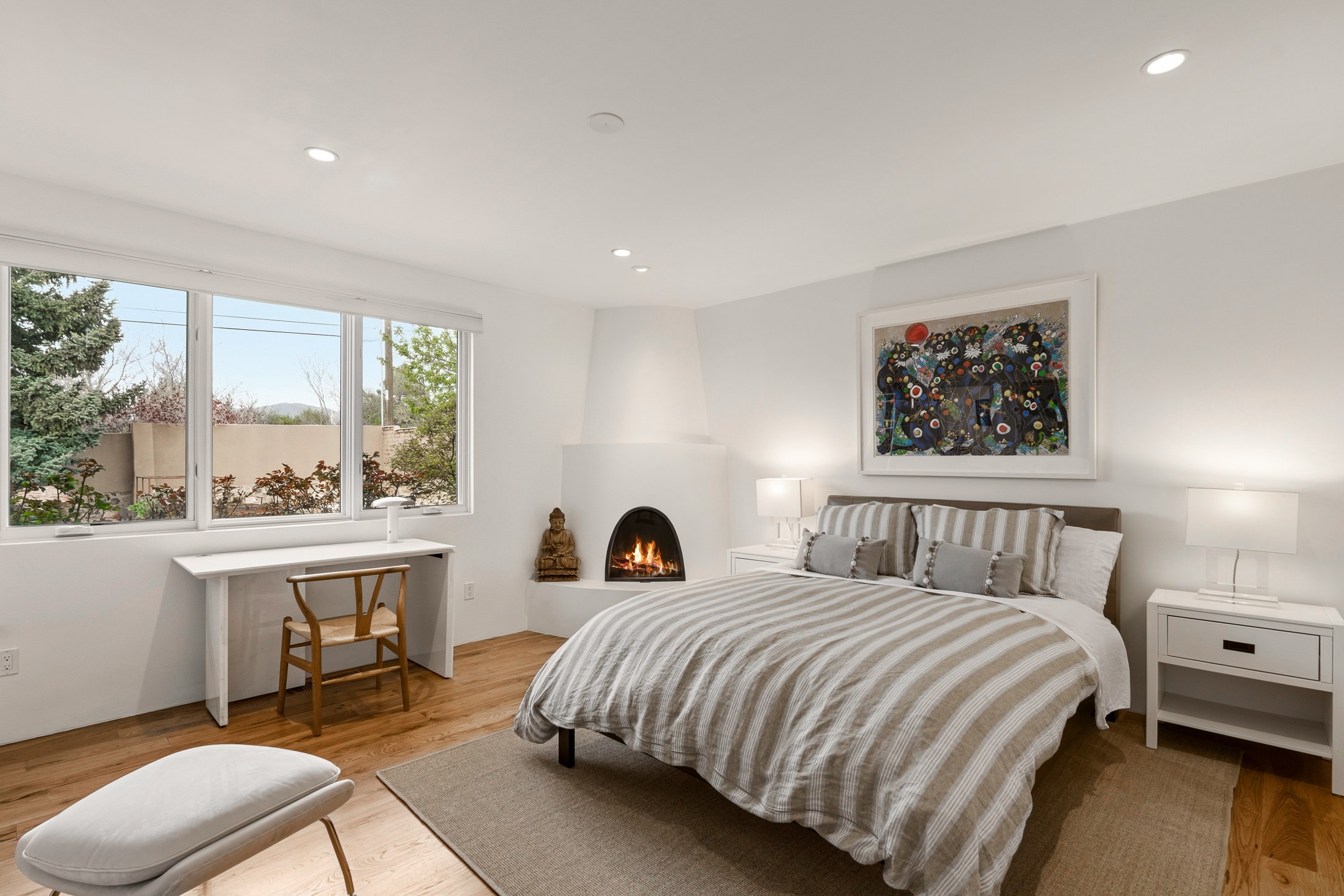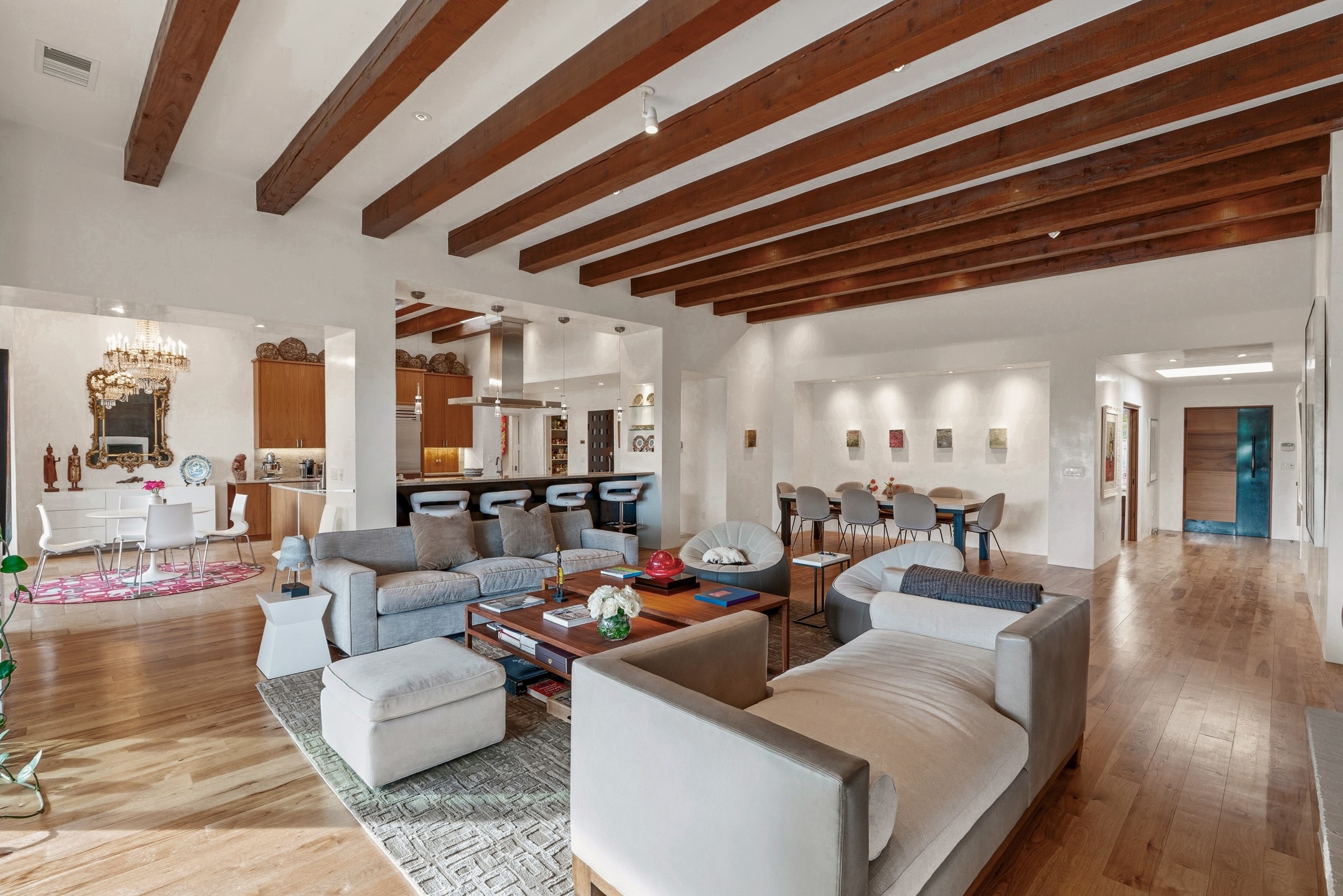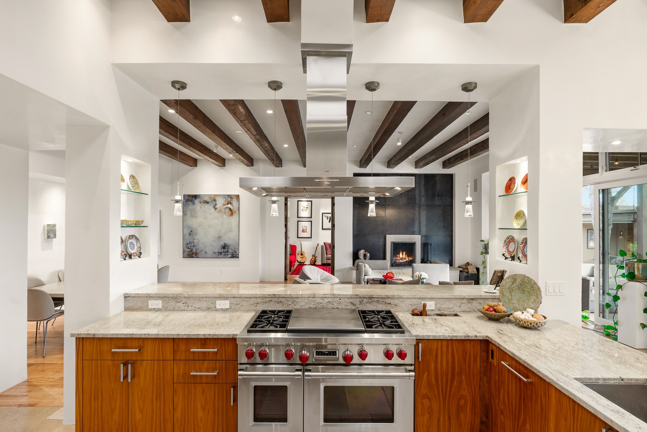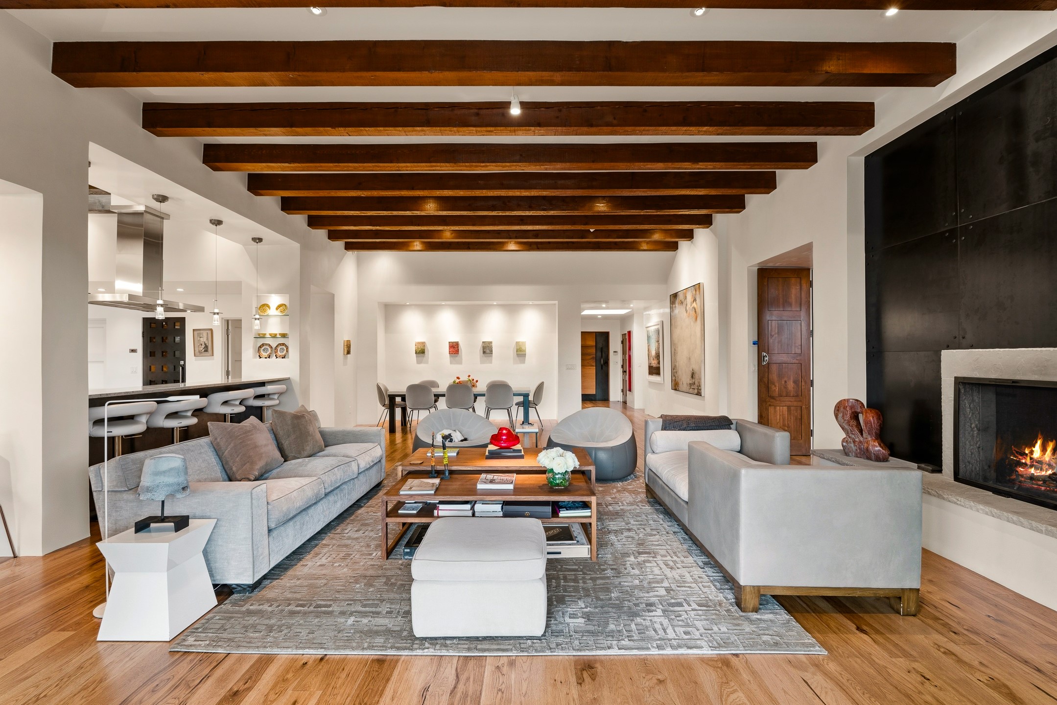 A rare offering that captures the essence of a refined Santa Fe retreat, this sophisticated compound delivers privacy, design excellence, and seamless access to the city's most celebrated destinations. Downtown, Canyon Road, and Museum Hill are moments away. Beyond its walled and gated entry, the property unfolds as a lifestyle experience. Lush landscaping and cultivated gardens create calm and seclusion, while multiple outdoor living areas invite relaxation and entertaining. A heated pool and spa anchor grounds, complemented by a stylish cabana evoking a resort. The residence is a study in modern elegance. Expansive twelve-foot ceilings, and a fluid layout create a natural connection between interior spaces and the surrounding environment. Walls of glass draw in soft light and frame sunset skies, while refined finishes lend enduring sophistication throughout. At the heart of the home, a striking chef's kitchen is designed for both performance and presence, equally suited to intimate evenings or larger gatherings, and enhanced by a climate-controlled wine room. The primary suite offers a tranquil escape with a sitting area and coffee bar, dual walk-in closets, and a spa-caliber bath with steam shower and soaking tub. A secluded outdoor portal extends the sense of retreat. Separate guest accommodations ensure comfort and privacy, including two en-suite bedrooms and a flexible additional space for a media room, office, or bunk room. Features include sleek cabinetry, integrated audio and technology, whole-home water purification, diamond plaster finishes, and limestone detailing. Resort-level amenities include an infrared sauna, an outdoor kitchen with Wolf grill and pizza oven, and a fitness area by the pool. Impeccably maintained and offered turnkey, the property spans more than 4,300 square feet of interior living space and over 2,000 square feet of covered outdoor areas. It is an exceptional expression of style, comfort, and location in the heart of Santa Fe.