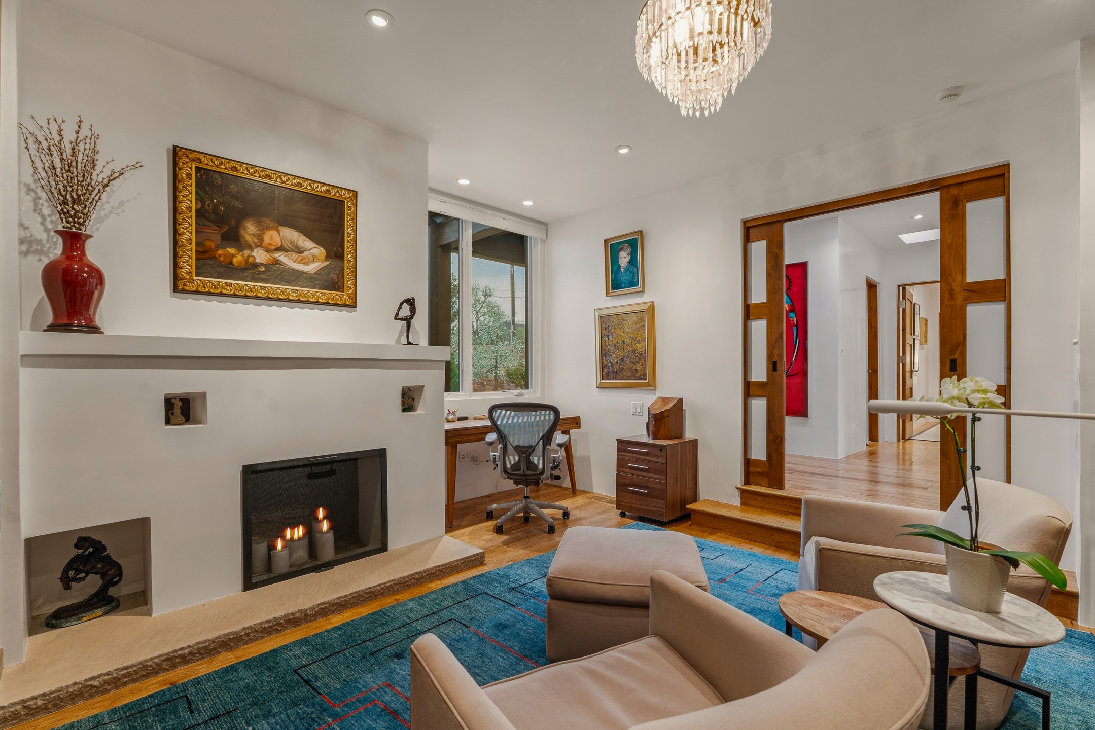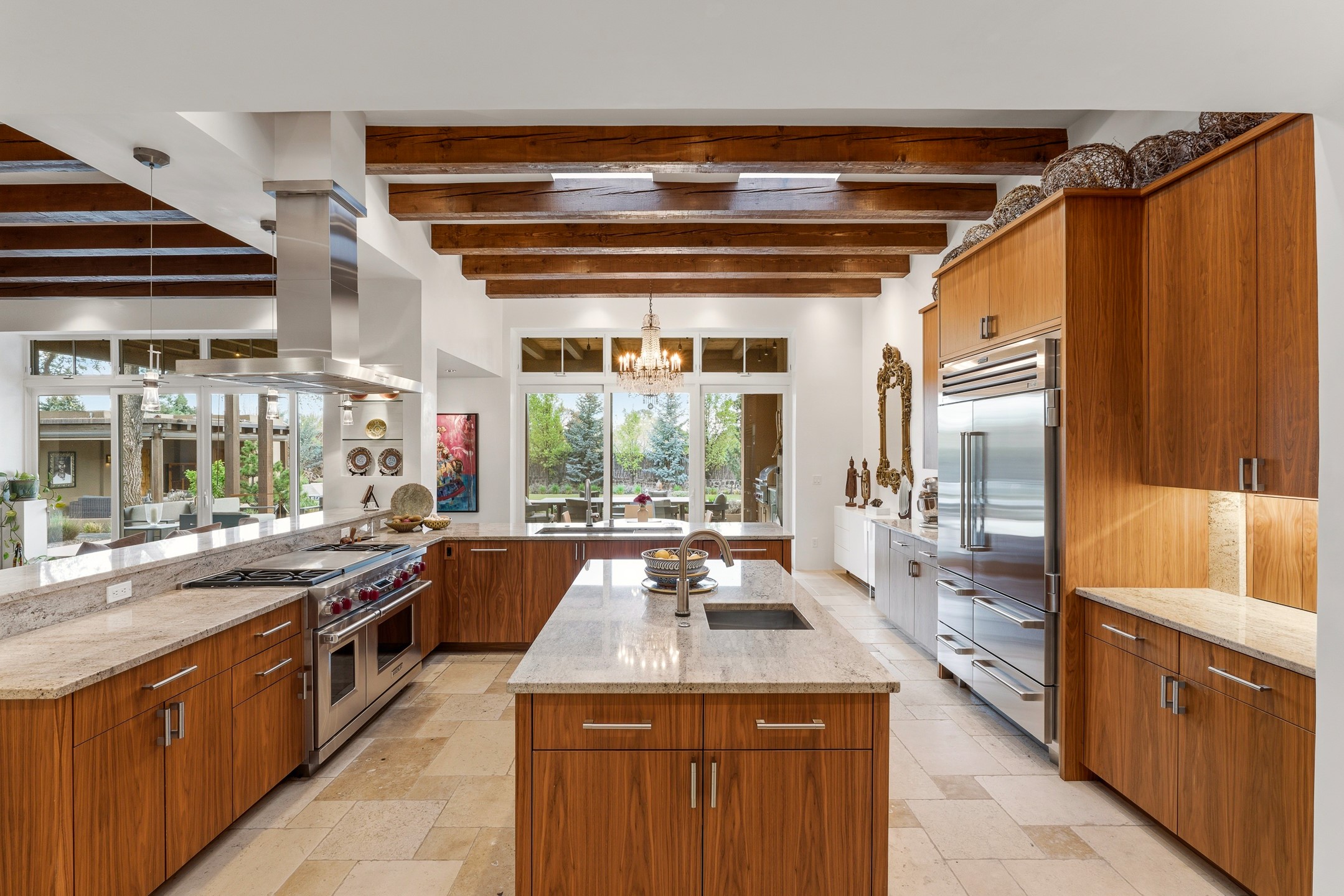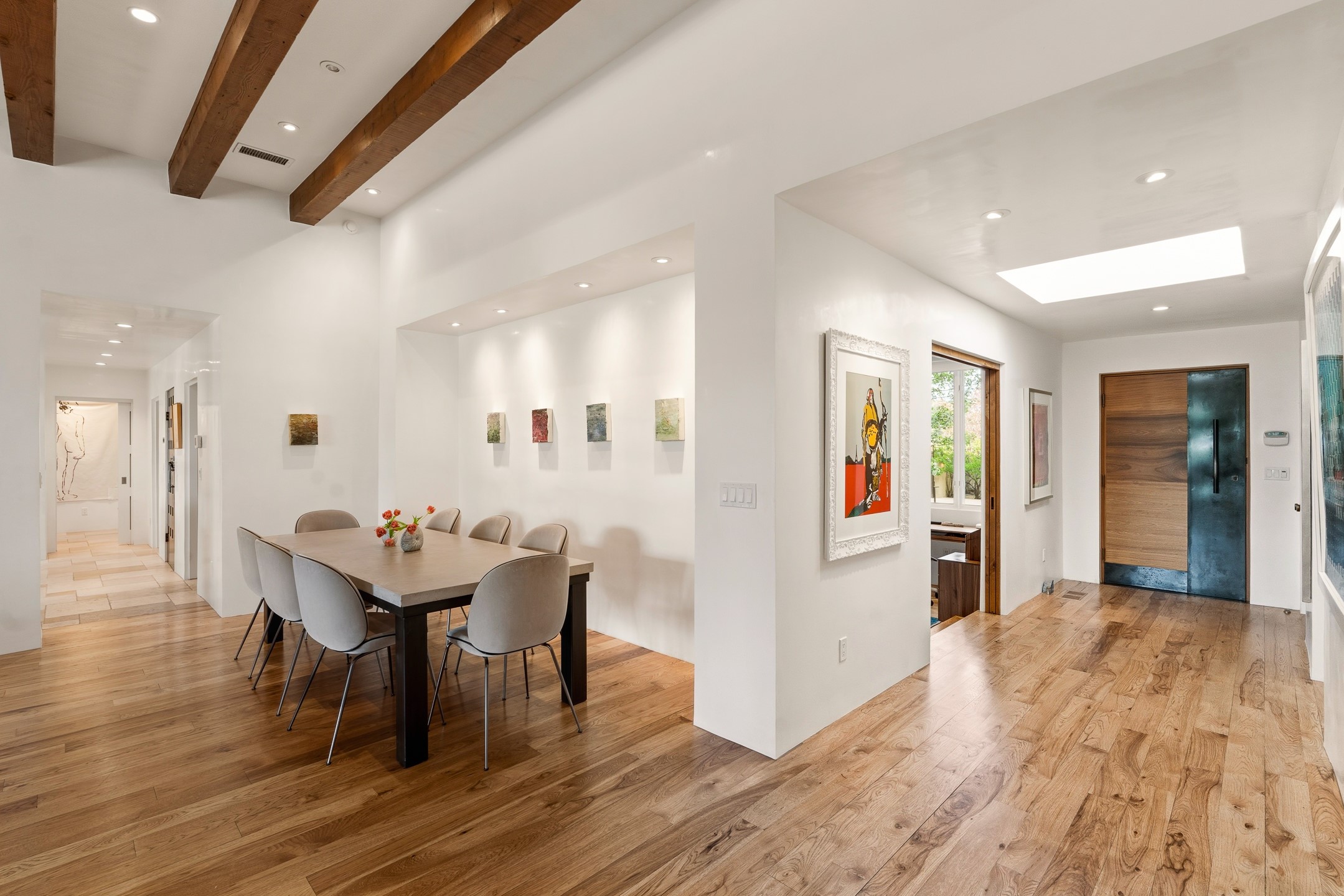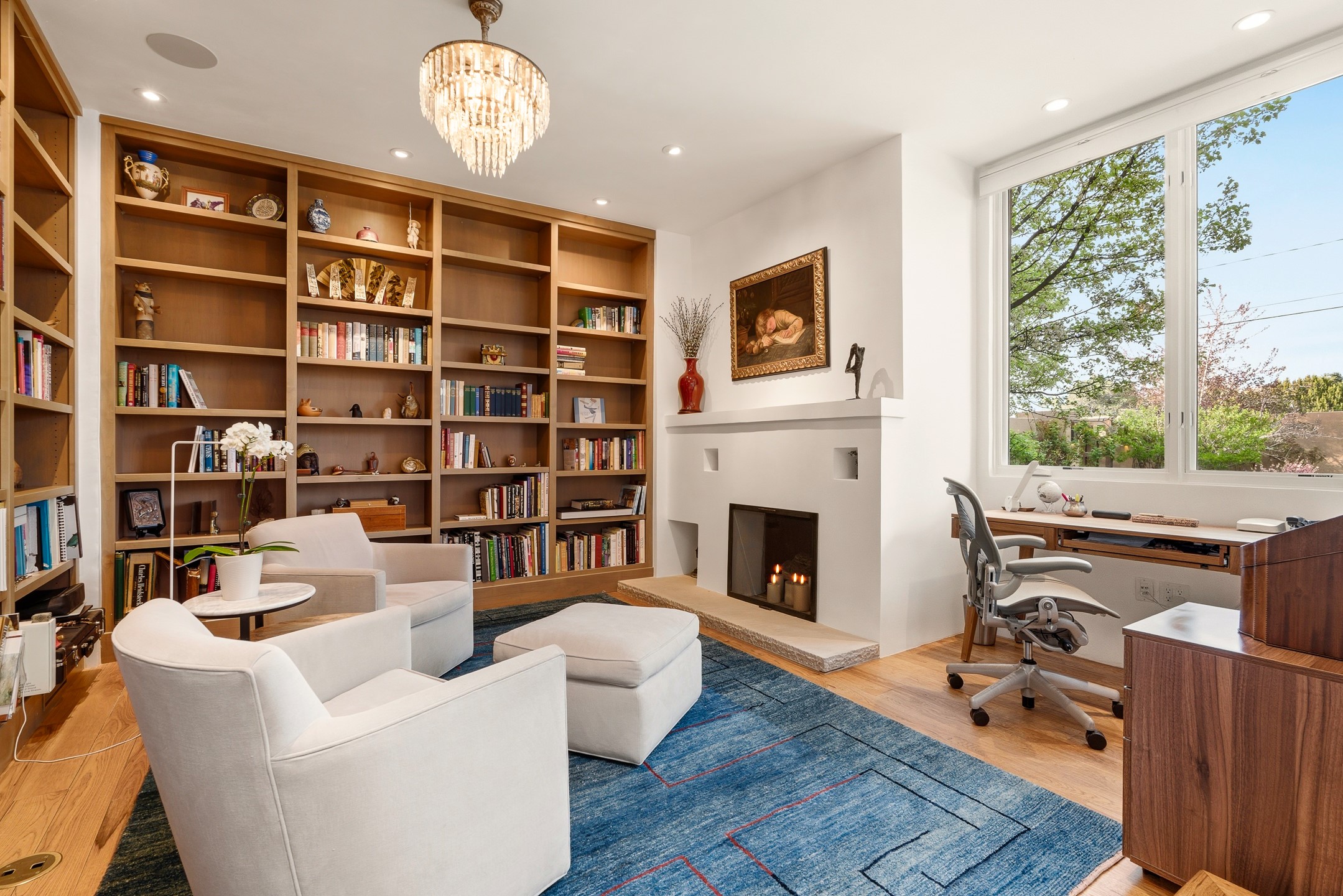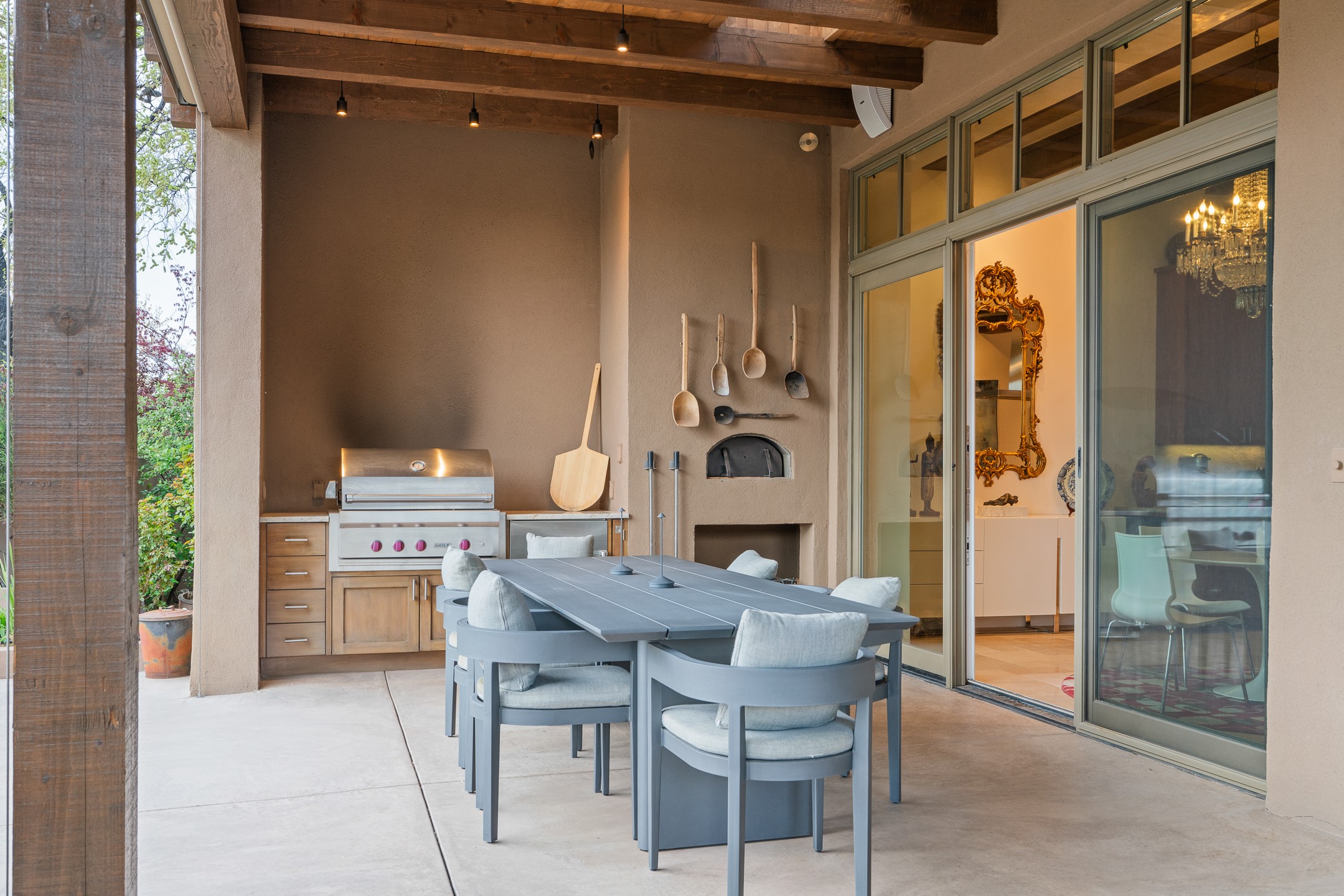 A rare offering that captures the essence of a refined Santa Fe retreat, this sophisticated compound delivers privacy, design excellence, and seamless access to the city's most celebrated destinations. Downtown, Canyon Road, and Museum Hill are moments away. Beyond its walled and gated entry, the property unfolds as a lifestyle experience. Lush landscaping and cultivated gardens create calm and seclusion, while multiple outdoor living areas invite relaxation and entertaining. A heated pool and spa anchor grounds, complemented by a stylish cabana evoking a resort. The residence is a study in modern elegance. Expansive twelve-foot ceilings, and a fluid layout create a natural connection between interior spaces and the surrounding environment. Walls of glass draw in soft light and frame sunset skies, while refined finishes lend enduring sophistication throughout. At the heart of the home, a striking chef's kitchen is designed for both performance and presence, equally suited to intimate evenings or larger gatherings, and enhanced by a climate-controlled wine room. The primary suite offers a tranquil escape with a sitting area and coffee bar, dual walk-in closets, and a spa-caliber bath with steam shower and soaking tub. A secluded outdoor portal extends the sense of retreat. Separate guest accommodations ensure comfort and privacy, including two en-suite bedrooms and a flexible additional space for a media room, office, or bunk room. Features include sleek cabinetry, integrated audio and technology, whole-home water purification, diamond plaster finishes, and limestone detailing. Resort-level amenities include an infrared sauna, an outdoor kitchen with Wolf grill and pizza oven, and a fitness area by the pool. Impeccably maintained and offered turnkey, the property spans more than 4,300 square feet of interior living space and over 2,000 square feet of covered outdoor areas. It is an exceptional expression of style, comfort, and location in the heart of Santa Fe.
