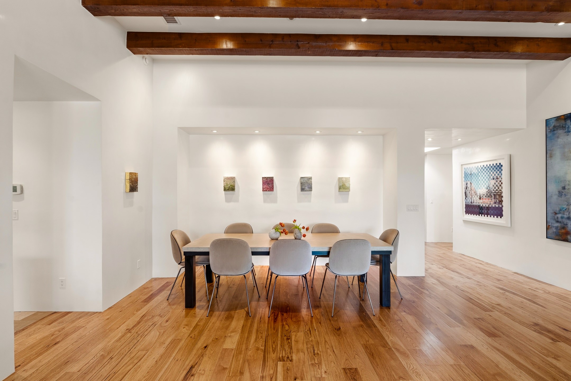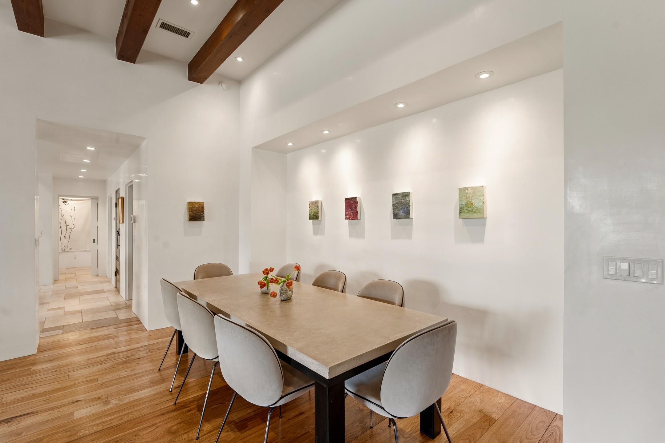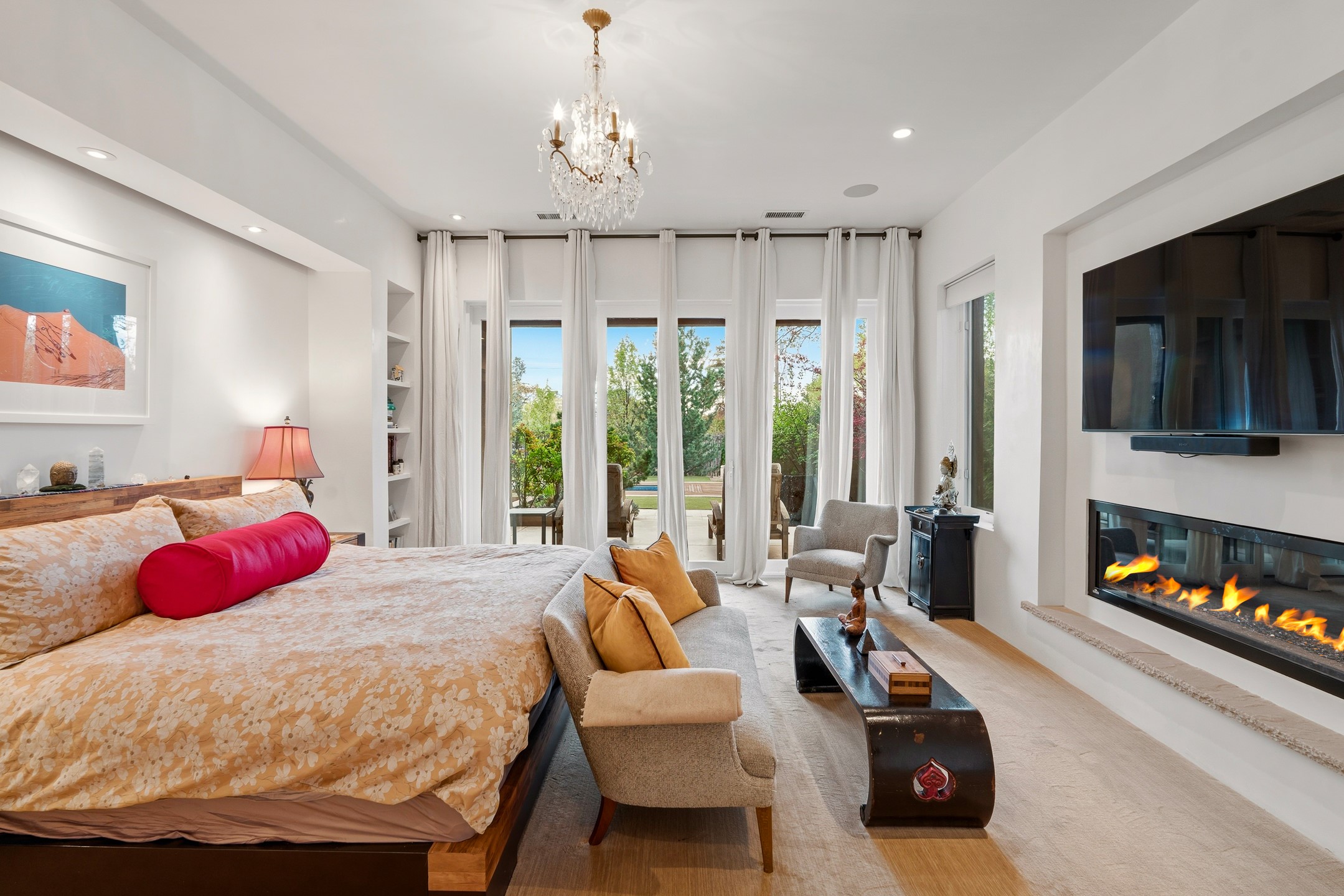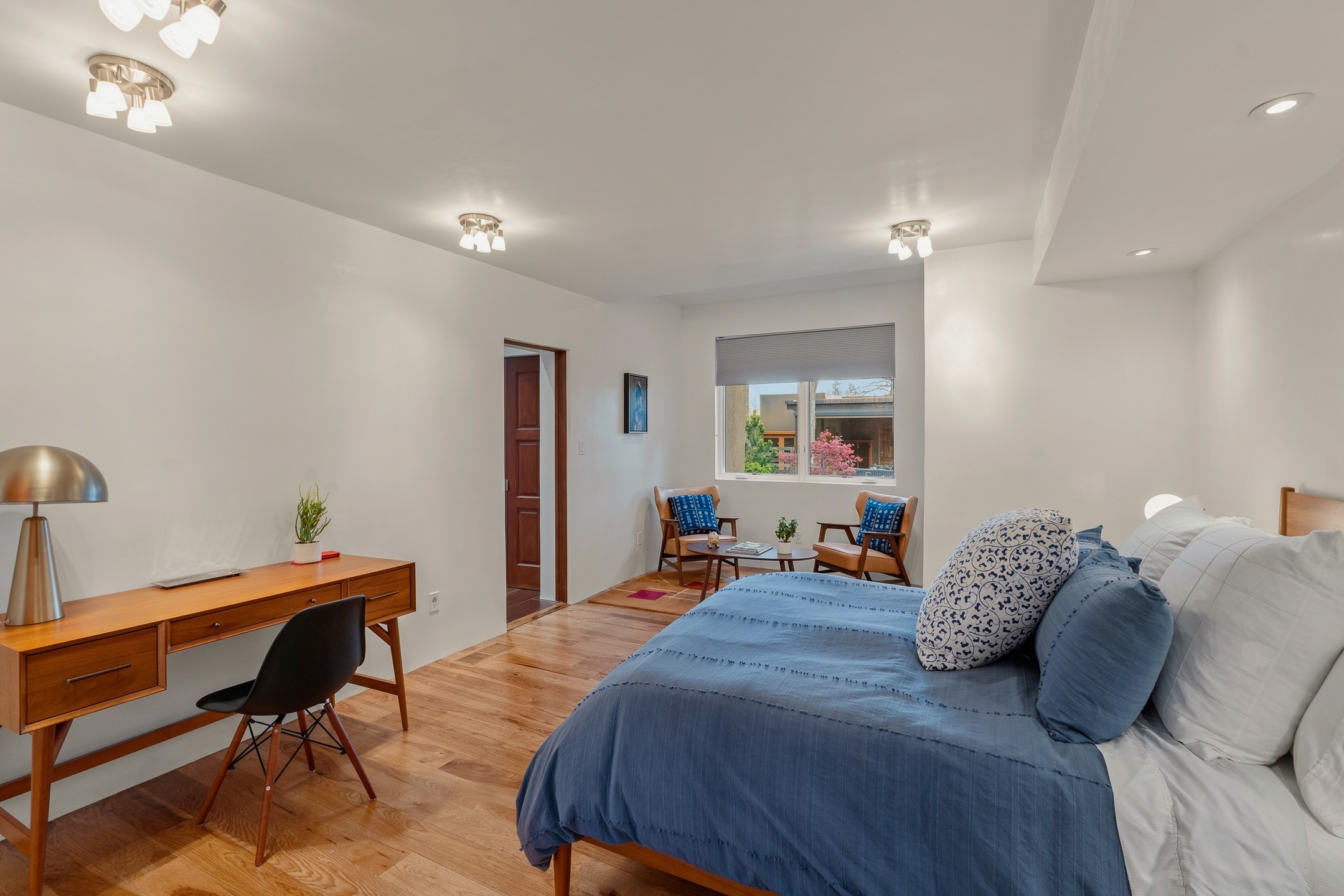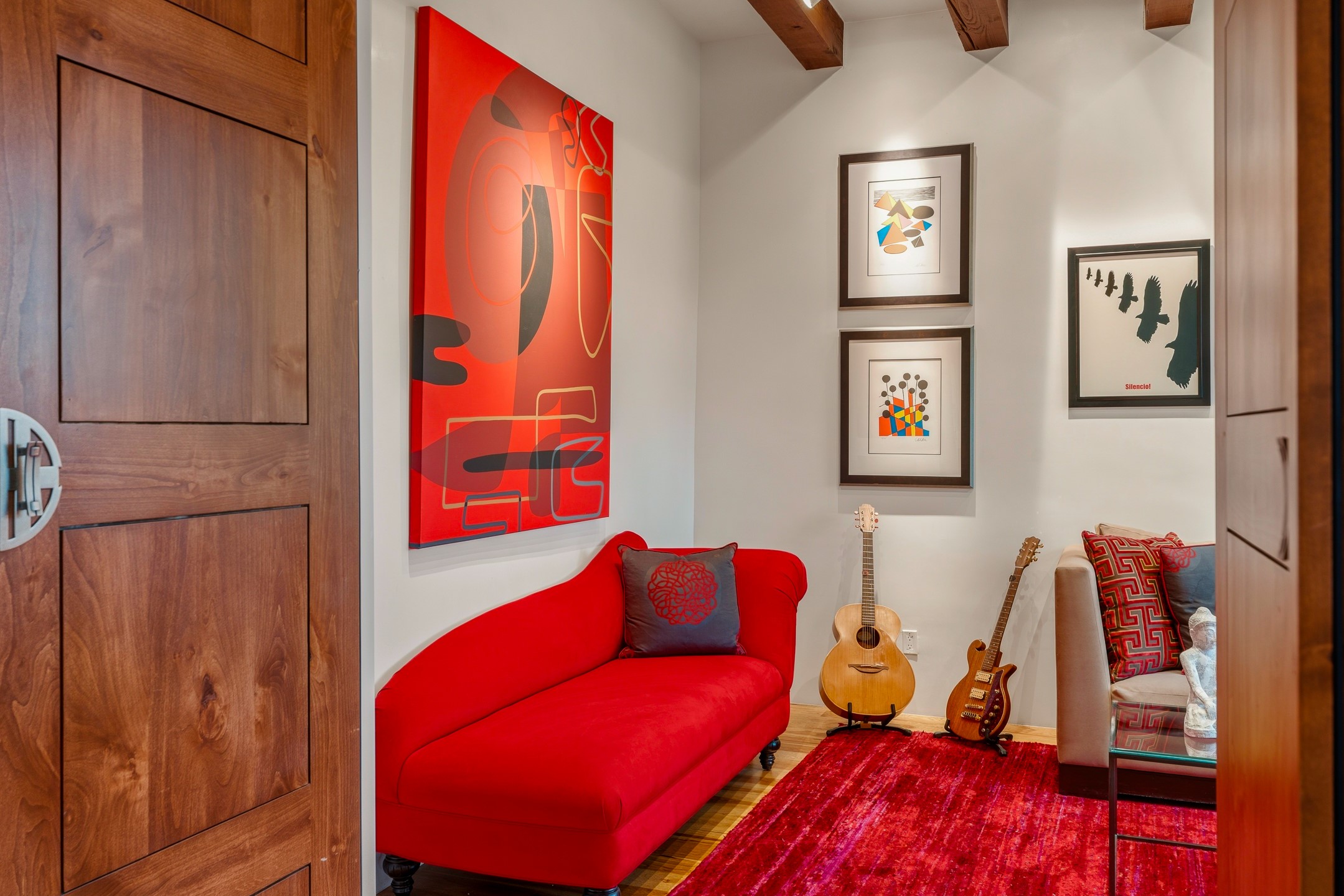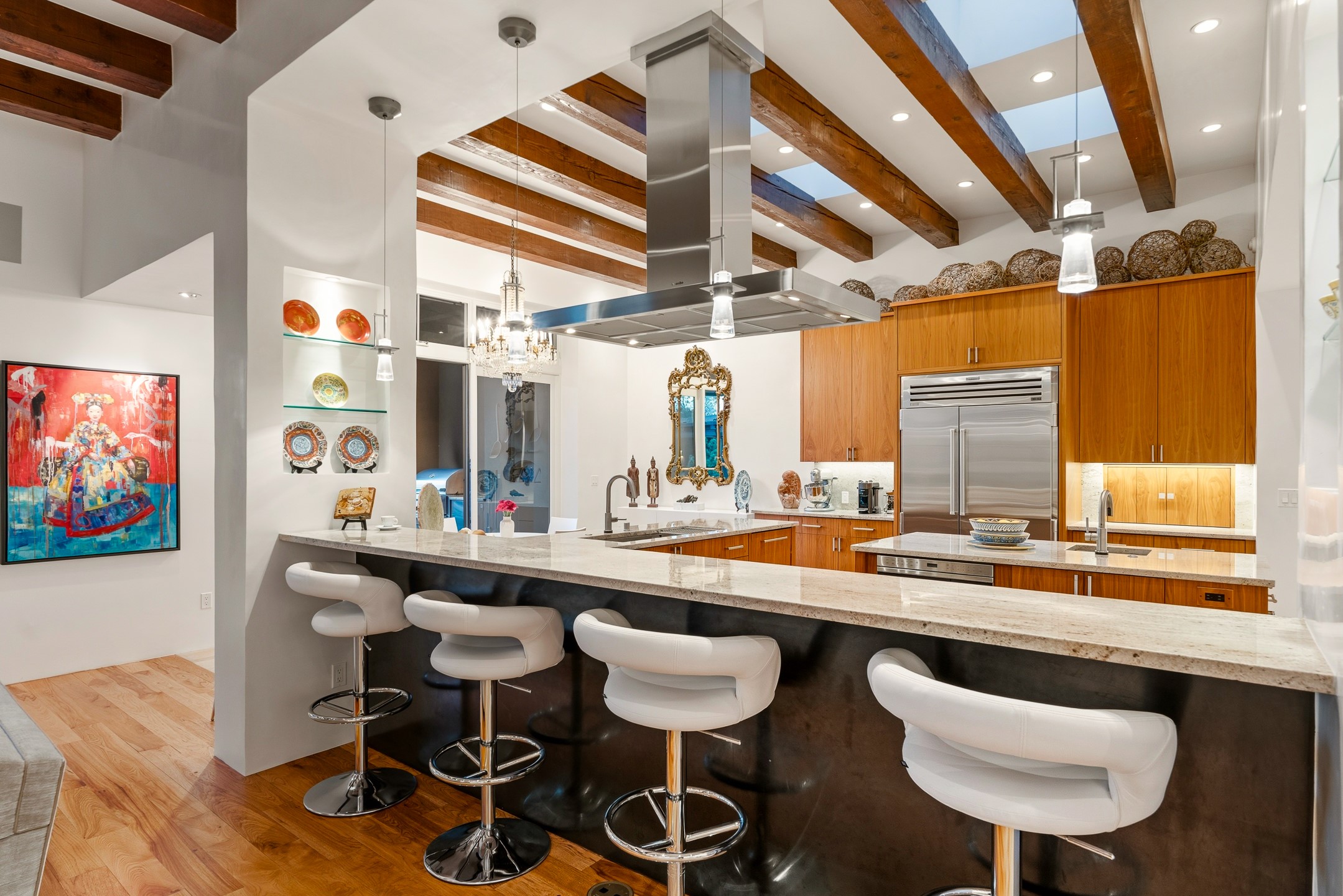 A rare offering that captures the essence of a refined Santa Fe retreat, this sophisticated compound delivers privacy, design excellence, and seamless access to the city's most celebrated destinations. Downtown, Canyon Road, and Museum Hill are moments away. Beyond its walled and gated entry, the property unfolds as a lifestyle experience. Lush landscaping and cultivated gardens create calm and seclusion, while multiple outdoor living areas invite relaxation and entertaining. A heated pool and spa anchor grounds, complemented by a stylish cabana evoking a resort. The residence is a study in modern elegance. Expansive twelve-foot ceilings, and a fluid layout create a natural connection between interior spaces and the surrounding environment. Walls of glass draw in soft light and frame sunset skies, while refined finishes lend enduring sophistication throughout. At the heart of the home, a striking chef's kitchen is designed for both performance and presence, equally suited to intimate evenings or larger gatherings, and enhanced by a climate-controlled wine room. The primary suite offers a tranquil escape with a sitting area and coffee bar, dual walk-in closets, and a spa-caliber bath with steam shower and soaking tub. A secluded outdoor portal extends the sense of retreat. Separate guest accommodations ensure comfort and privacy, including two en-suite bedrooms and a flexible additional space for a media room, office, or bunk room. Features include sleek cabinetry, integrated audio and technology, whole-home water purification, diamond plaster finishes, and limestone detailing. Resort-level amenities include an infrared sauna, an outdoor kitchen with Wolf grill and pizza oven, and a fitness area by the pool. Impeccably maintained and offered turnkey, the property spans more than 4,300 square feet of interior living space and over 2,000 square feet of covered outdoor areas. It is an exceptional expression of style, comfort, and location in the heart of Santa Fe.