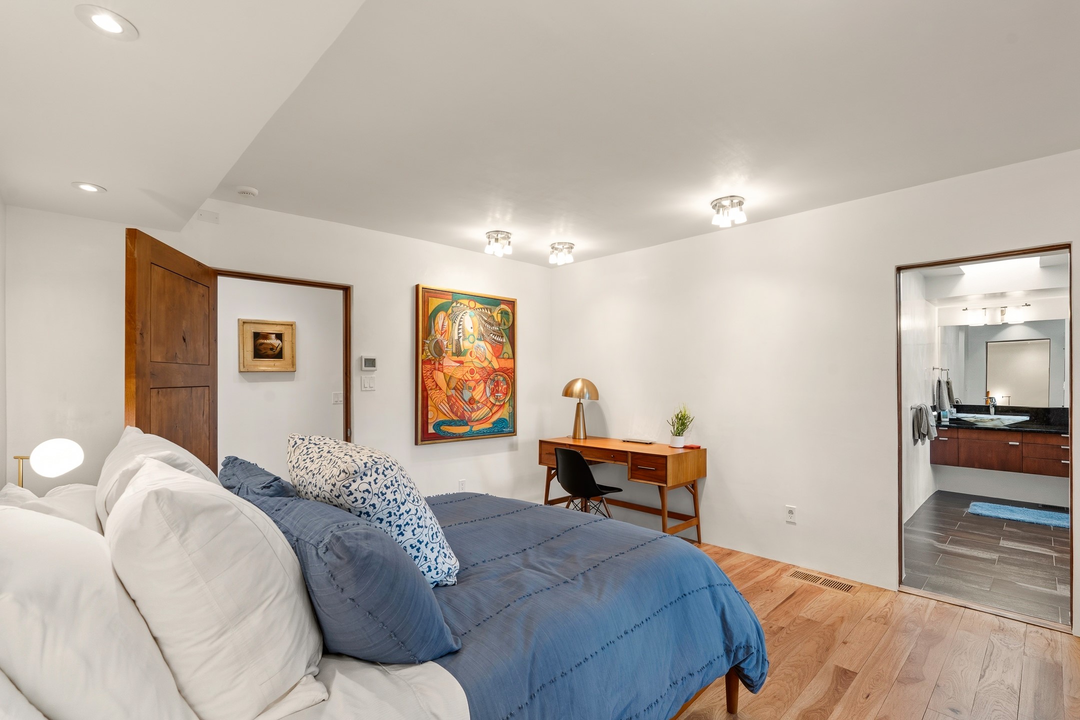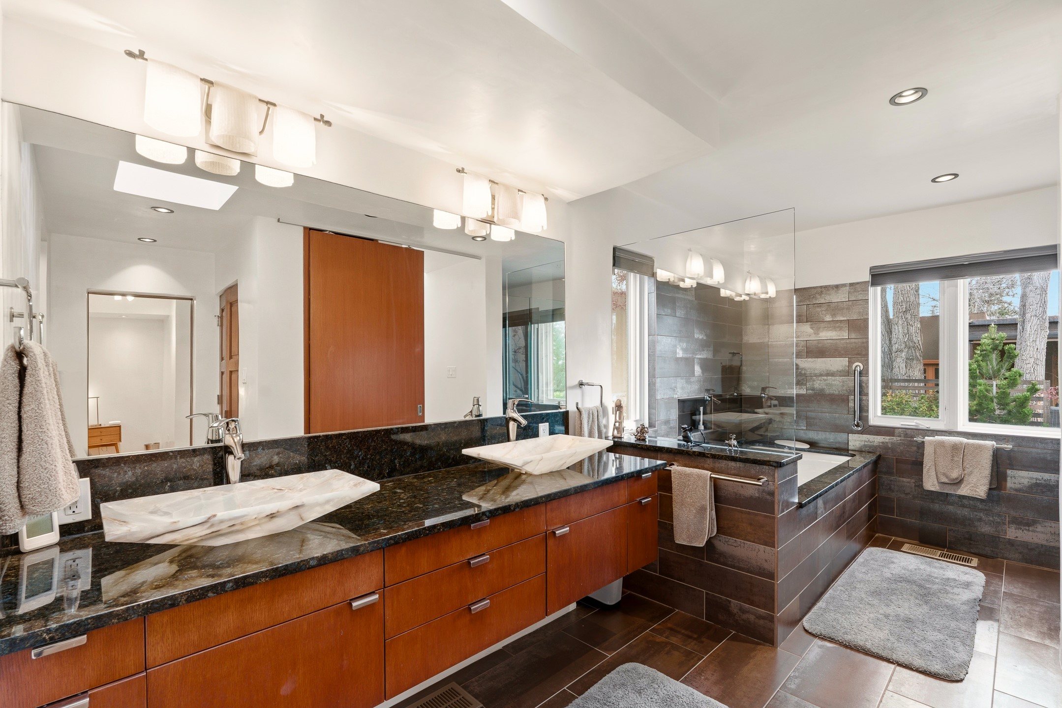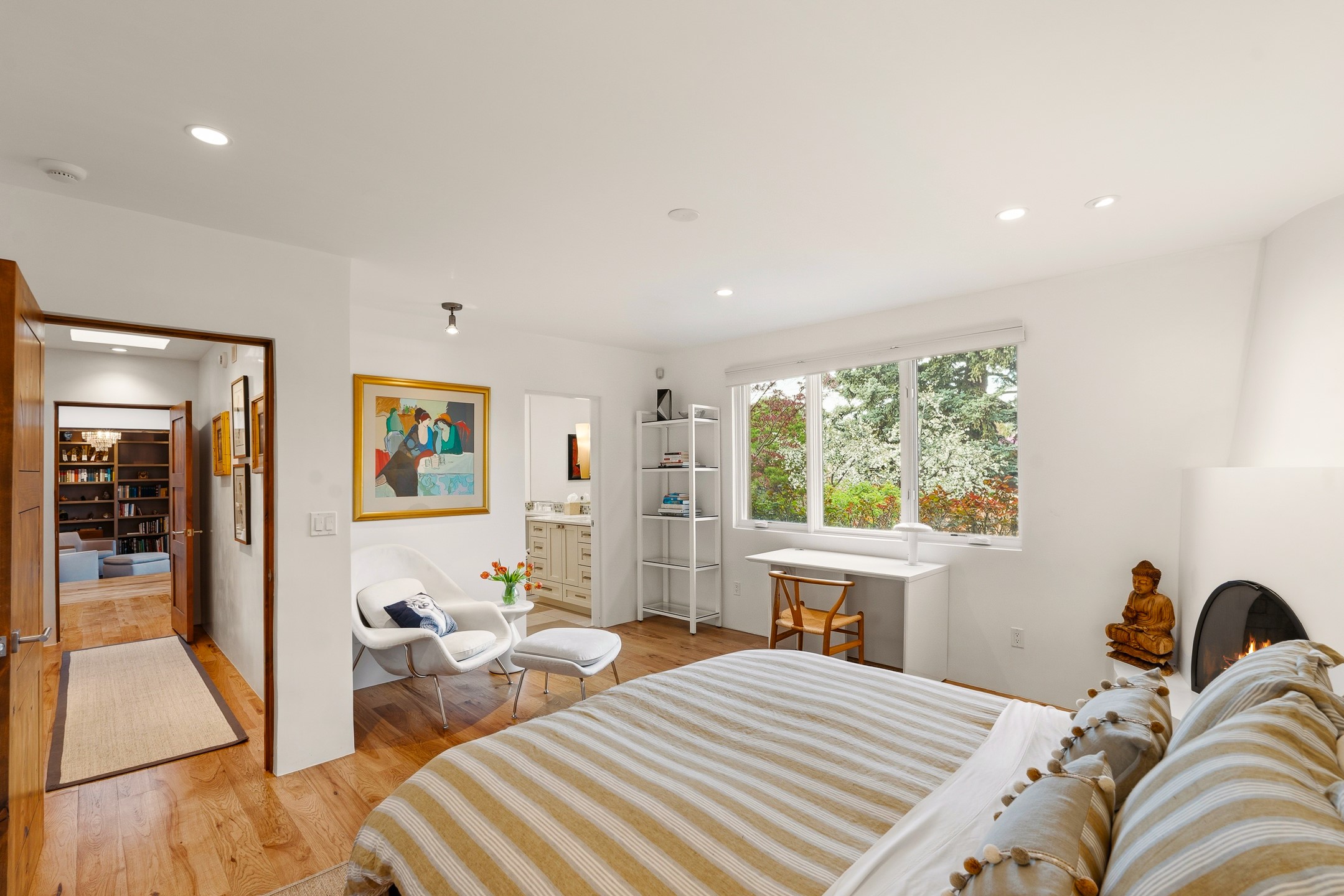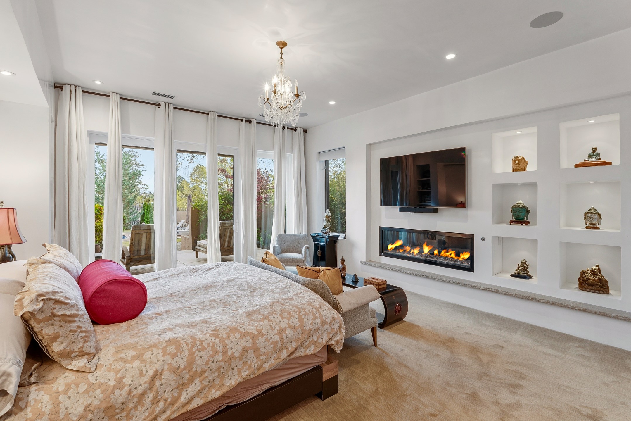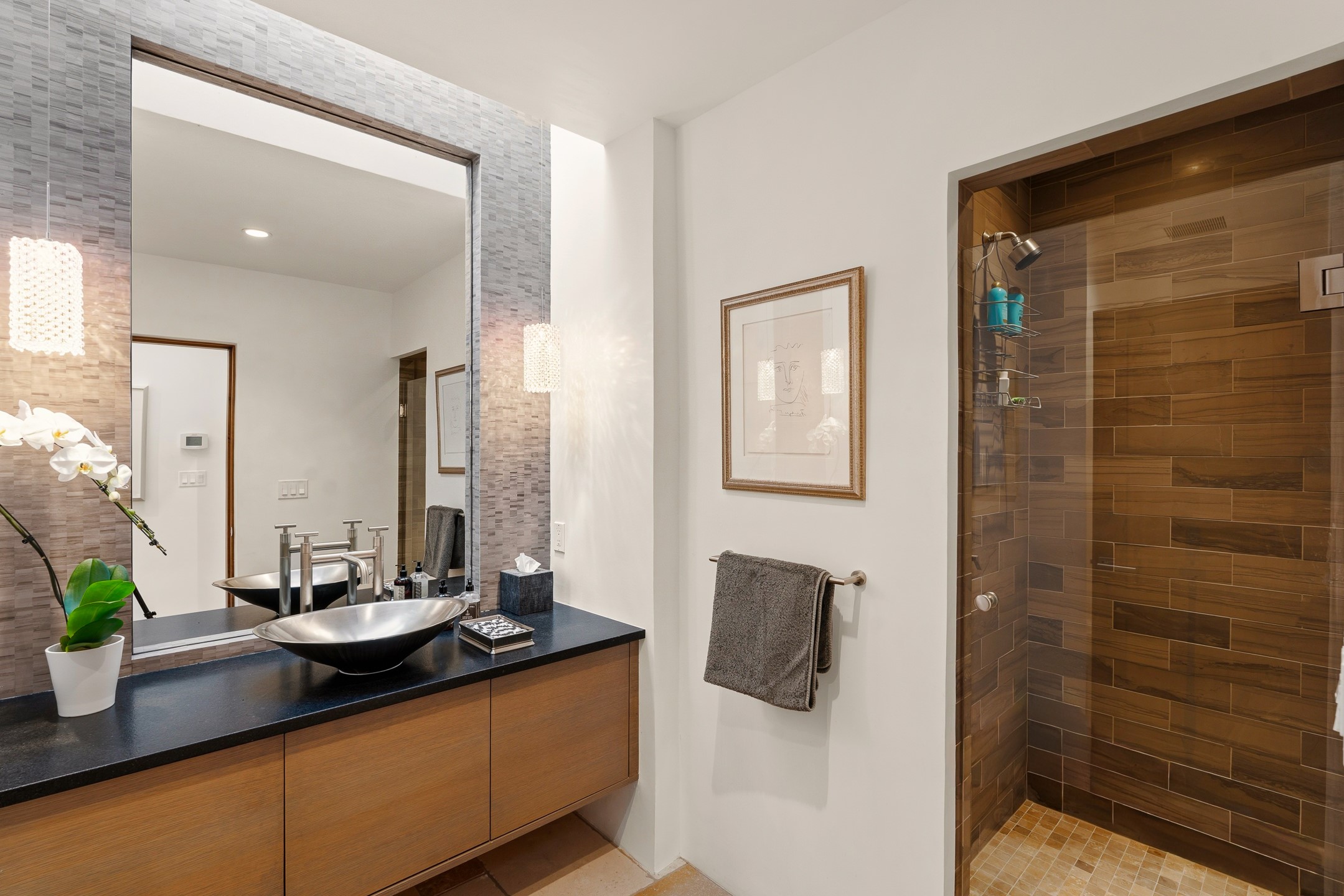 A rare offering that captures the essence of a refined Santa Fe retreat, this sophisticated compound delivers privacy, design excellence, and seamless access to the city's most celebrated destinations. Downtown, Canyon Road, and Museum Hill are moments away. Beyond its walled and gated entry, the property unfolds as a lifestyle experience. Lush landscaping and cultivated gardens create calm and seclusion, while multiple outdoor living areas invite relaxation and entertaining. A heated pool and spa anchor grounds, complemented by a stylish cabana evoking a resort. The residence is a study in modern elegance. Expansive twelve-foot ceilings, and a fluid layout create a natural connection between interior spaces and the surrounding environment. Walls of glass draw in soft light and frame sunset skies, while refined finishes lend enduring sophistication throughout. At the heart of the home, a striking chef's kitchen is designed for both performance and presence, equally suited to intimate evenings or larger gatherings, and enhanced by a climate-controlled wine room. The primary suite offers a tranquil escape with a sitting area and coffee bar, dual walk-in closets, and a spa-caliber bath with steam shower and soaking tub. A secluded outdoor portal extends the sense of retreat. Separate guest accommodations ensure comfort and privacy, including two en-suite bedrooms and a flexible additional space for a media room, office, or bunk room. Features include sleek cabinetry, integrated audio and technology, whole-home water purification, diamond plaster finishes, and limestone detailing. Resort-level amenities include an infrared sauna, an outdoor kitchen with Wolf grill and pizza oven, and a fitness area by the pool. Impeccably maintained and offered turnkey, the property spans more than 4,300 square feet of interior living space and over 2,000 square feet of covered outdoor areas. It is an exceptional expression of style, comfort, and location in the heart of Santa Fe.