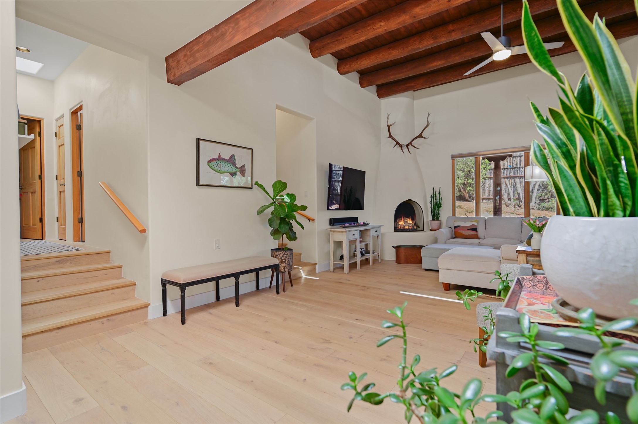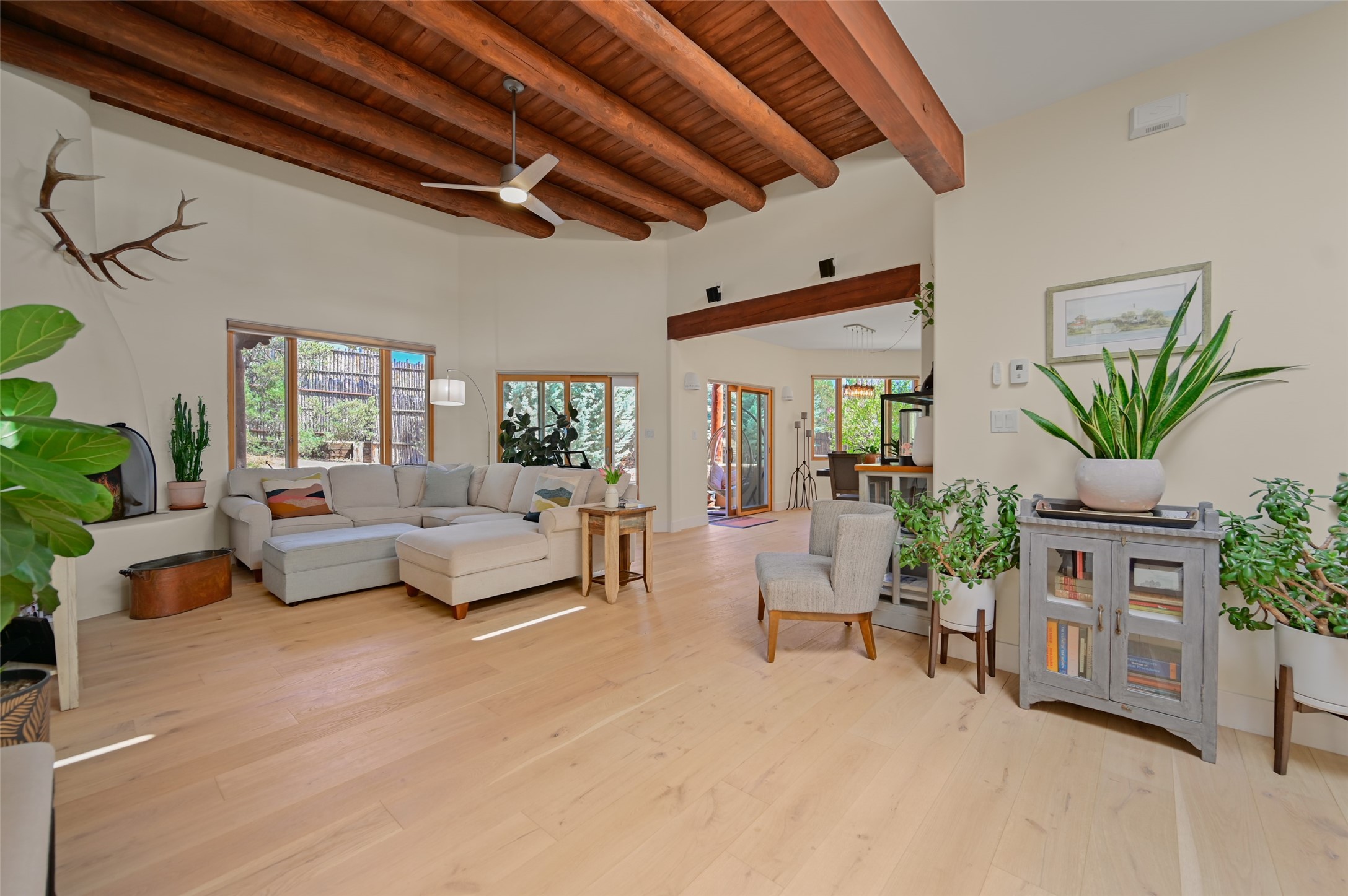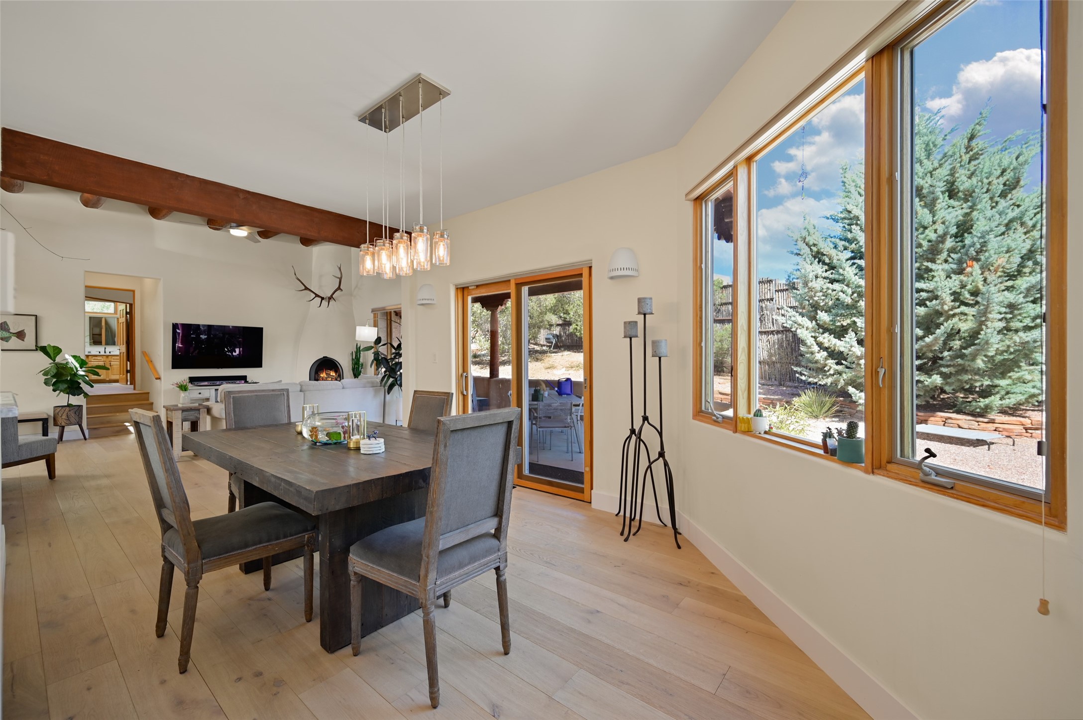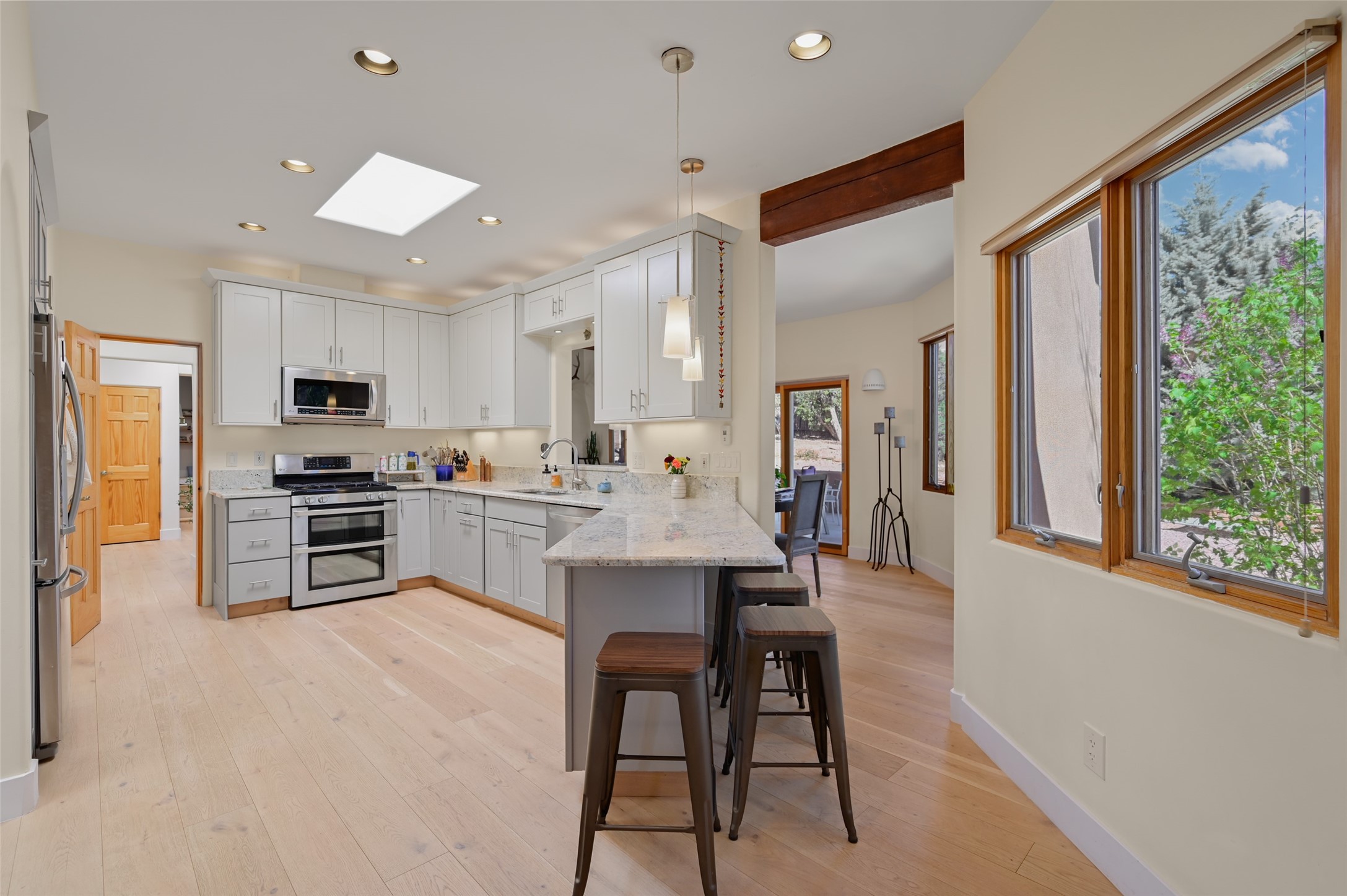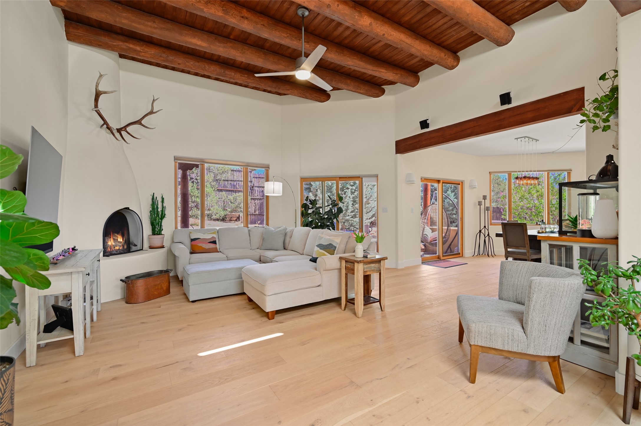 Situated on an oversized in-town lot with ample space to add an ADU, this tastefully renovated home offers the perfect blend of comfort, privacy, and the Santa Fe lifestyle. A gated entry welcomes you into a beautifully fenced property featuring low-maintenance xeriscaping and an abundance of mature trees, creating a serene and private setting. Ideally located on the desirable north side, you're just minutes from De Vargas Center and the historic downtown Plaza, with convenient access to Los Alamos. Enjoy nearby hiking and biking trails, as well as the popular Frank Ortiz and Ridgetop Dog Parks, all just moments from your doorstep. This unique property features stunning mountain views of the Sangre de Cristo Mountains and has been meticulously maintained and thoughtfully upgraded by its current owners--making it truly turnkey. Recent improvements include beautifully remodeled bathrooms, an updated kitchen, wall-to-wall engineered oak flooring, and a Navien tankless water heater with recirculation. A new TPO membrane roof with added insulation was installed in 2023 for enhanced energy efficiency. The home also boasts a fully owned 7.6 kW photovoltaic solar system that covers the property's electrical needs--with surplus capacity to charge your EV using the already installed charger in the spacious two-car garage. 839 Camino Francisca is a rare opportunity to enjoy modern upgrades, sustainability, privacy, and the very best of Santa Fe living.