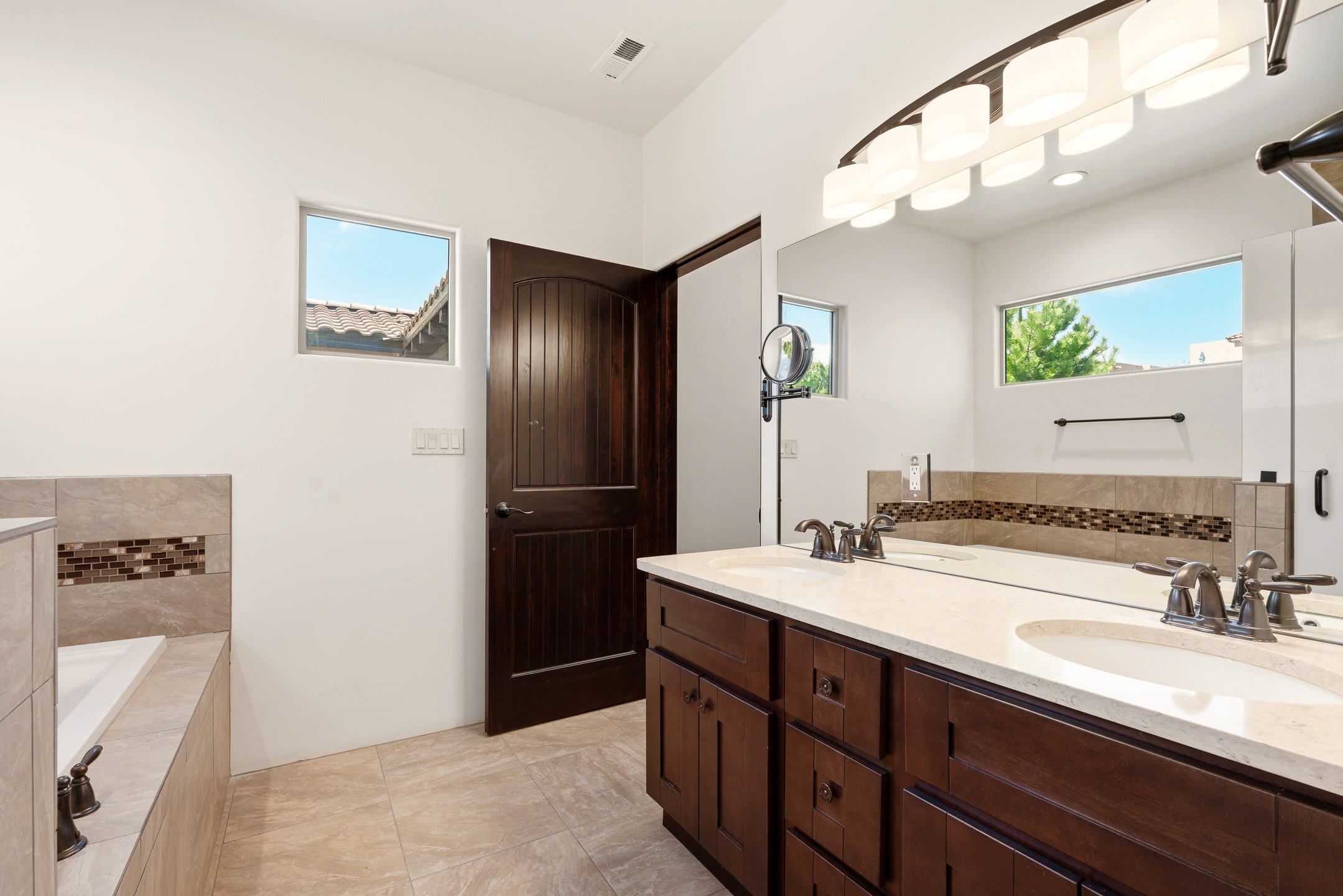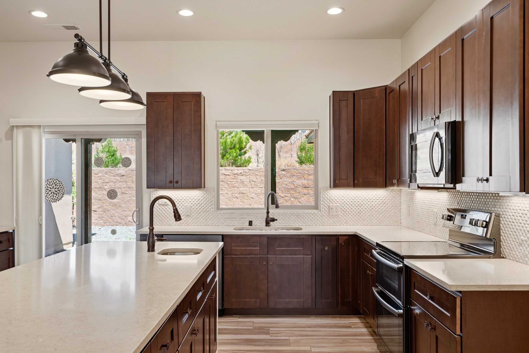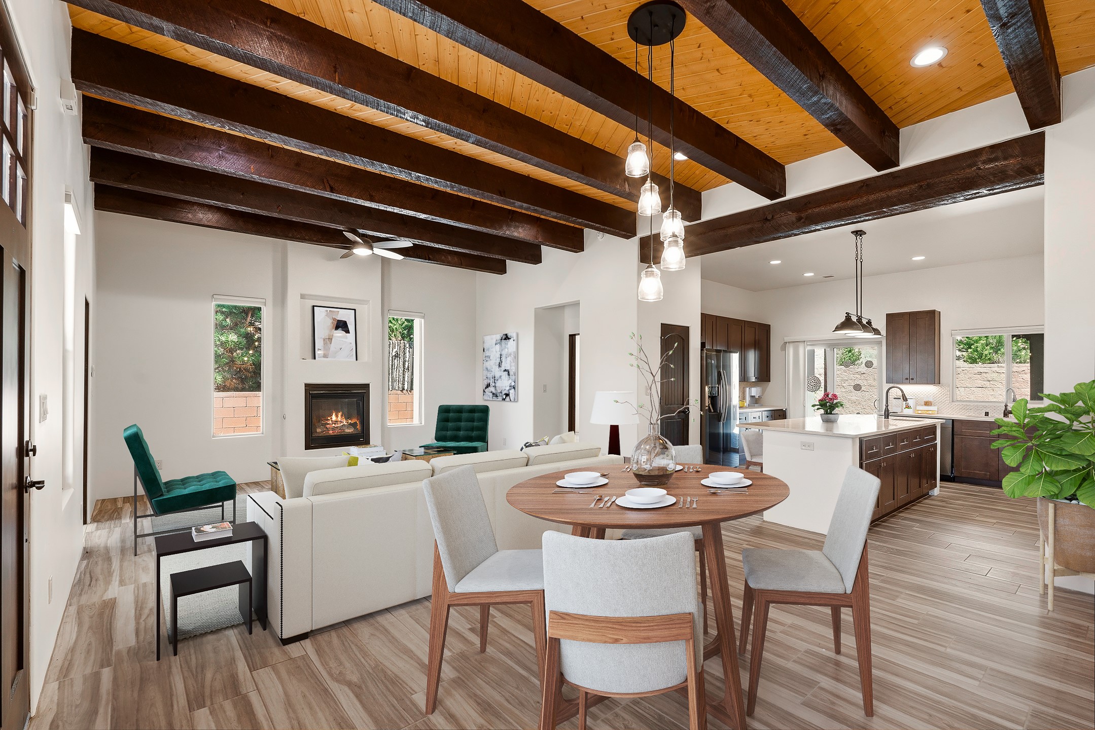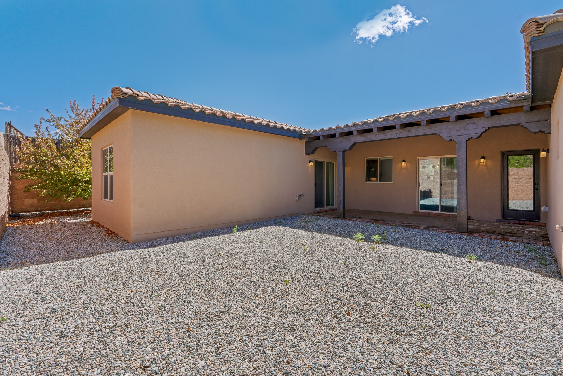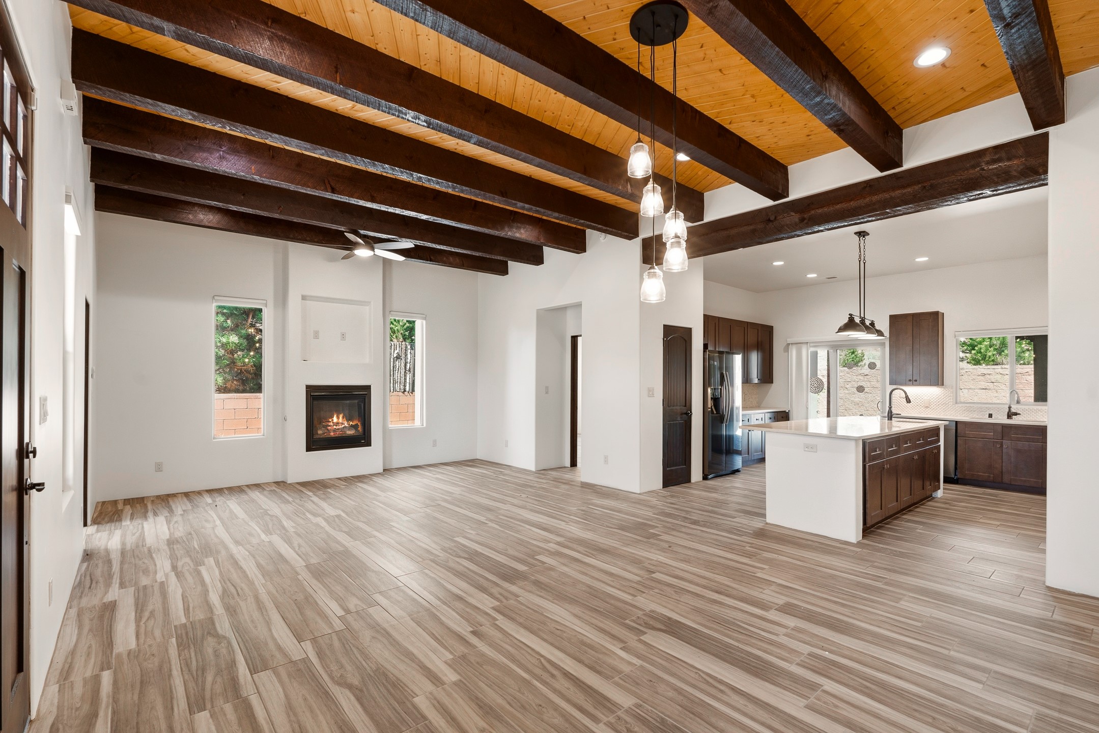 Beautiful home located in desirable La Pradera, featuring mature landscaping with low-maintenance xeriscaping and drip irrigation. Enter through a charming front courtyard with a custom gate into a light-filled, open-concept floor plan. The home showcases high ceilings with beams and tongue-and-groove detailing, two cozy fireplaces, recessed lighting throughout, and stylish tiled floors. The spacious kitchen is ideal for entertaining, complete with a large center island and seamless flow into the living and dining areas. The primary suite offers excellent separation from the additional bedrooms, creating a private retreat with a generous closet, dual sinks, a jetted tub, and a separate shower. Additional highlights include forced air heating and cooling, a spacious utility room with sink, storage closet, and direct access to the side yard. The property also features an eight-foot garage door, brick pavers in both the front and rear portals, and a stamped concrete driveway and entry walkway.