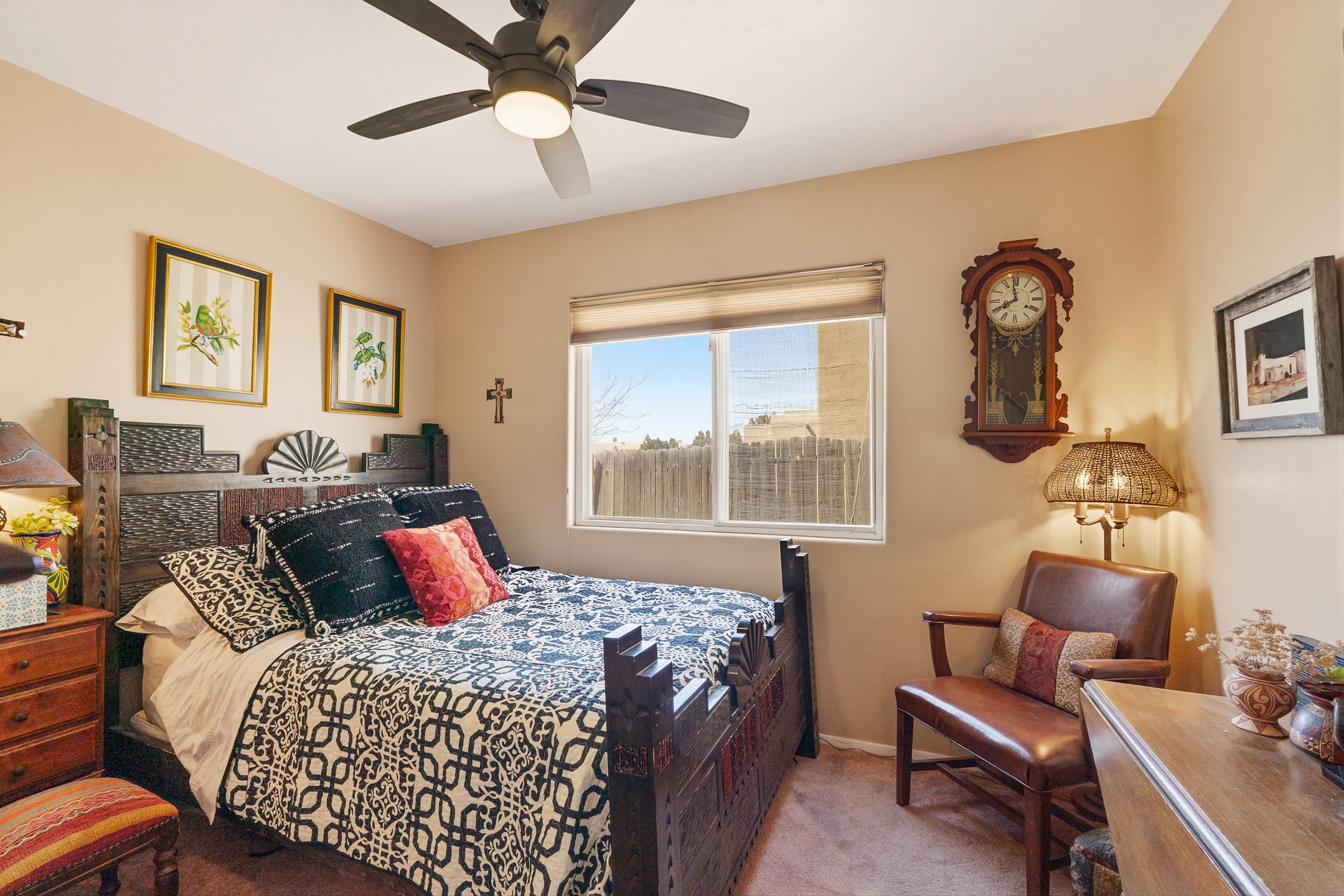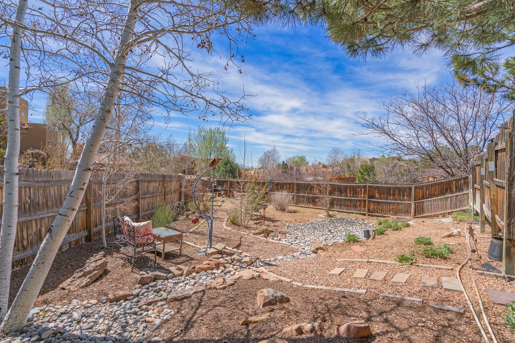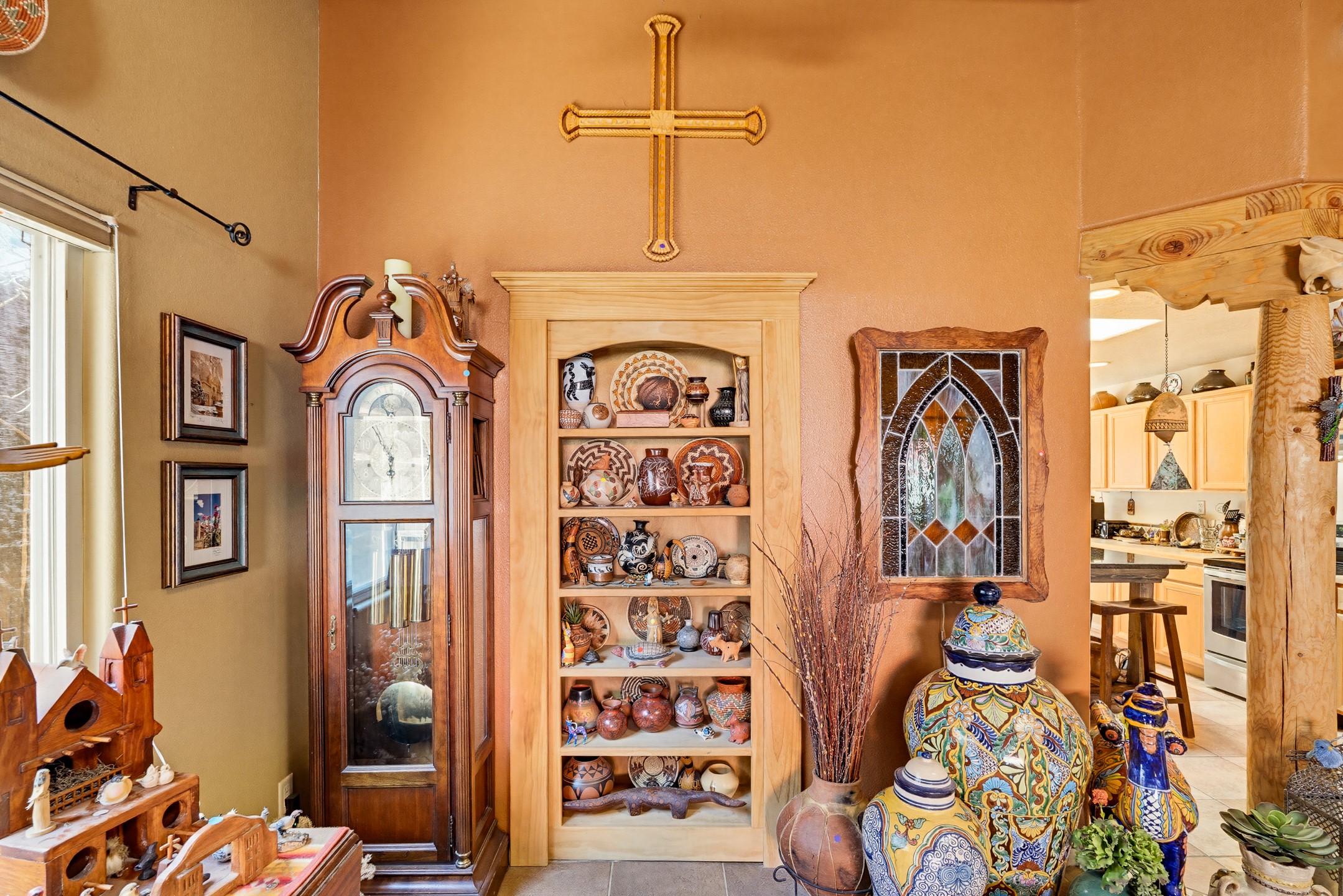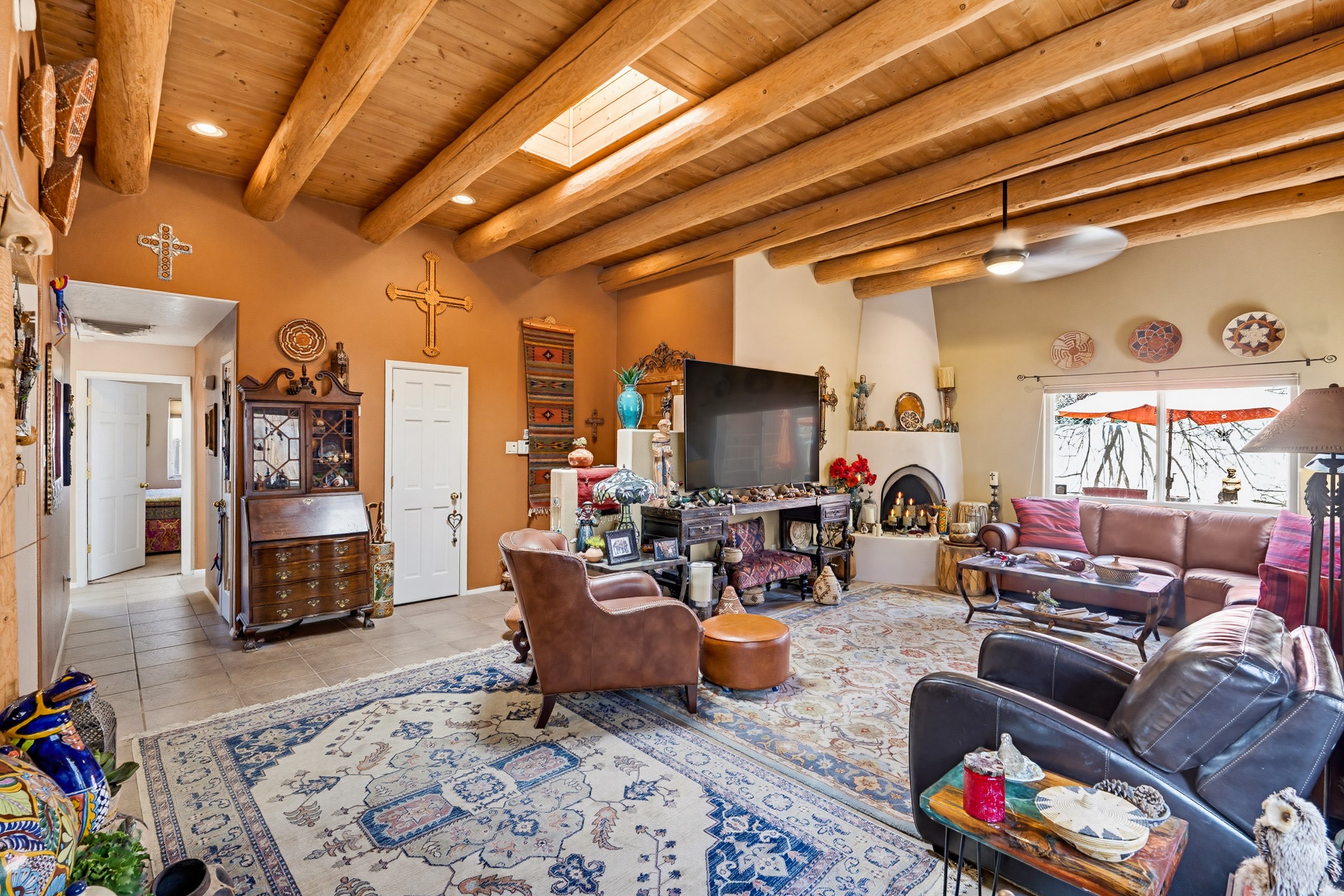 Experience true Santa Fe living in this charming Pueblos Del Sol home featuring 3 bedrooms plus an office/studio and 2 full baths. Southwest character shines throughout -- from the classic kiva wood-burning fireplace and tongue-and-groove ceilings with vigas, to the tile floors with radiant heat that keep the space cozy year-round. The open-concept living area flows seamlessly into a spacious kitchen with a large center island and breakfast seating, perfect for entertaining or family gatherings. Abundant skylights fill the home with natural light, enhancing its warm and welcoming ambiance. Step outside to enjoy mature landscaping, views of the Ortiz and Sandia mountains, perfect for watching iconic NM sunsets. An inviting front courtyard and attached two-car garage complete this charming home in one of Santa Fe's most desirable neighborhoods. A blend of comfort, authenticity, and style -- this Pueblos Del Sol gem offers the best of Santa Fe living.